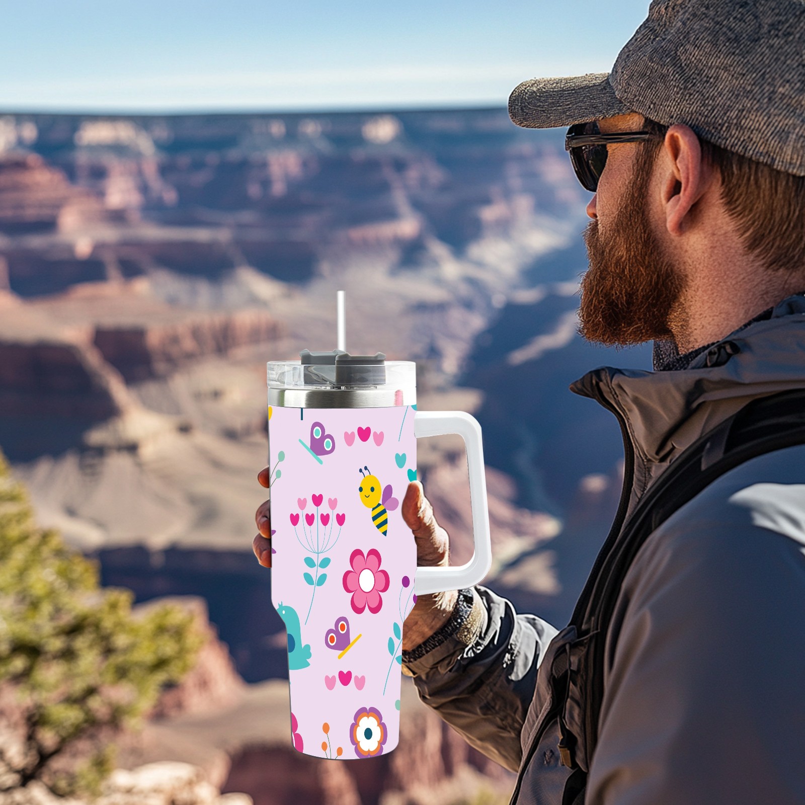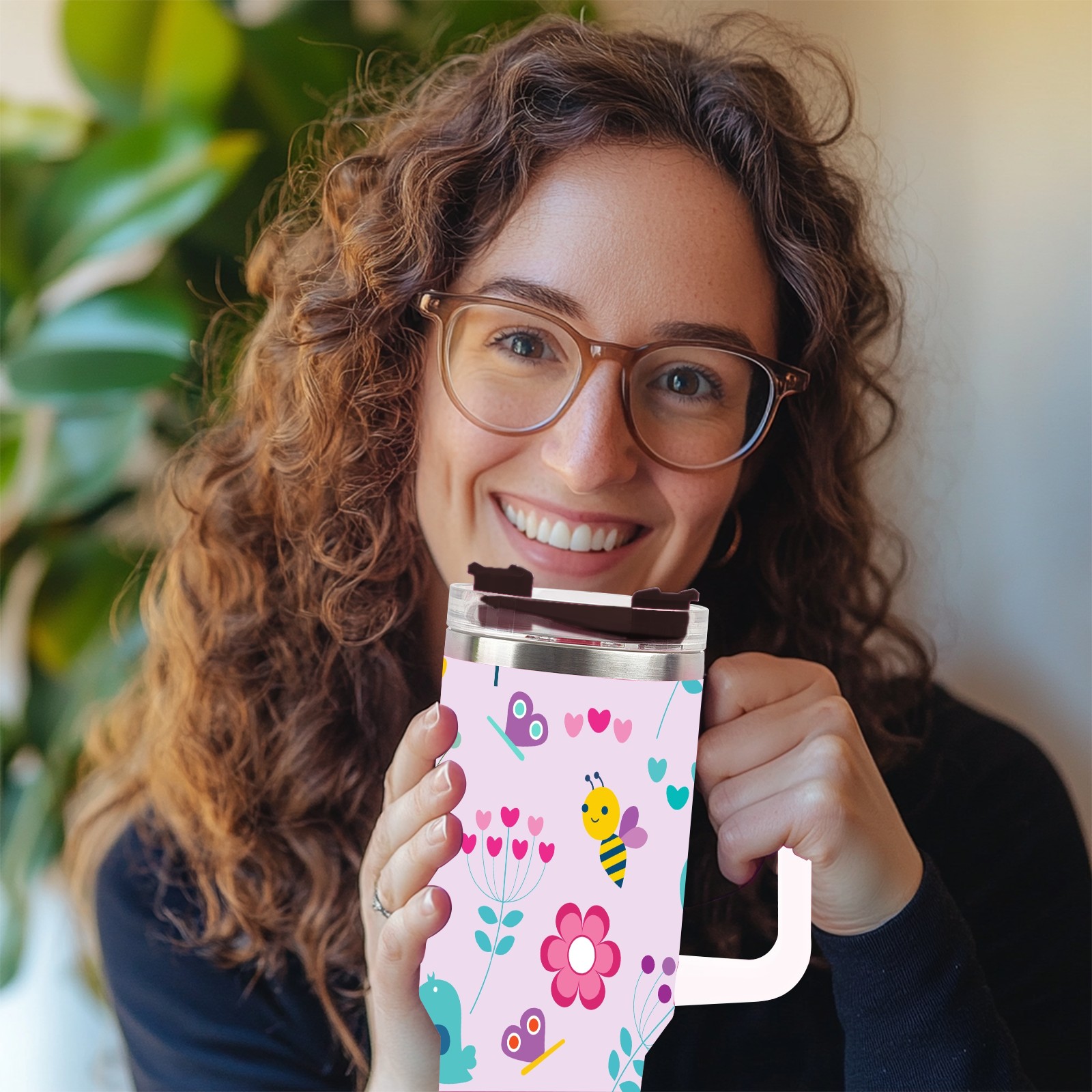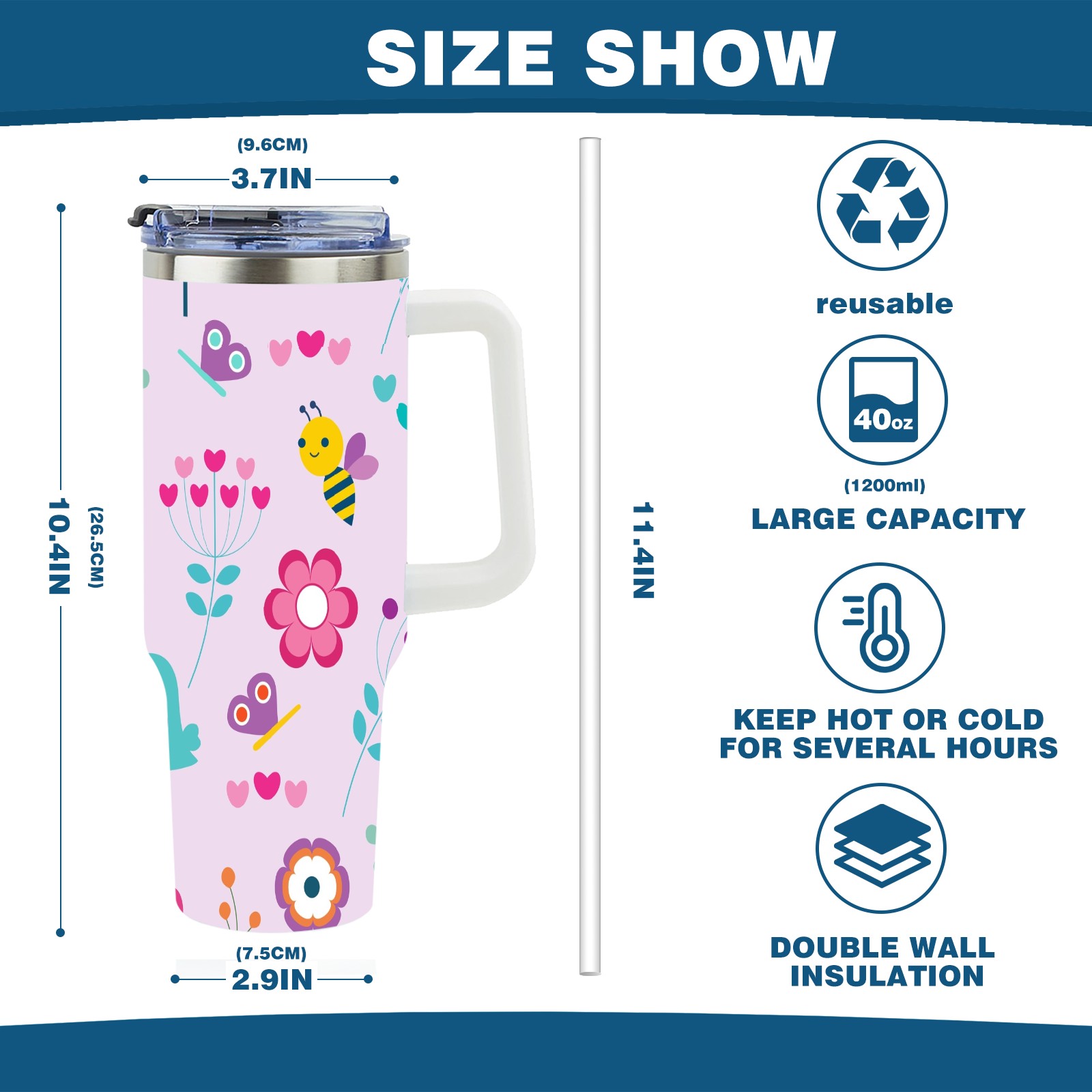 40oz Birds Bee Flowers Seamless thermos with lid and straw, leak-proof stainless steel, with handle, spill-proof bottle, convenient for travel(pink)
