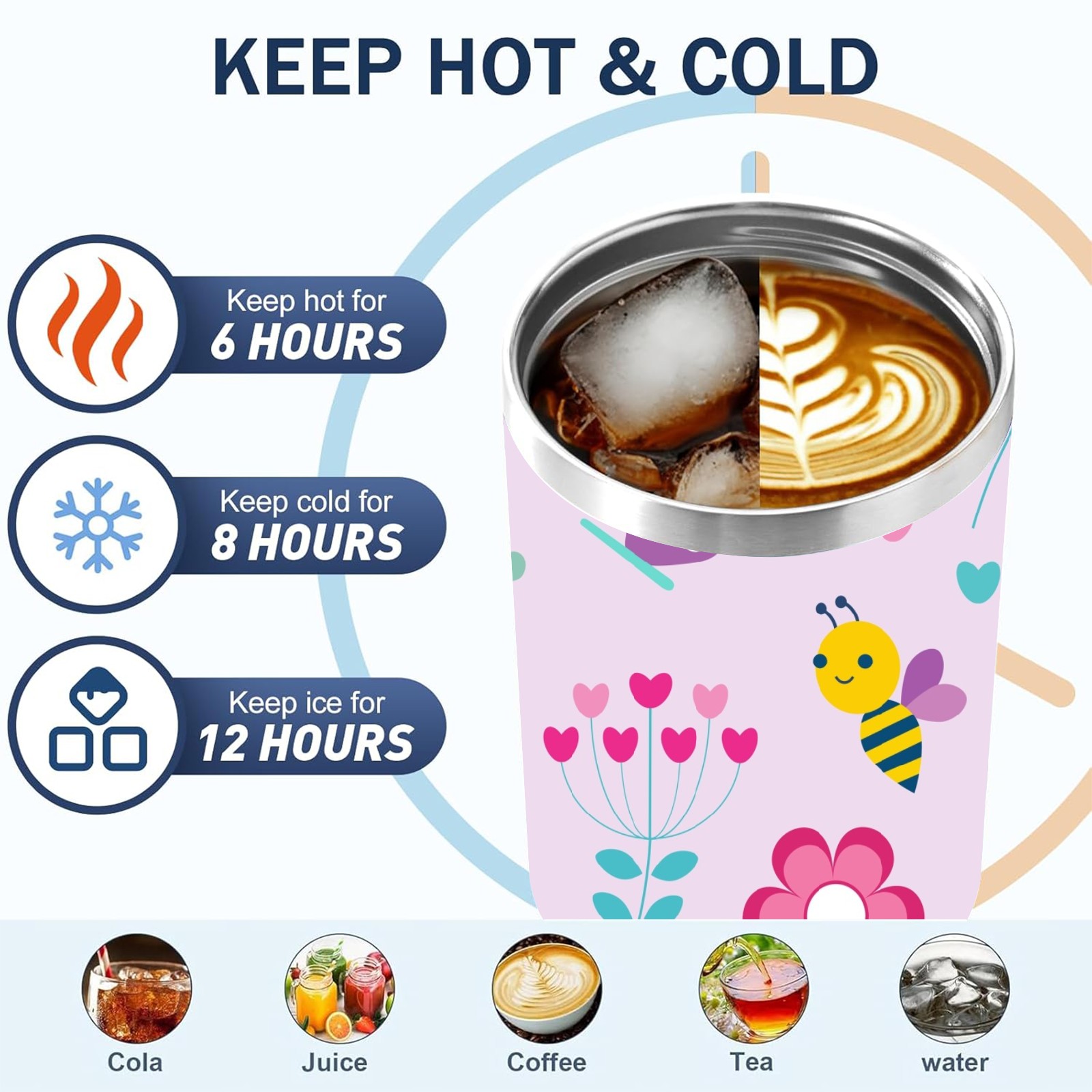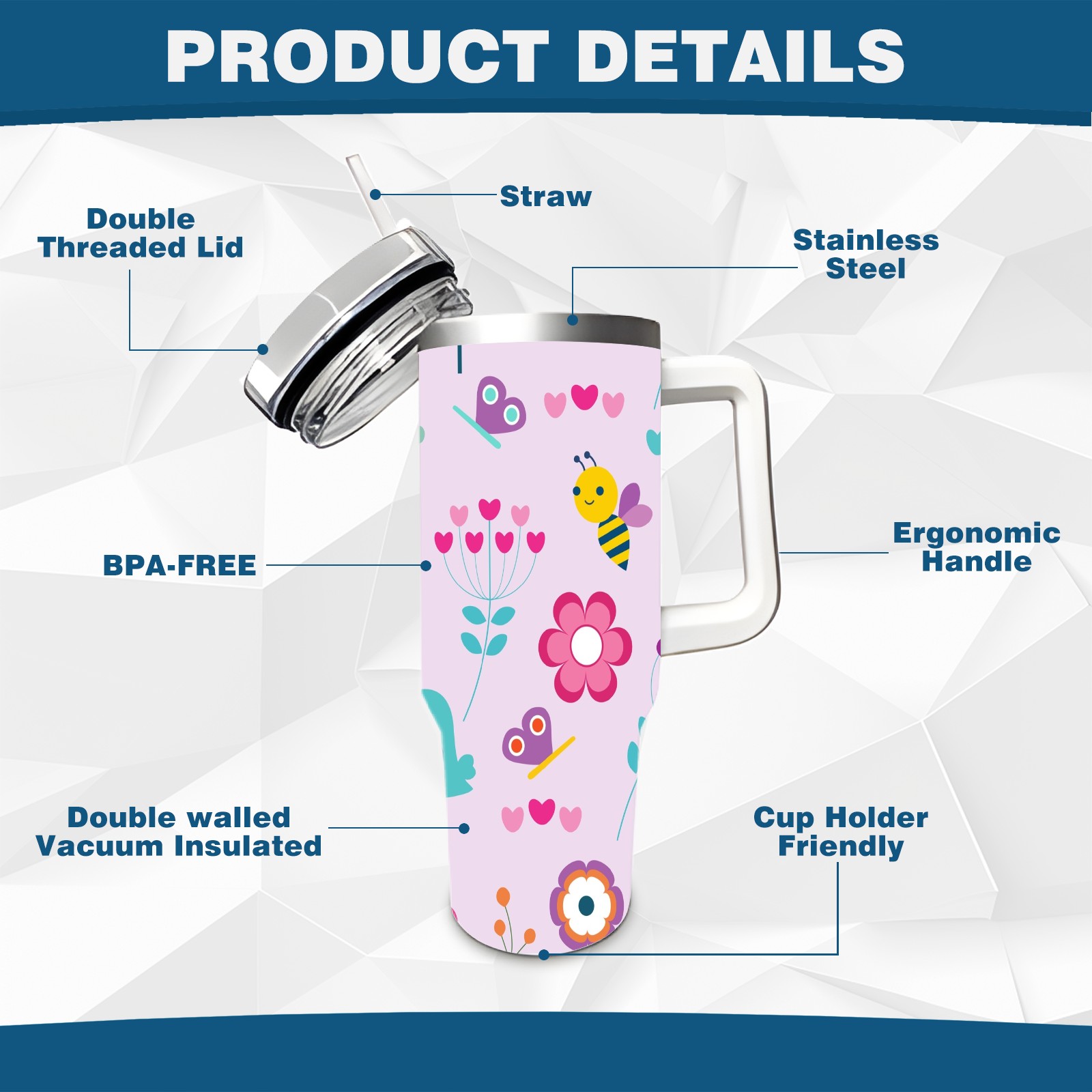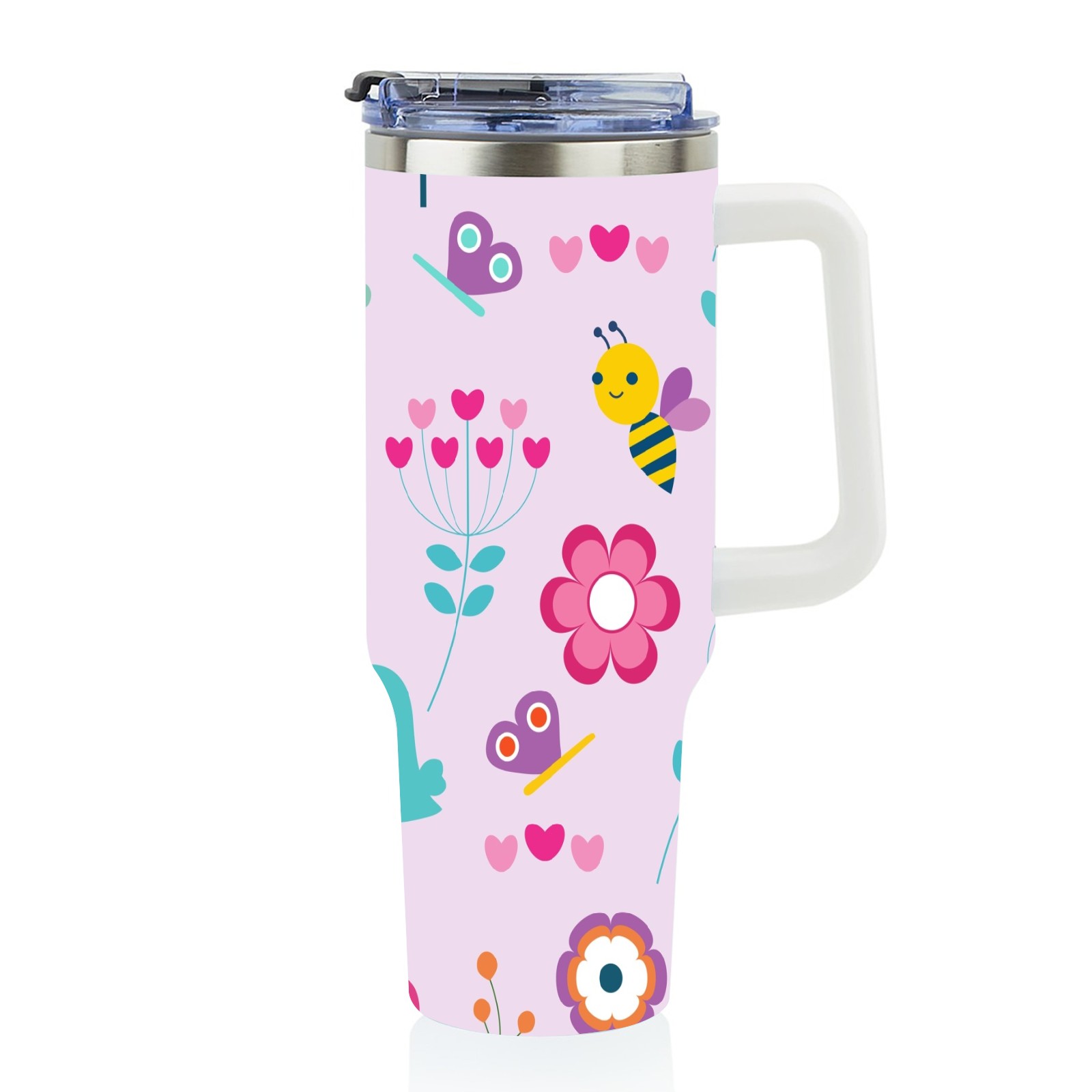 40oz Birds Bee Flowers Seamless thermos with lid and straw, leak-proof stainless steel, with handle, spill-proof bottle, convenient for travel(pink)