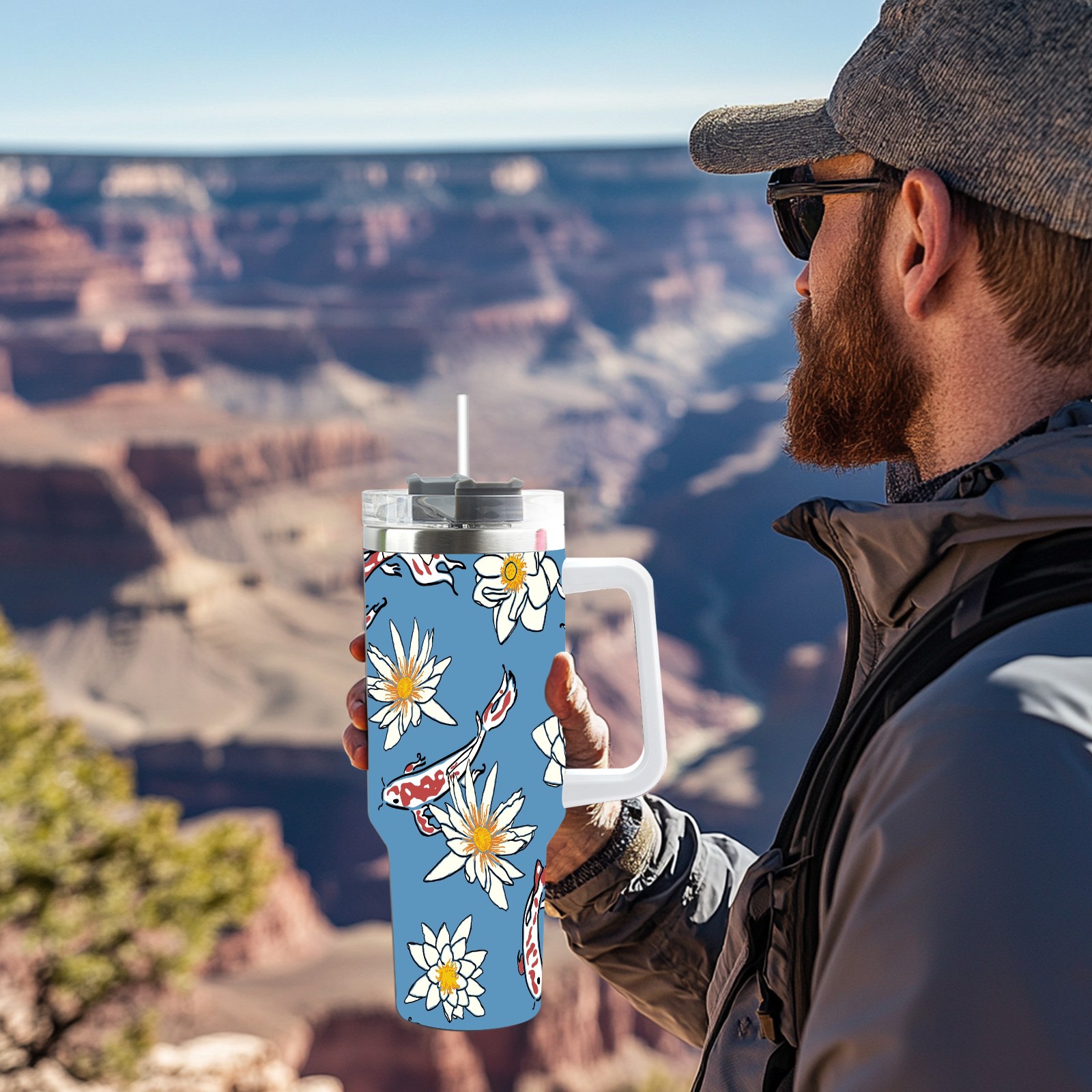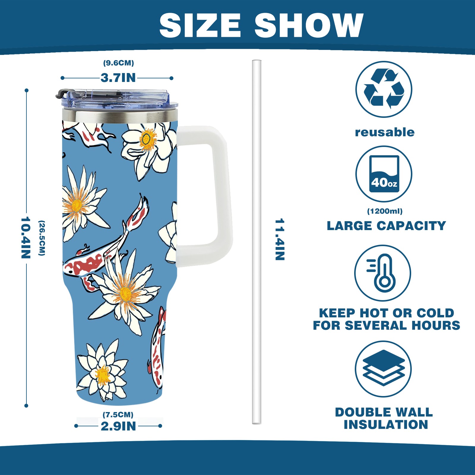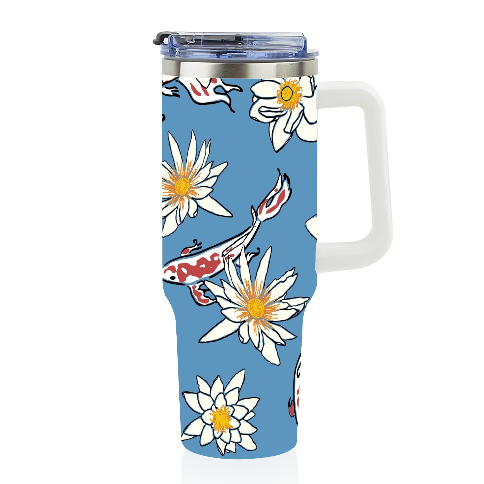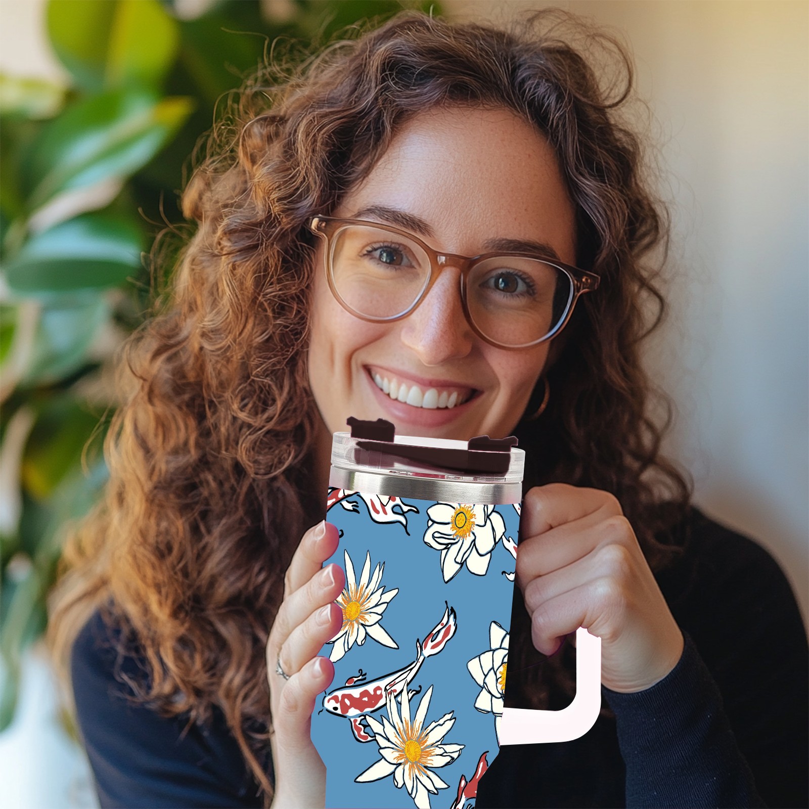 40oz Koi Lotus Lily Seamless thermos with lid and straw, leak-proof stainless steel, with handle, spill-proof bottle, convenient for travel(pink)