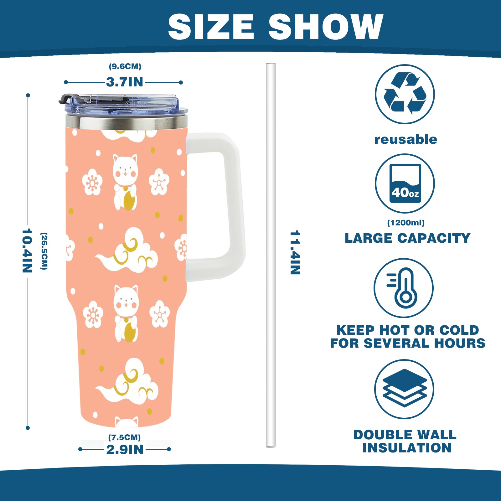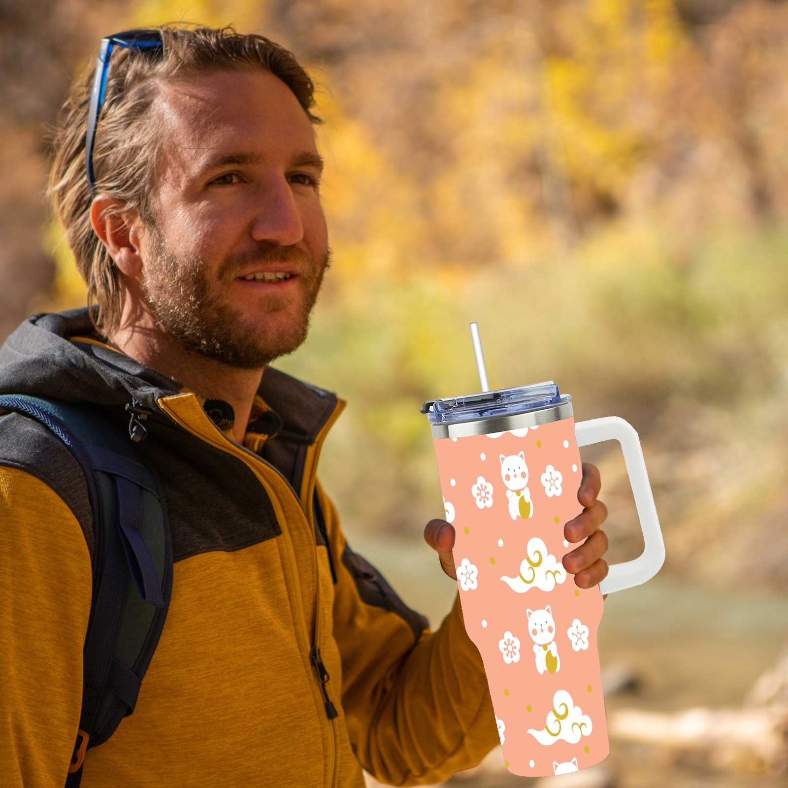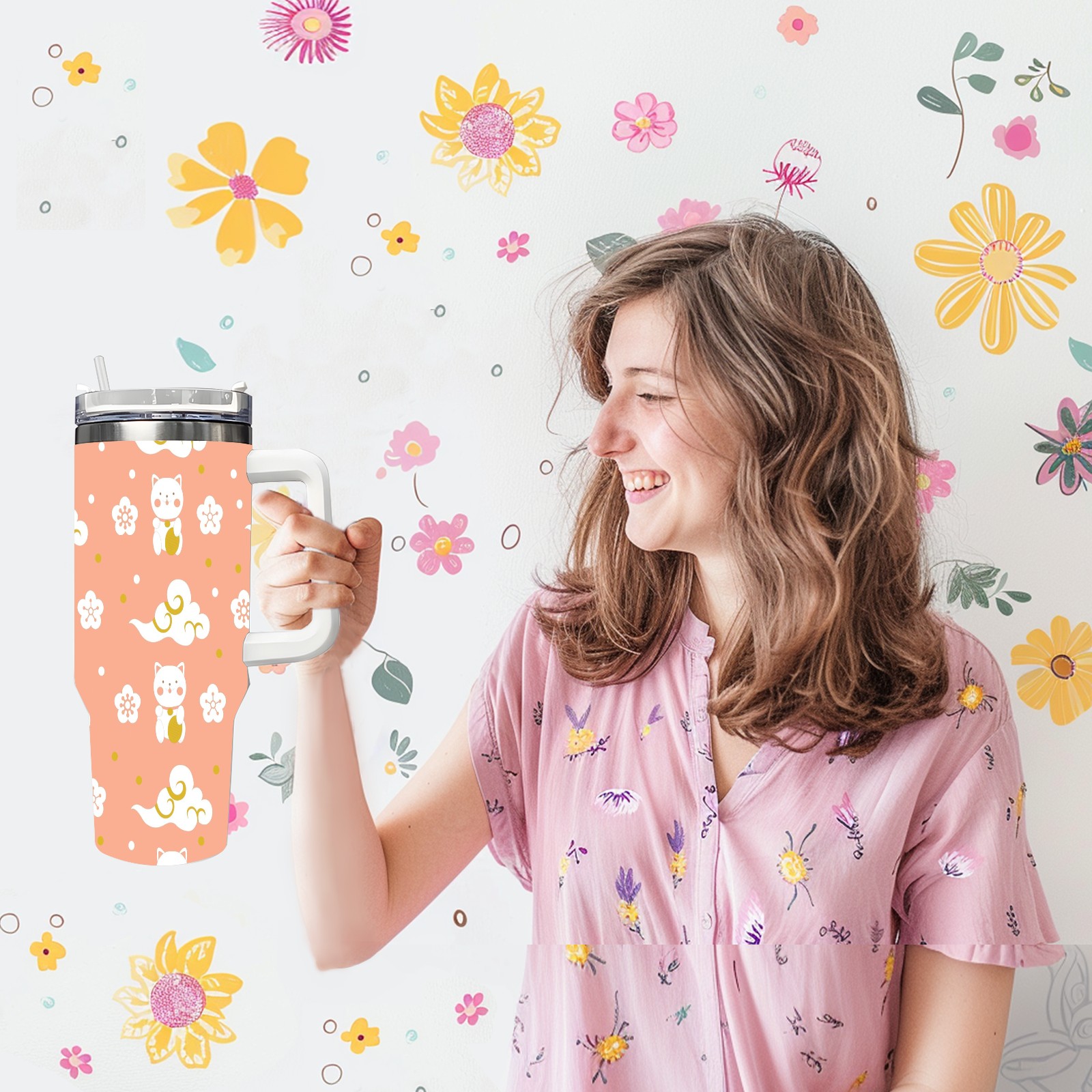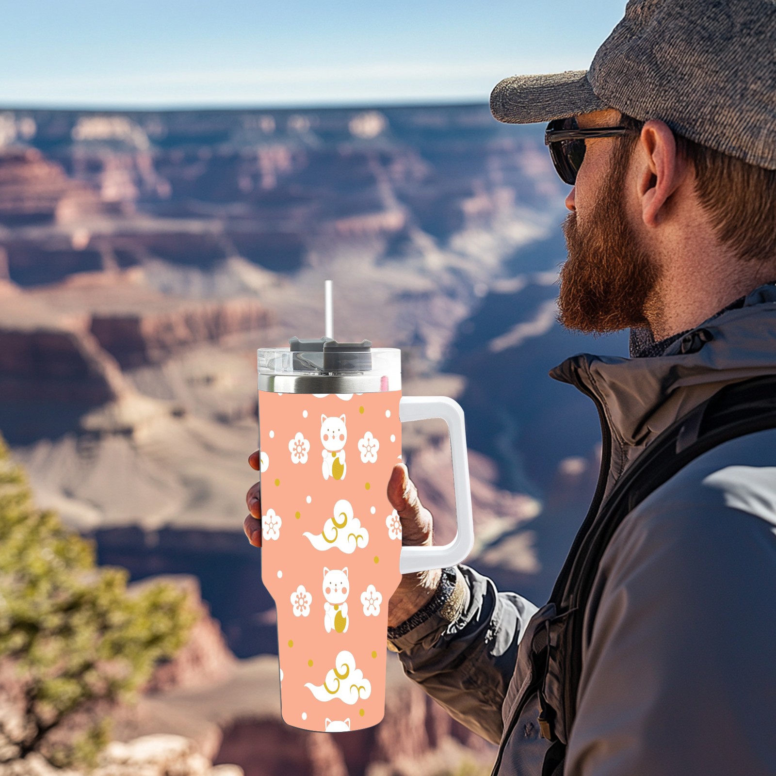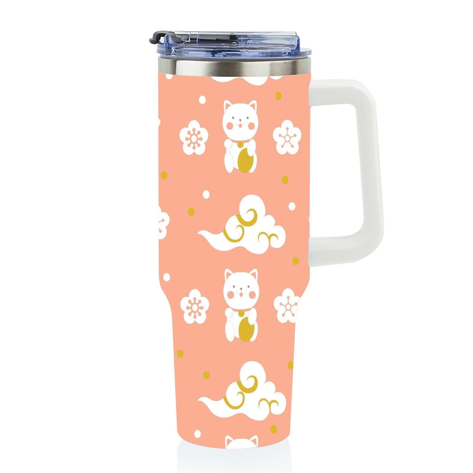 40oz Cat Clouds Seamless thermos with lid and straw, leak-proof stainless steel, with handle, spill-proof bottle, convenient for travel(pink)