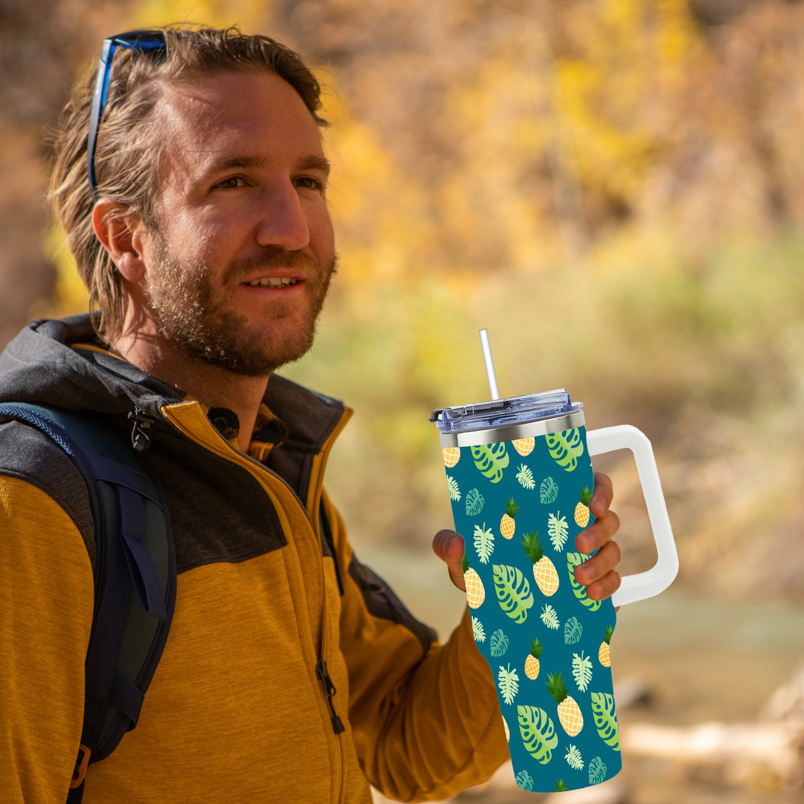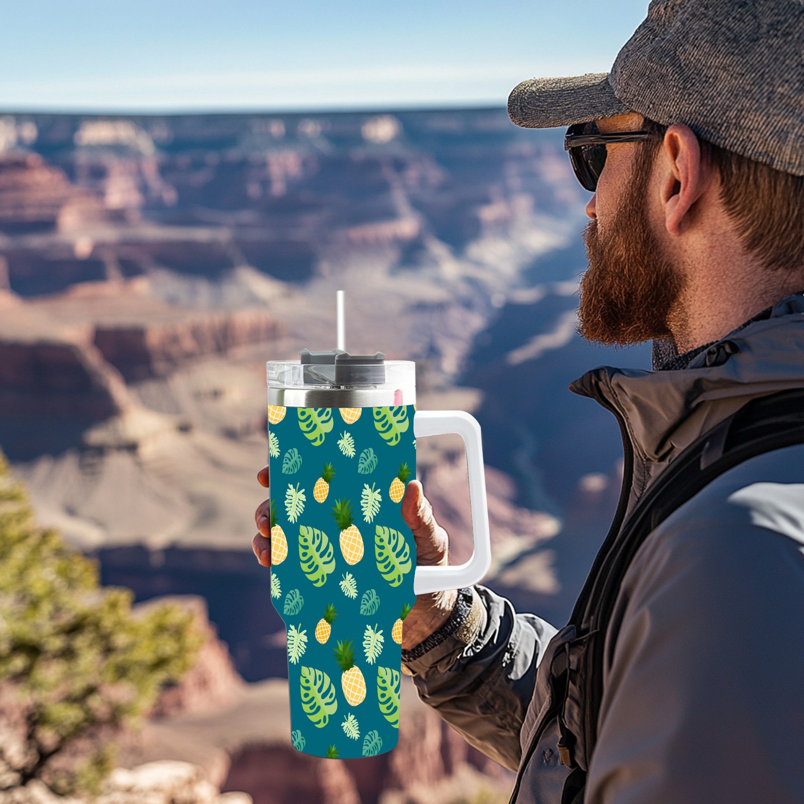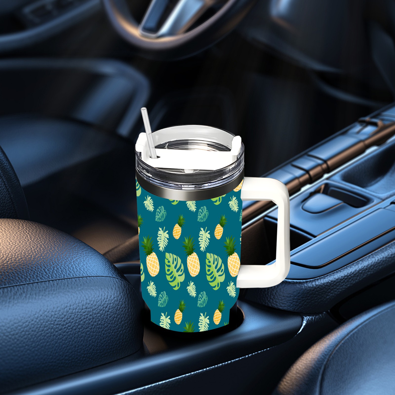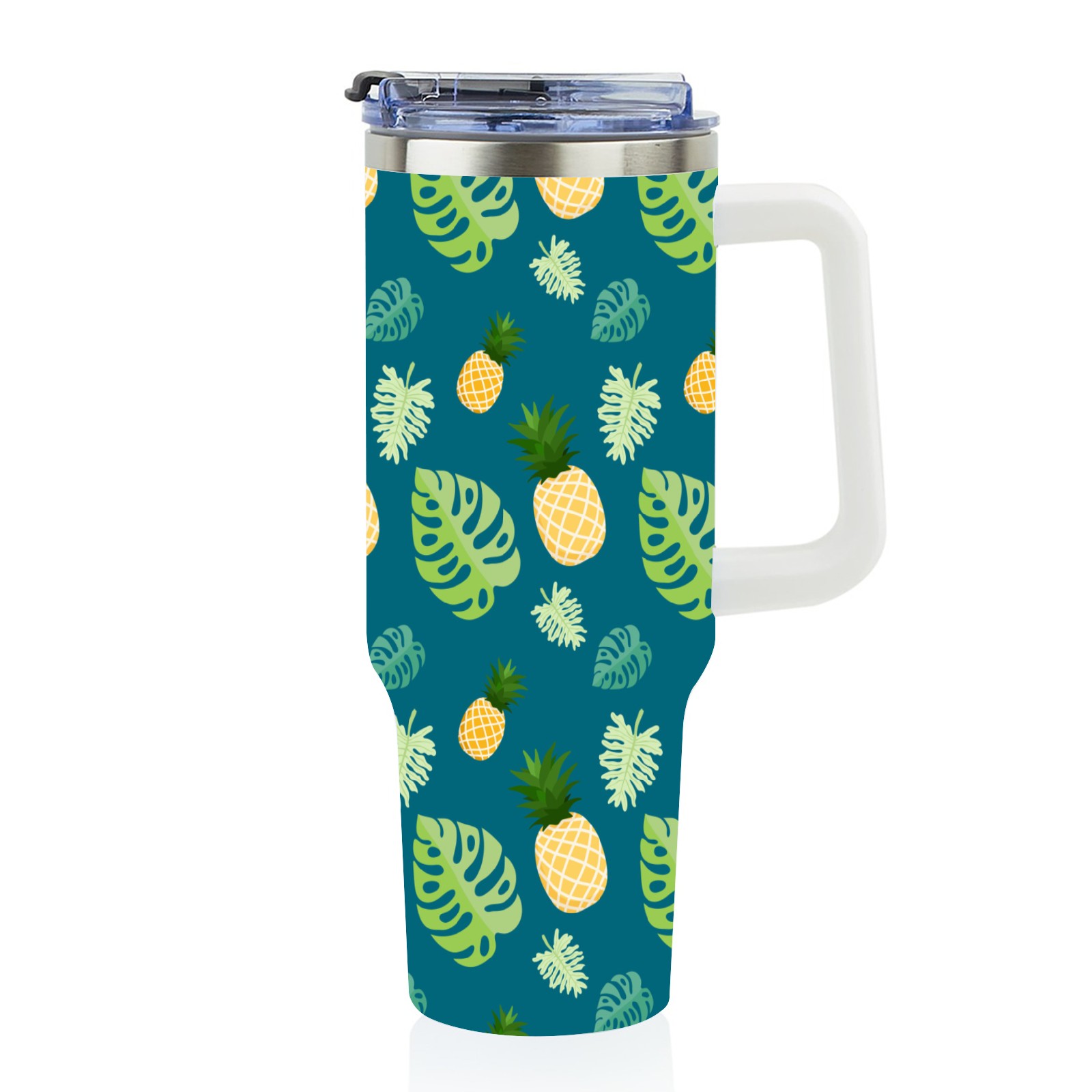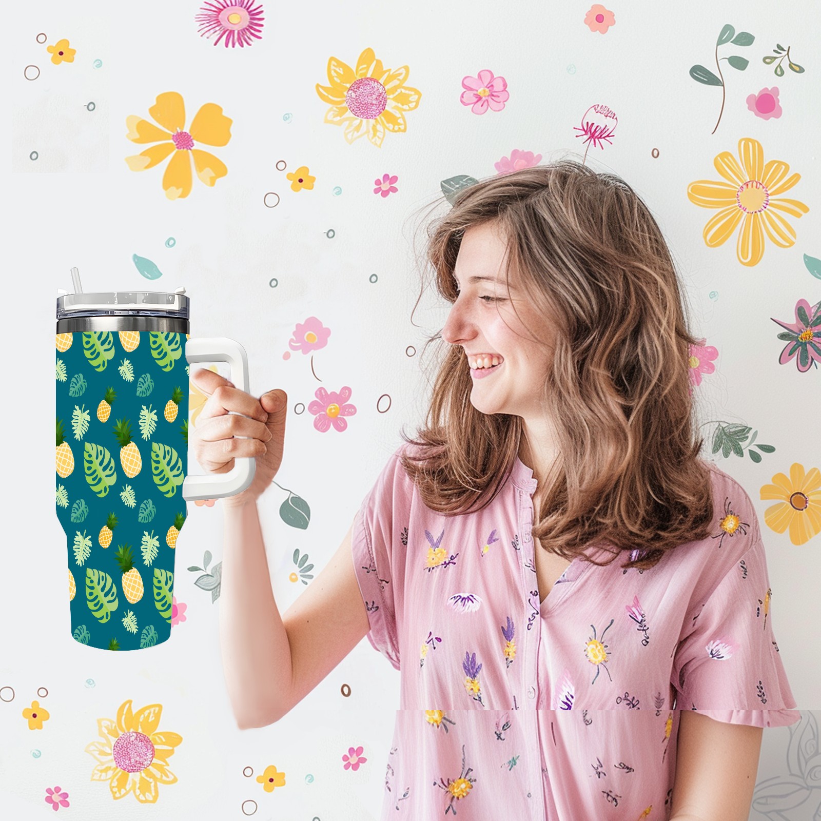 40oz Banana Leaf thermos with lid and straw, leak-proof stainless steel, with handle, spill-proof bottle, convenient for travel(pink)