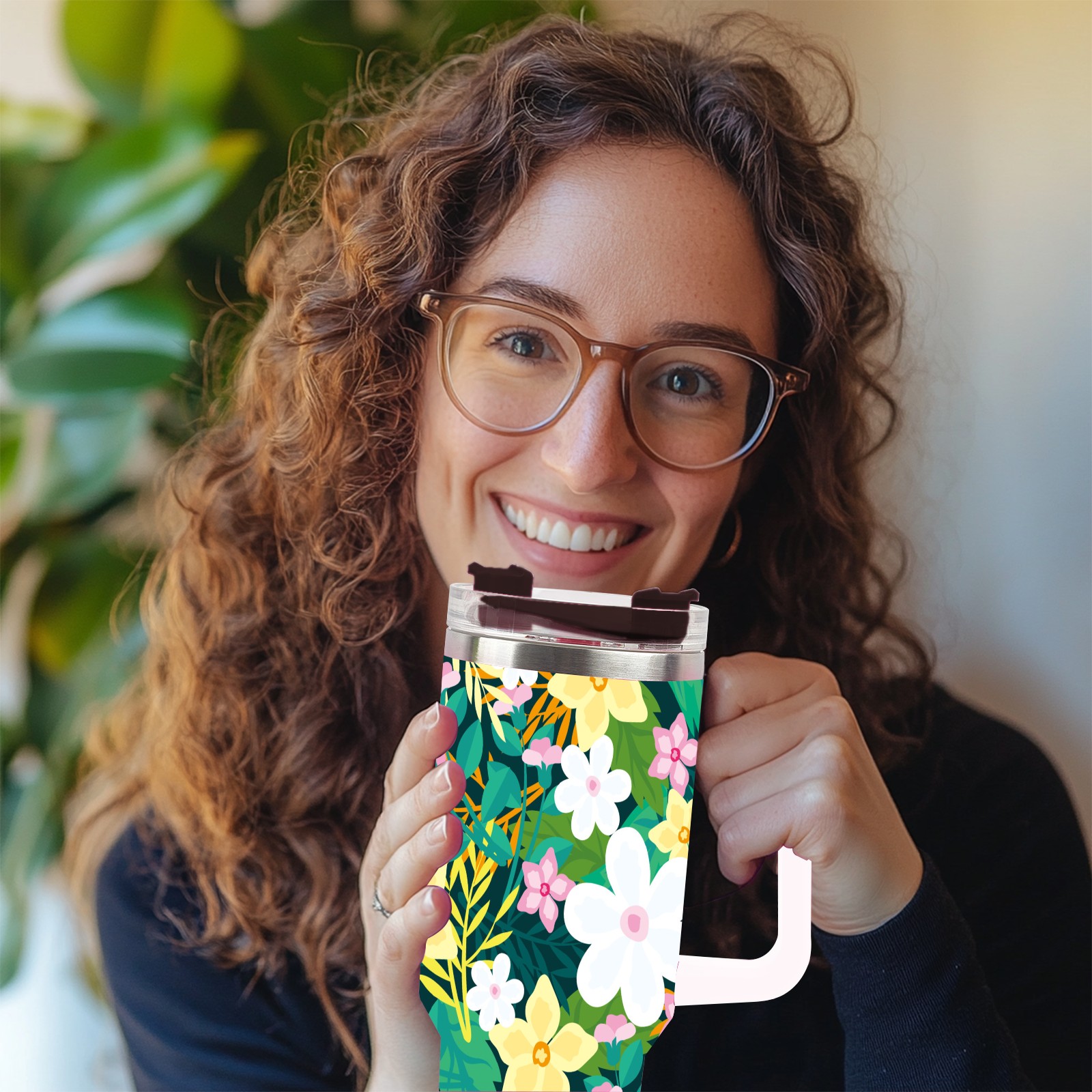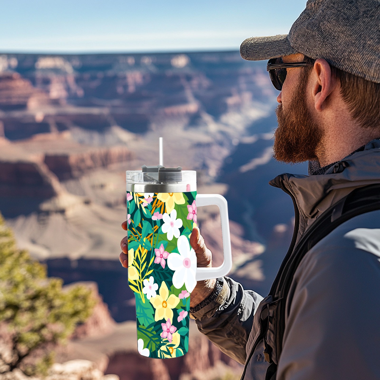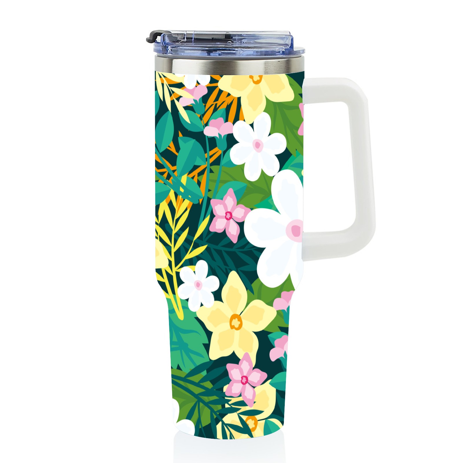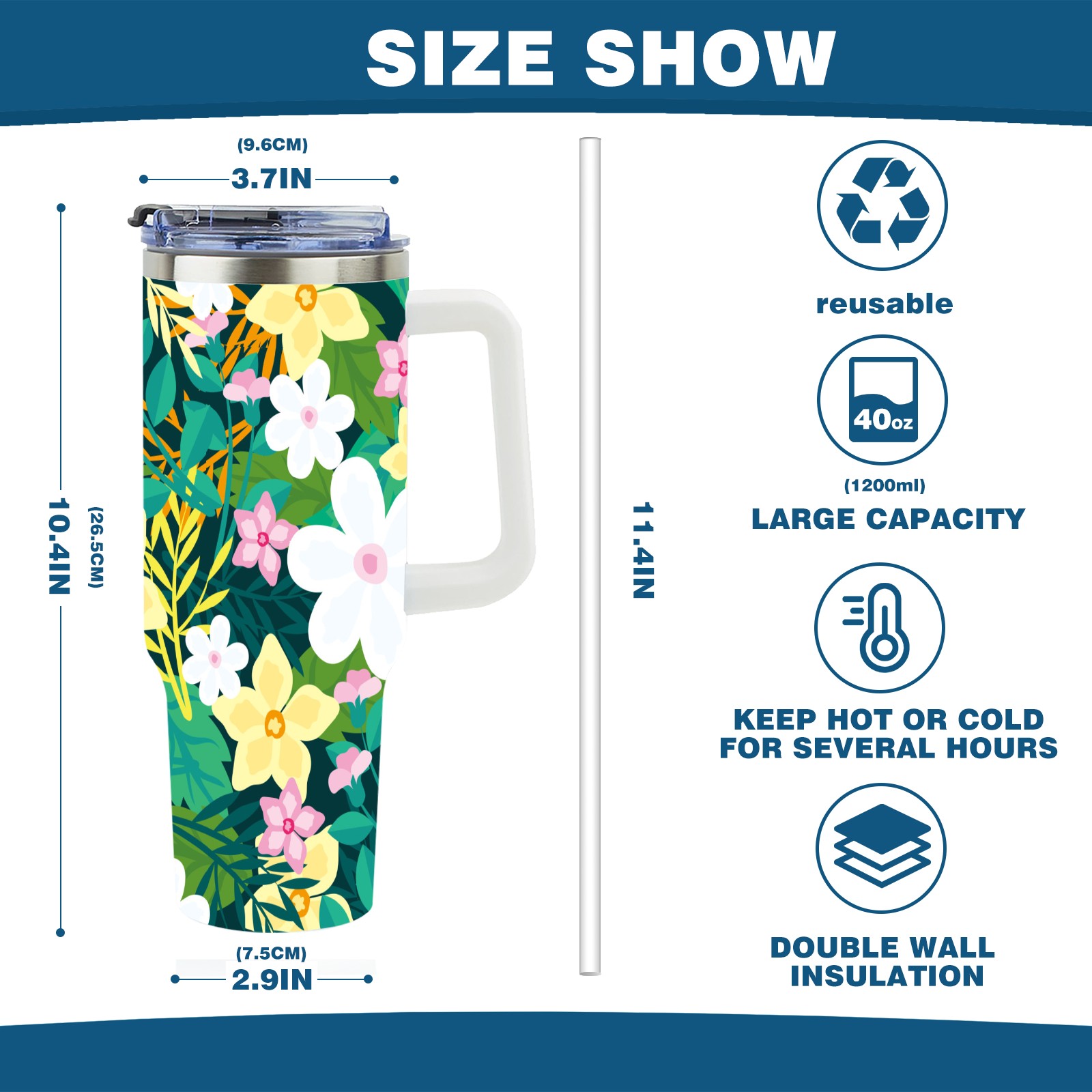 40oz Flower Background thermos with lid and straw, leak-proof stainless steel, with handle, spill-proof bottle, convenient for travel(pink)