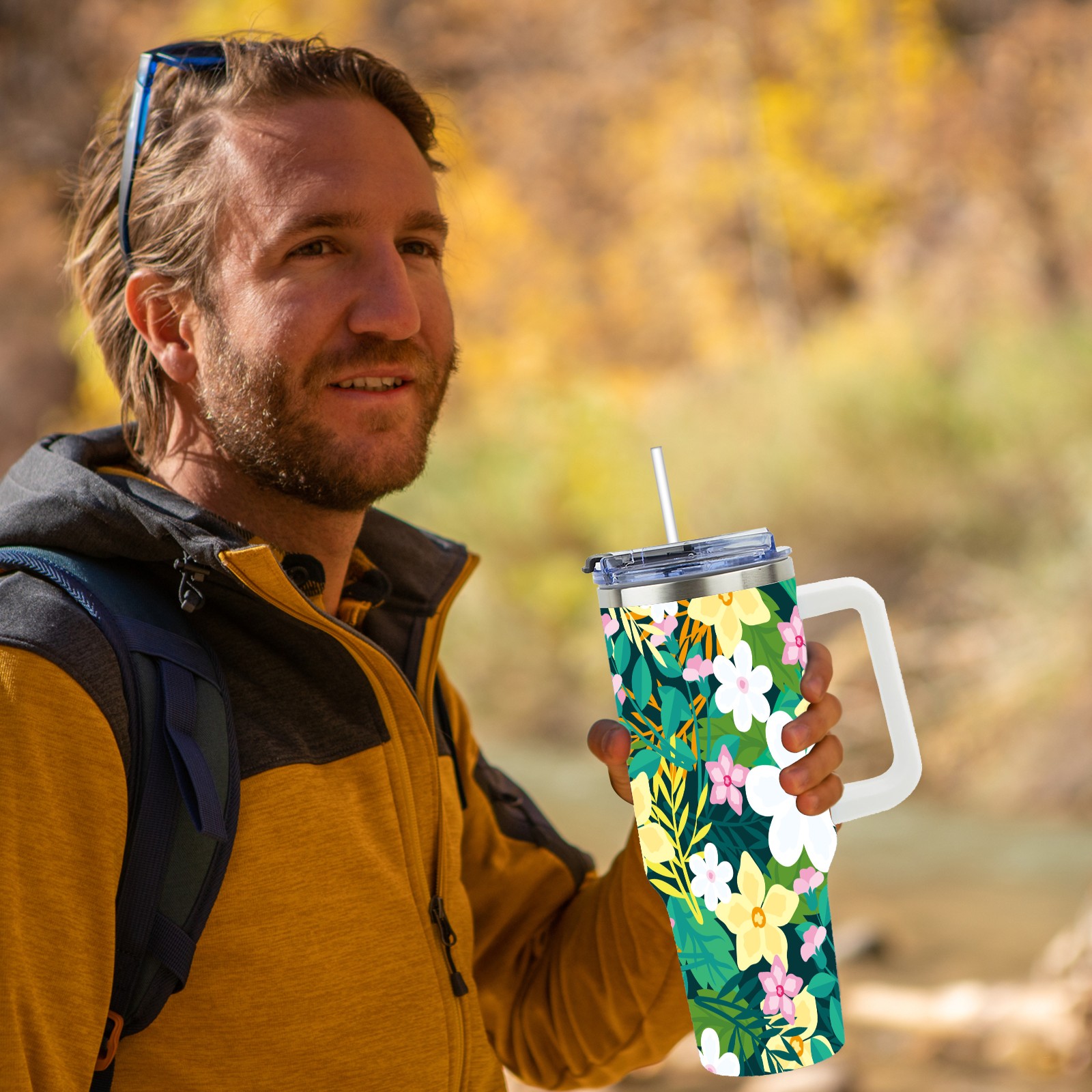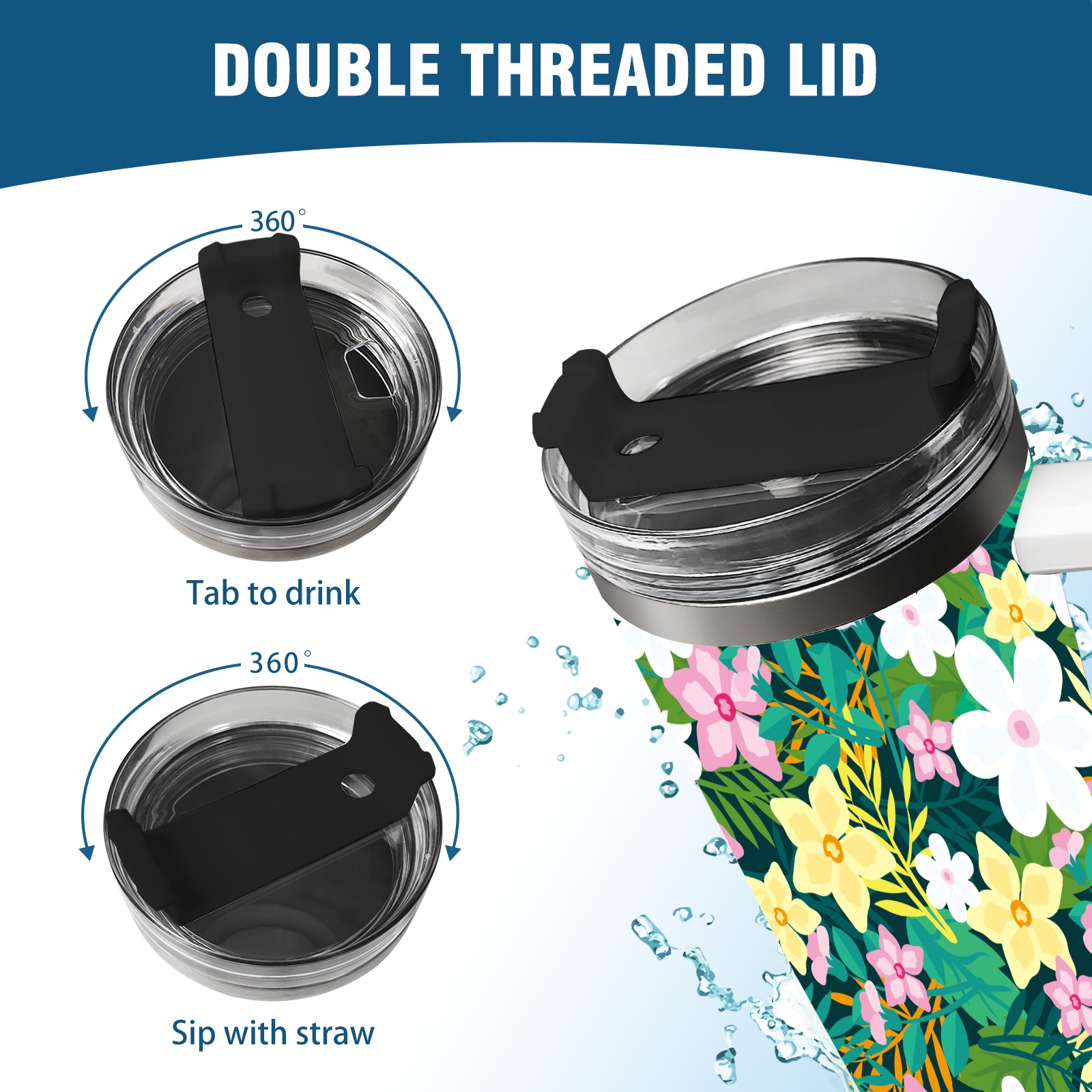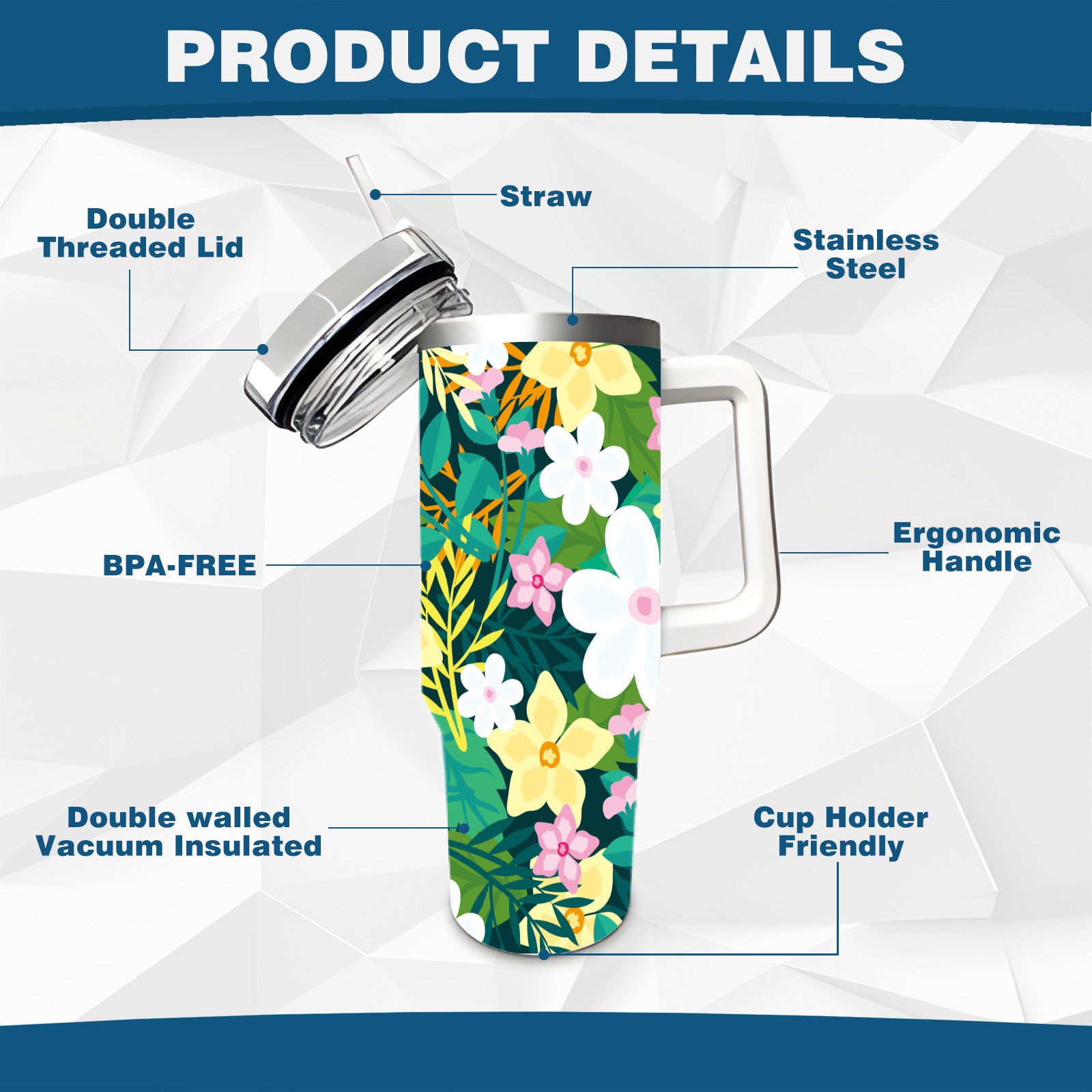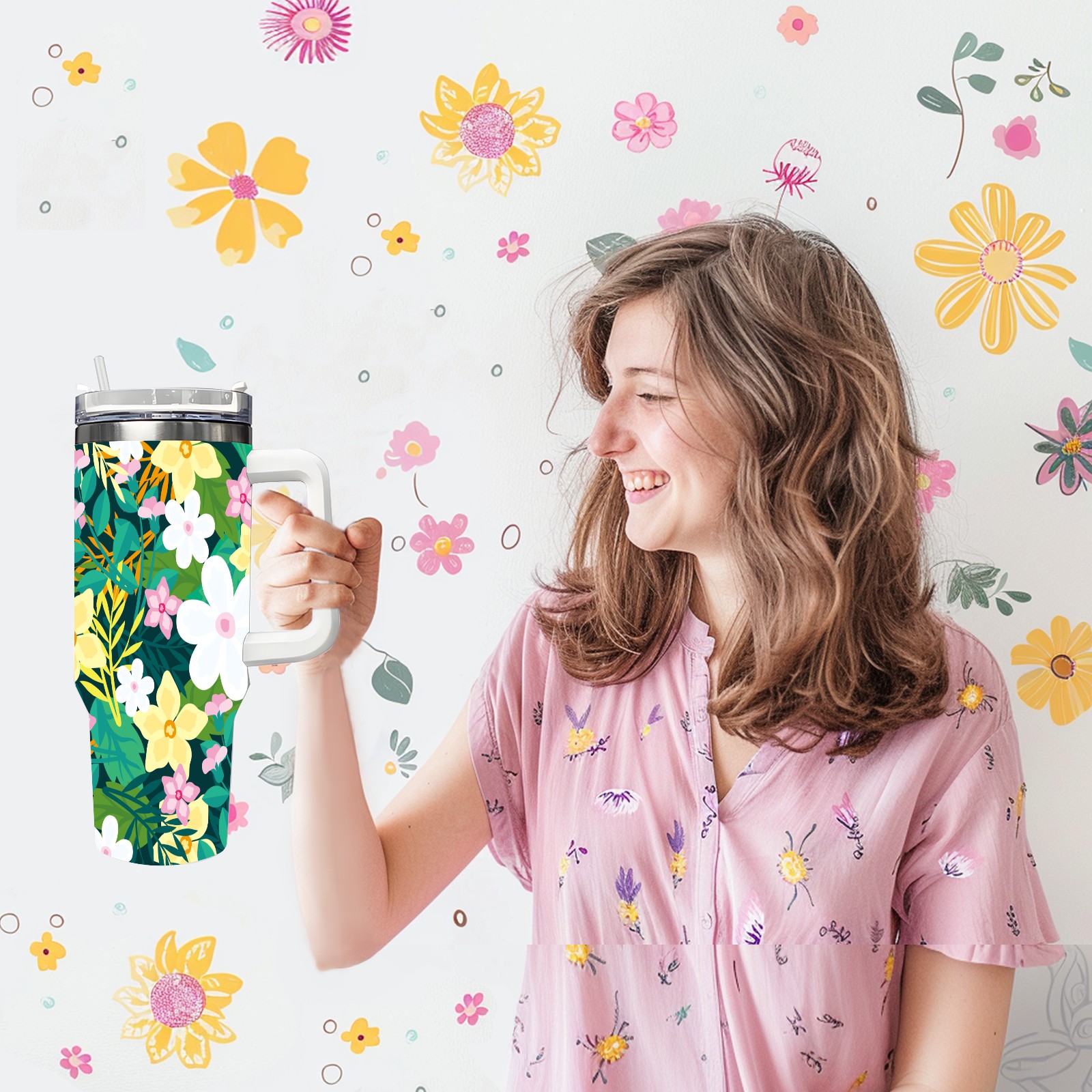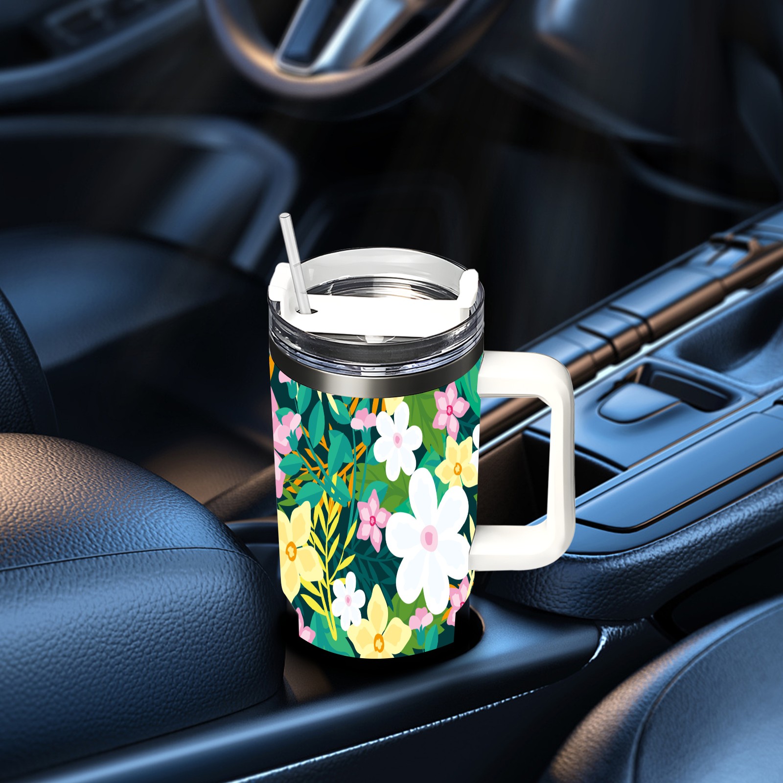 40oz Flower Background thermos with lid and straw, leak-proof stainless steel, with handle, spill-proof bottle, convenient for travel(pink)