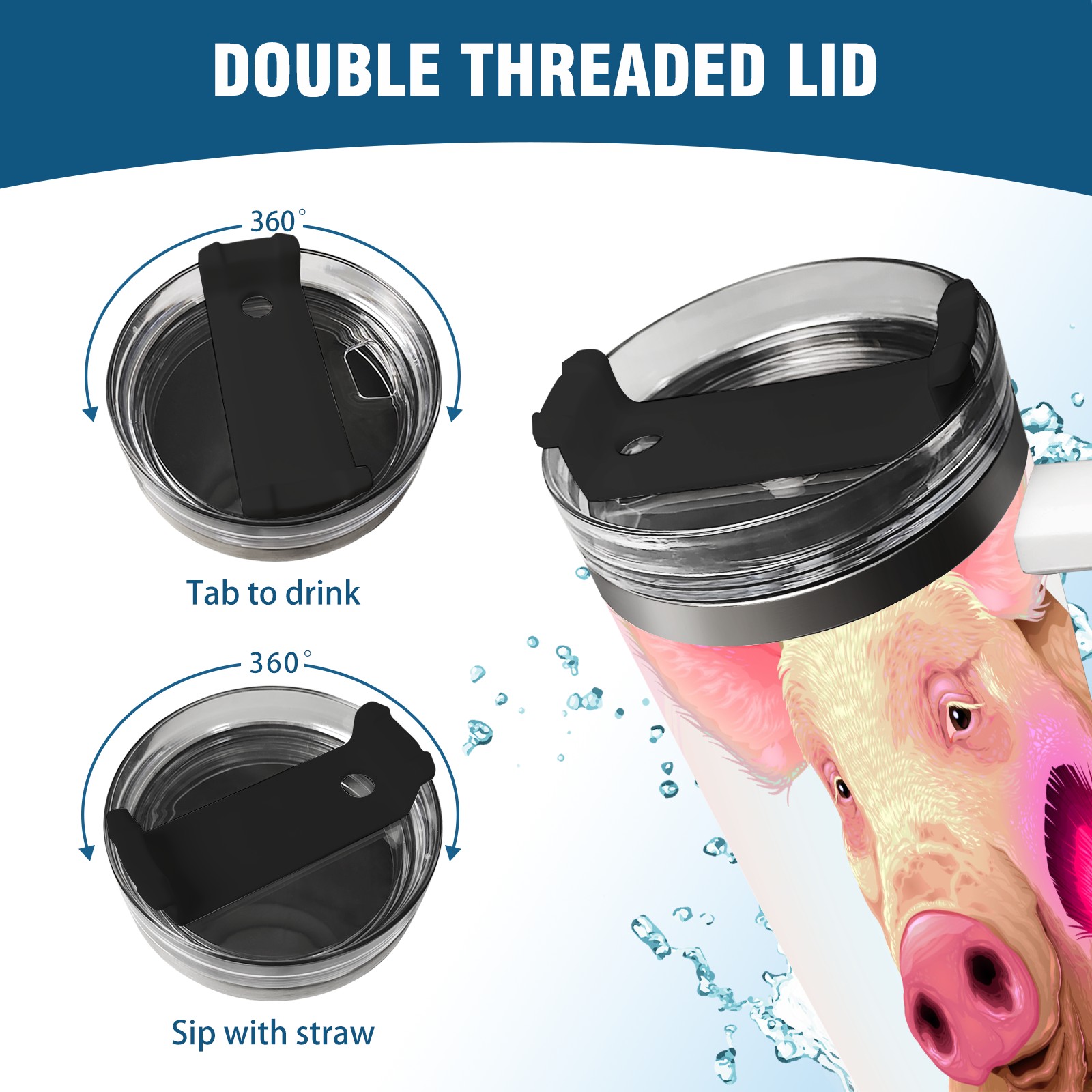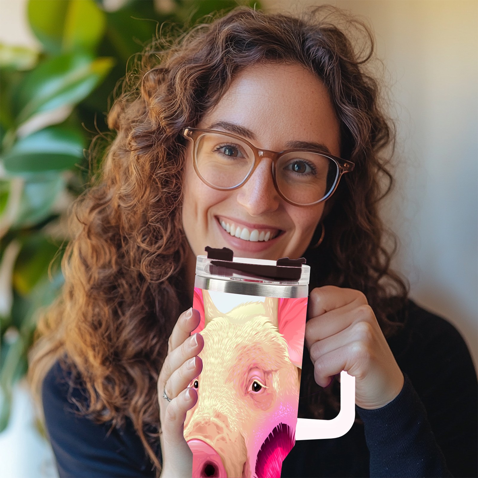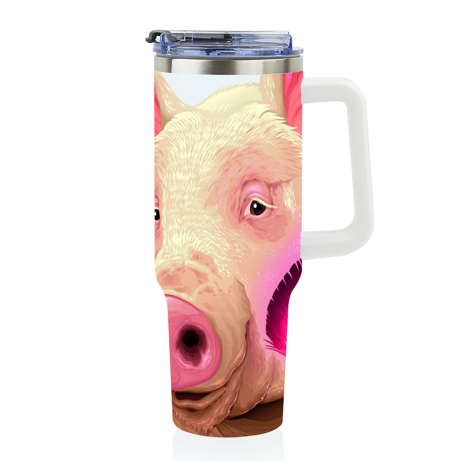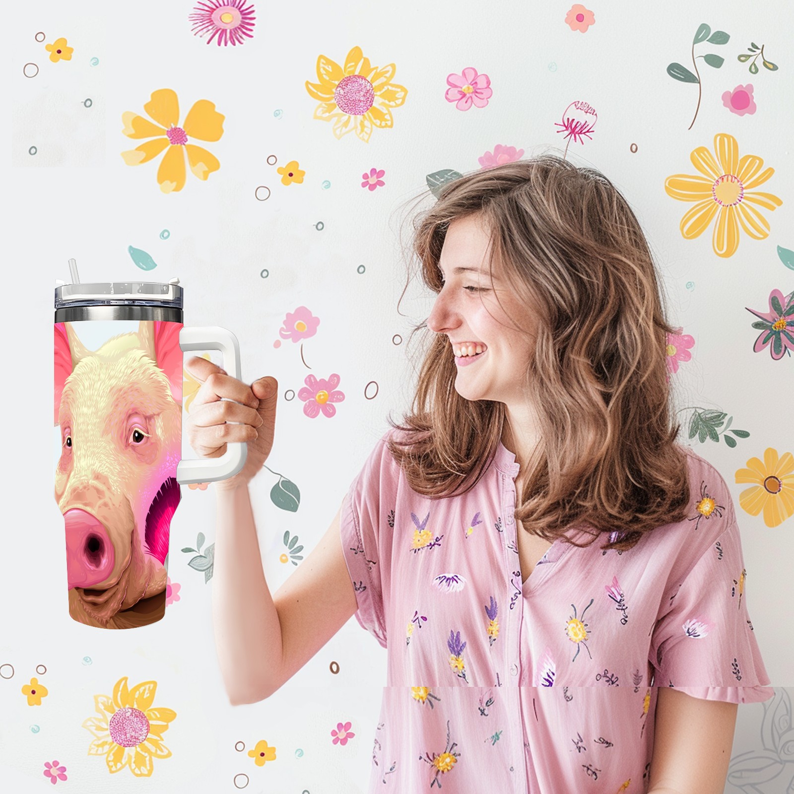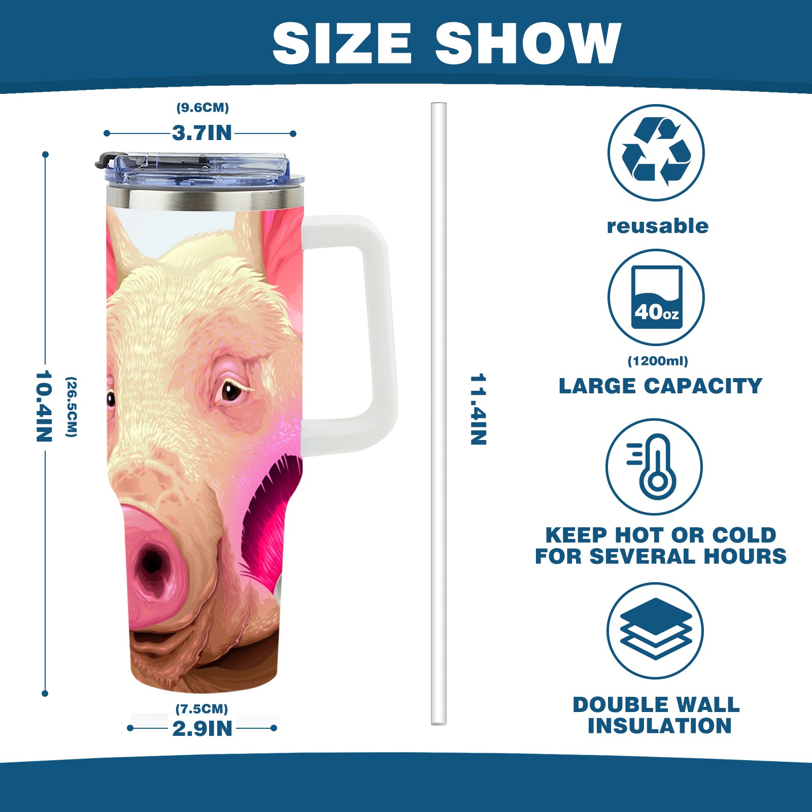 40oz Charming Pig thermos with lid and straw, leak-proof stainless steel, with handle, spill-proof bottle, convenient for travel(pink)