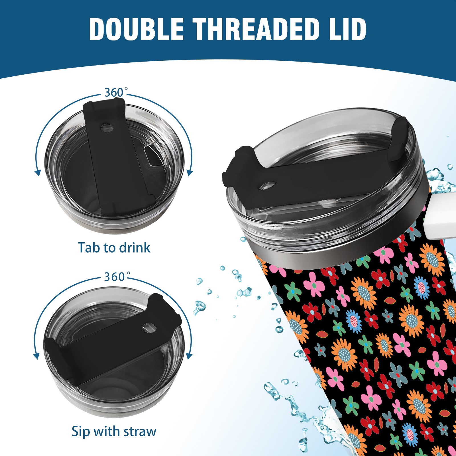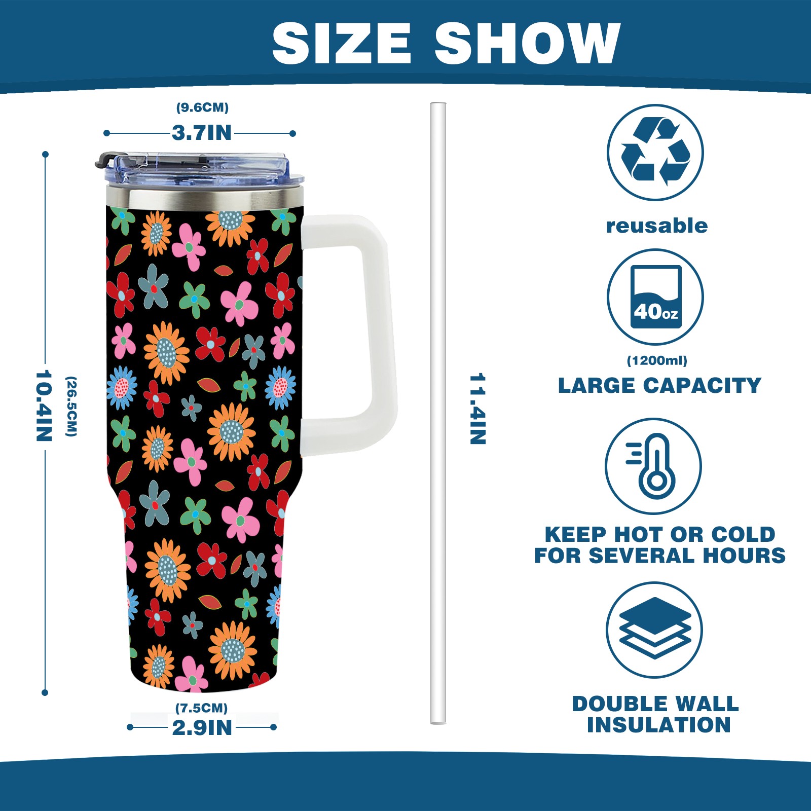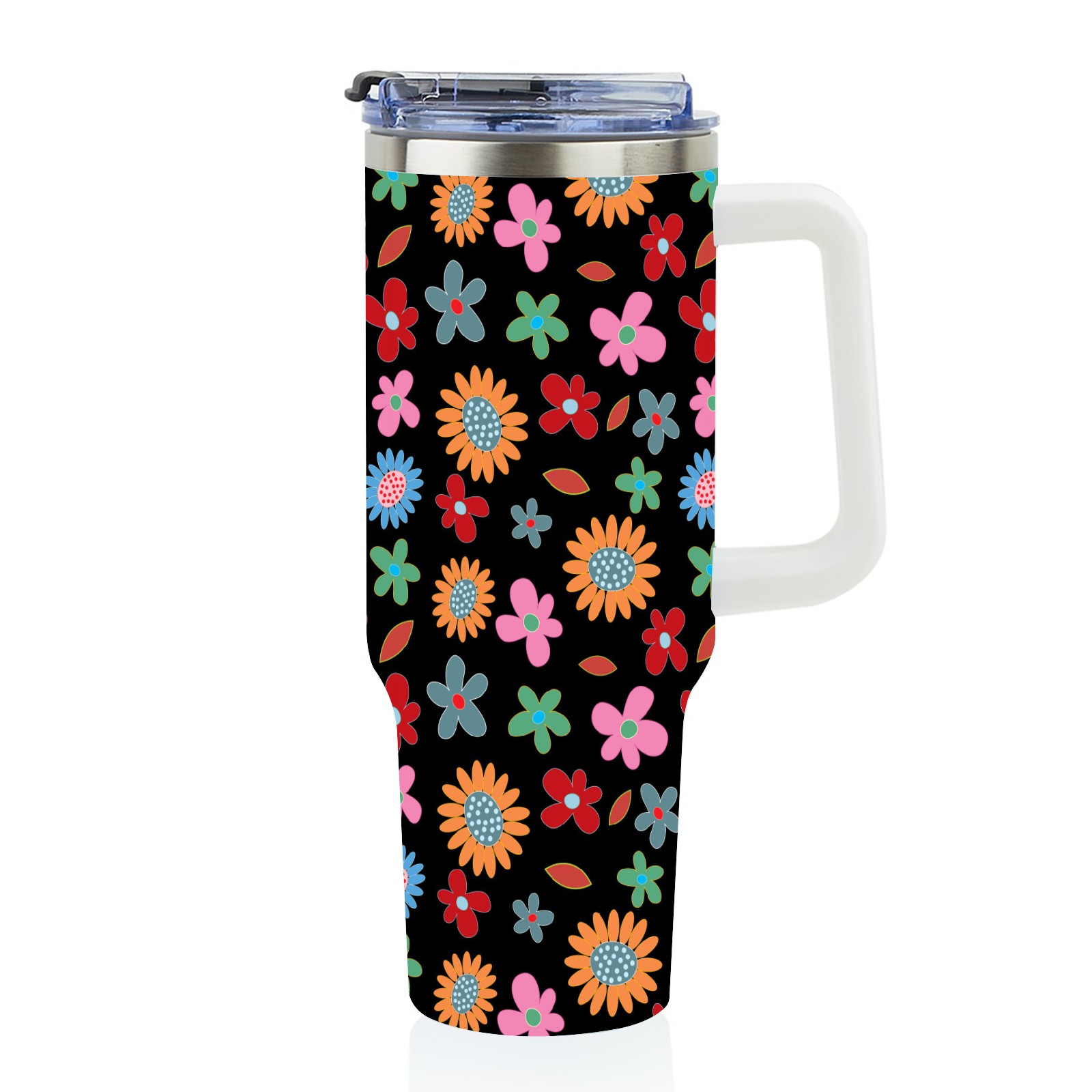 40oz Floral Pattern thermos with lid and straw, leak-proof stainless steel, with handle, spill-proof bottle, convenient for travel(pink)