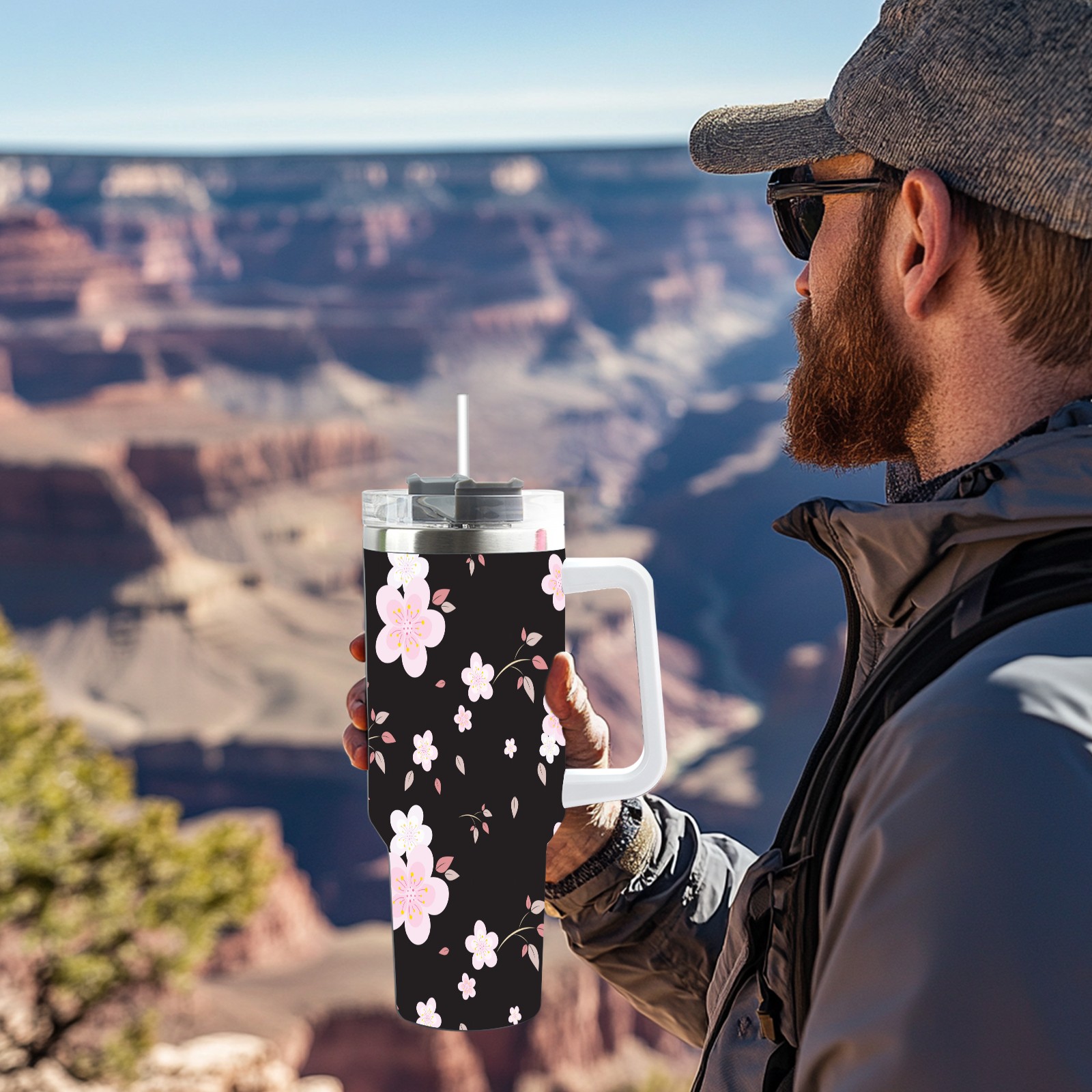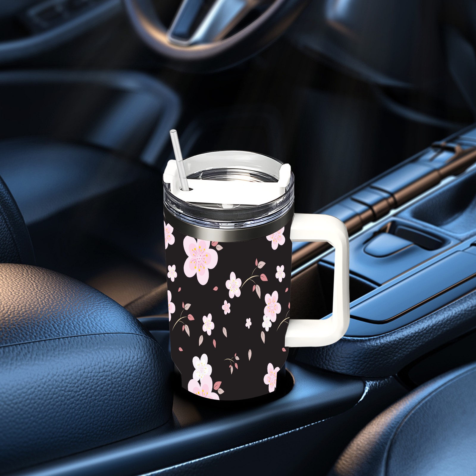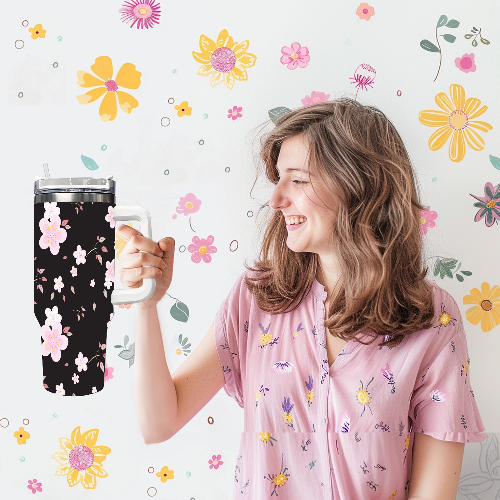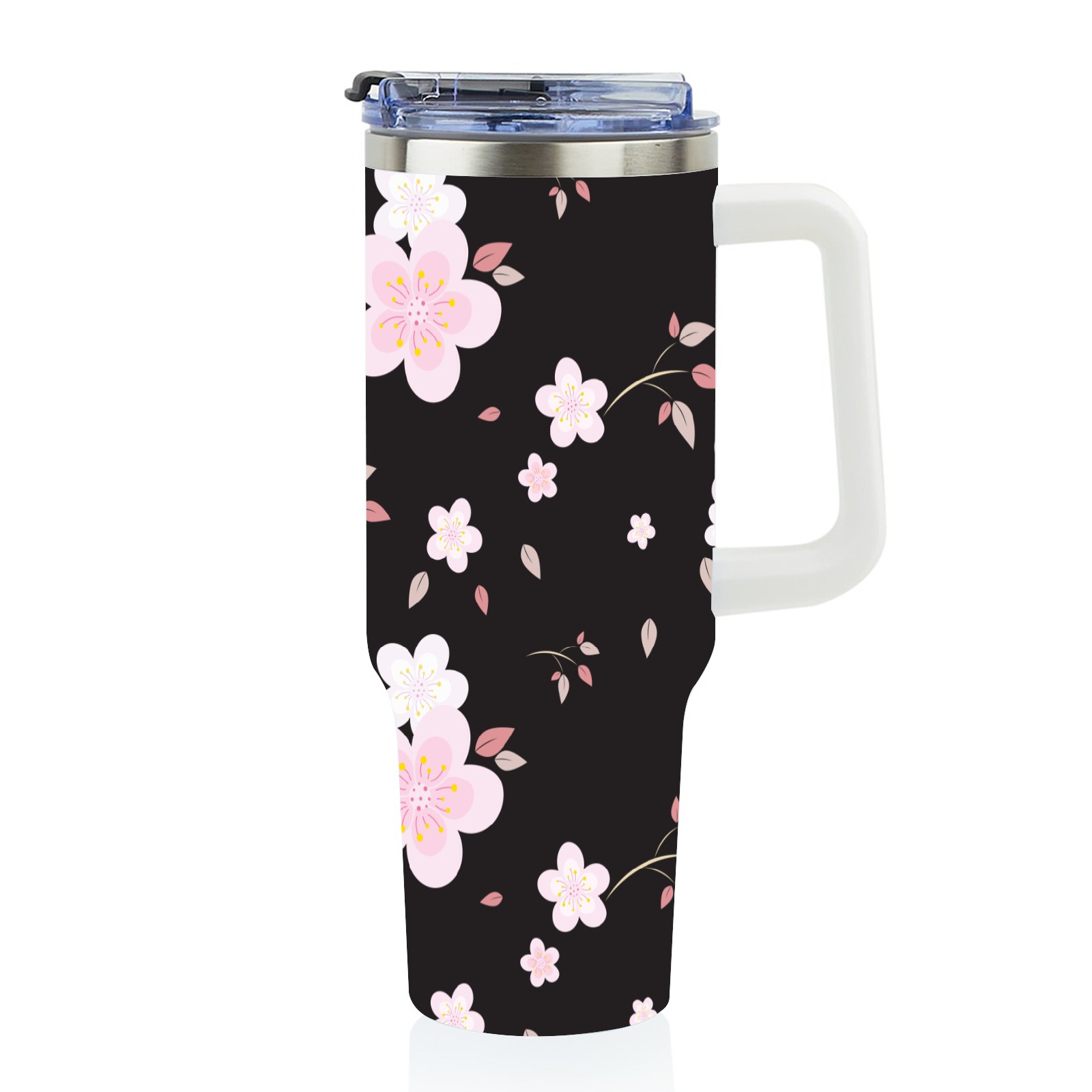 40oz Seamless Flora thermos with lid and straw, leak-proof stainless steel, with handle, spill-proof bottle, convenient for travel(pink)