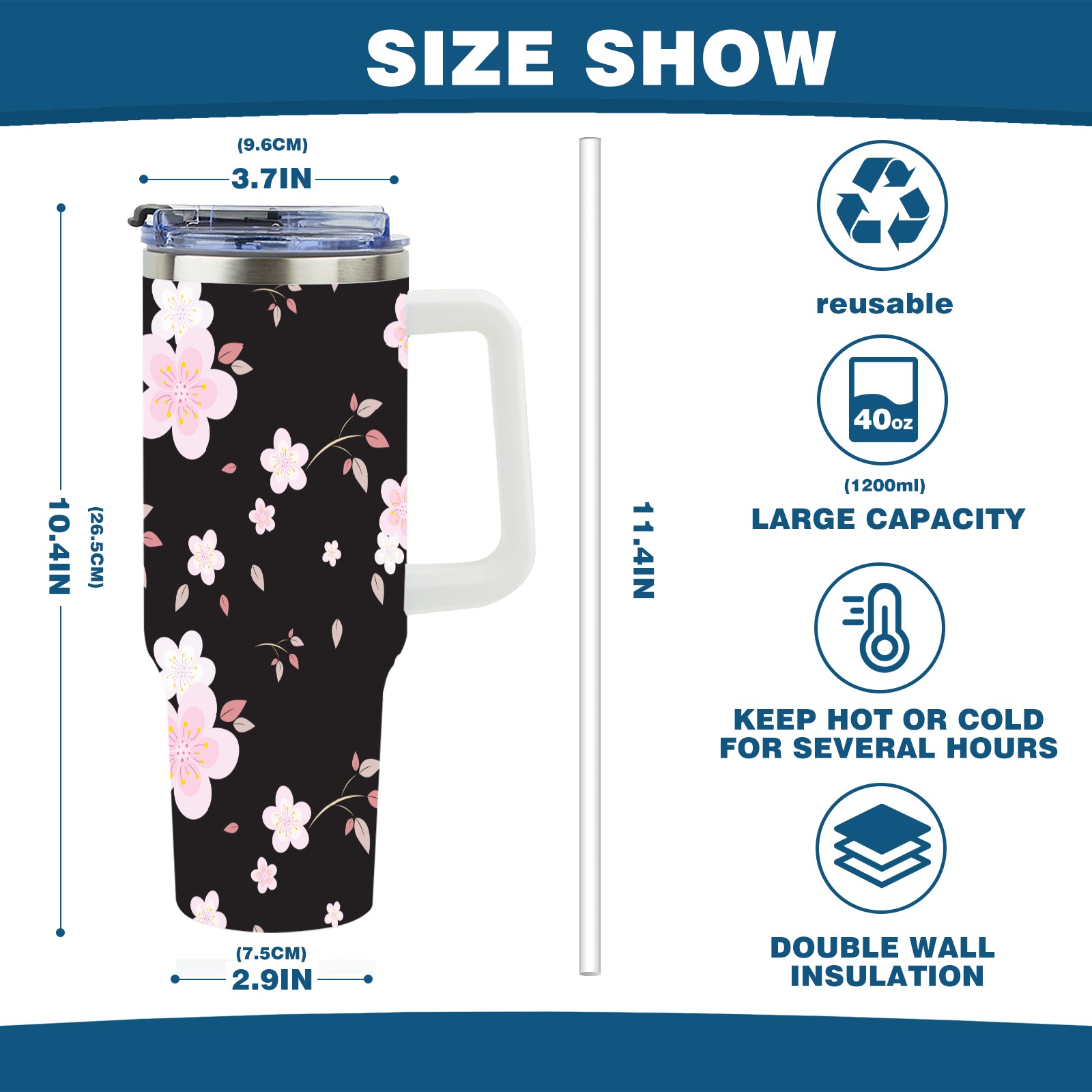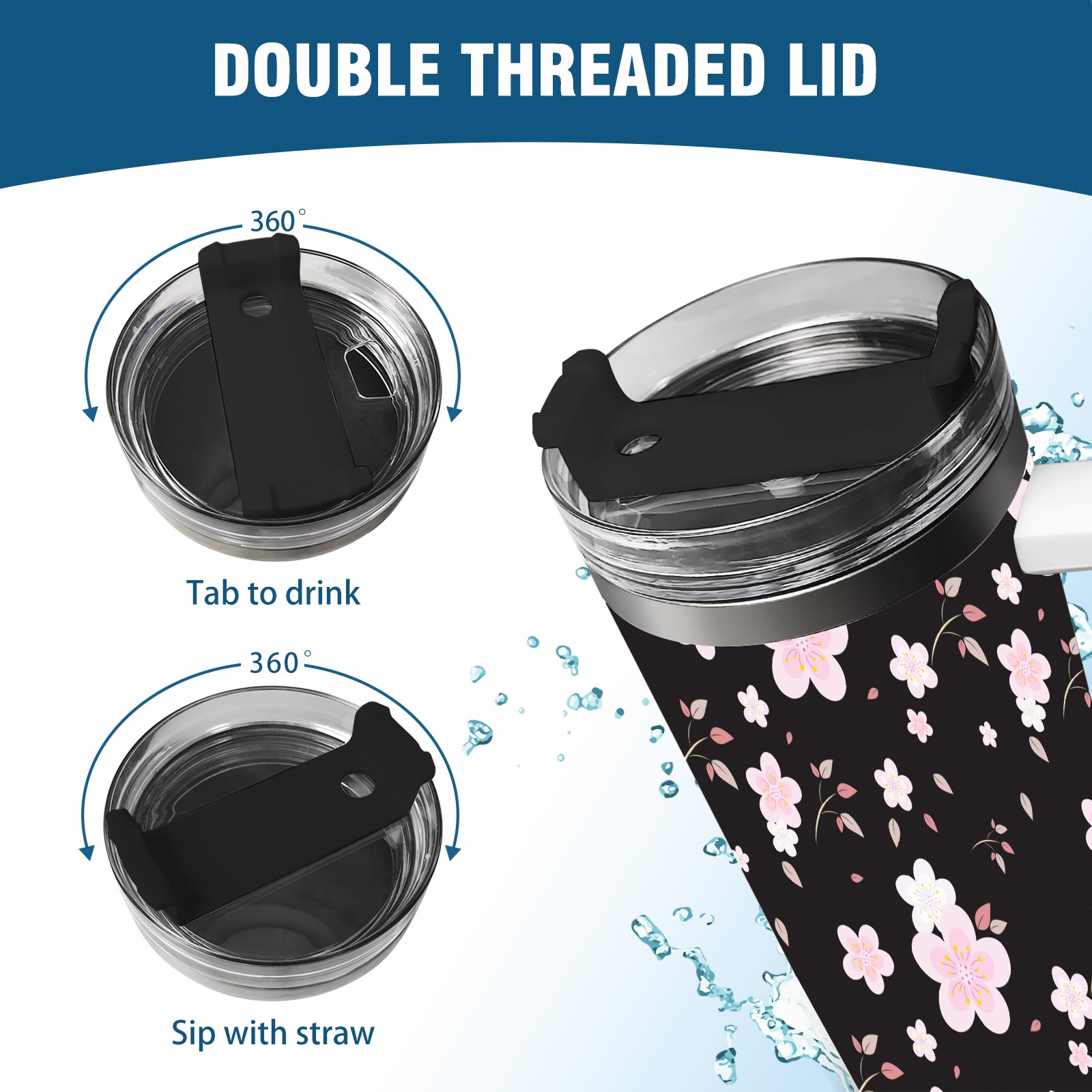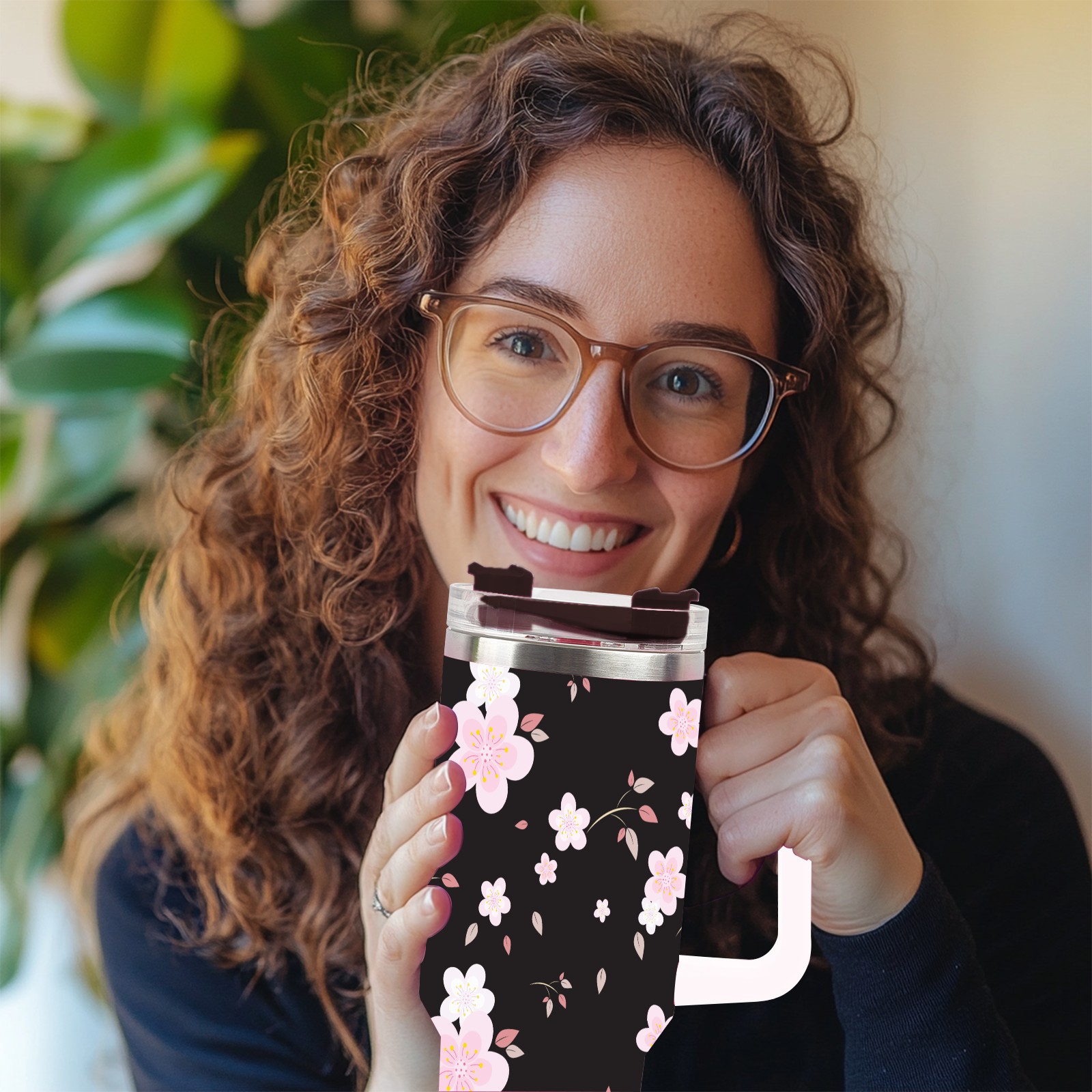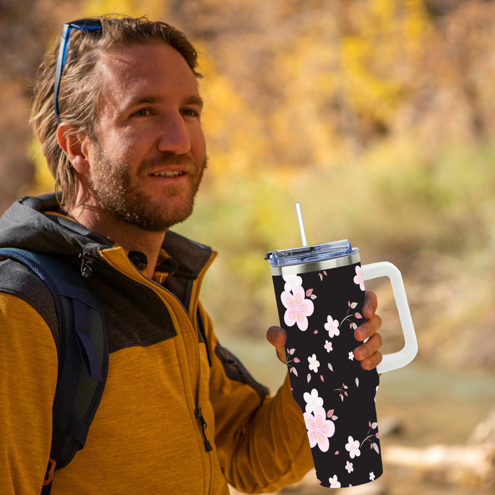 40oz Seamless Flora thermos with lid and straw, leak-proof stainless steel, with handle, spill-proof bottle, convenient for travel(pink)