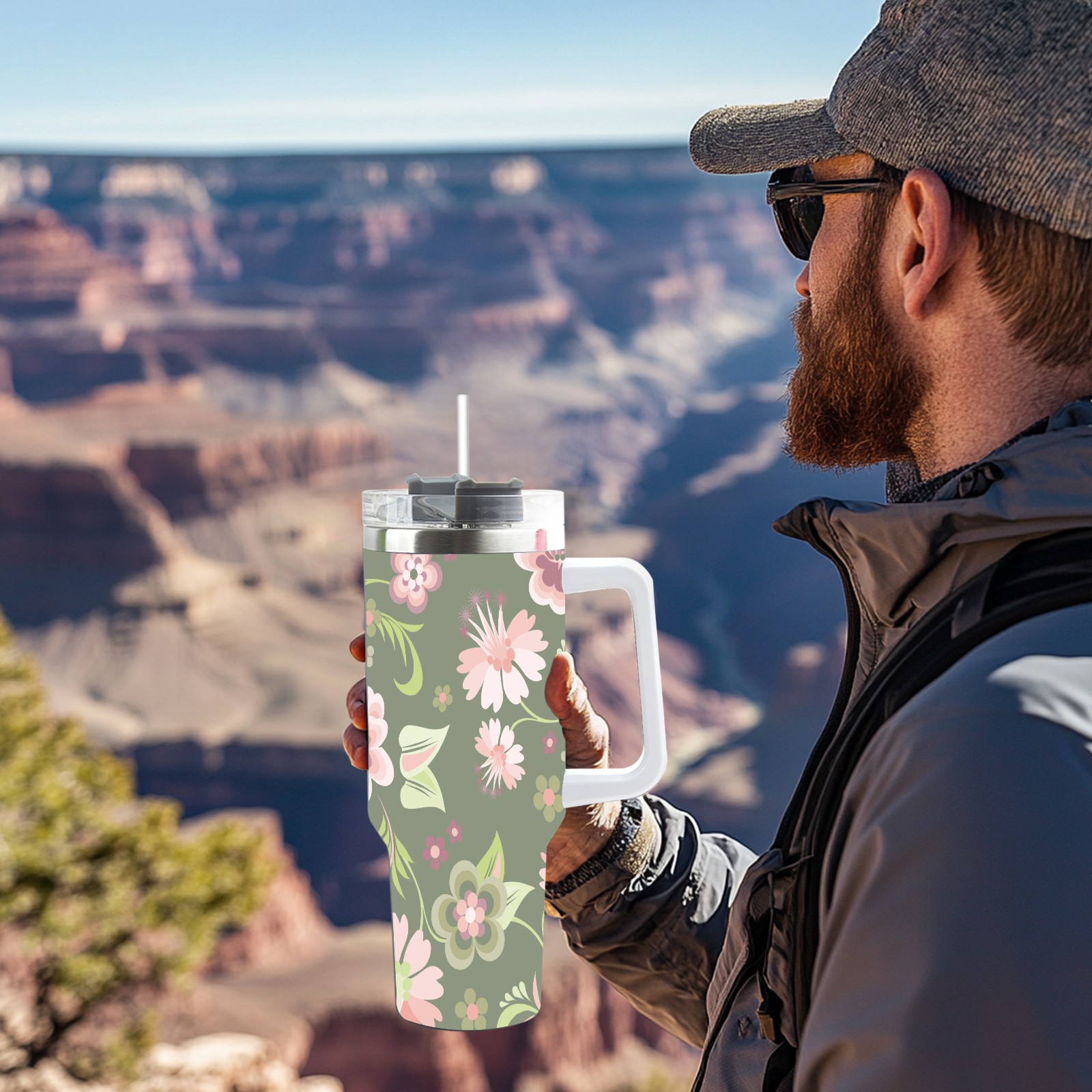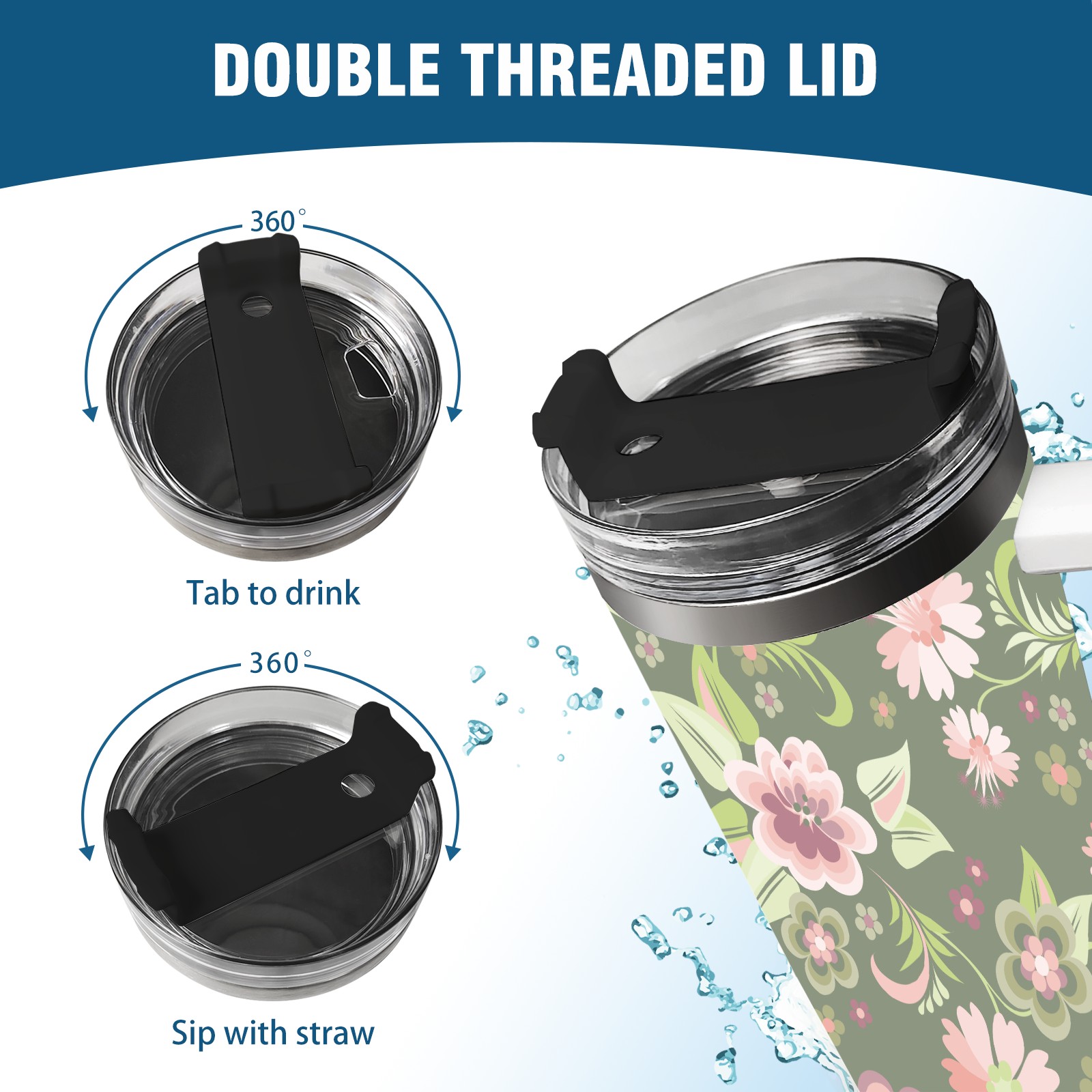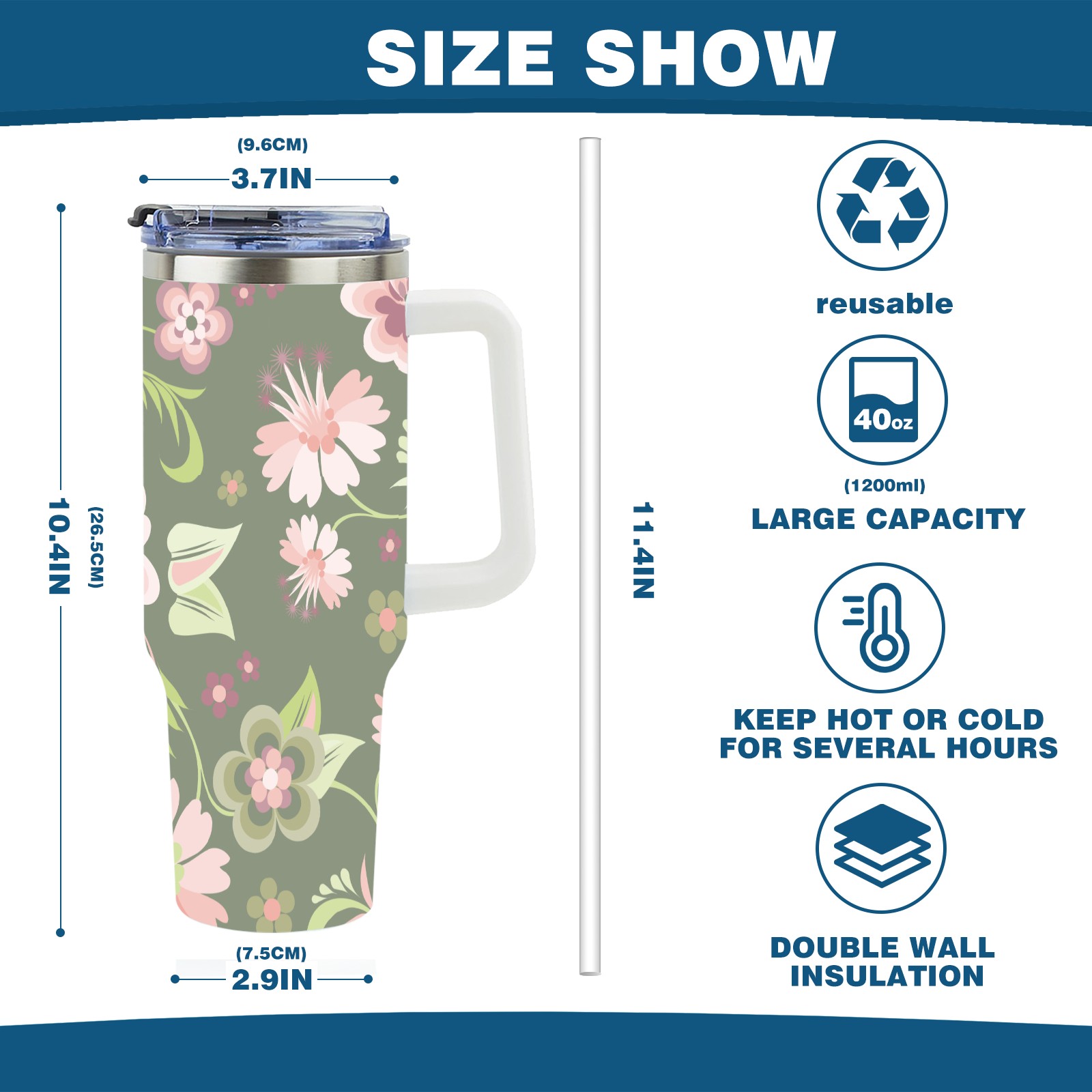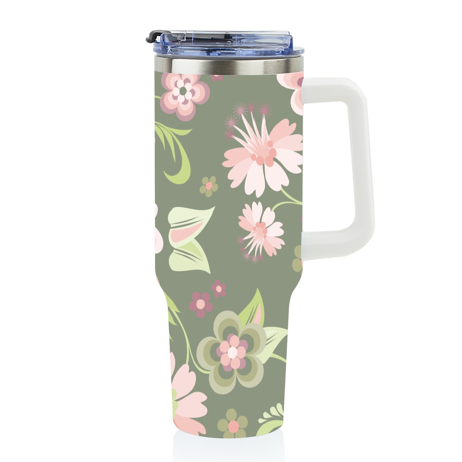 40oz Flower Pattern thermos with lid and straw, leak-proof stainless steel, with handle, spill-proof bottle, convenient for travel(pink)
