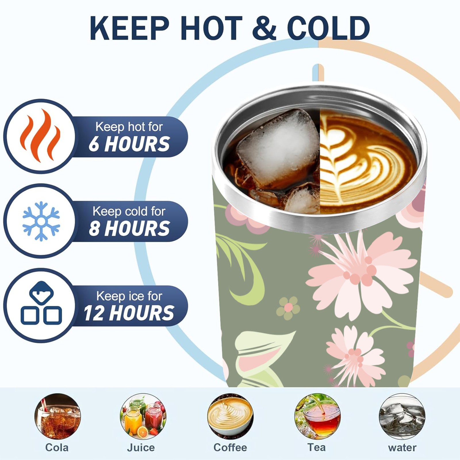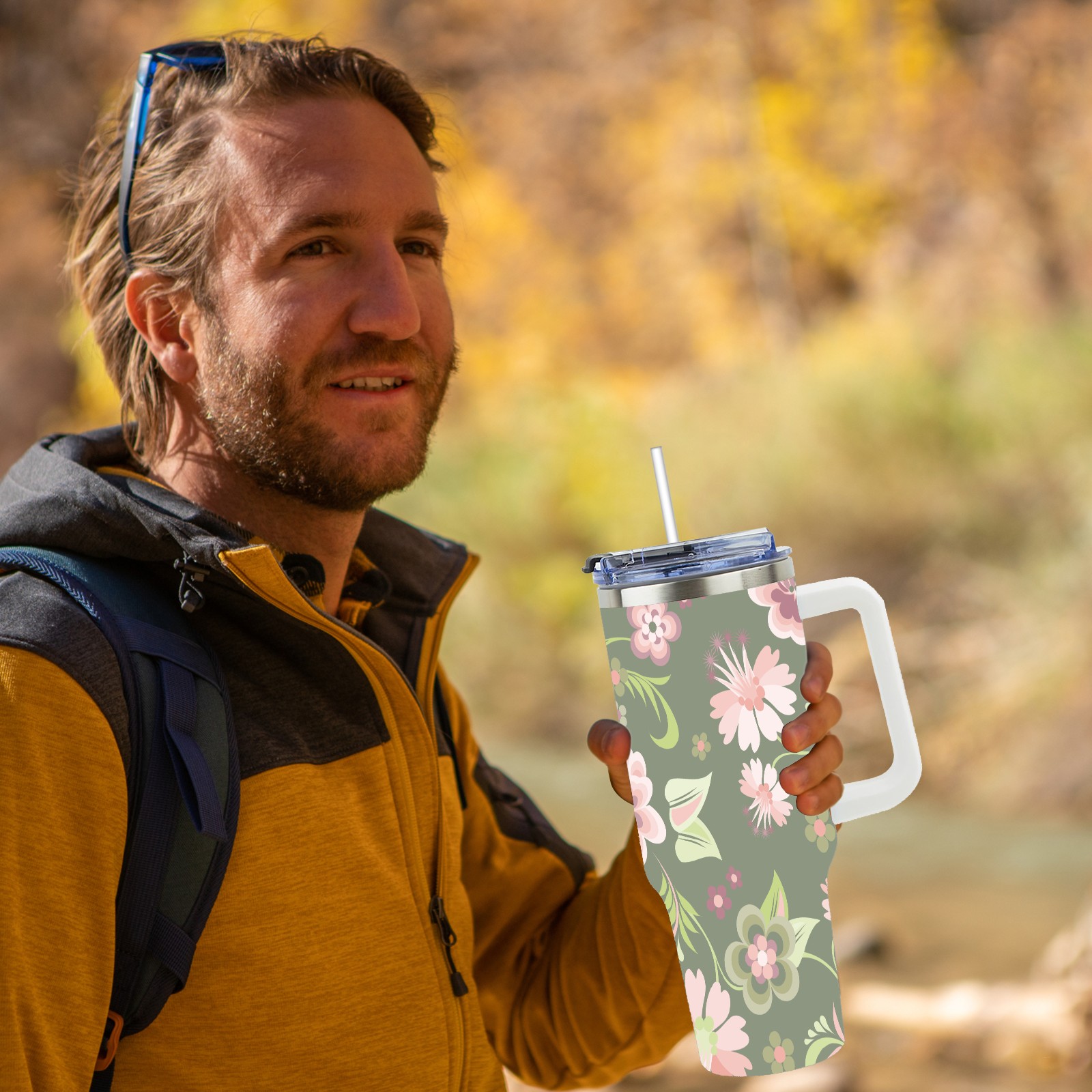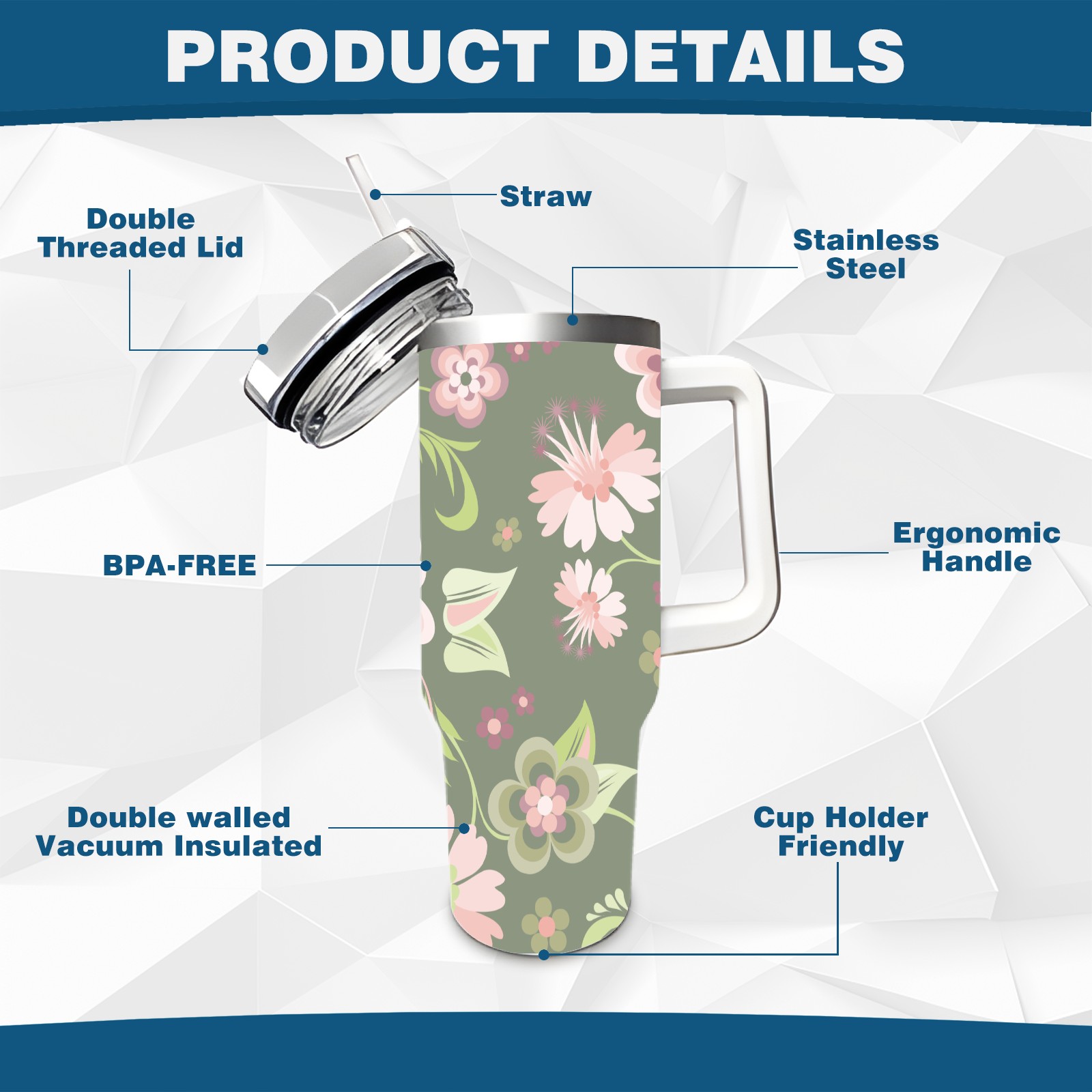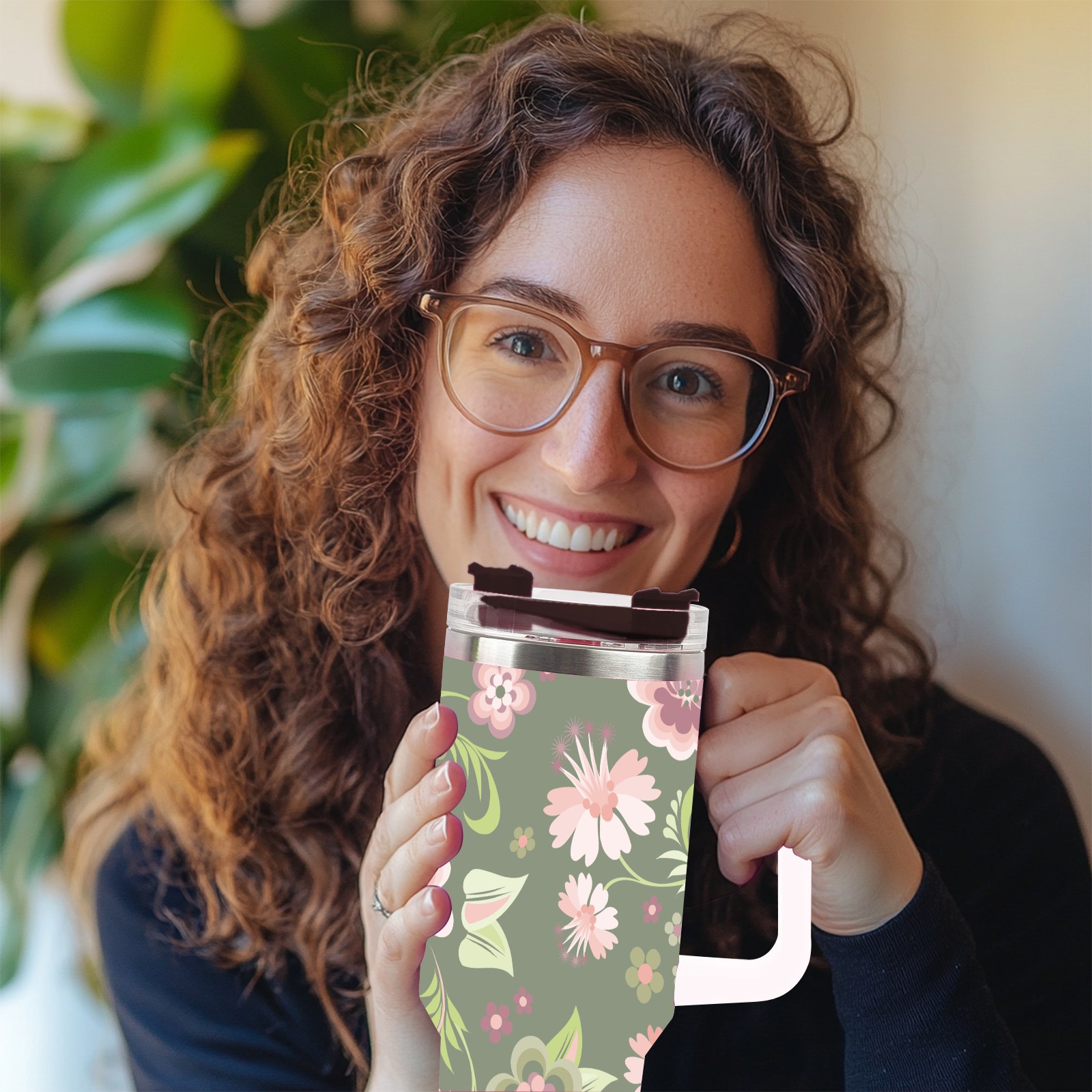 40oz Flower Pattern thermos with lid and straw, leak-proof stainless steel, with handle, spill-proof bottle, convenient for travel(pink)