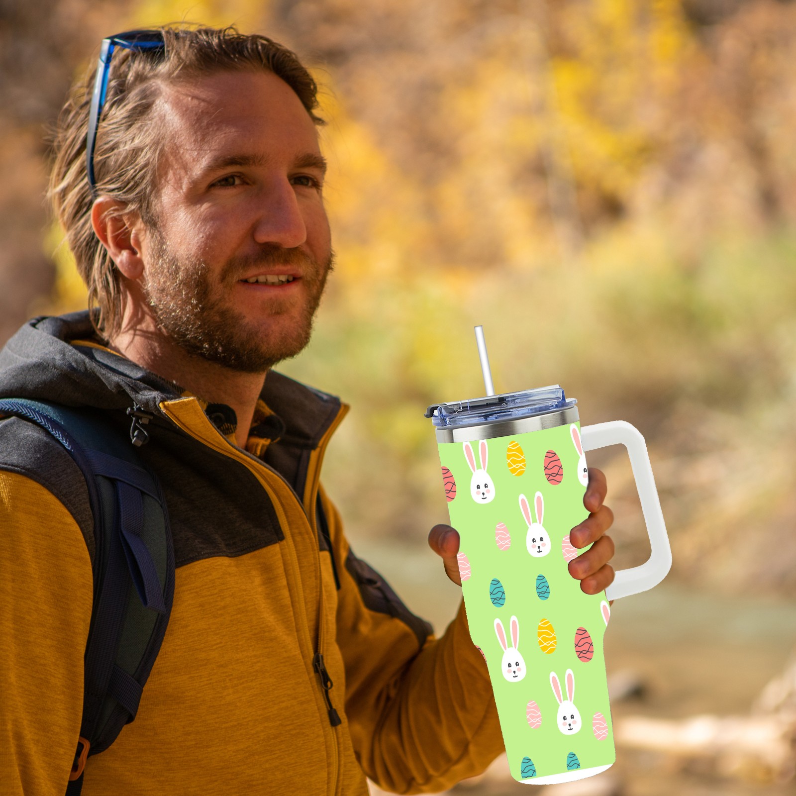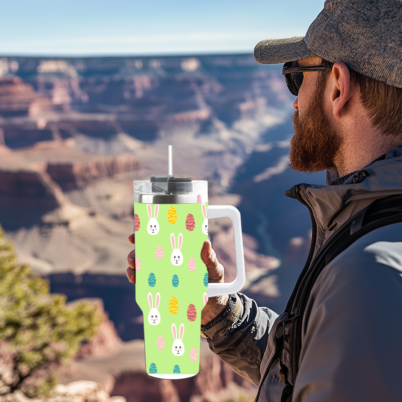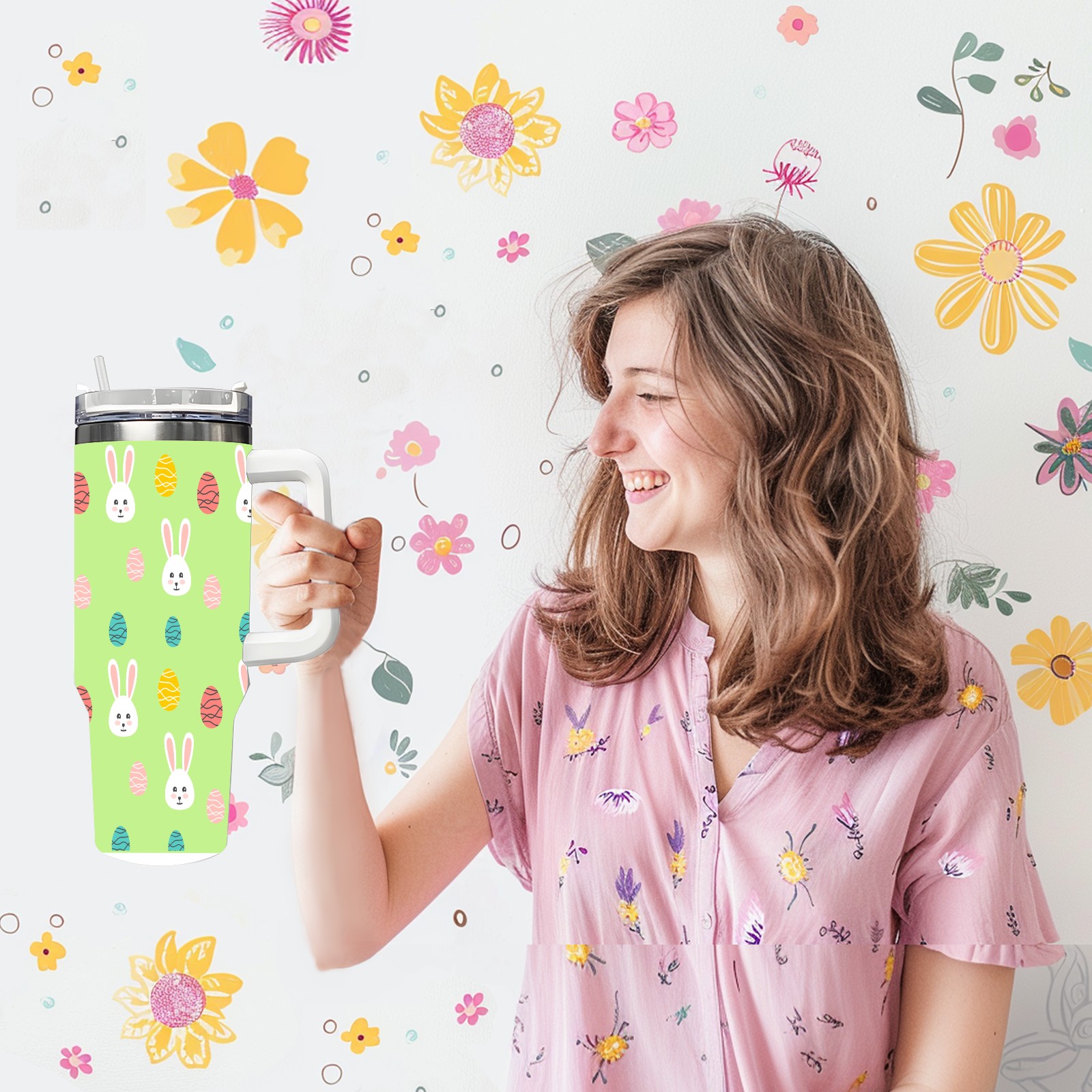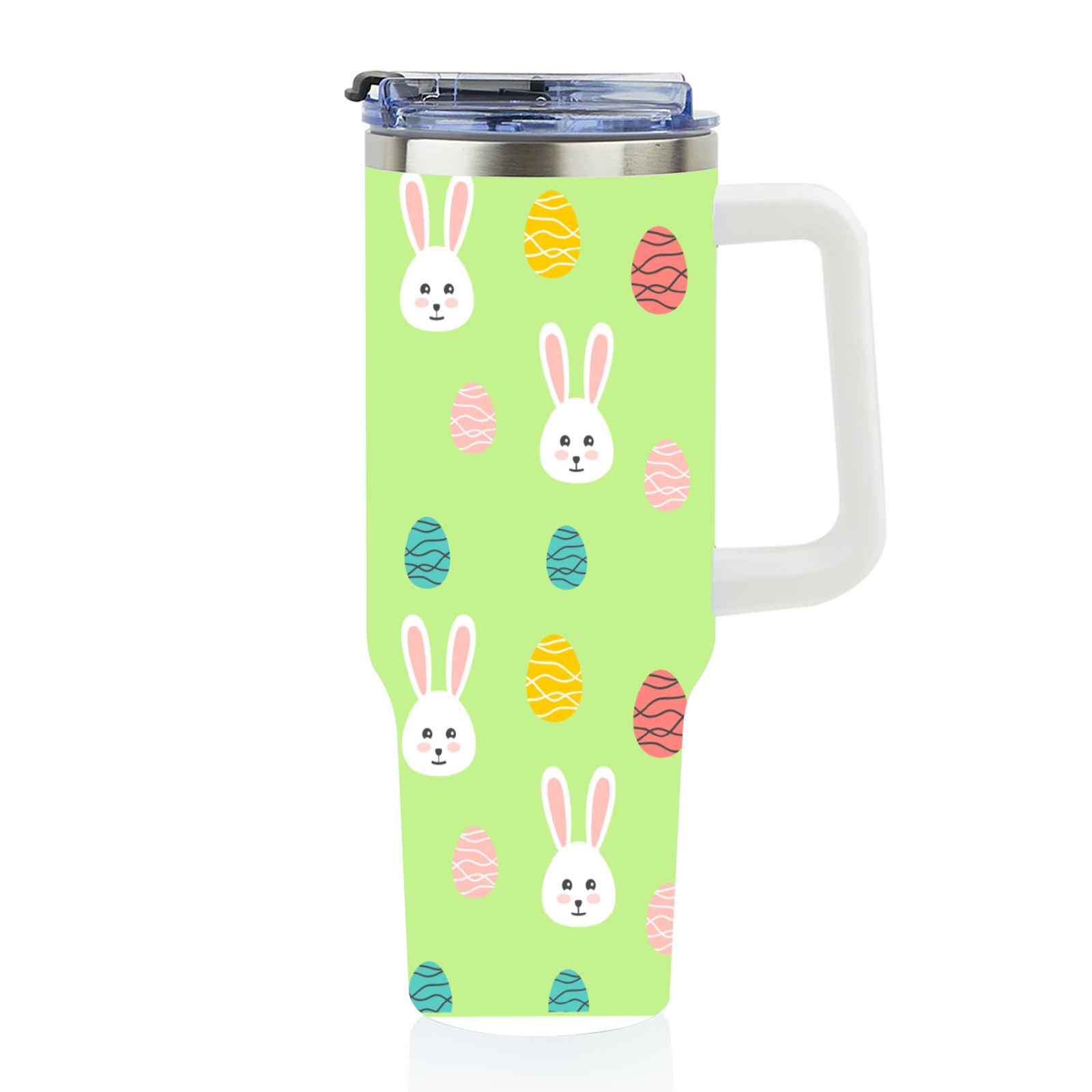 40oz Easter Pattern thermos with lid and straw, leak-proof stainless steel, with handle, spill-proof bottle, convenient for travel(pink)