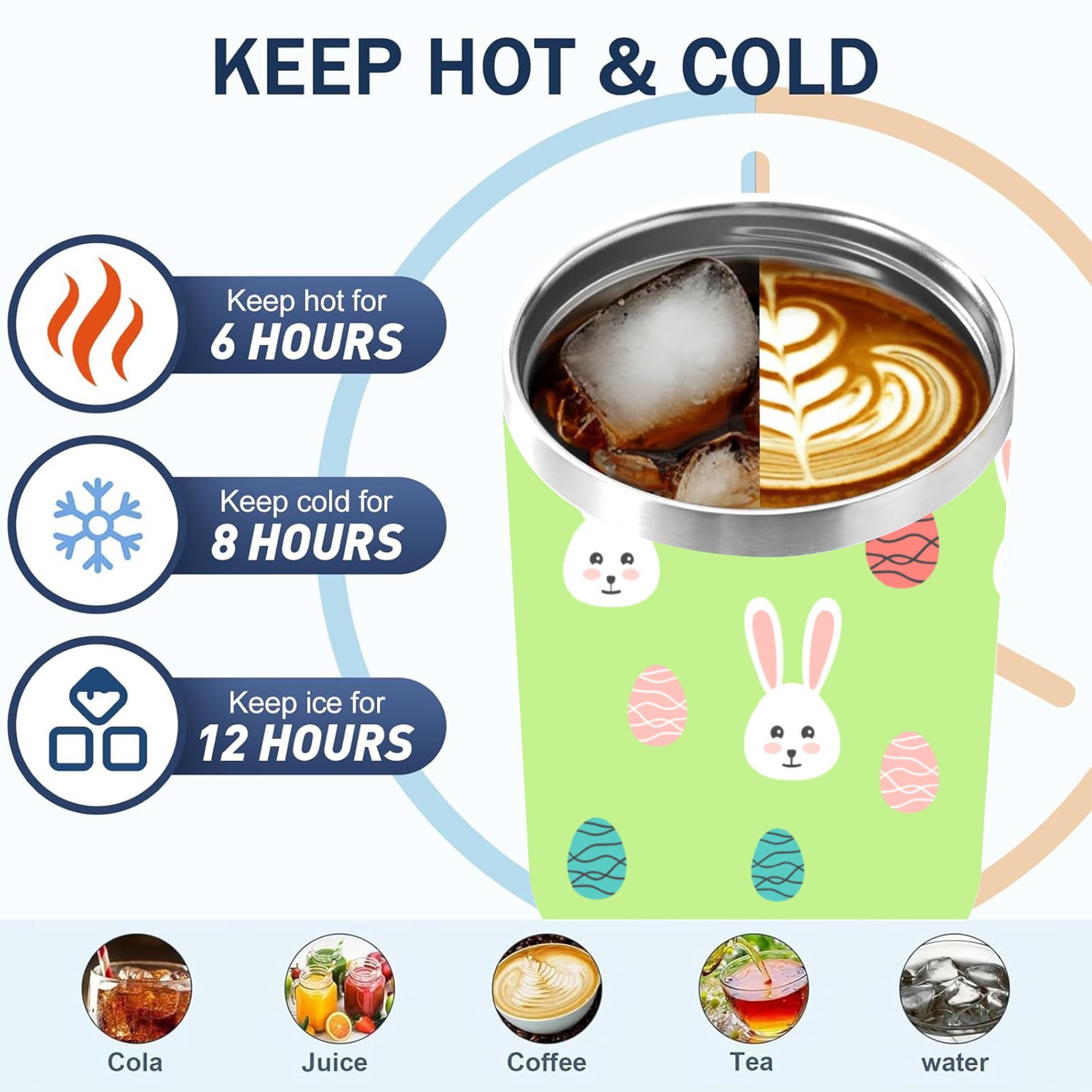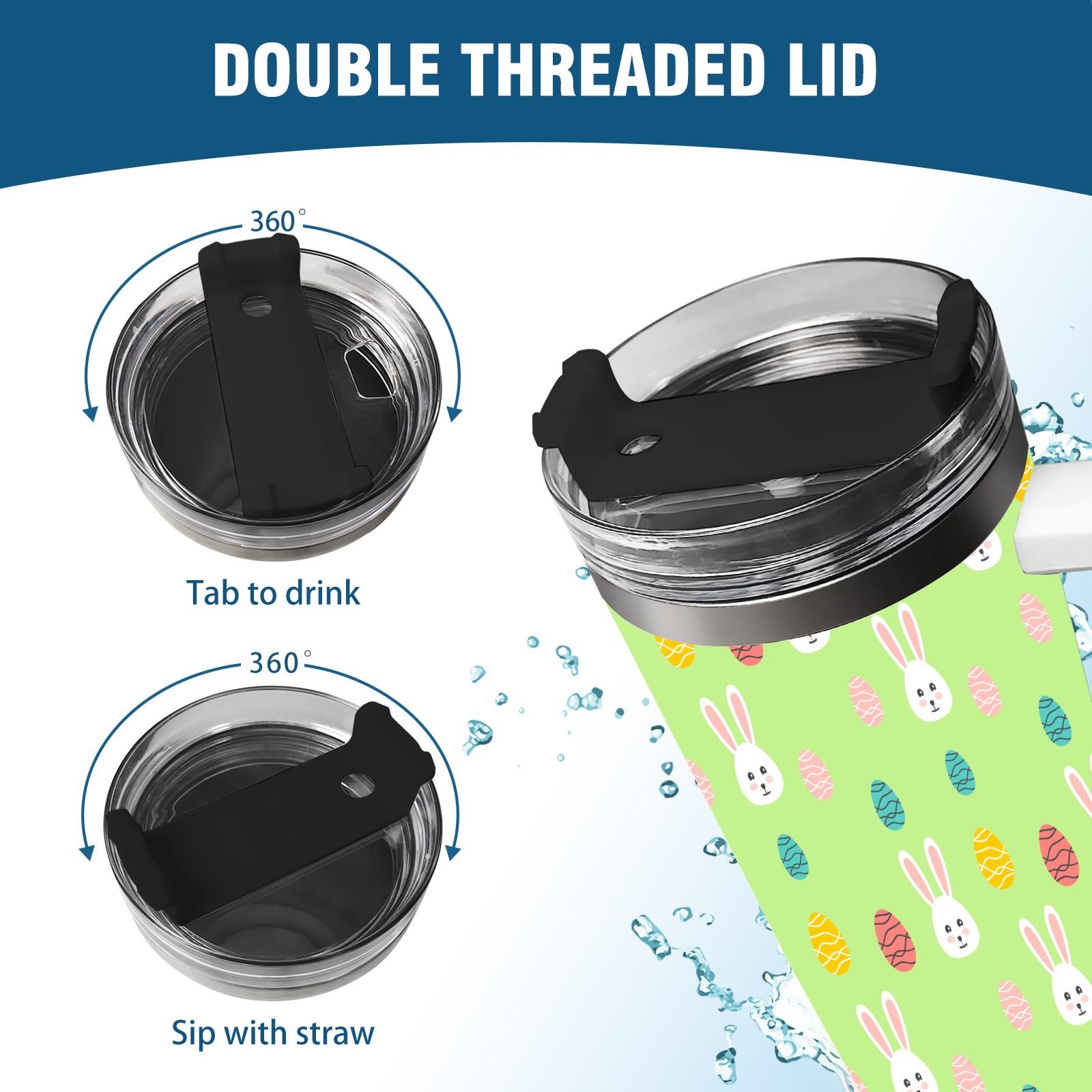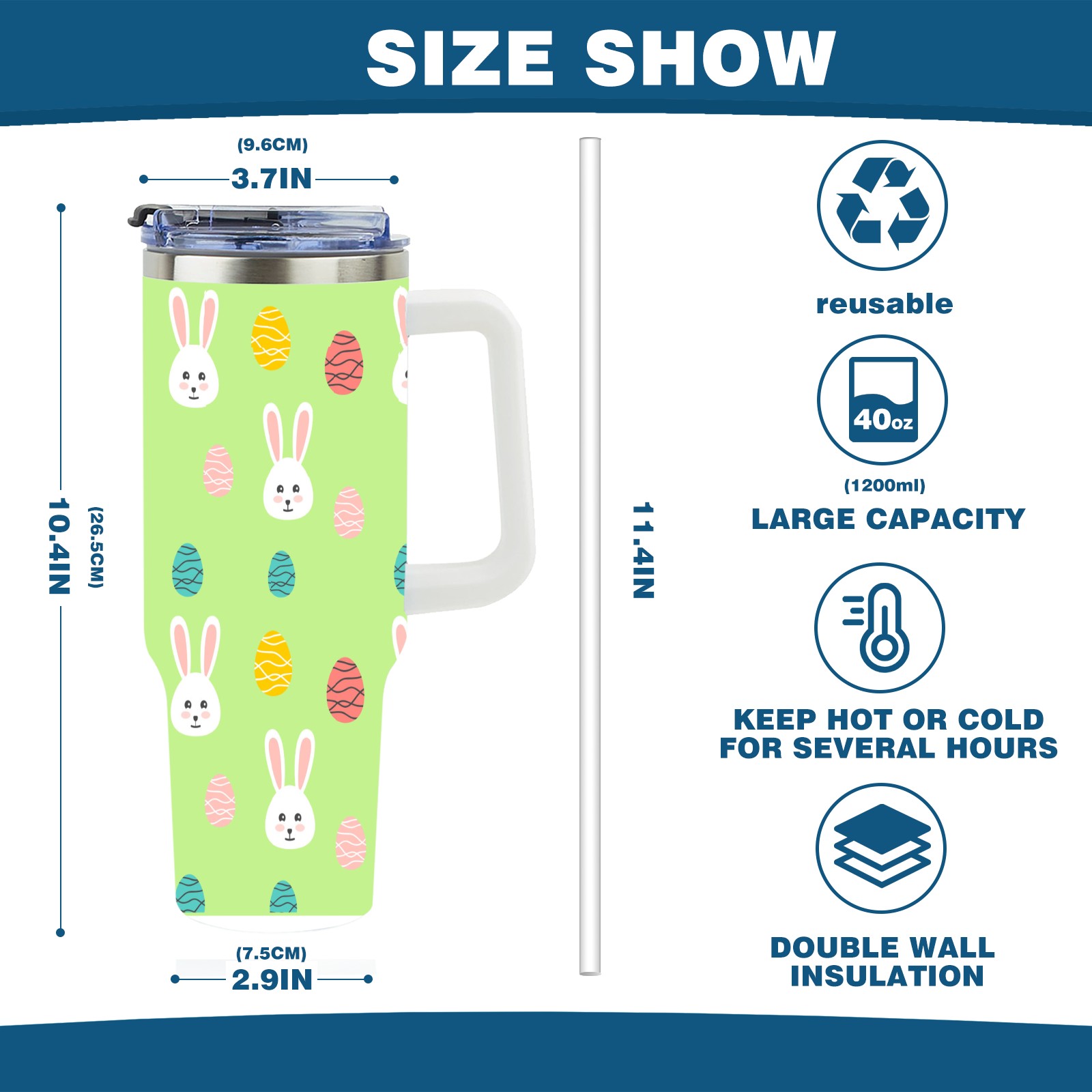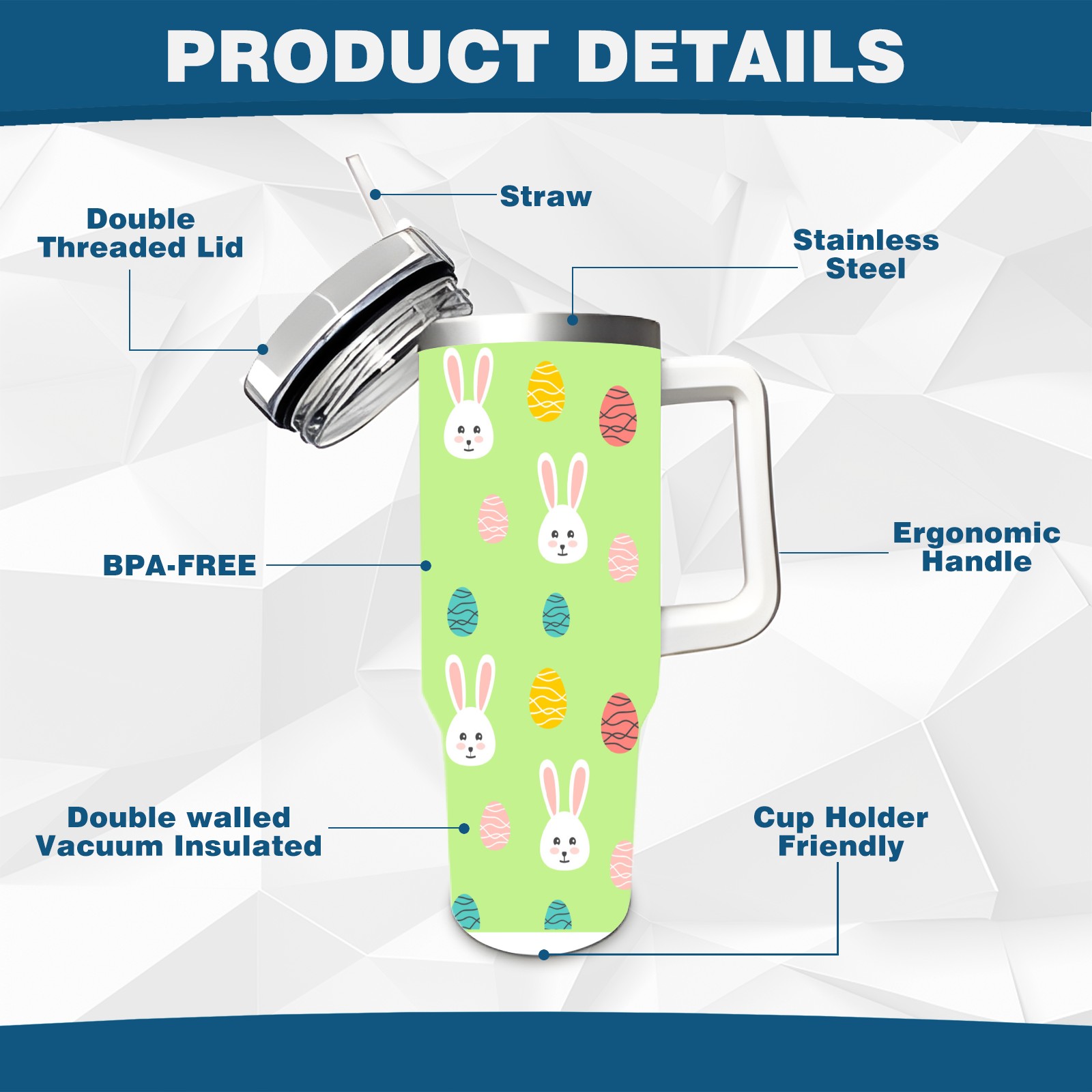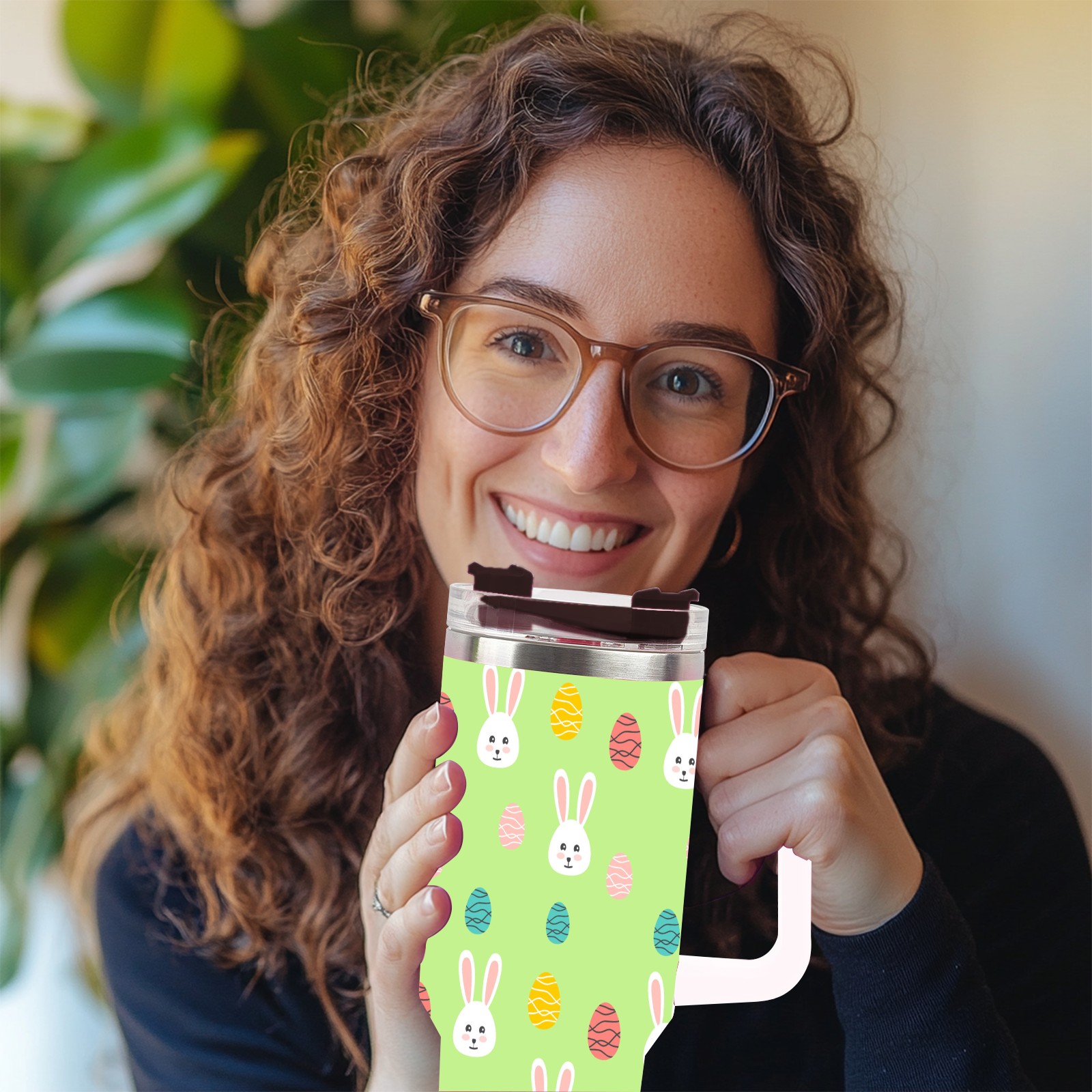 40oz Easter Pattern thermos with lid and straw, leak-proof stainless steel, with handle, spill-proof bottle, convenient for travel(pink)