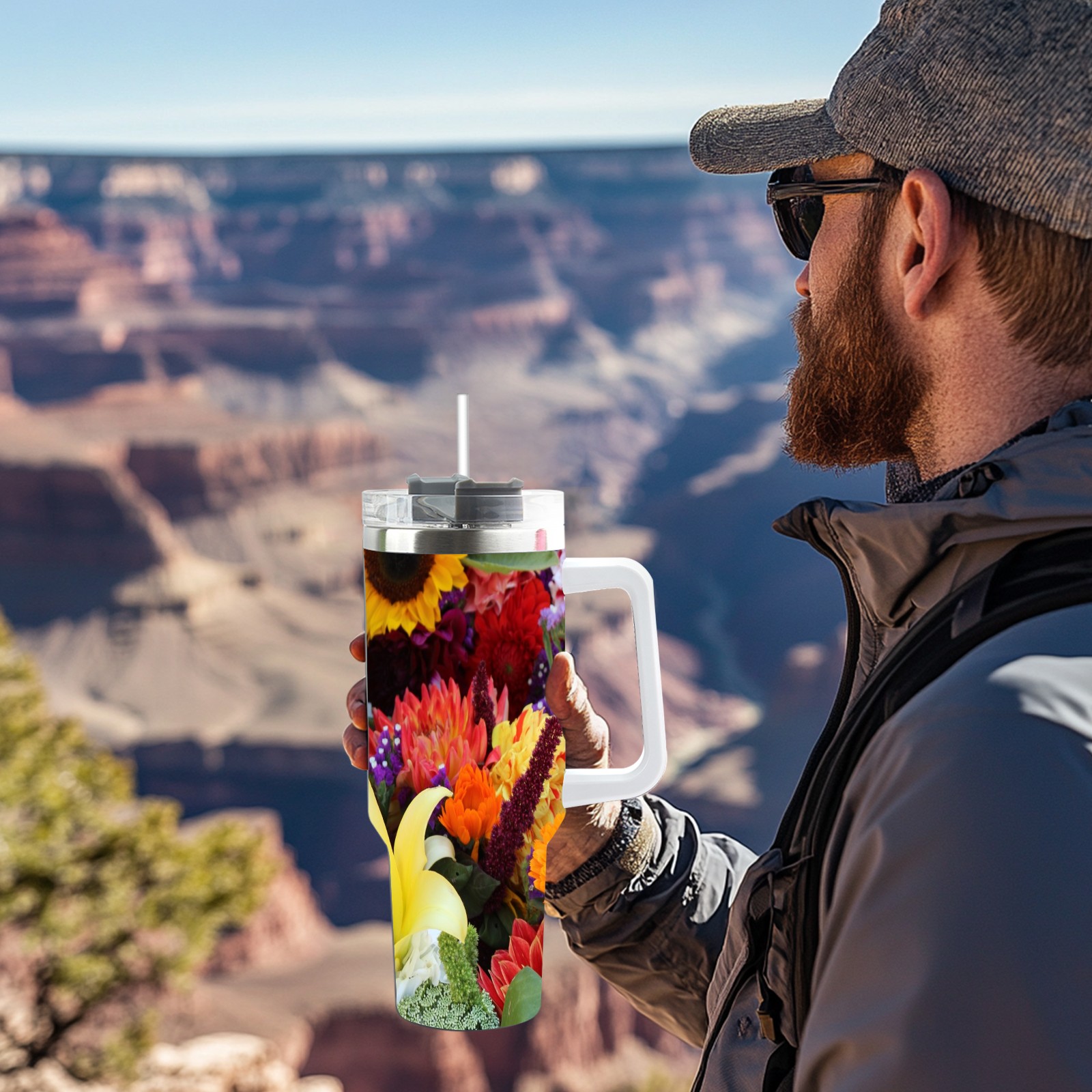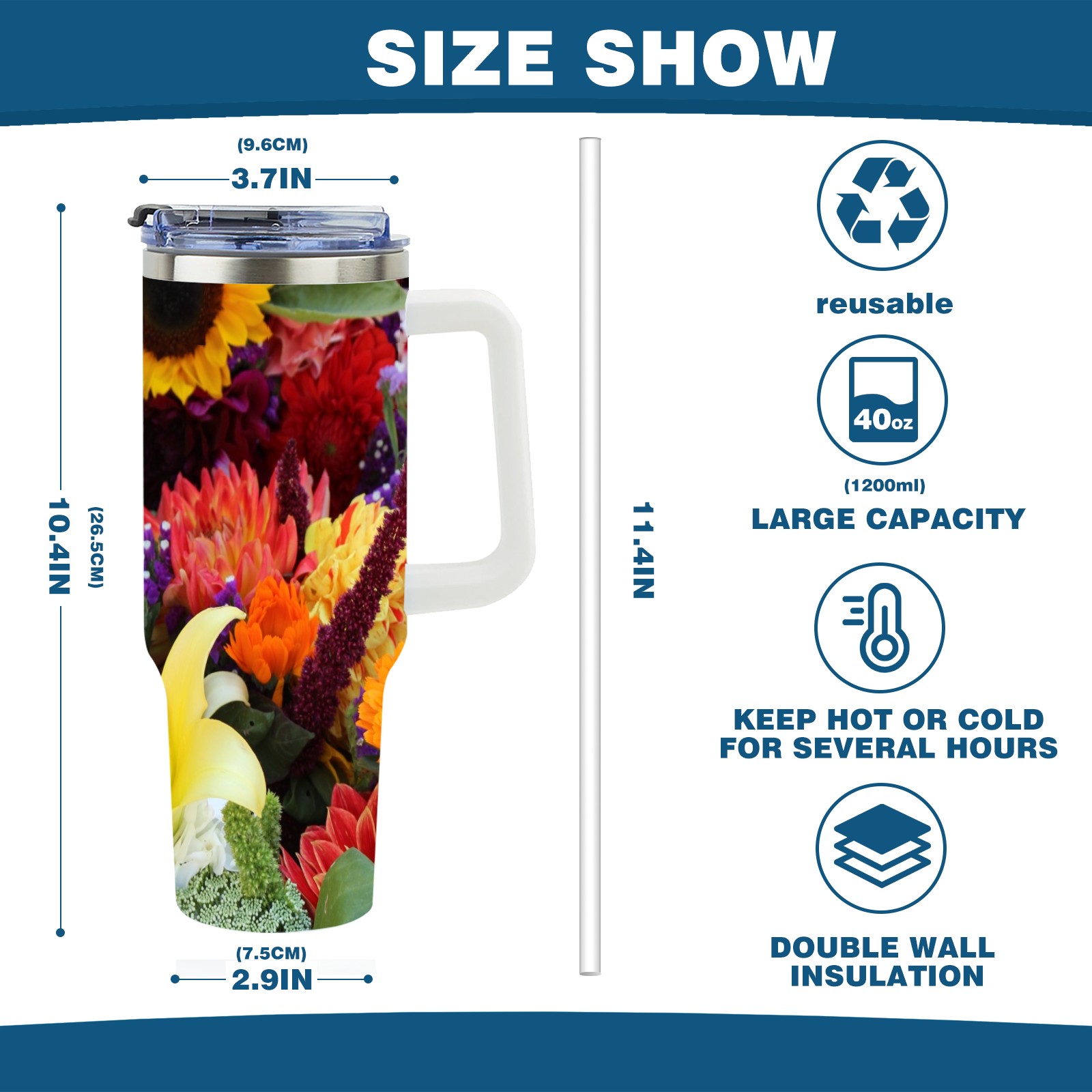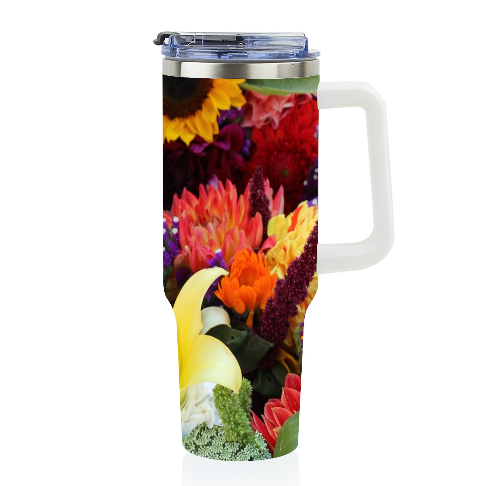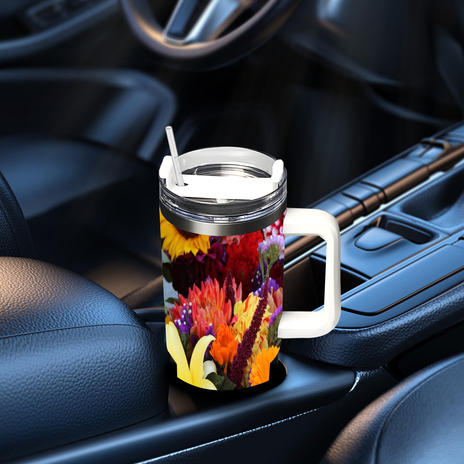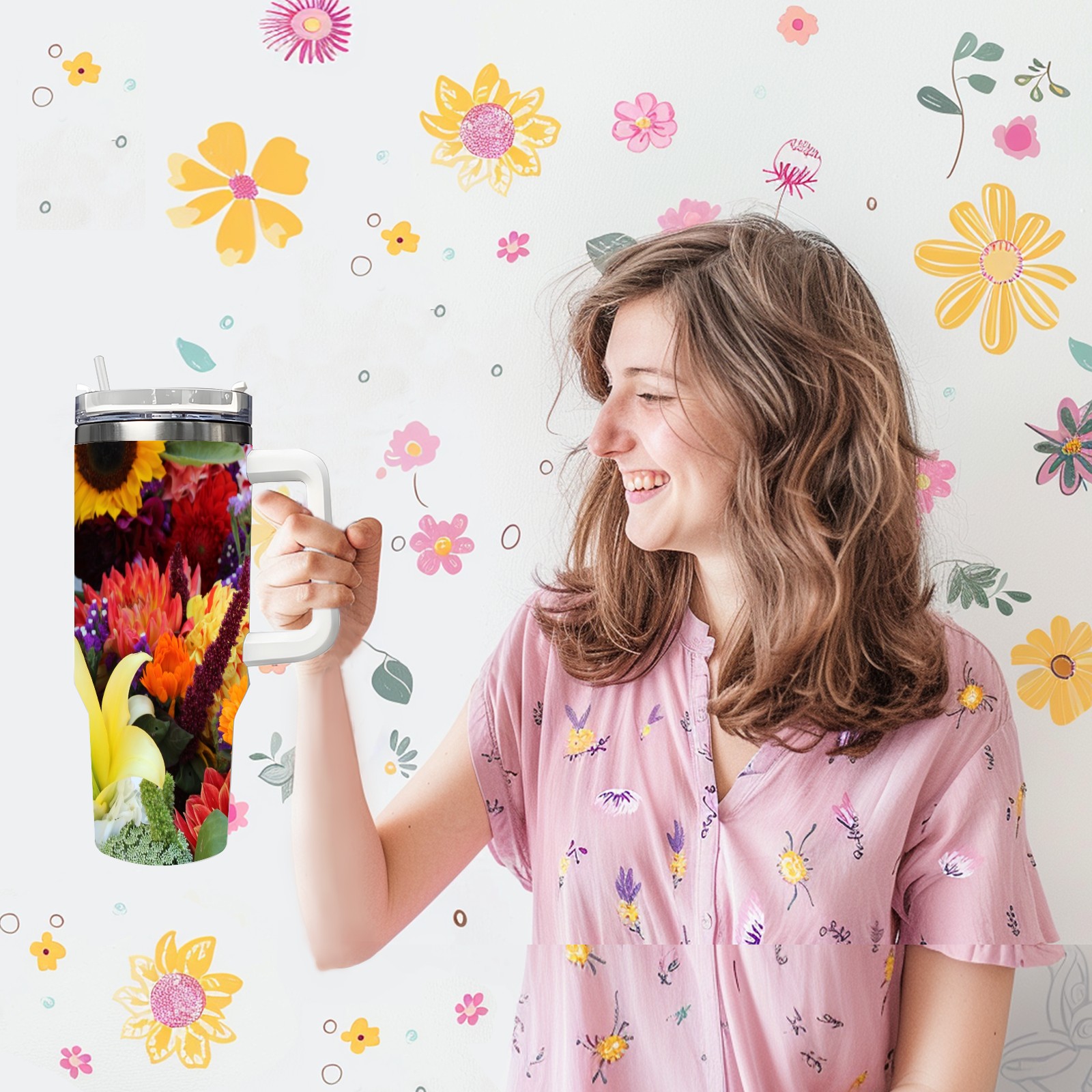 40oz Color Flowers thermos with lid and straw, leak-proof stainless steel, with handle, spill-proof bottle, convenient for travel(pink)