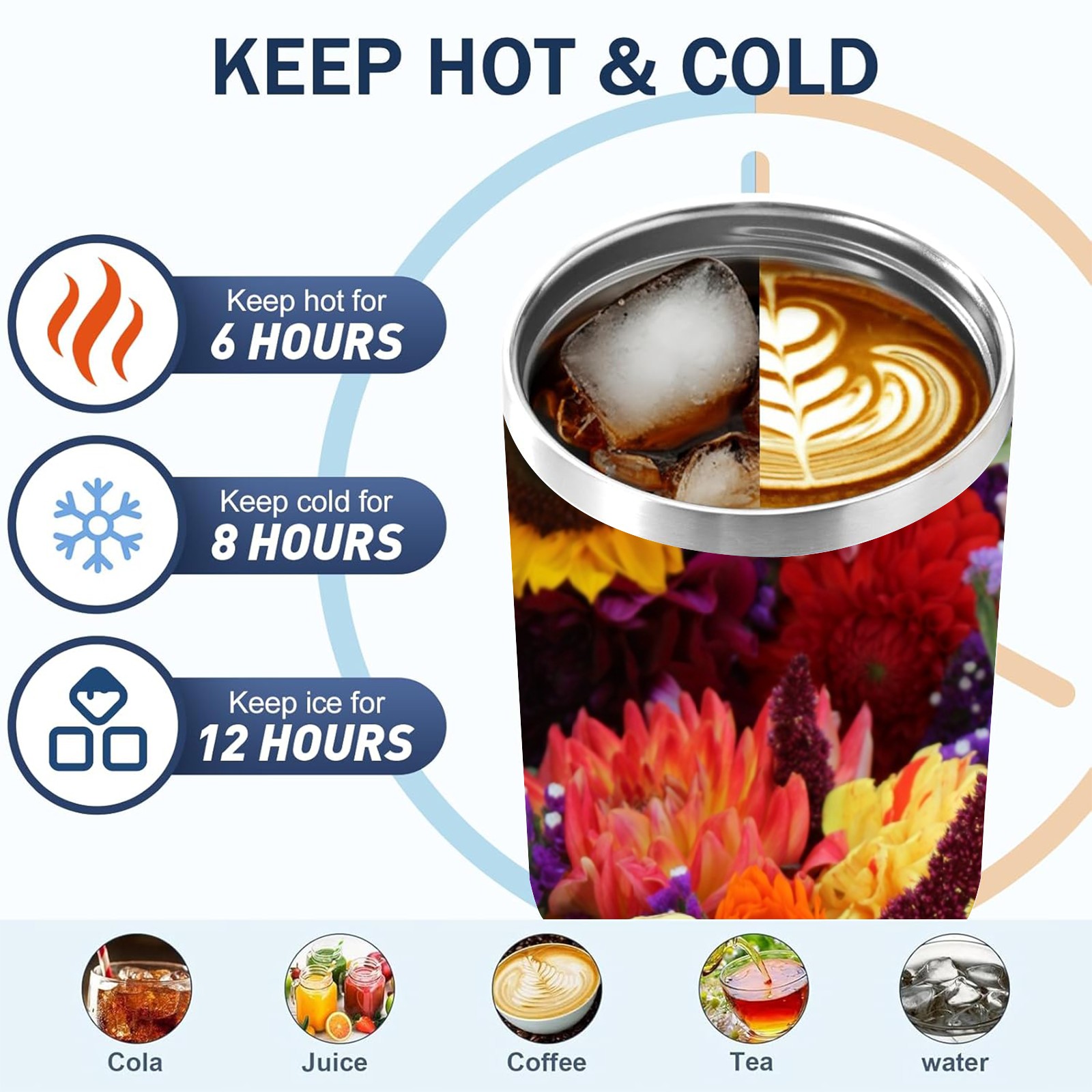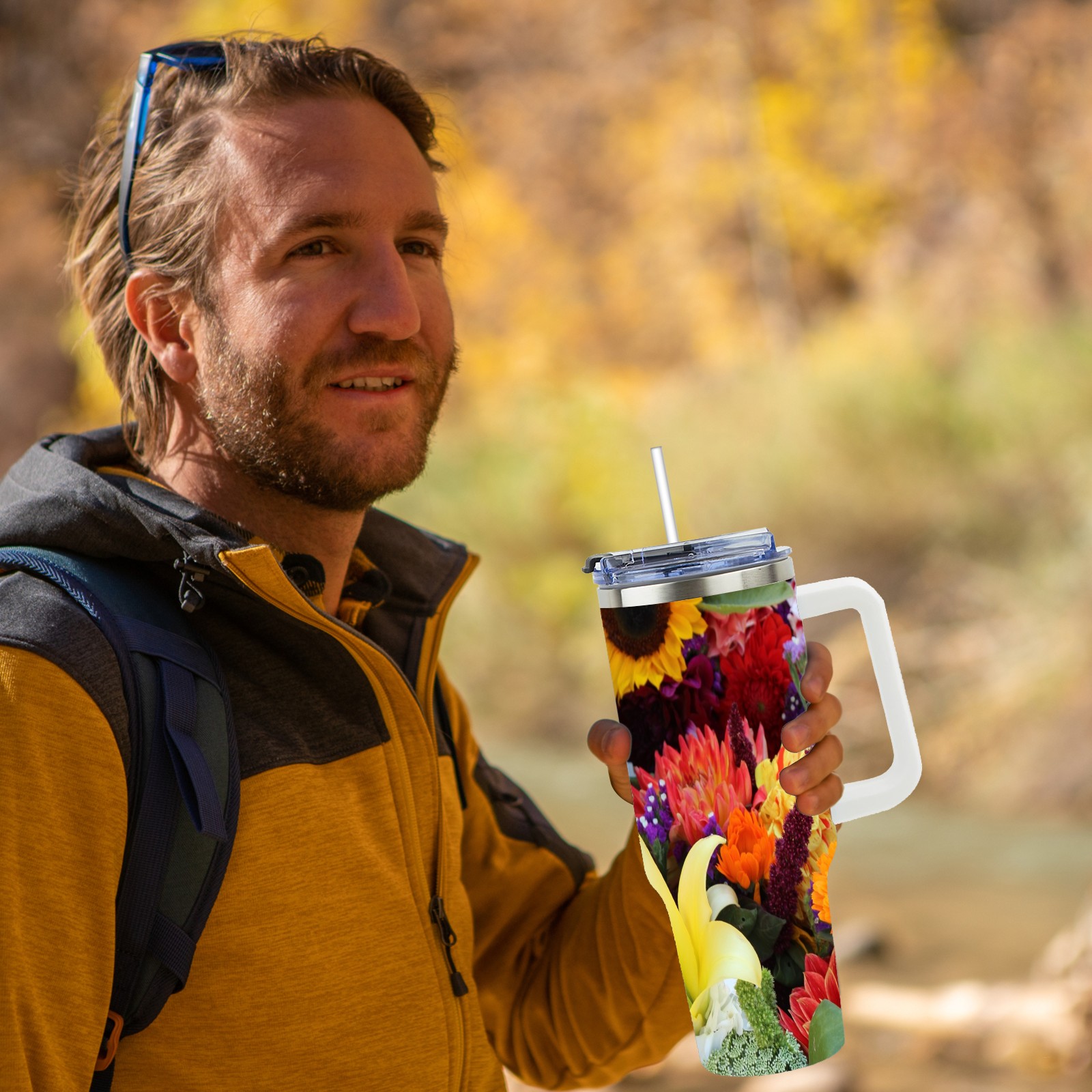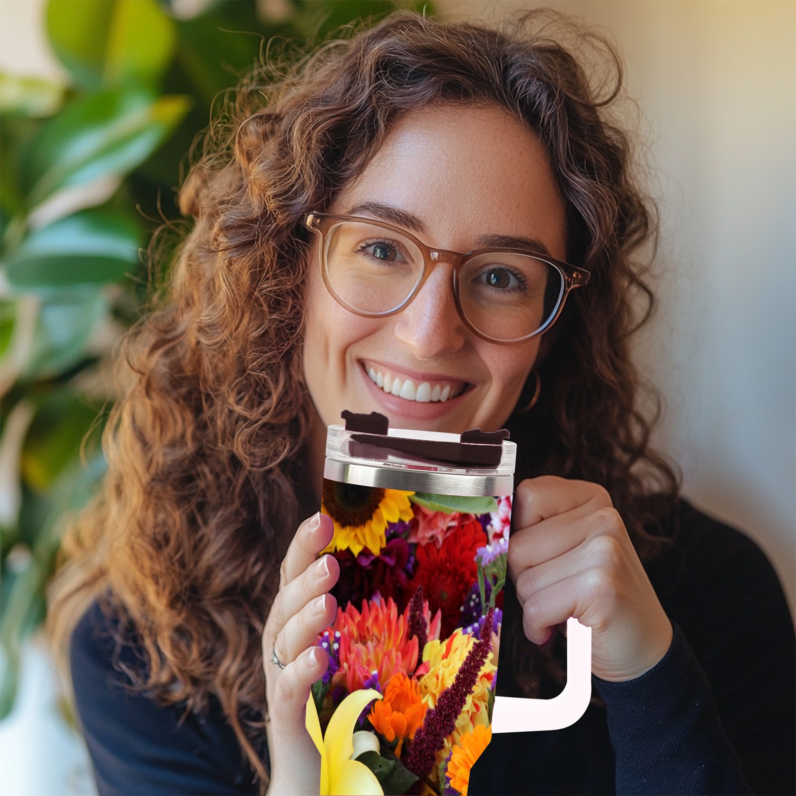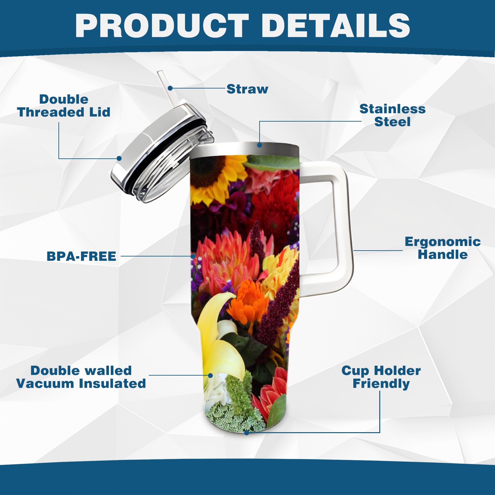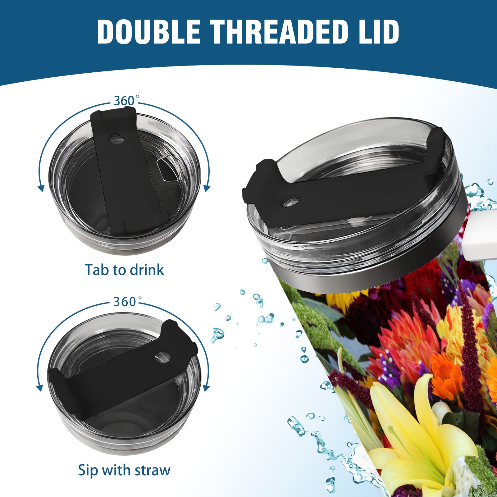 40oz Color Flowers thermos with lid and straw, leak-proof stainless steel, with handle, spill-proof bottle, convenient for travel(pink)