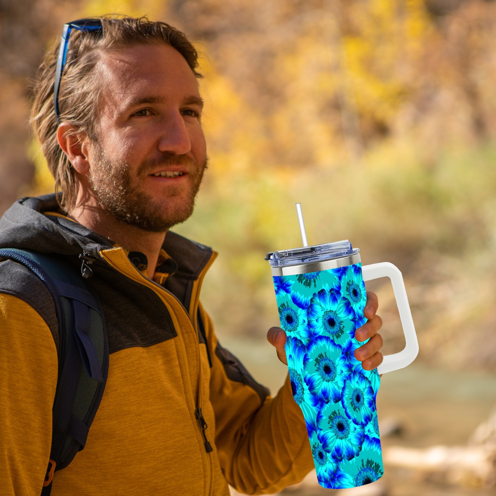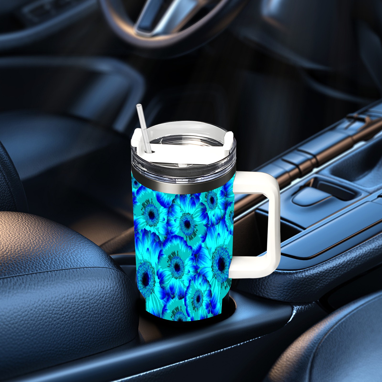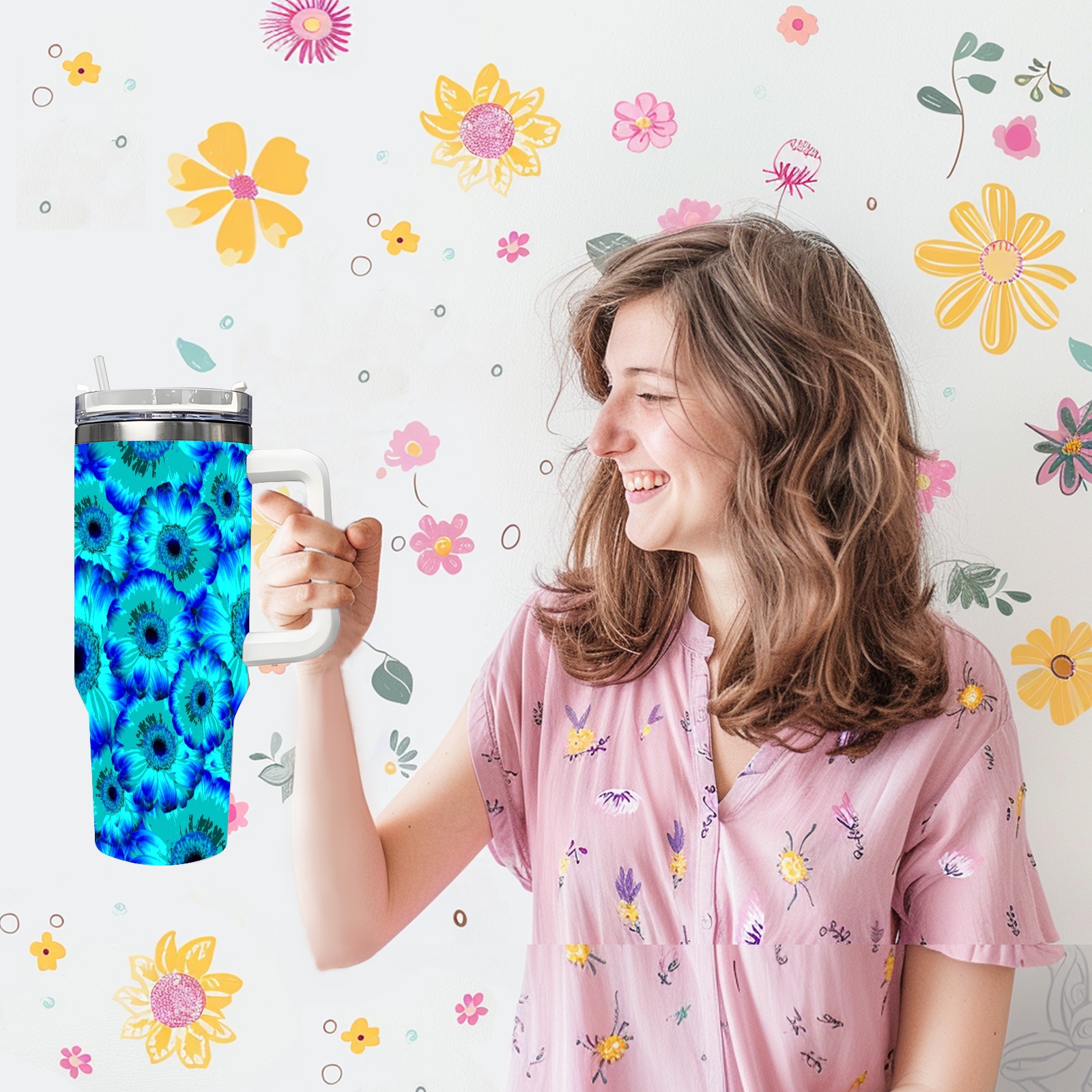 40oz Abstract Flowers thermos with lid and straw, leak-proof stainless steel, with handle, spill-proof bottle, convenient for travel(pink)