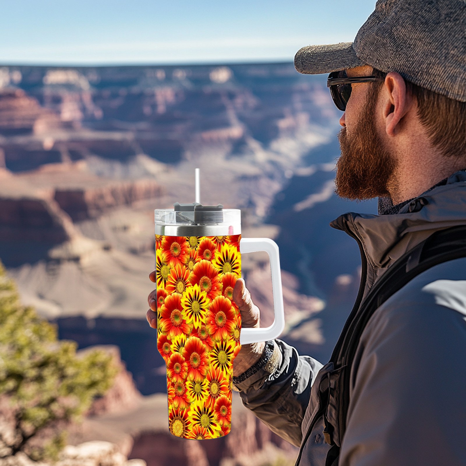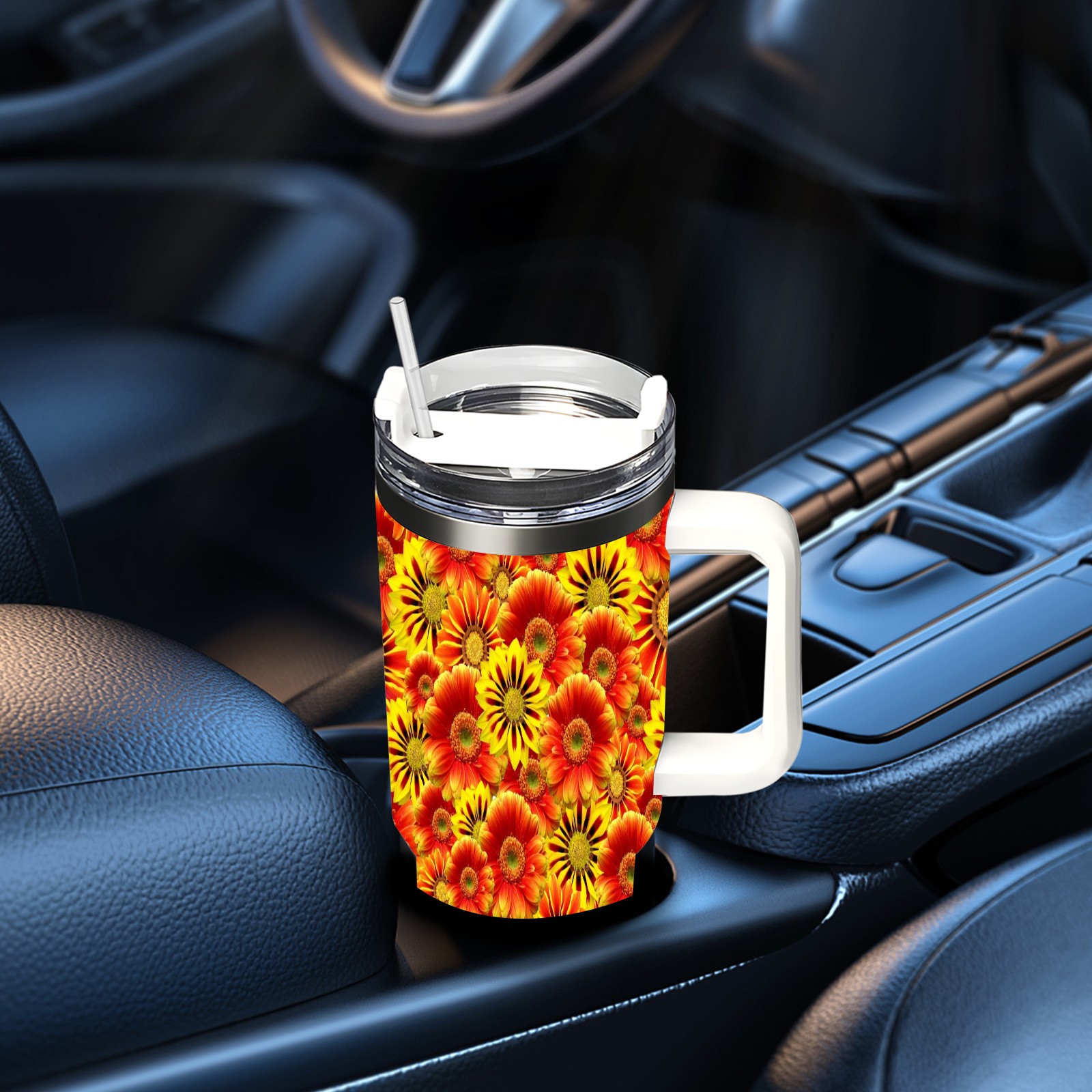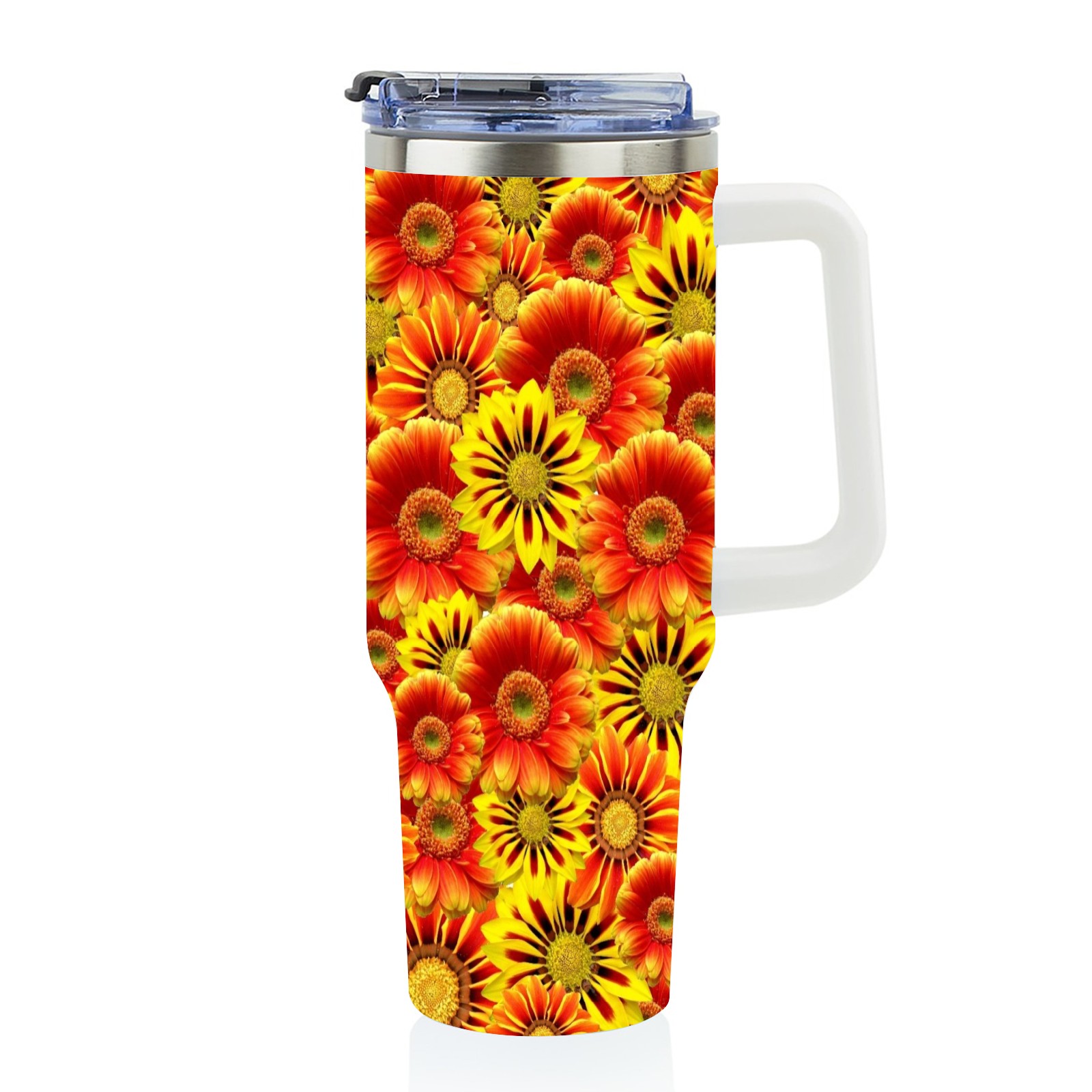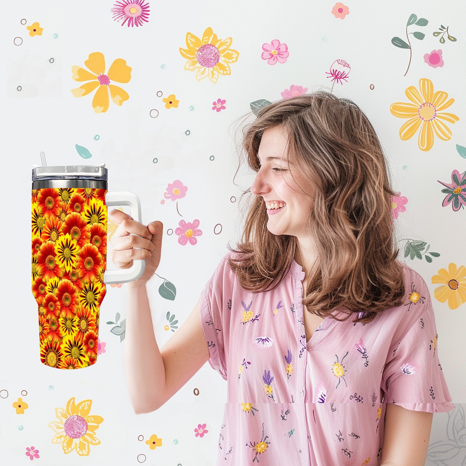 40oz Orange Flowers thermos with lid and straw, leak-proof stainless steel, with handle, spill-proof bottle, convenient for travel(pink)