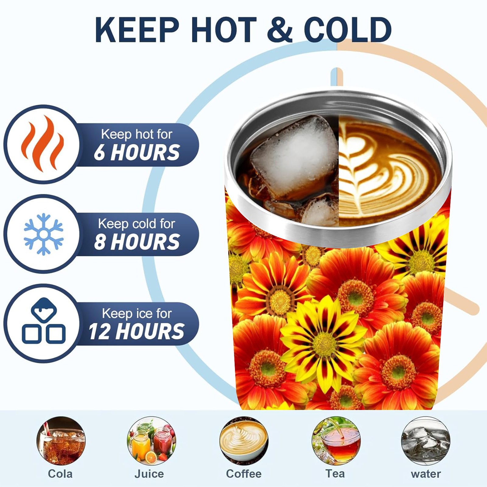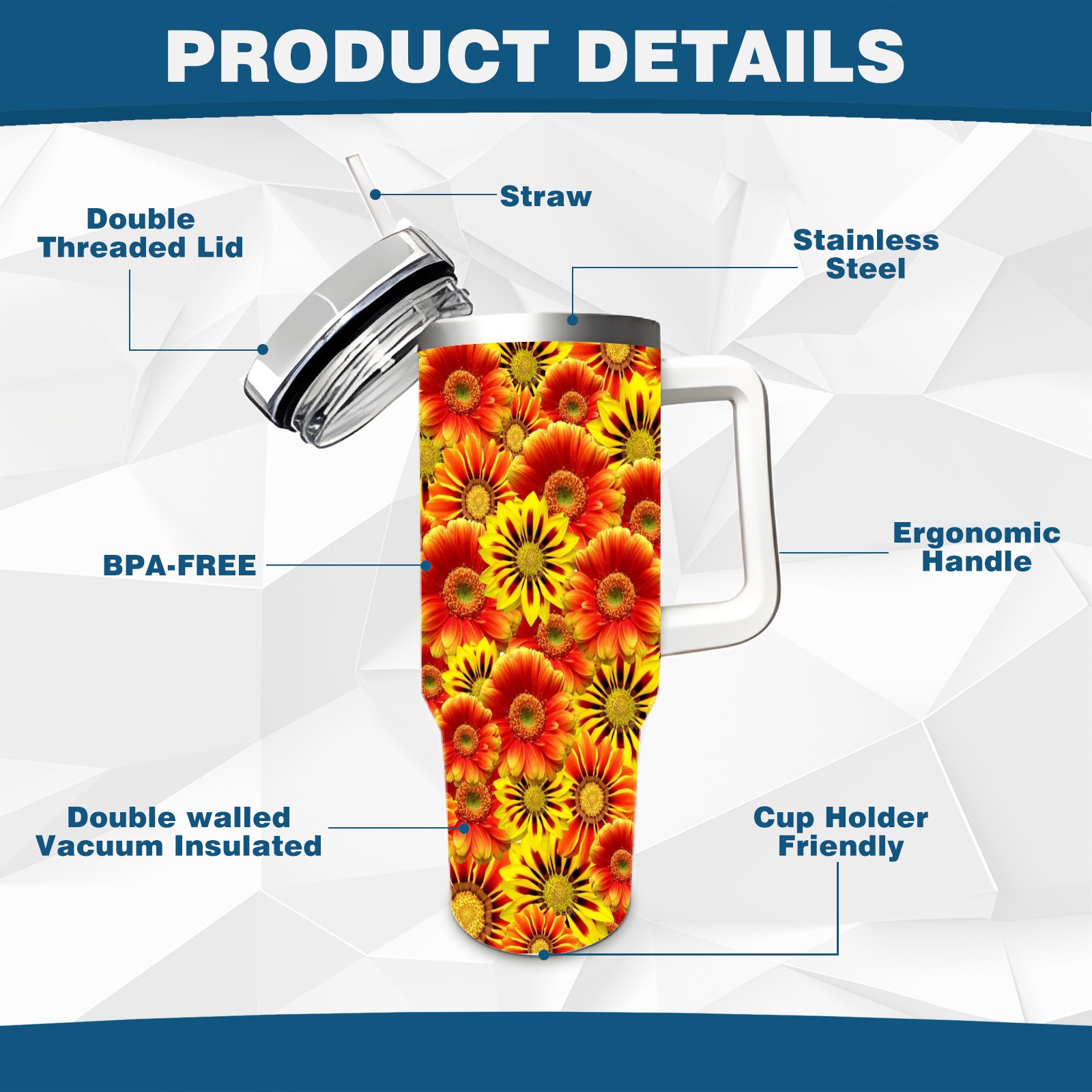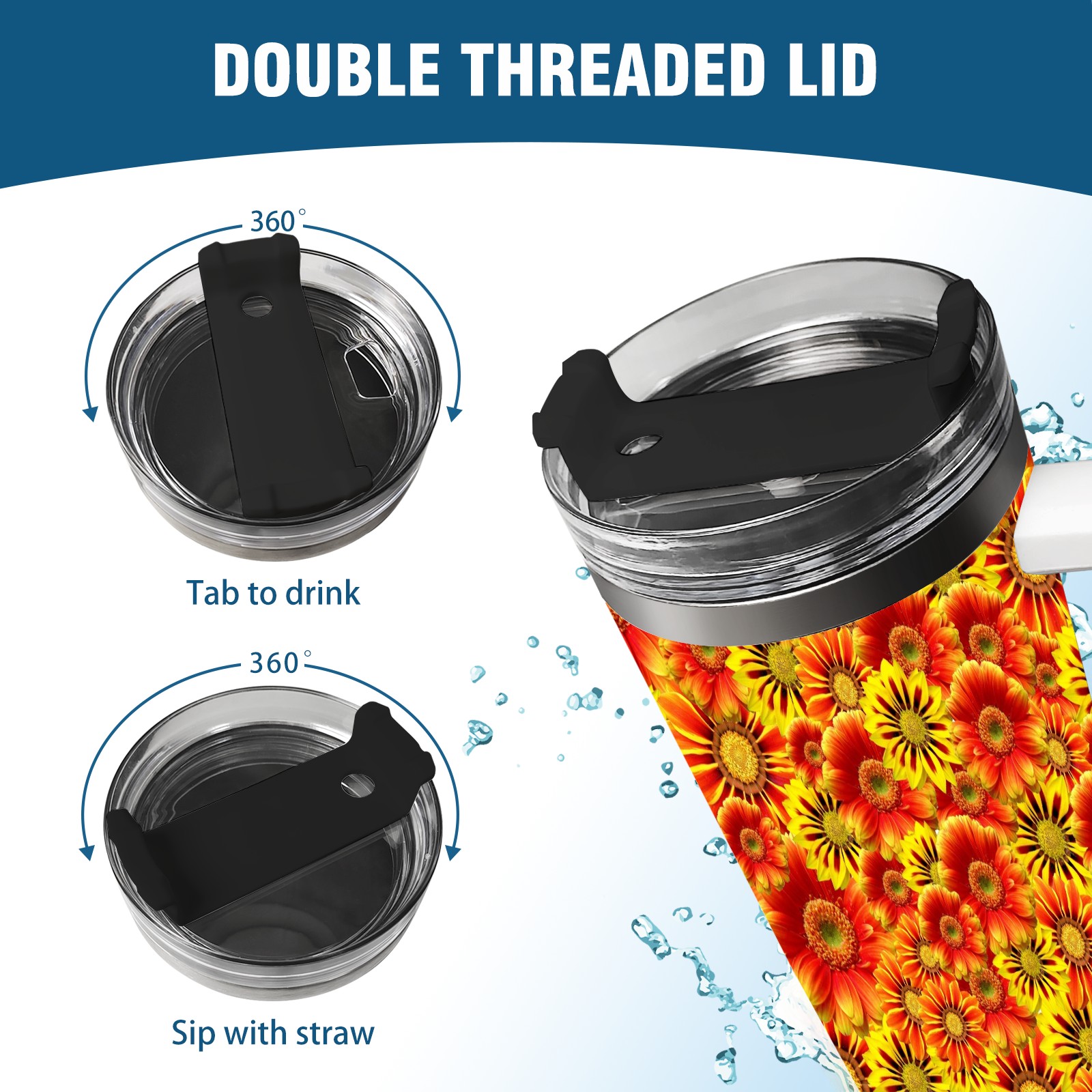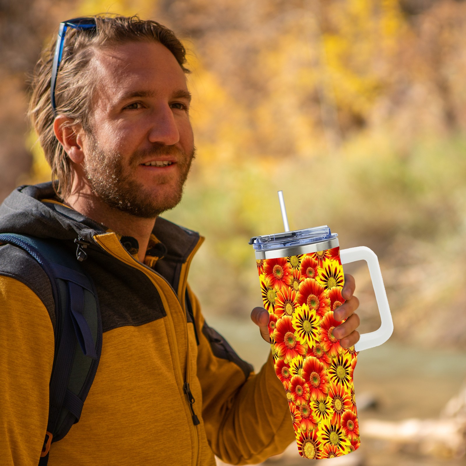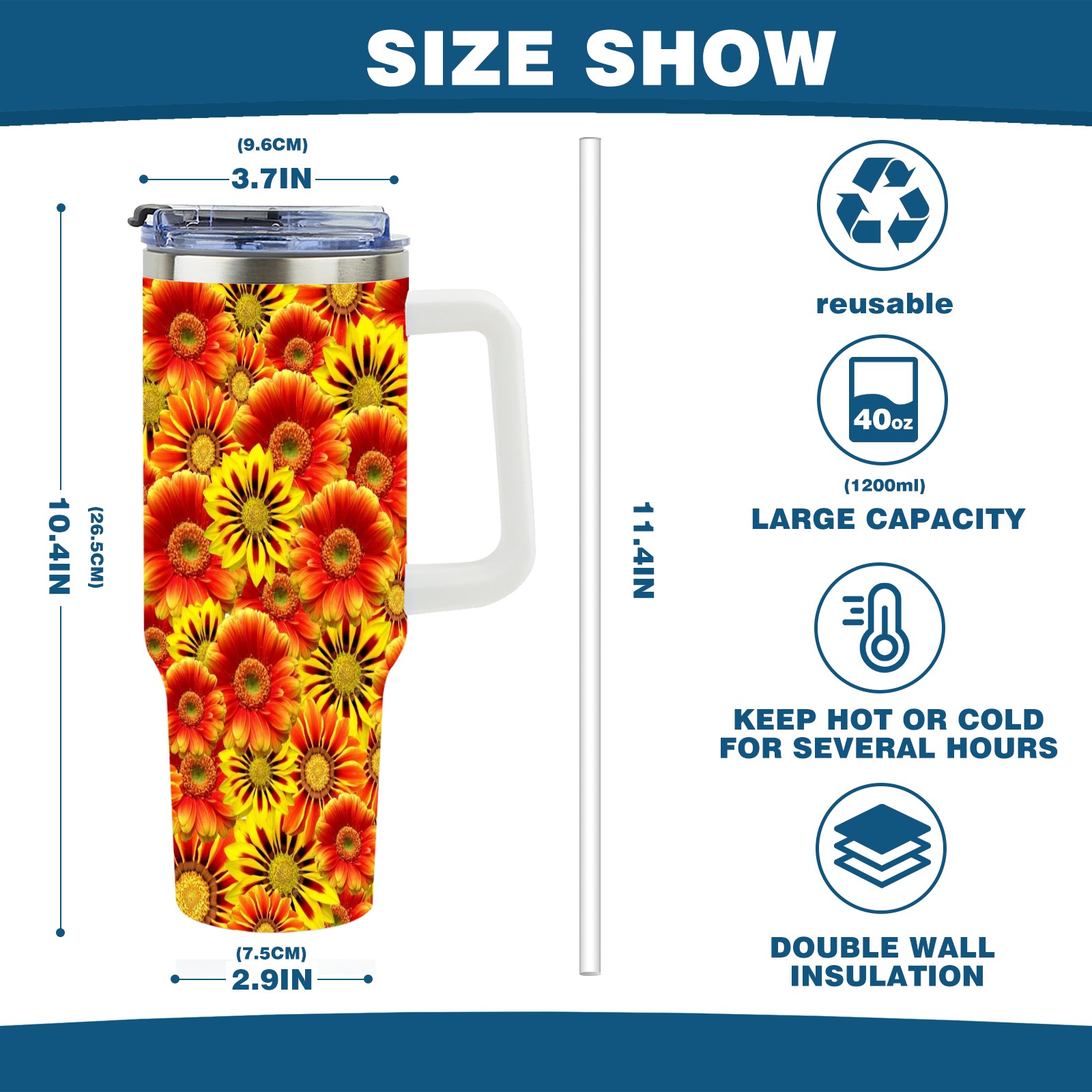 40oz Orange Flowers thermos with lid and straw, leak-proof stainless steel, with handle, spill-proof bottle, convenient for travel(pink)