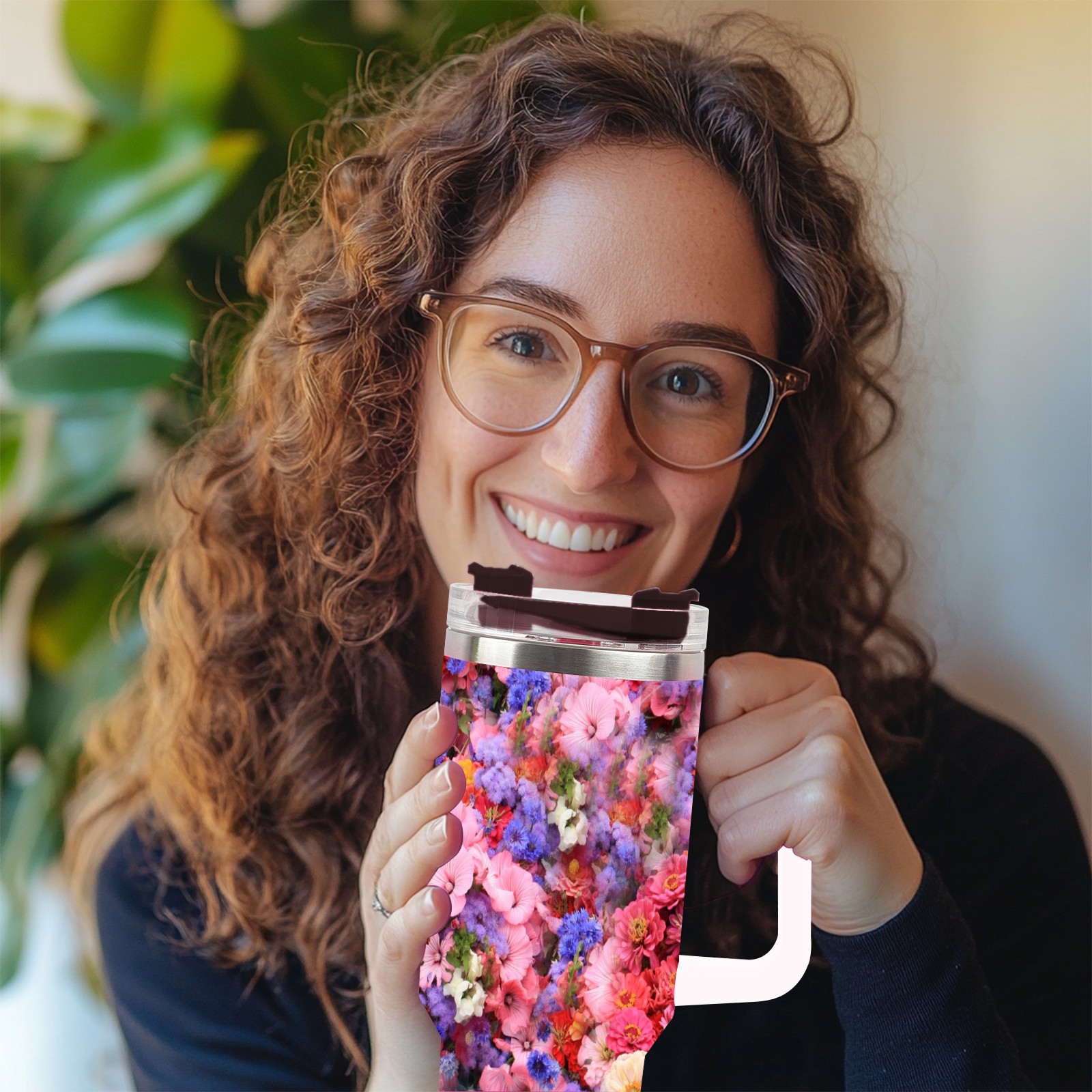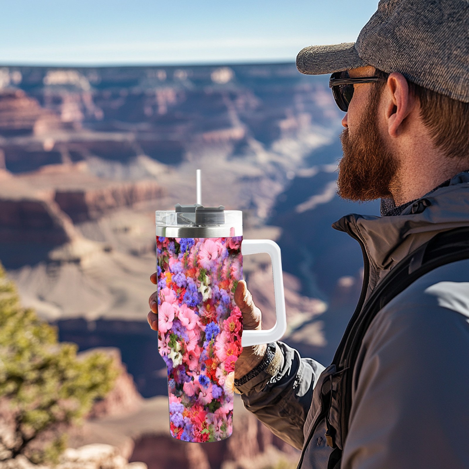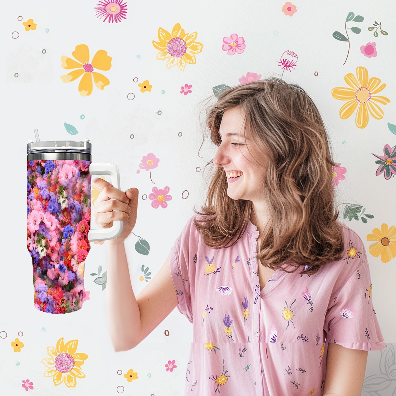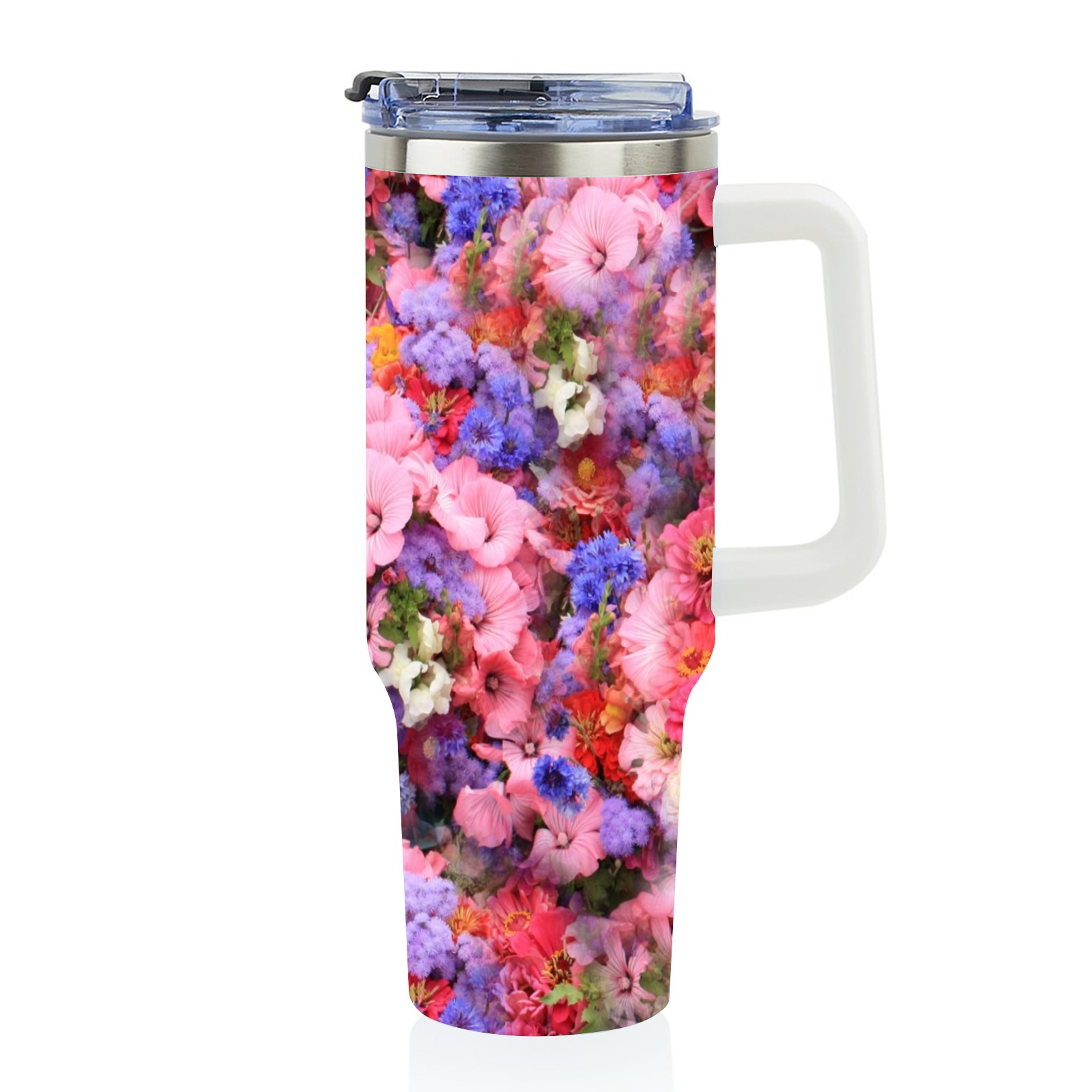 40oz Bloom Flowers thermos with lid and straw, leak-proof stainless steel, with handle, spill-proof bottle, convenient for travel(pink)