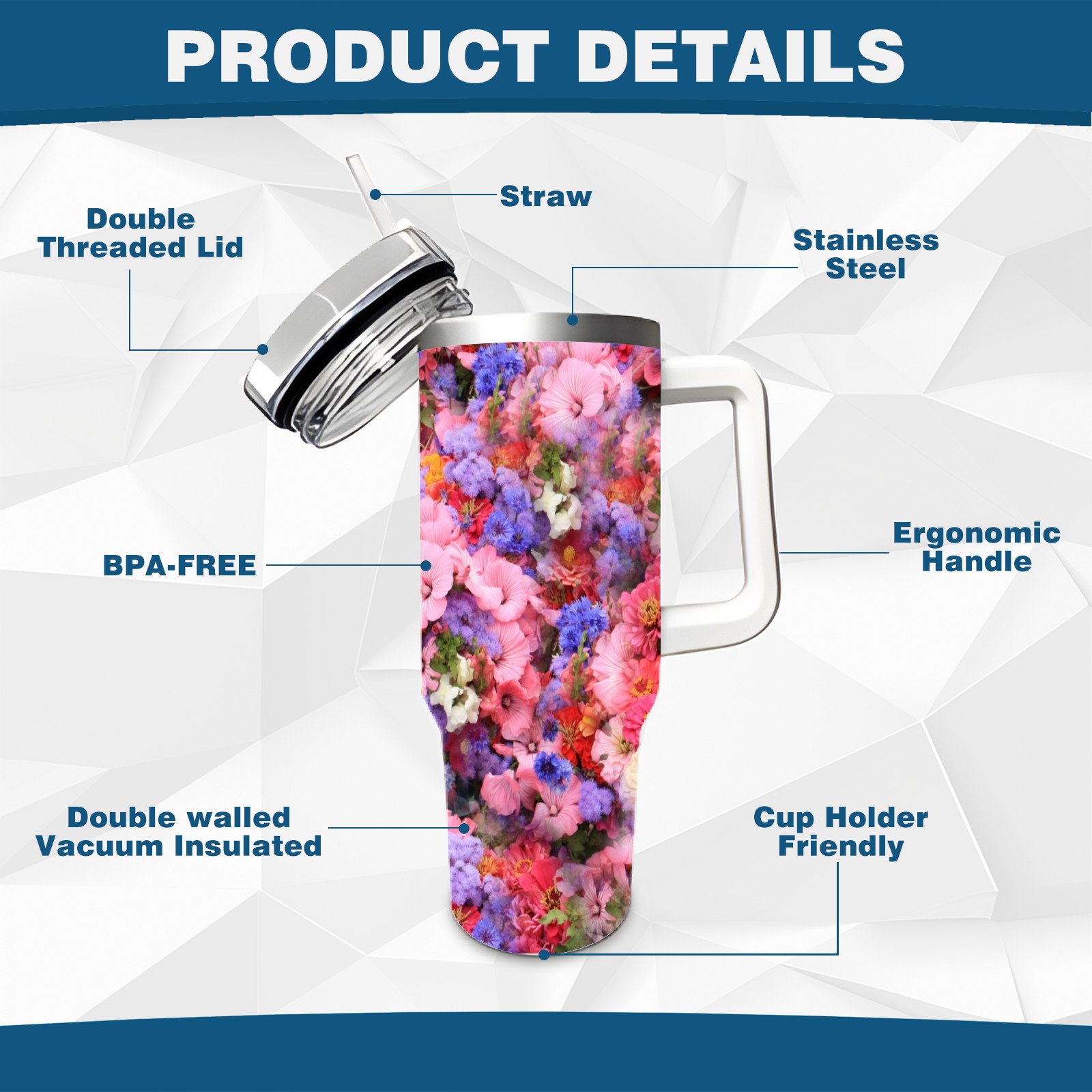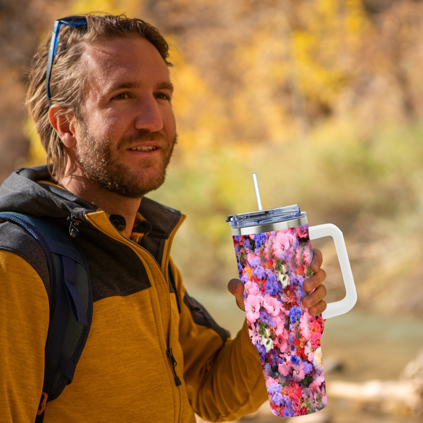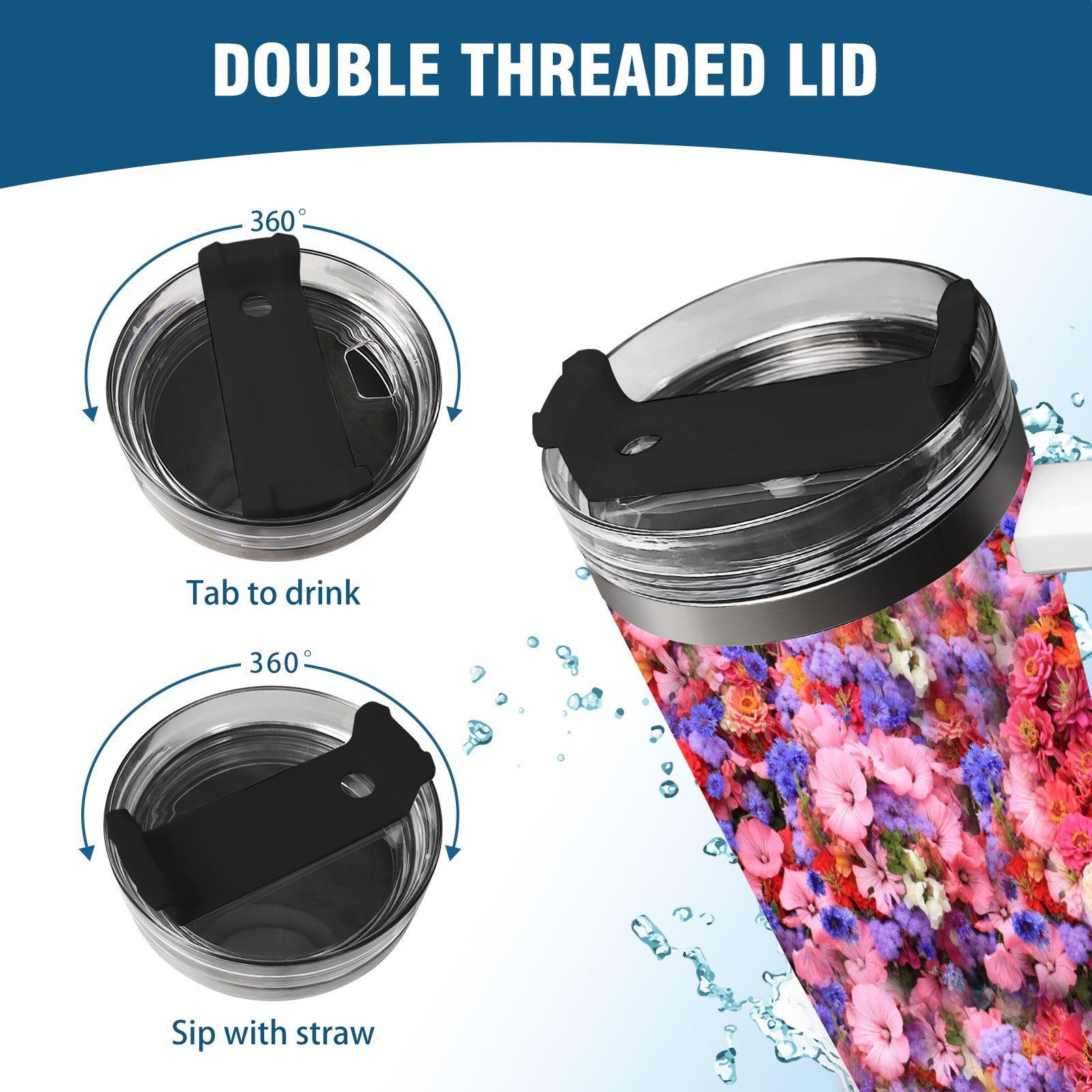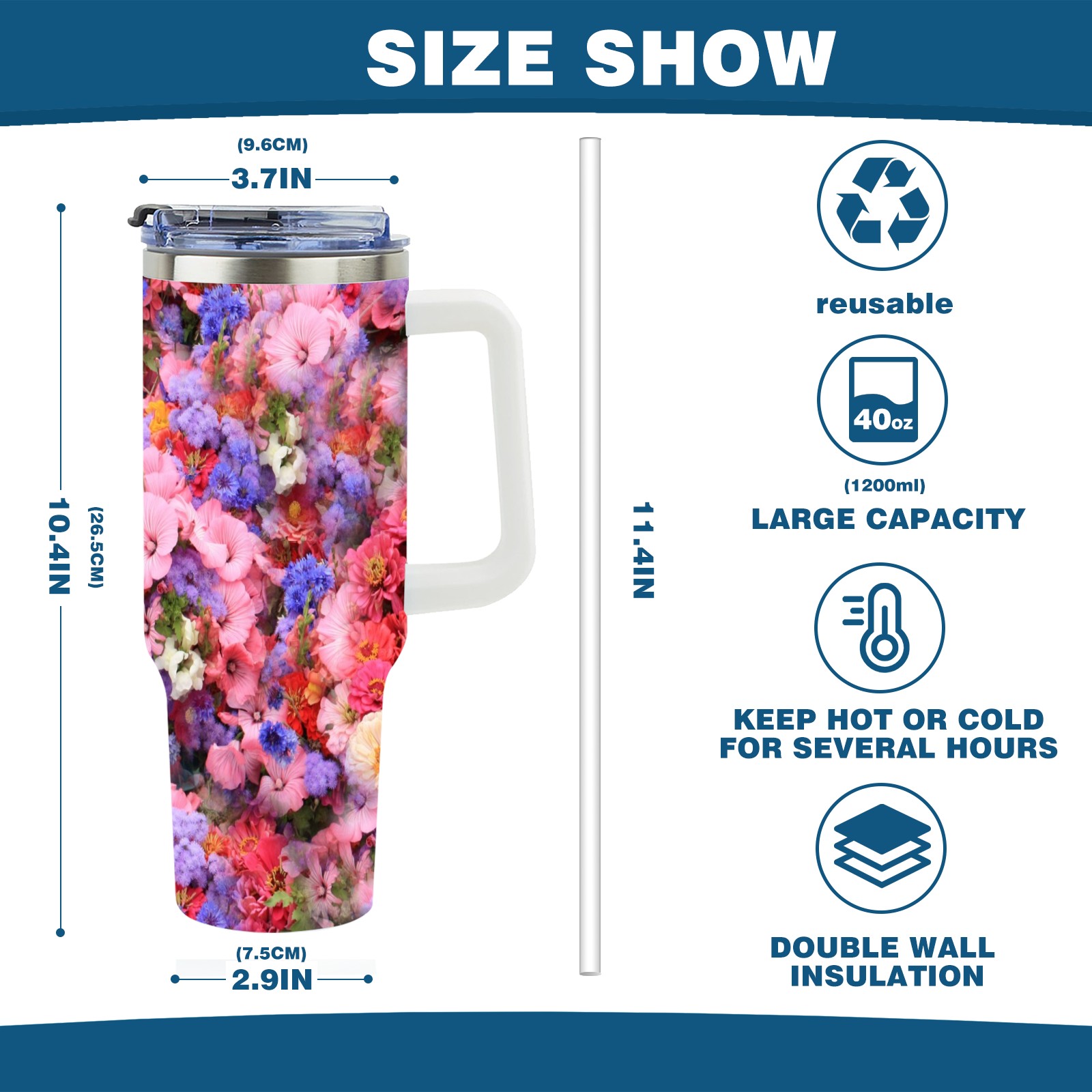 40oz Bloom Flowers thermos with lid and straw, leak-proof stainless steel, with handle, spill-proof bottle, convenient for travel(pink)