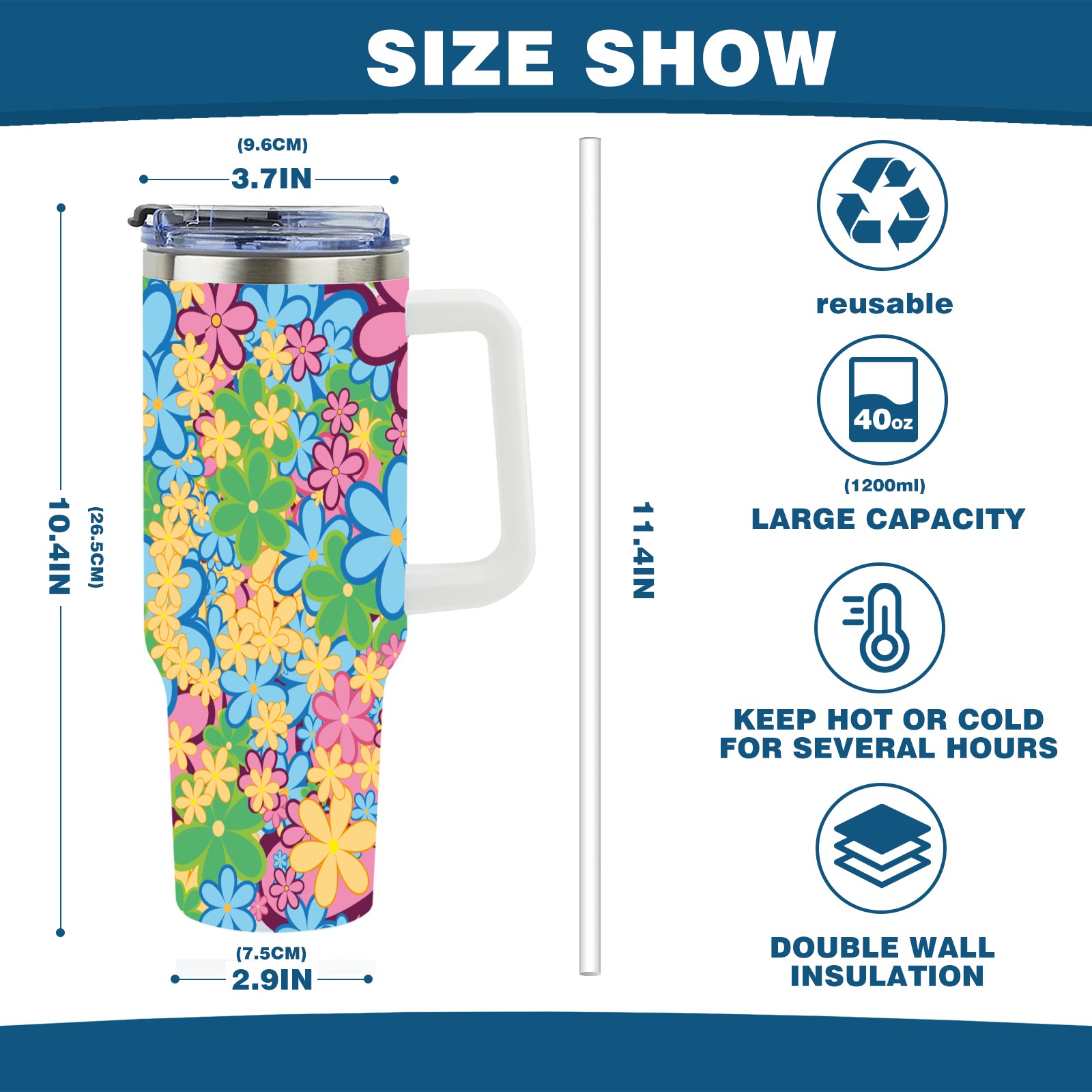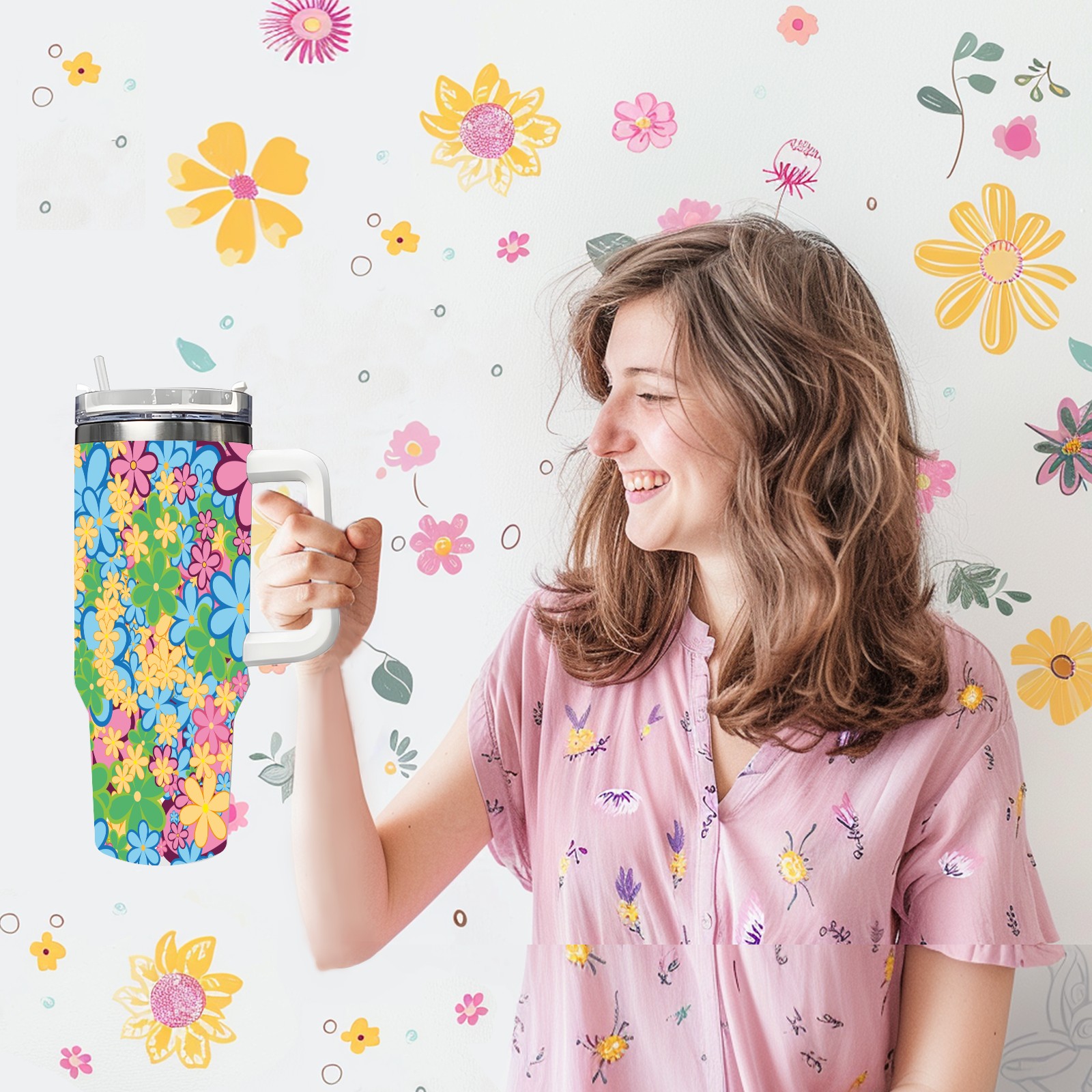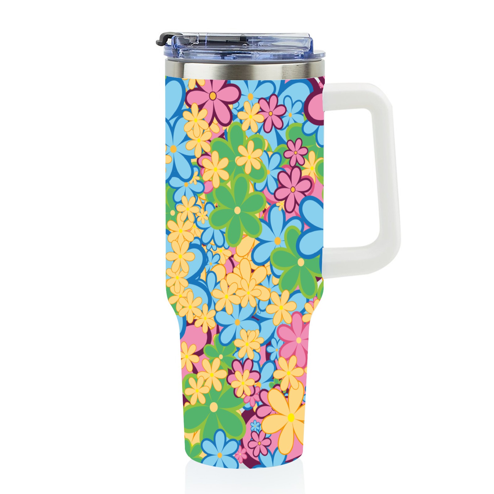 40oz Color Flower thermos with lid and straw, leak-proof stainless steel, with handle, spill-proof bottle, convenient for travel(pink)