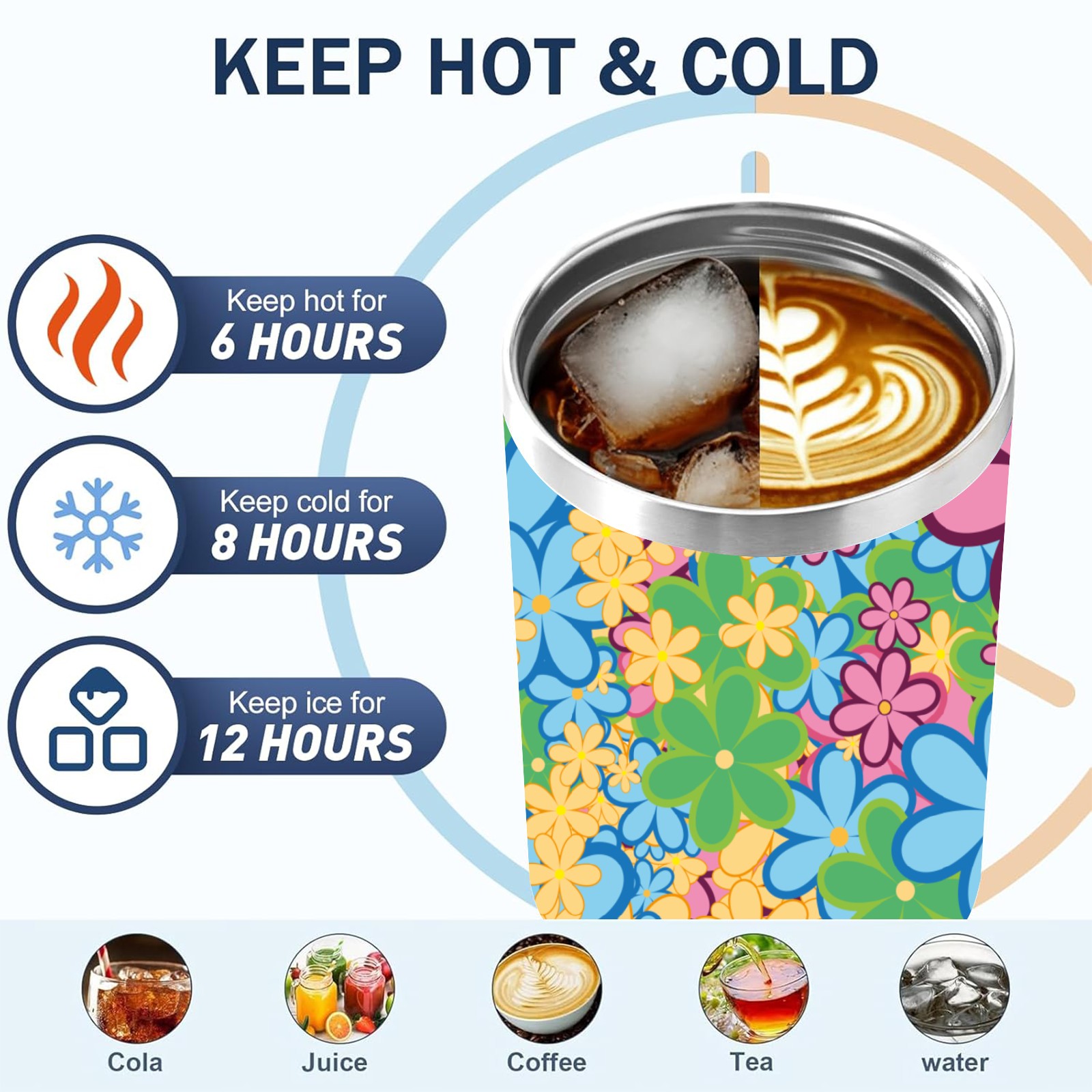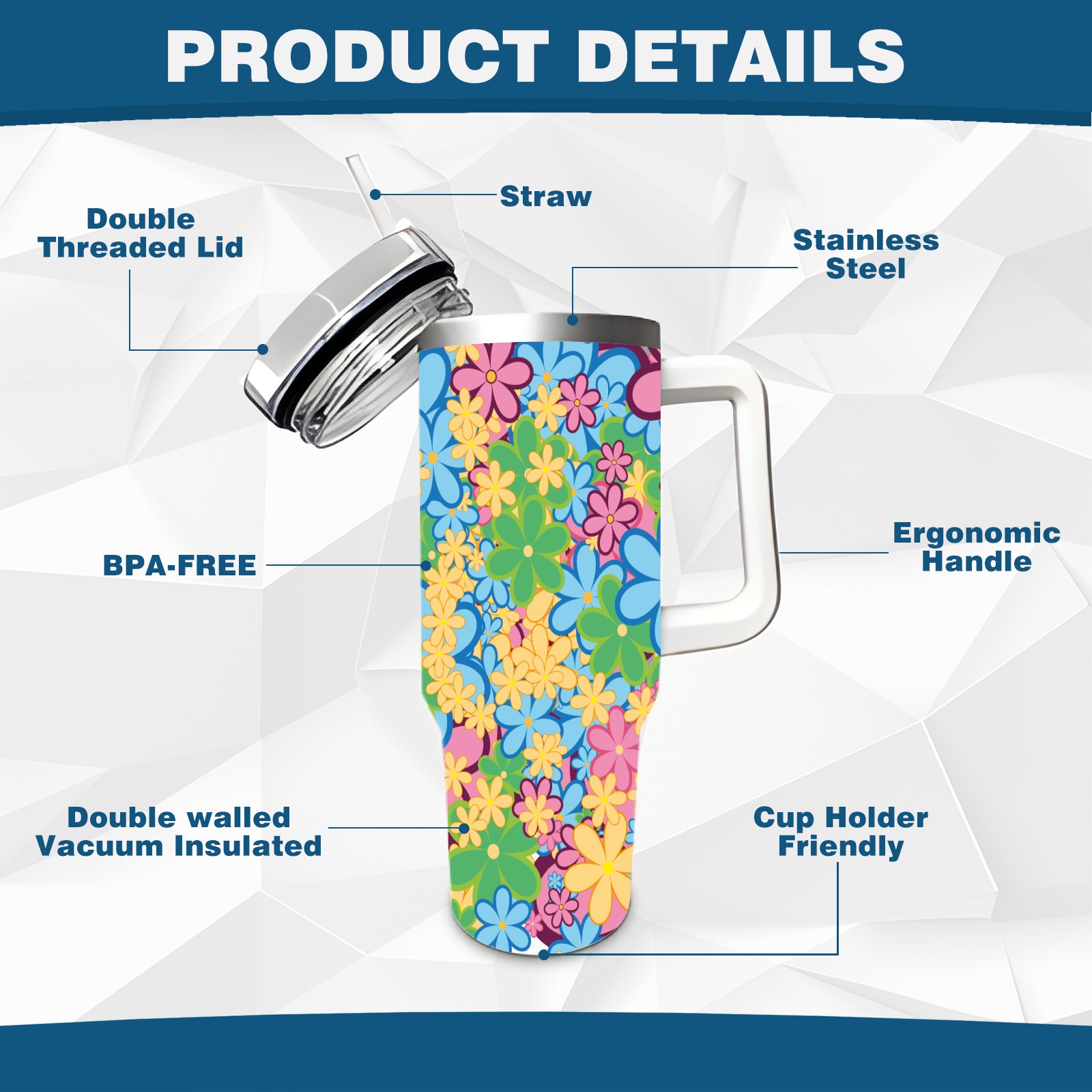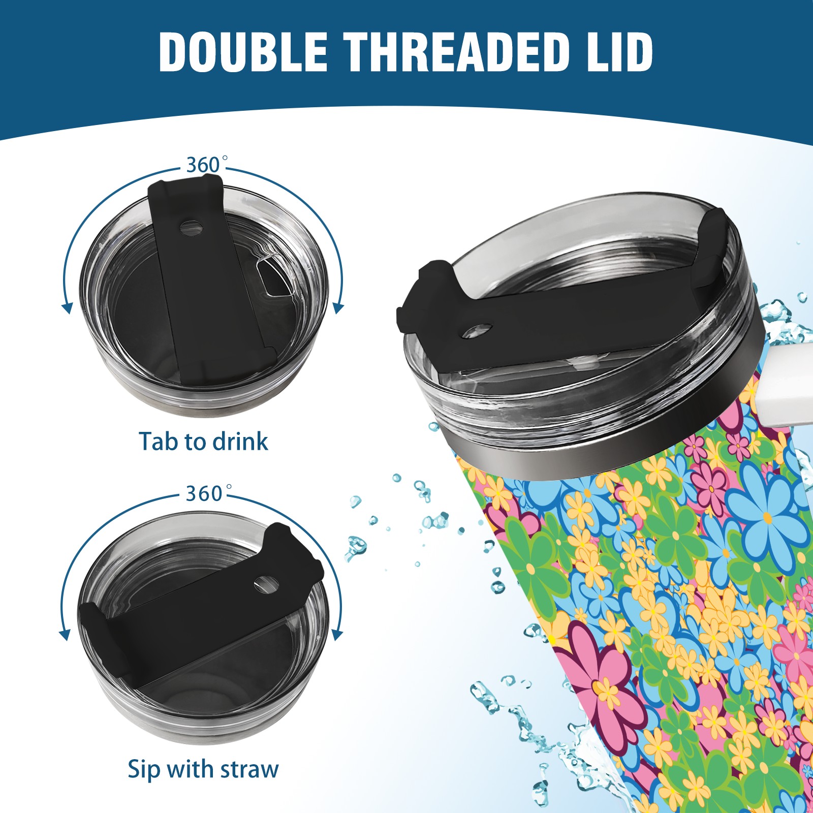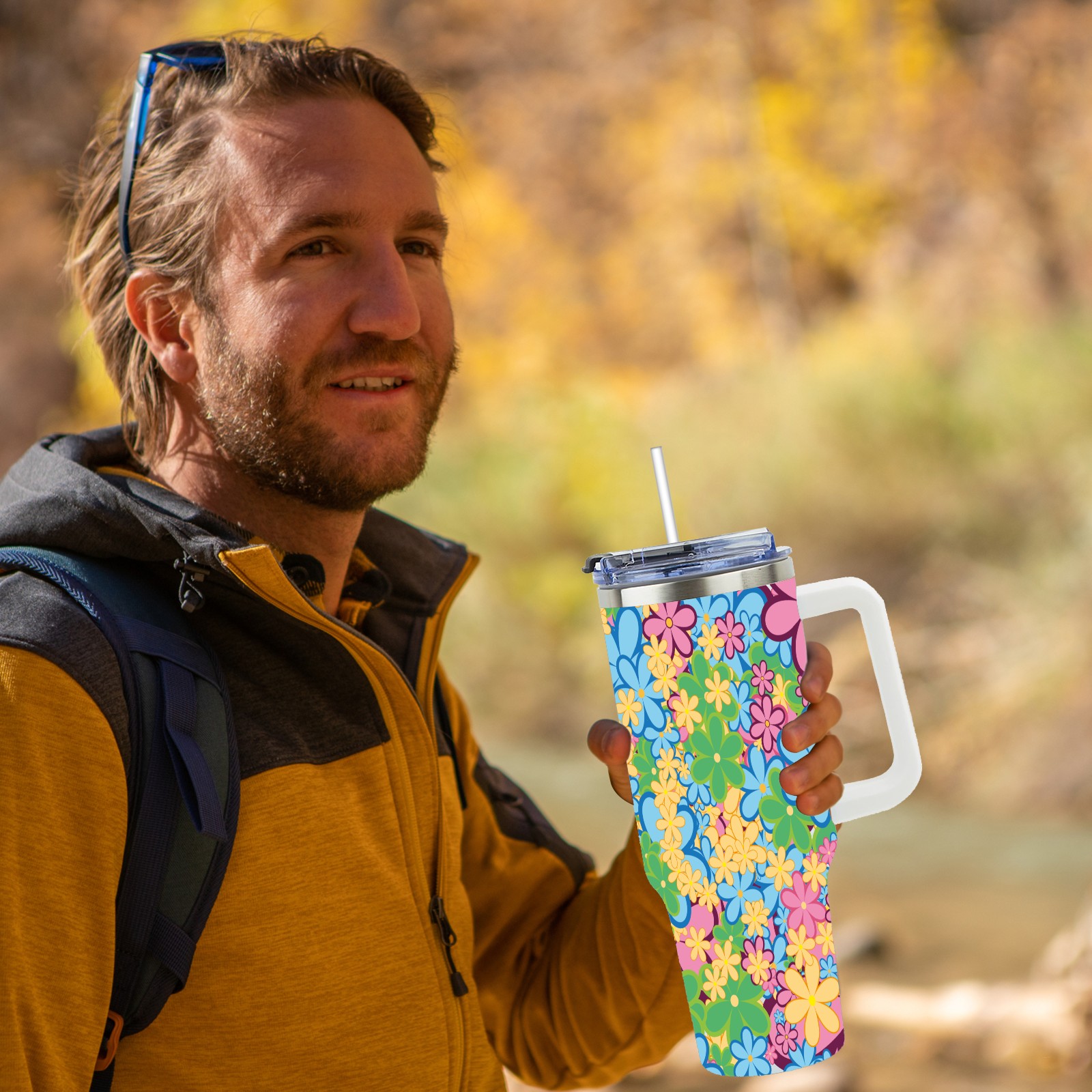 40oz Color Flower thermos with lid and straw, leak-proof stainless steel, with handle, spill-proof bottle, convenient for travel(pink)
