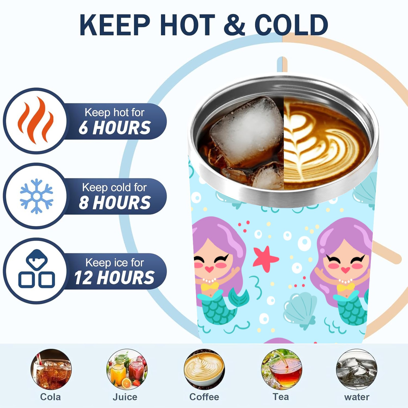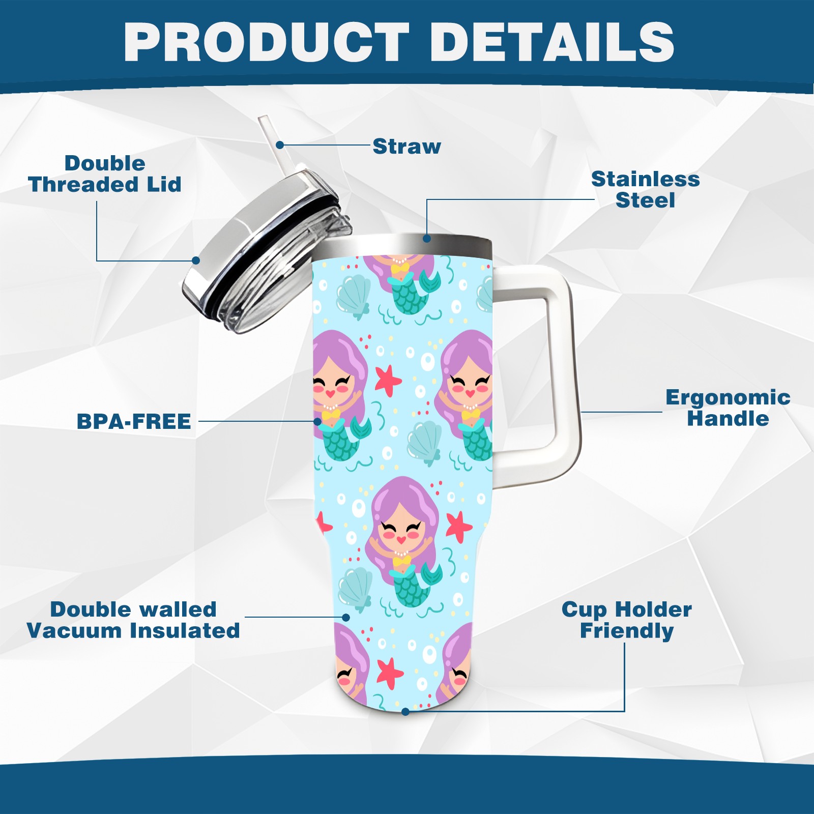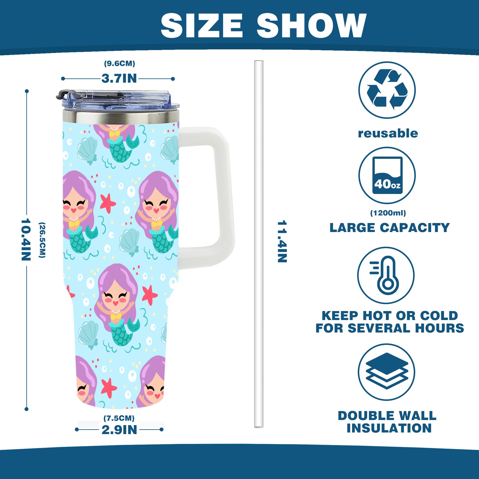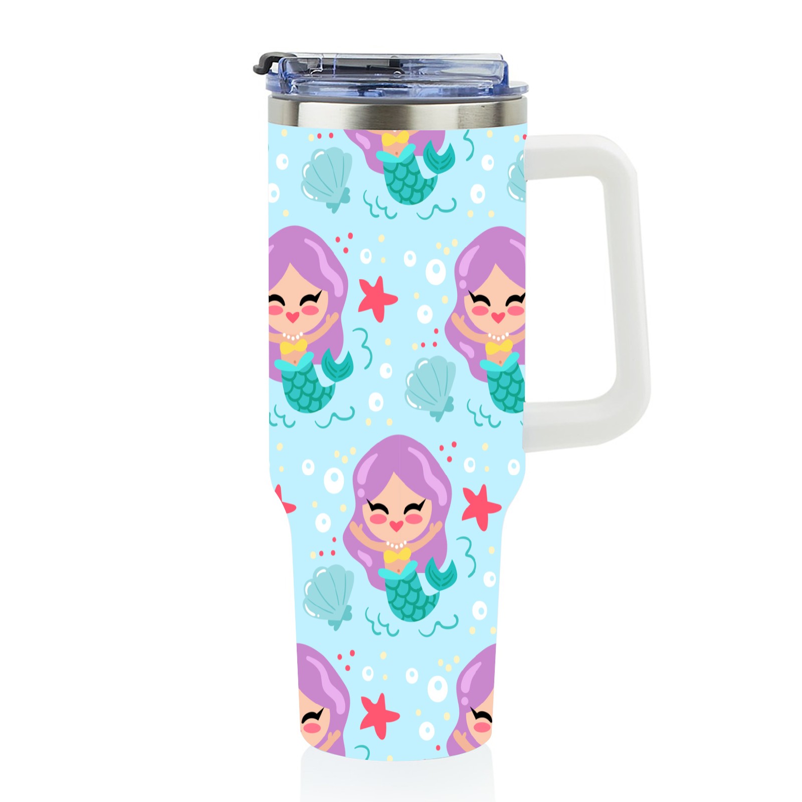 40oz Cartoon Mermaid thermos with lid and straw, leak-proof stainless steel, with handle, spill-proof bottle, convenient for travel(pink)
