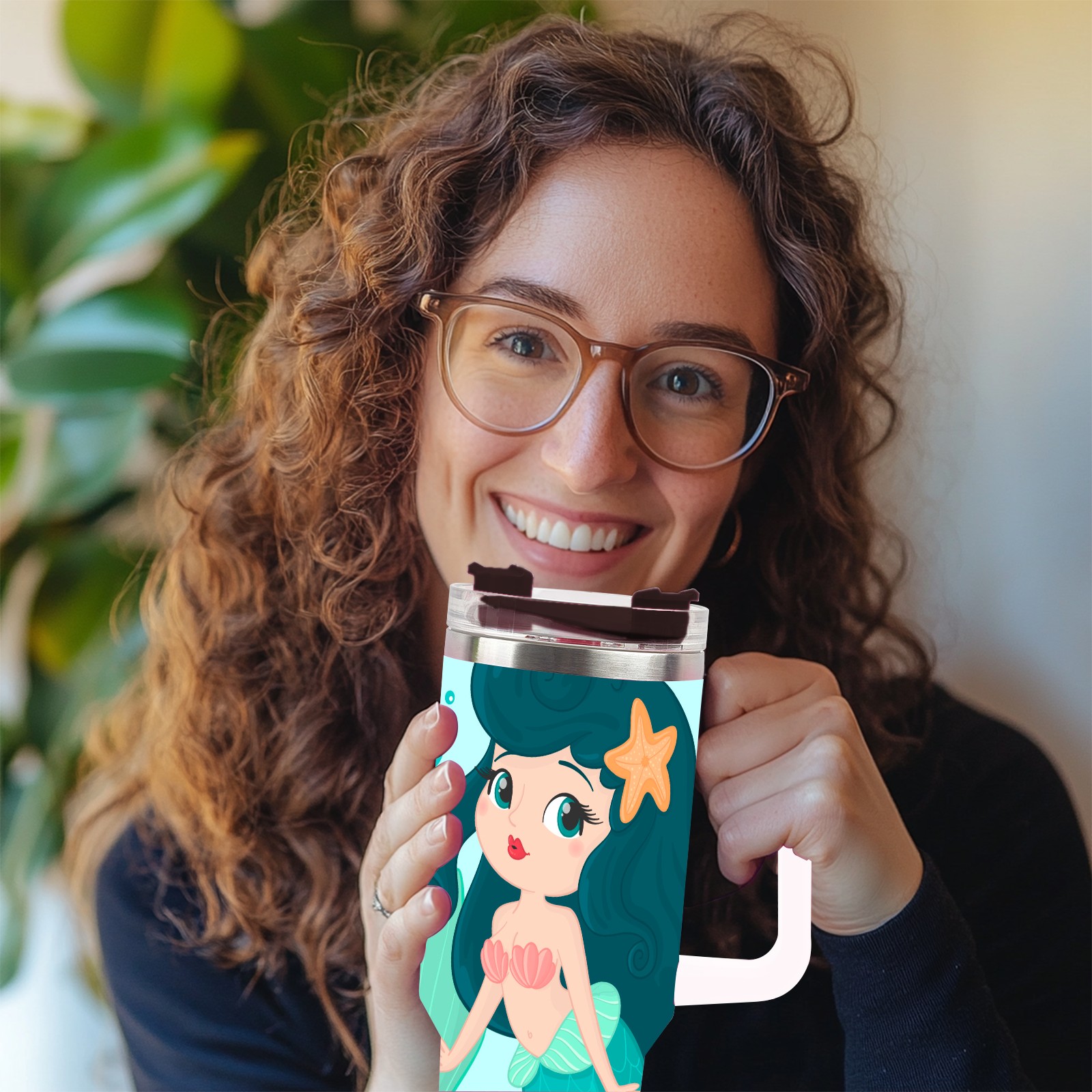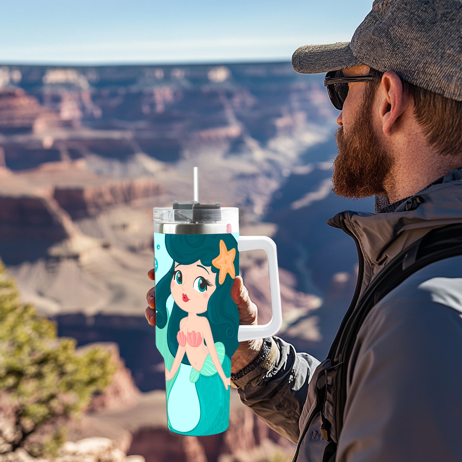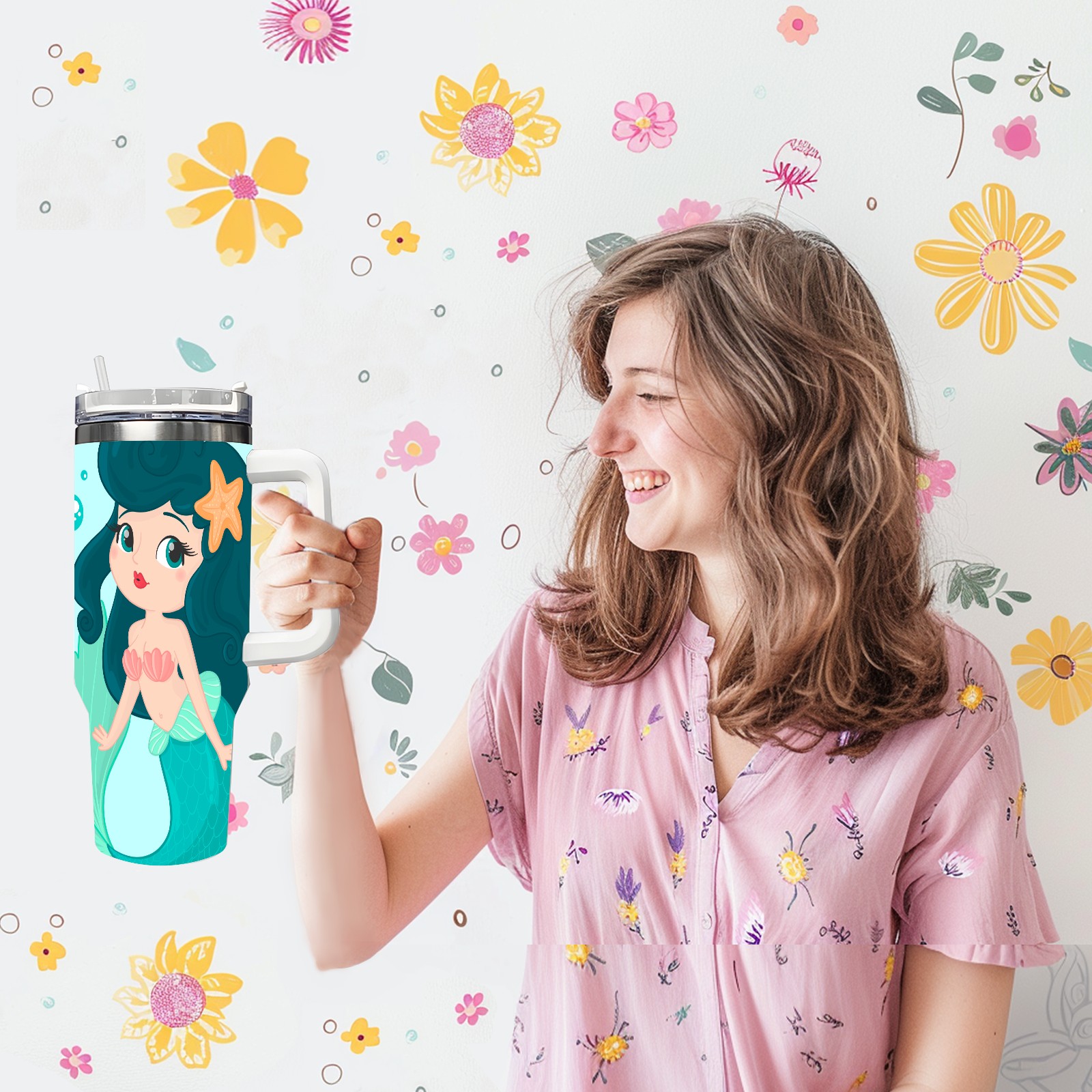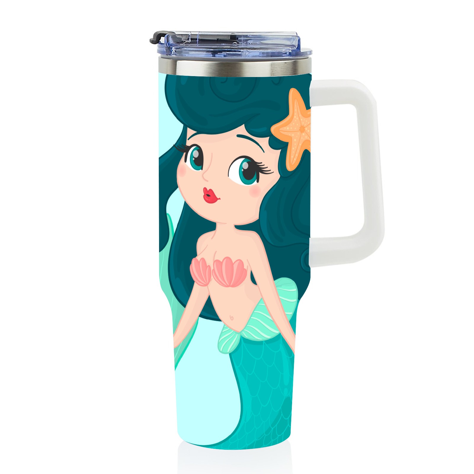 40oz Green Mermaid thermos with lid and straw, leak-proof stainless steel, with handle, spill-proof bottle, convenient for travel(pink)