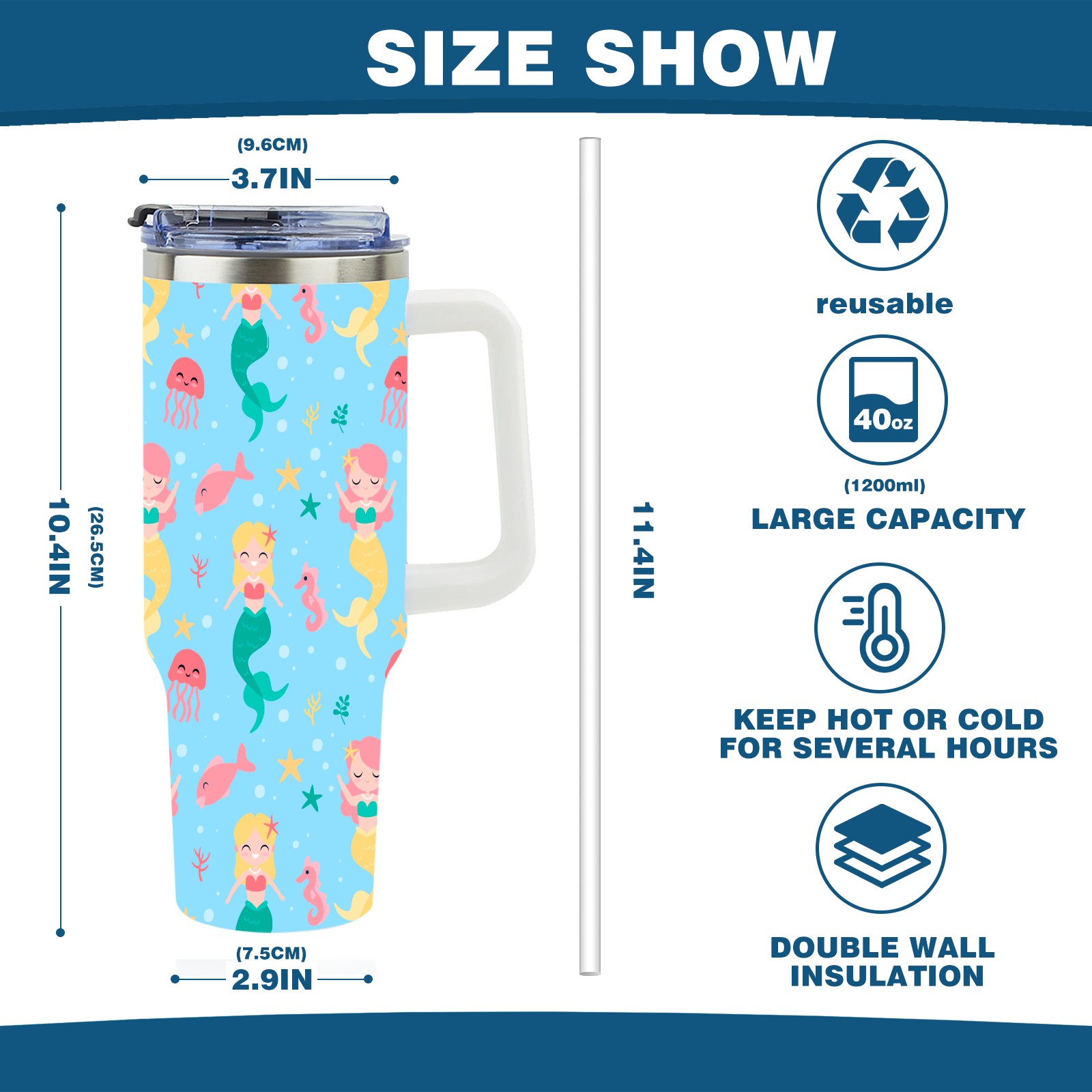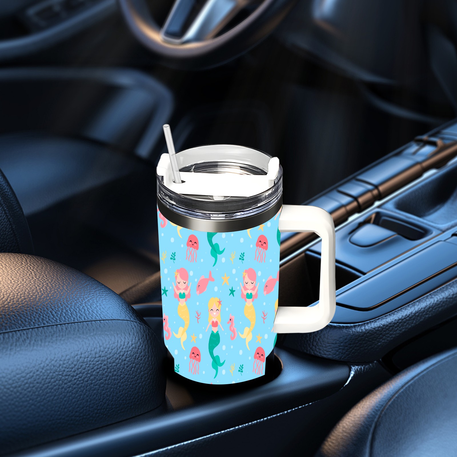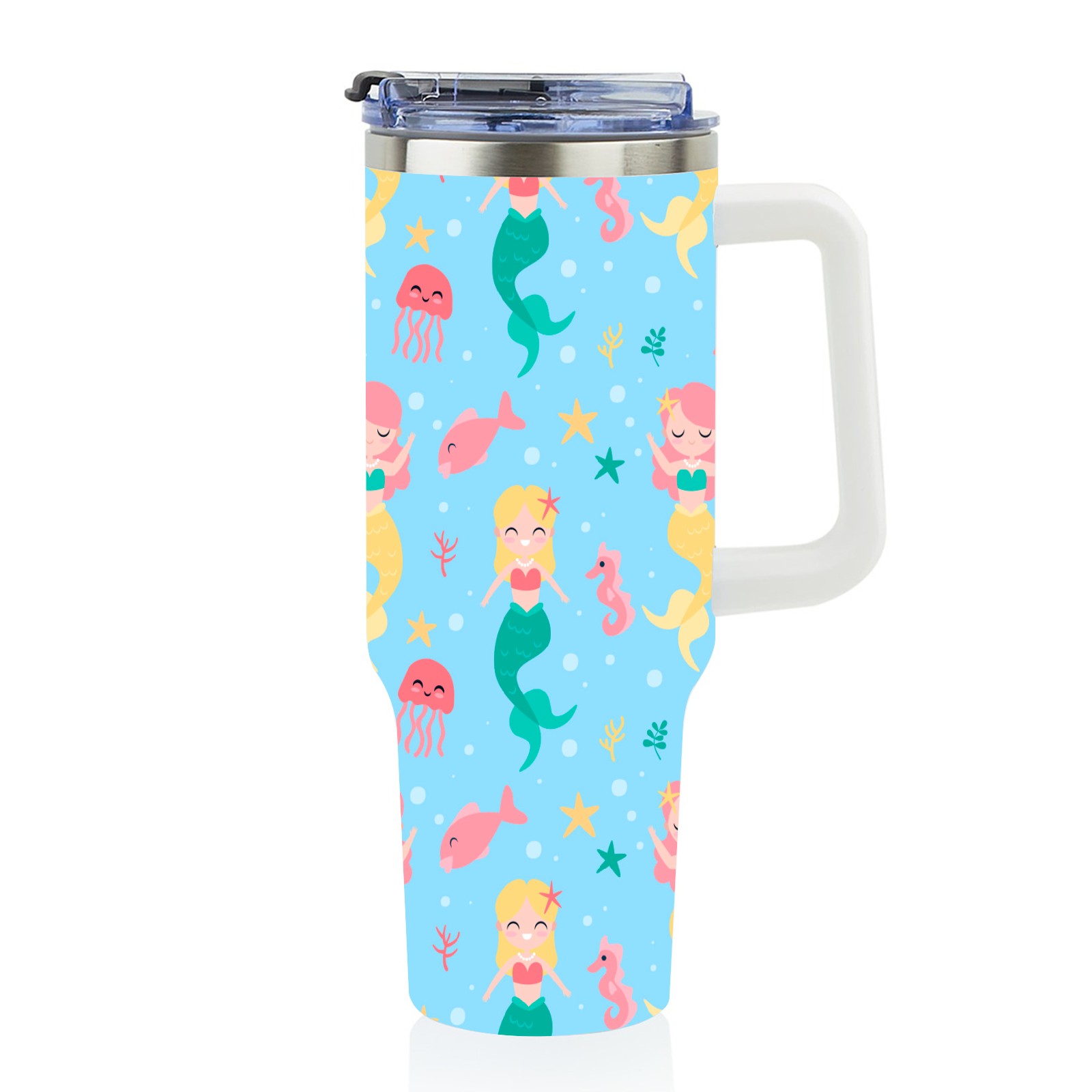 40oz Mermaid Fish thermos with lid and straw, leak-proof stainless steel, with handle, spill-proof bottle, convenient for travel(pink)