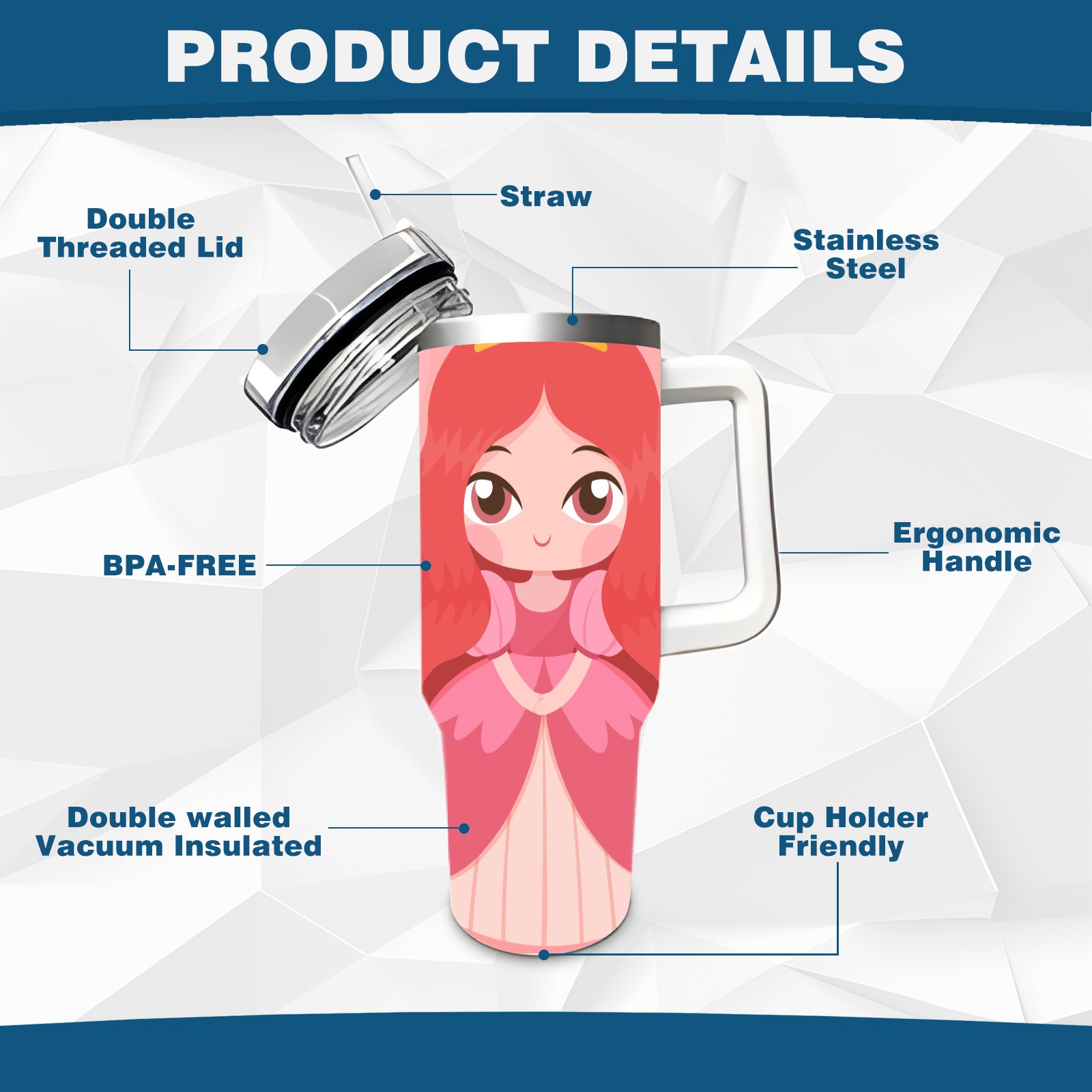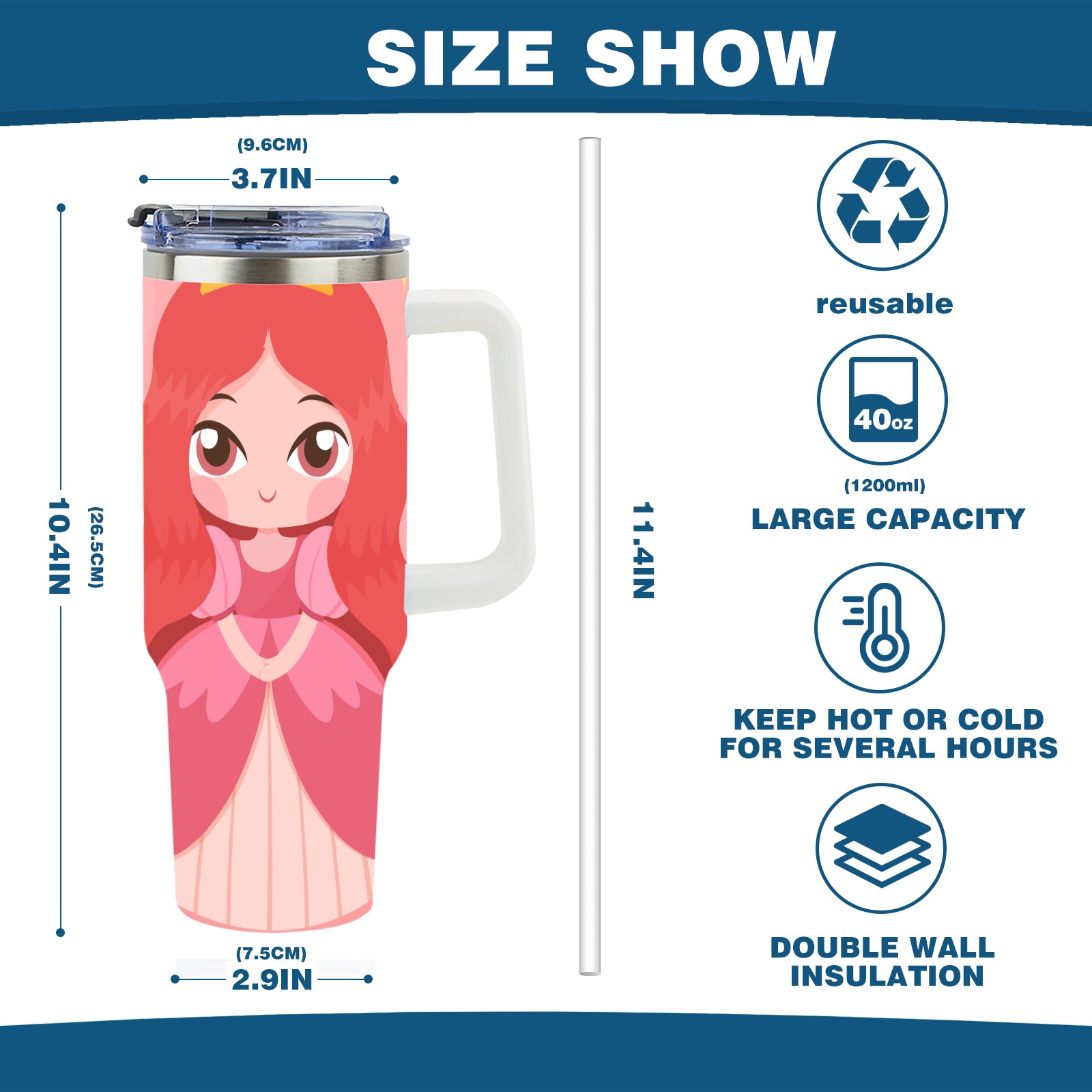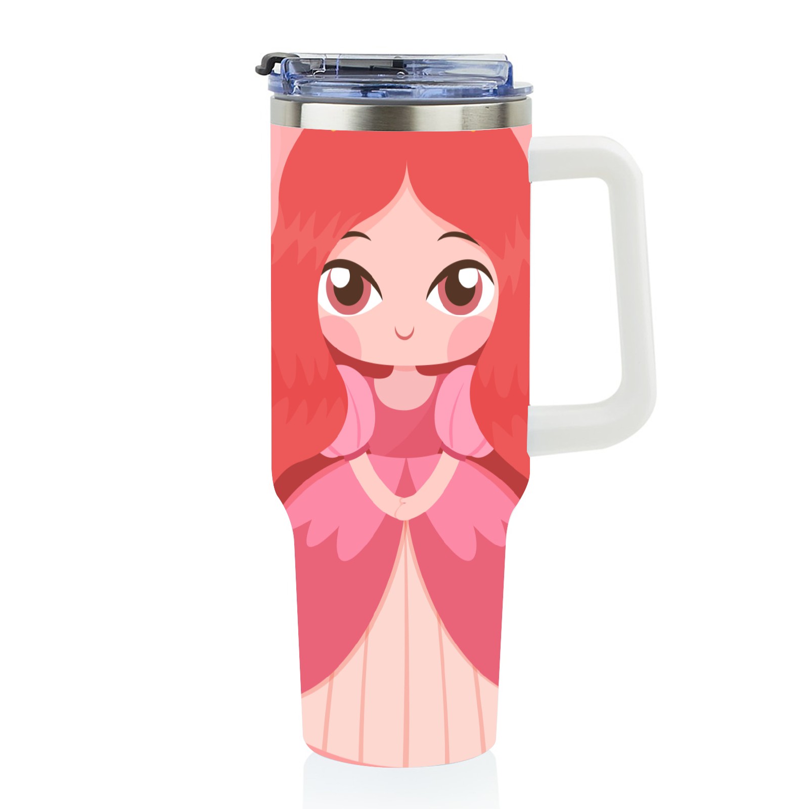 40oz Princess Baby thermos with lid and straw, leak-proof stainless steel, with handle, spill-proof bottle, convenient for travel(pink)