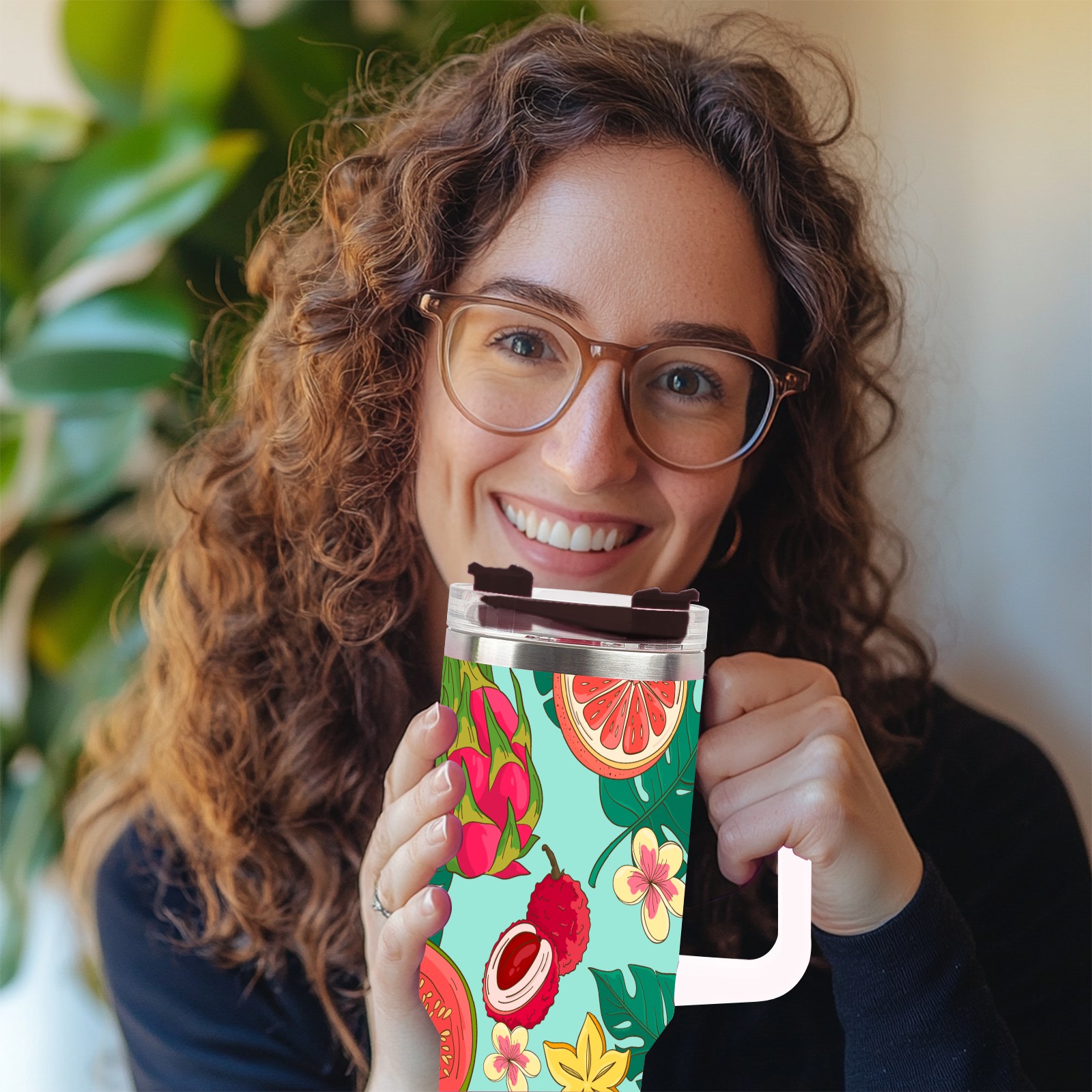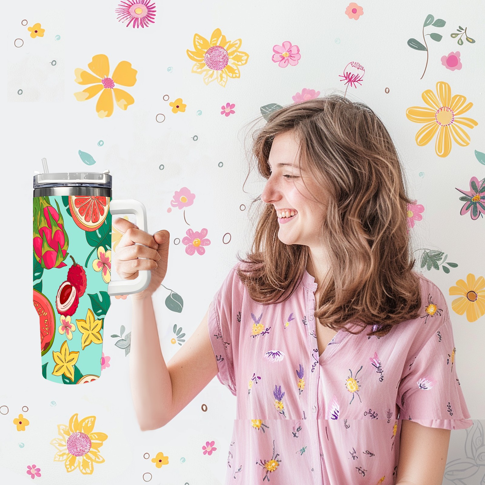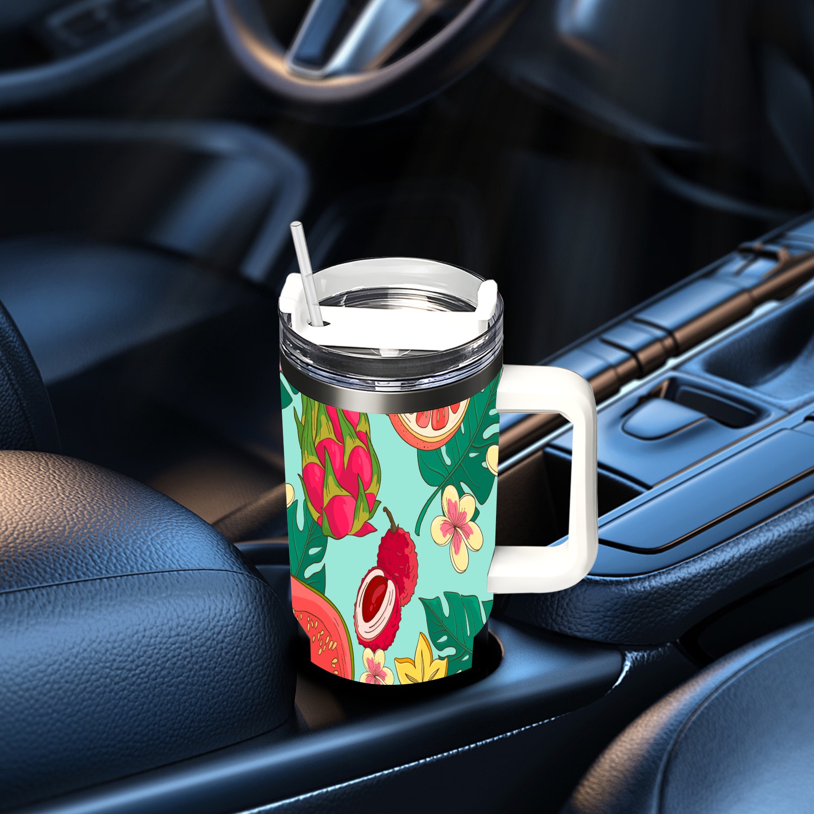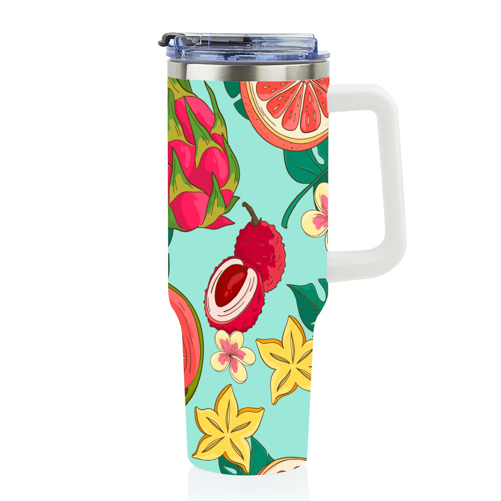 40oz Tropical Fruit thermos with lid and straw, leak-proof stainless steel, with handle, spill-proof bottle, convenient for travel(pink)
