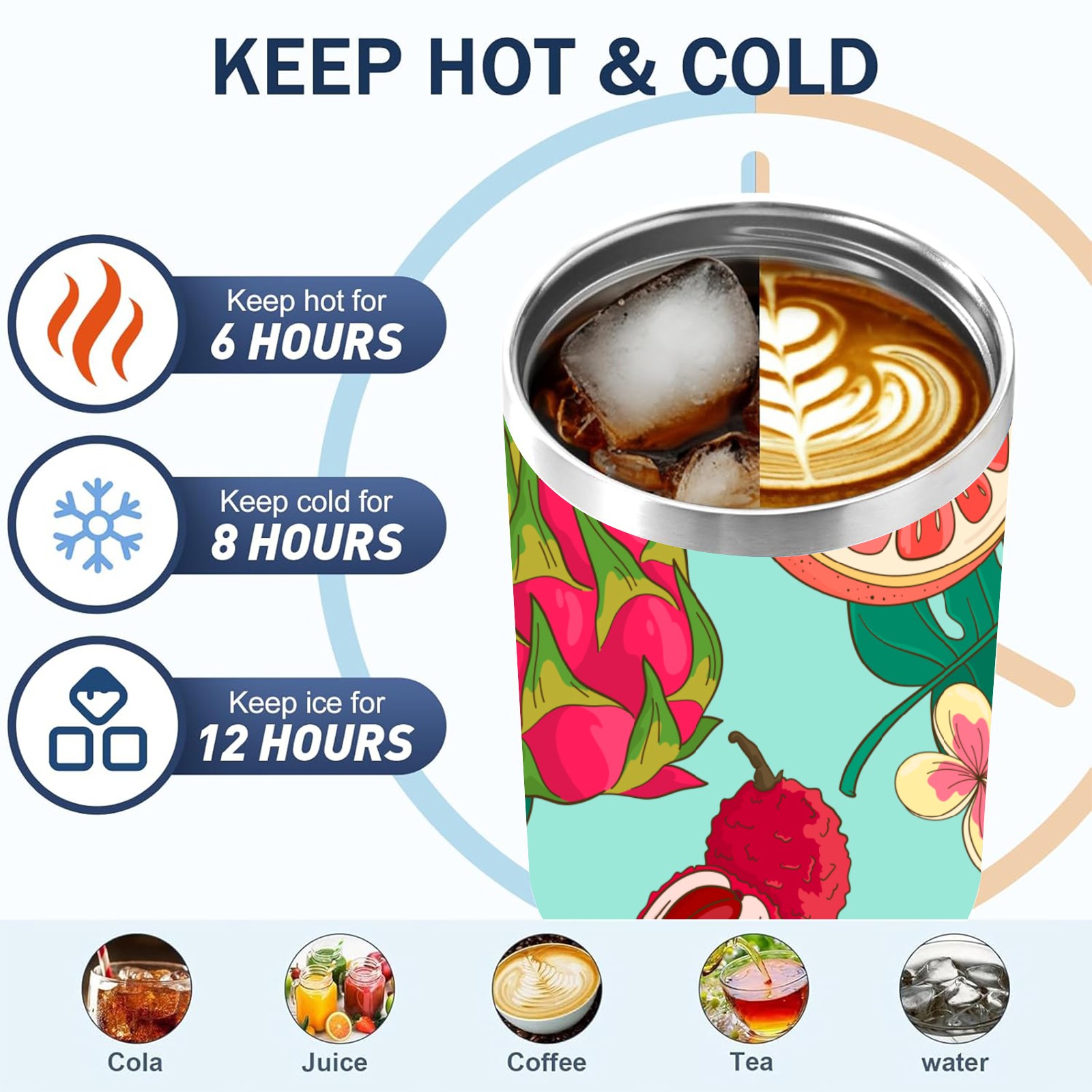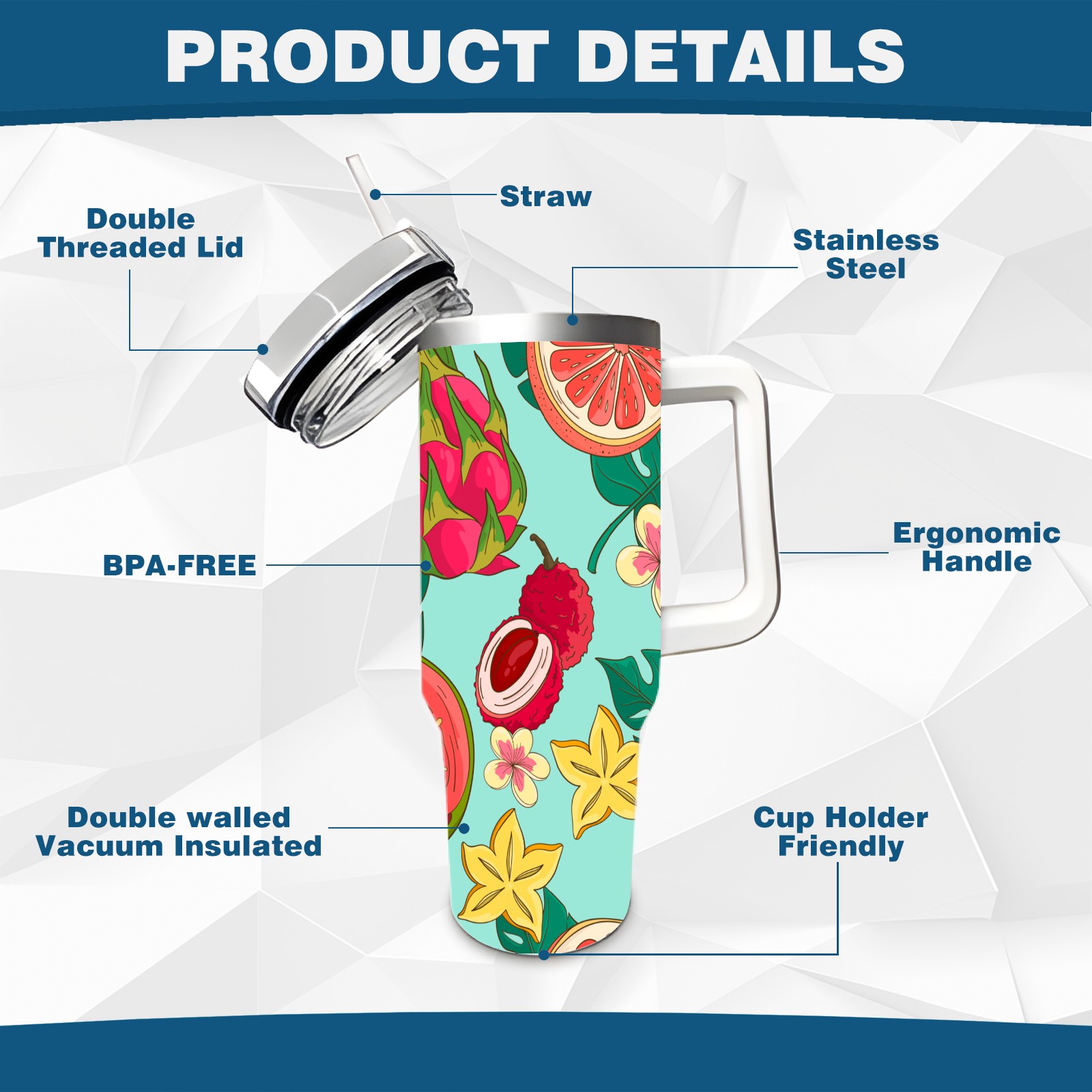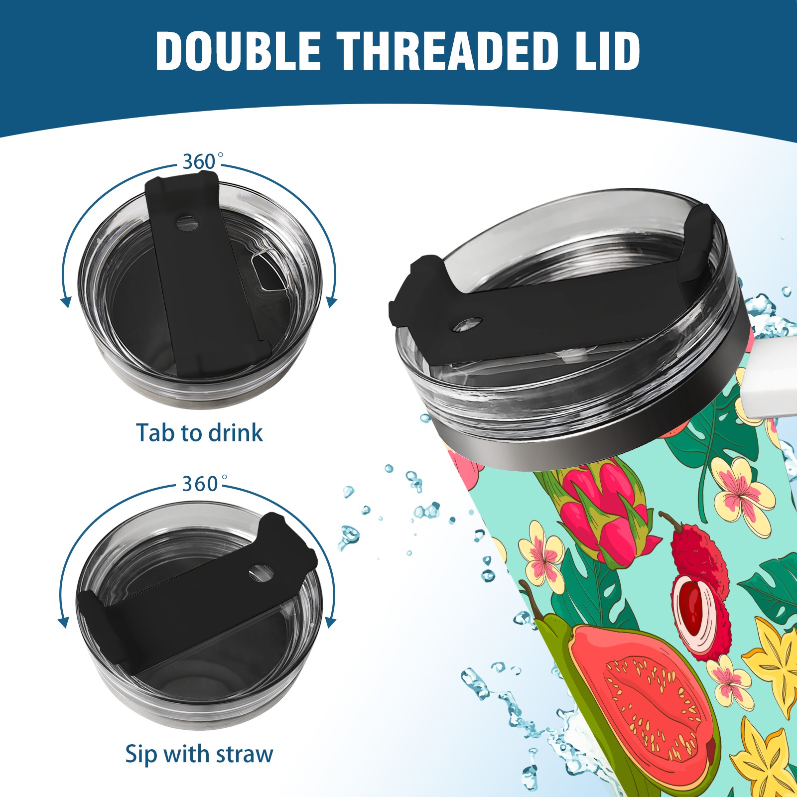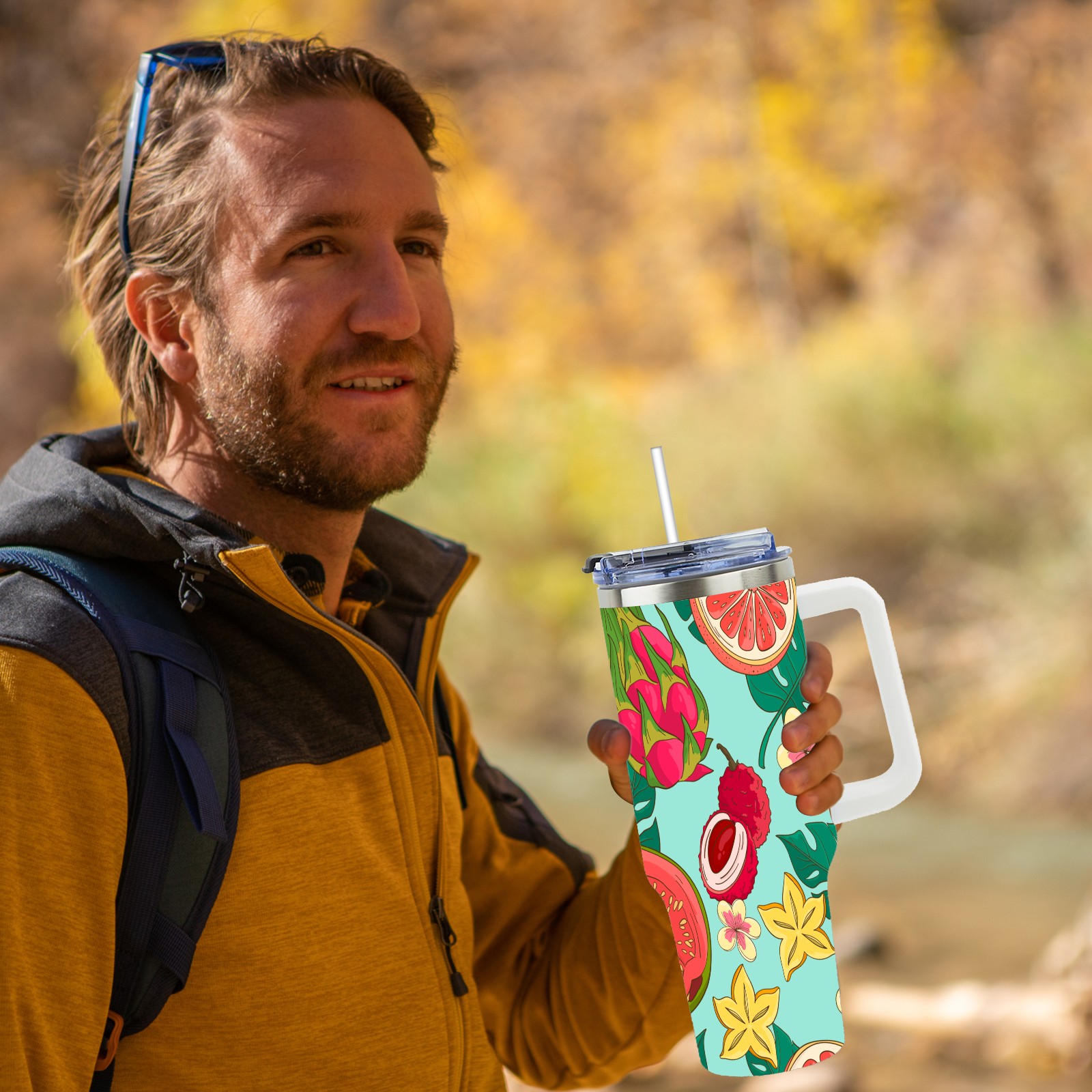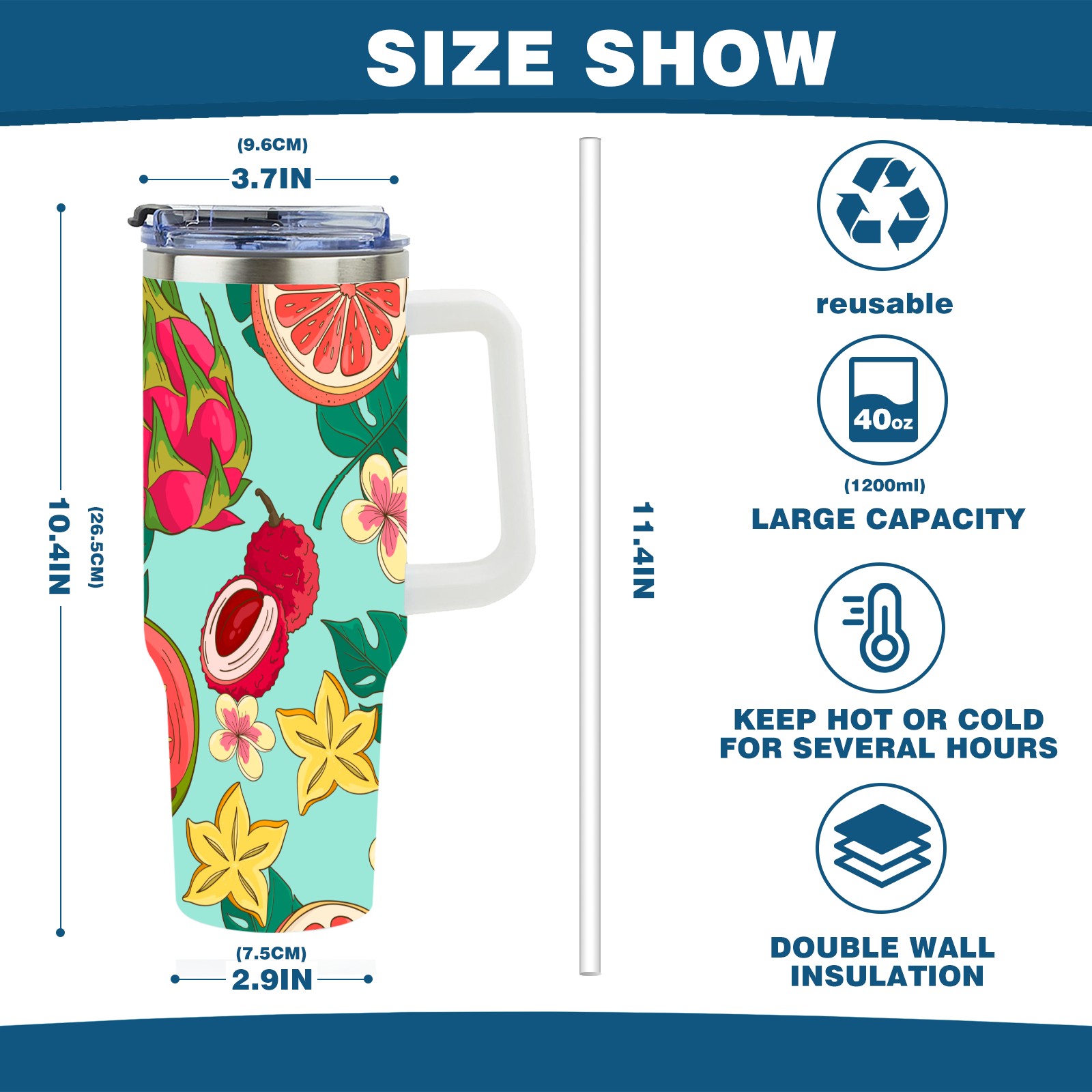 40oz Tropical Fruit thermos with lid and straw, leak-proof stainless steel, with handle, spill-proof bottle, convenient for travel(pink)
