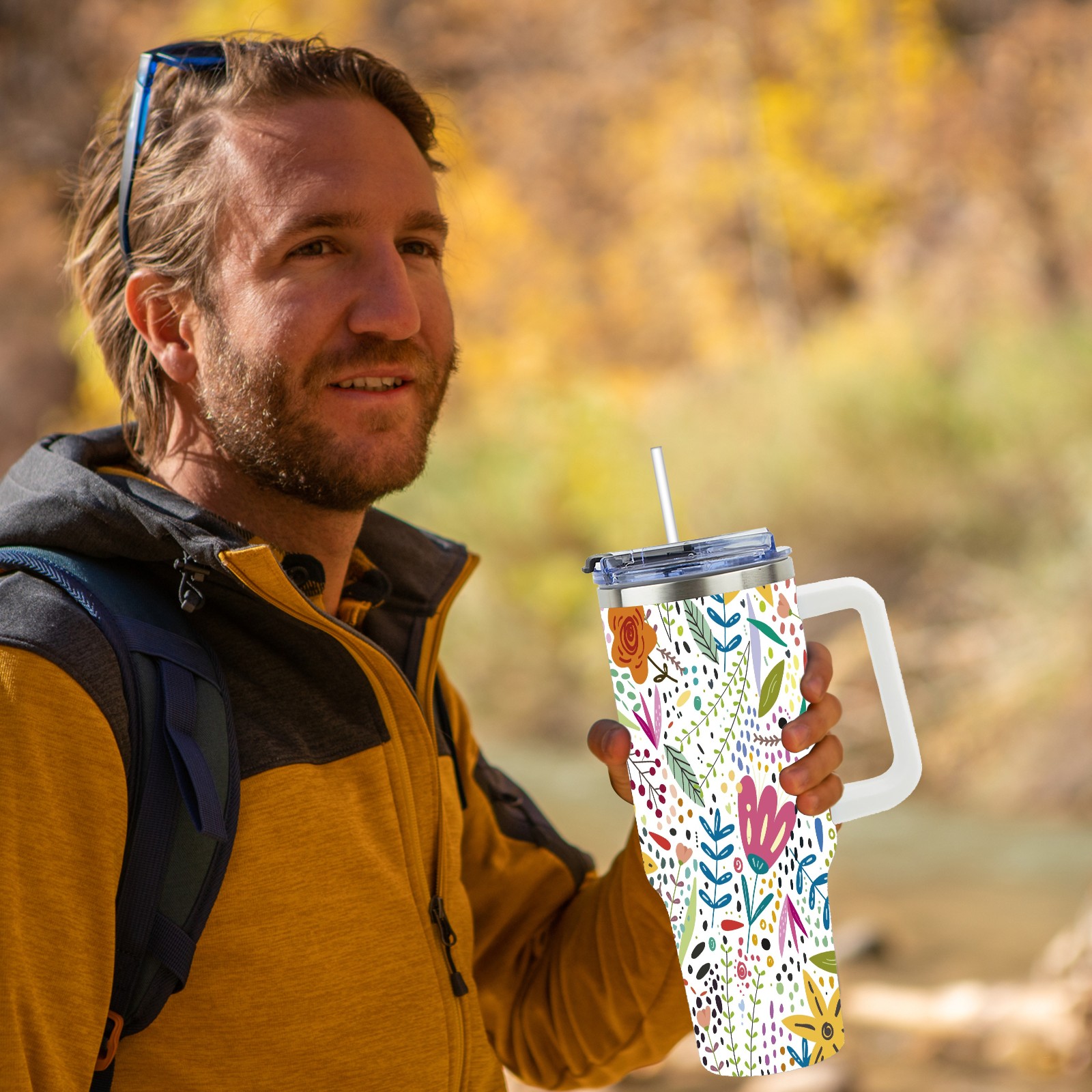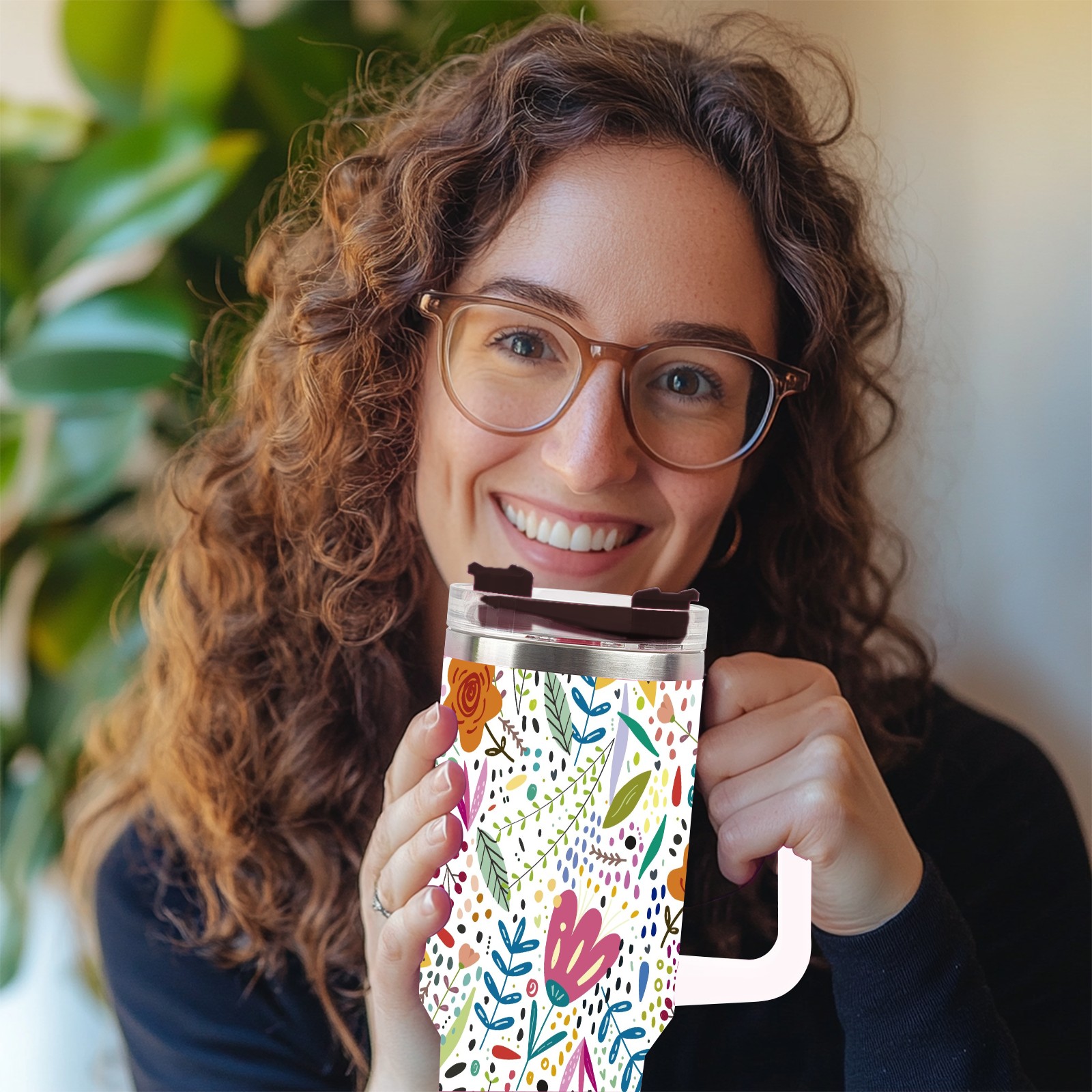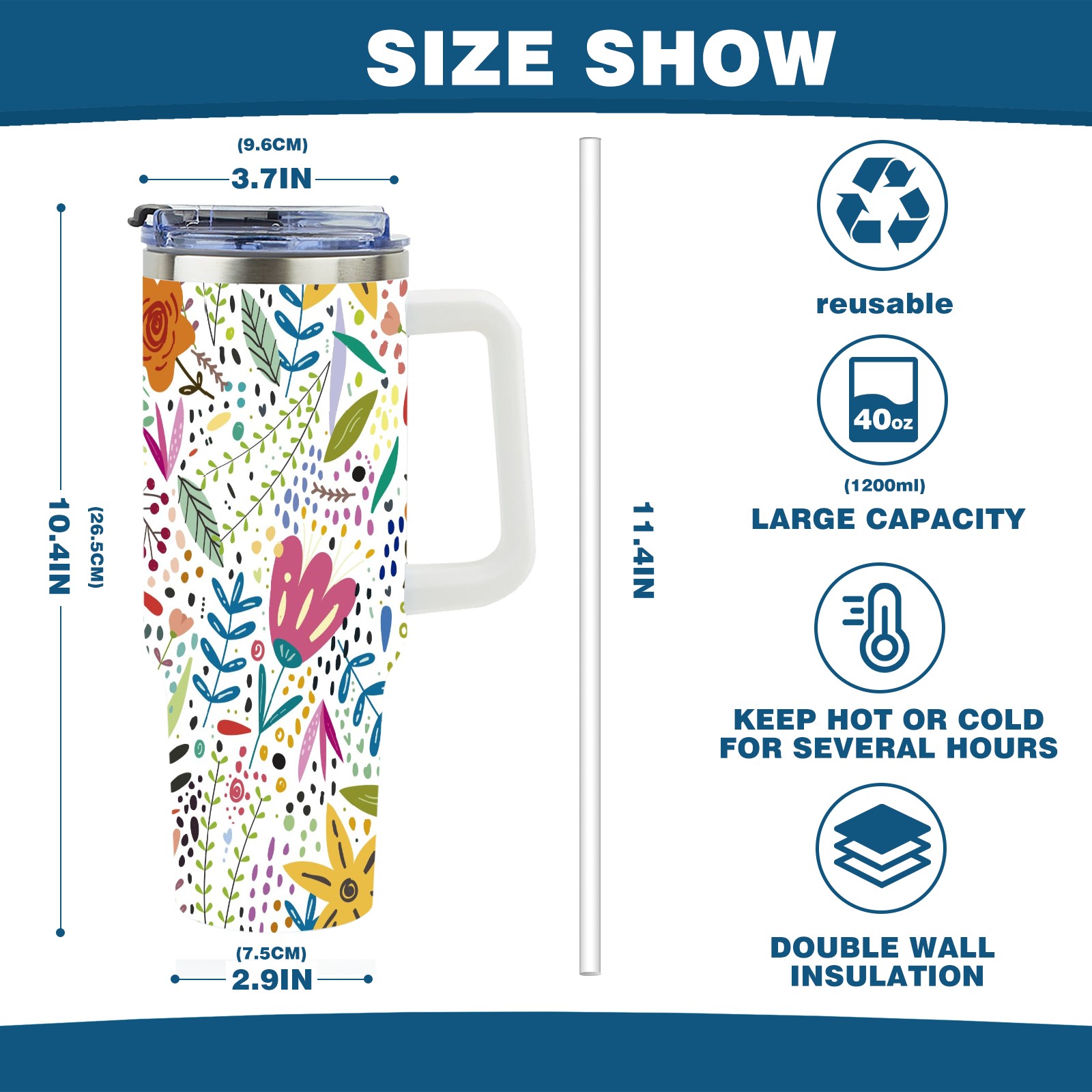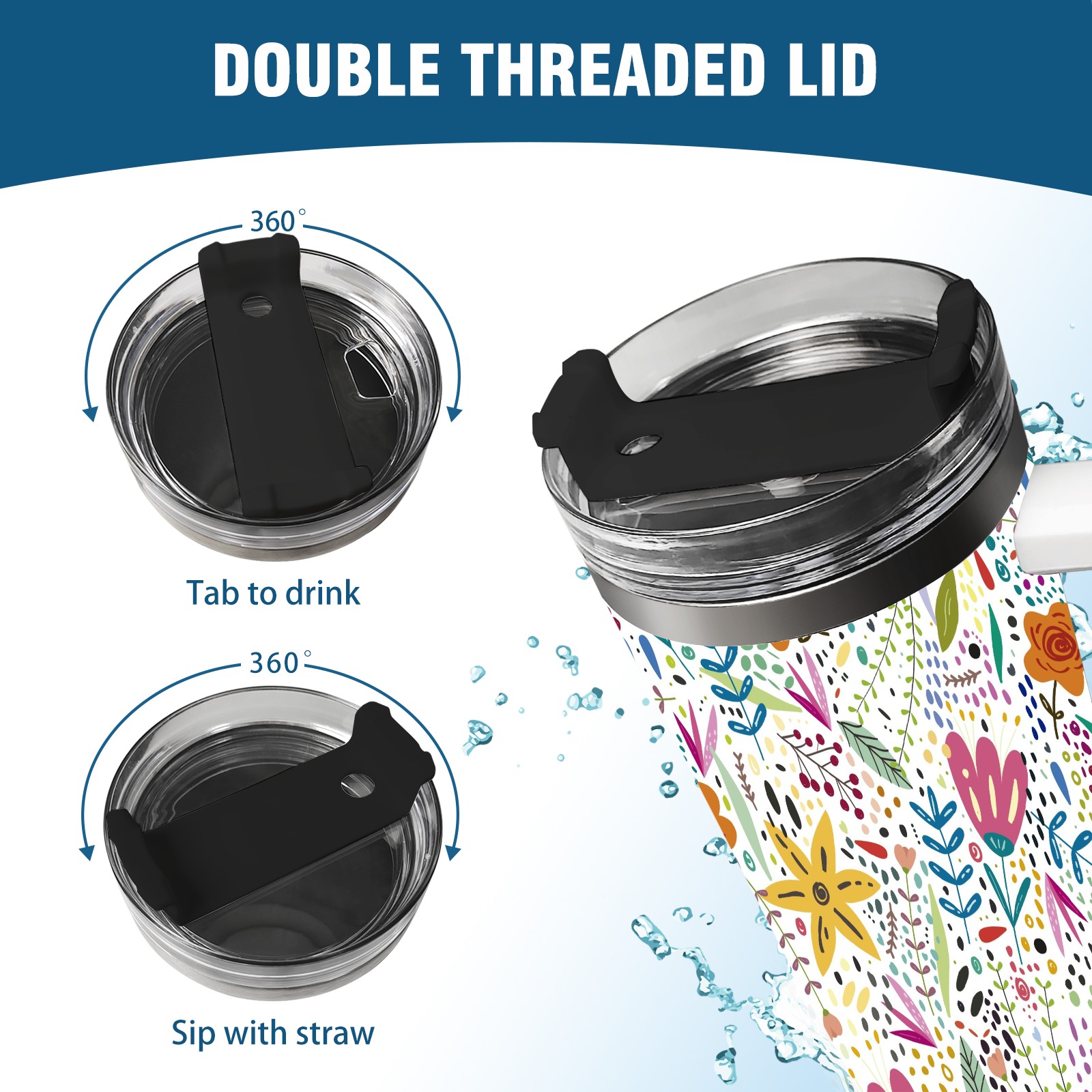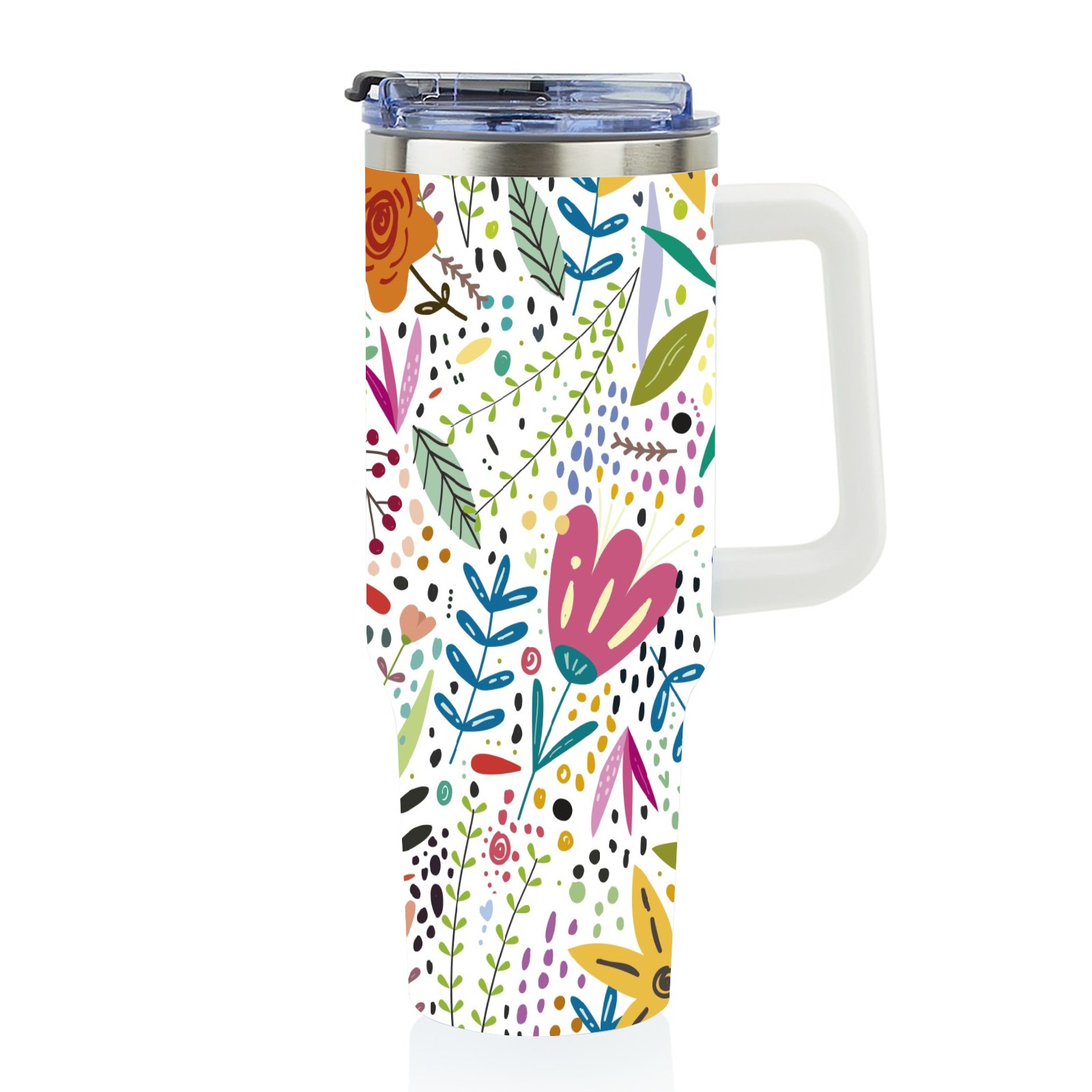 40oz Flowers thermos with lid and straw, leak-proof stainless steel, with handle, spill-proof bottle, convenient for travel(pink)
