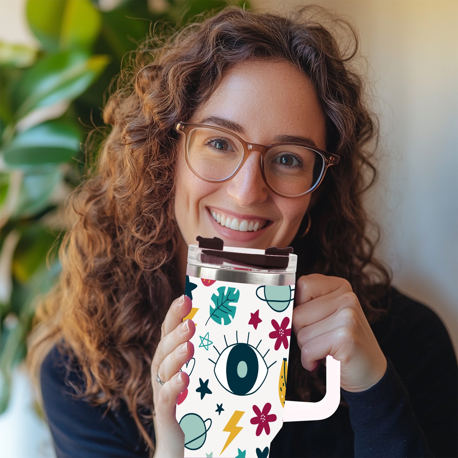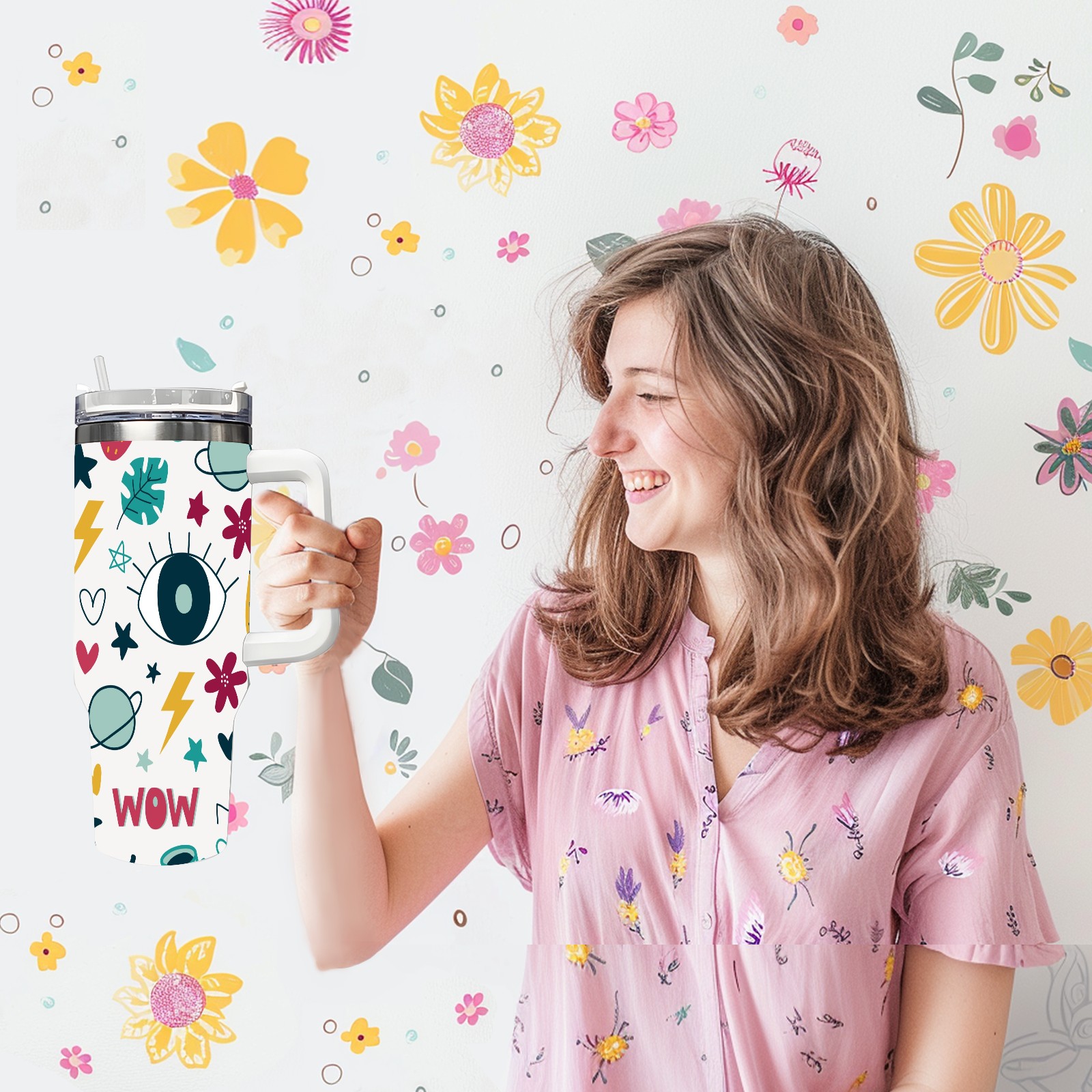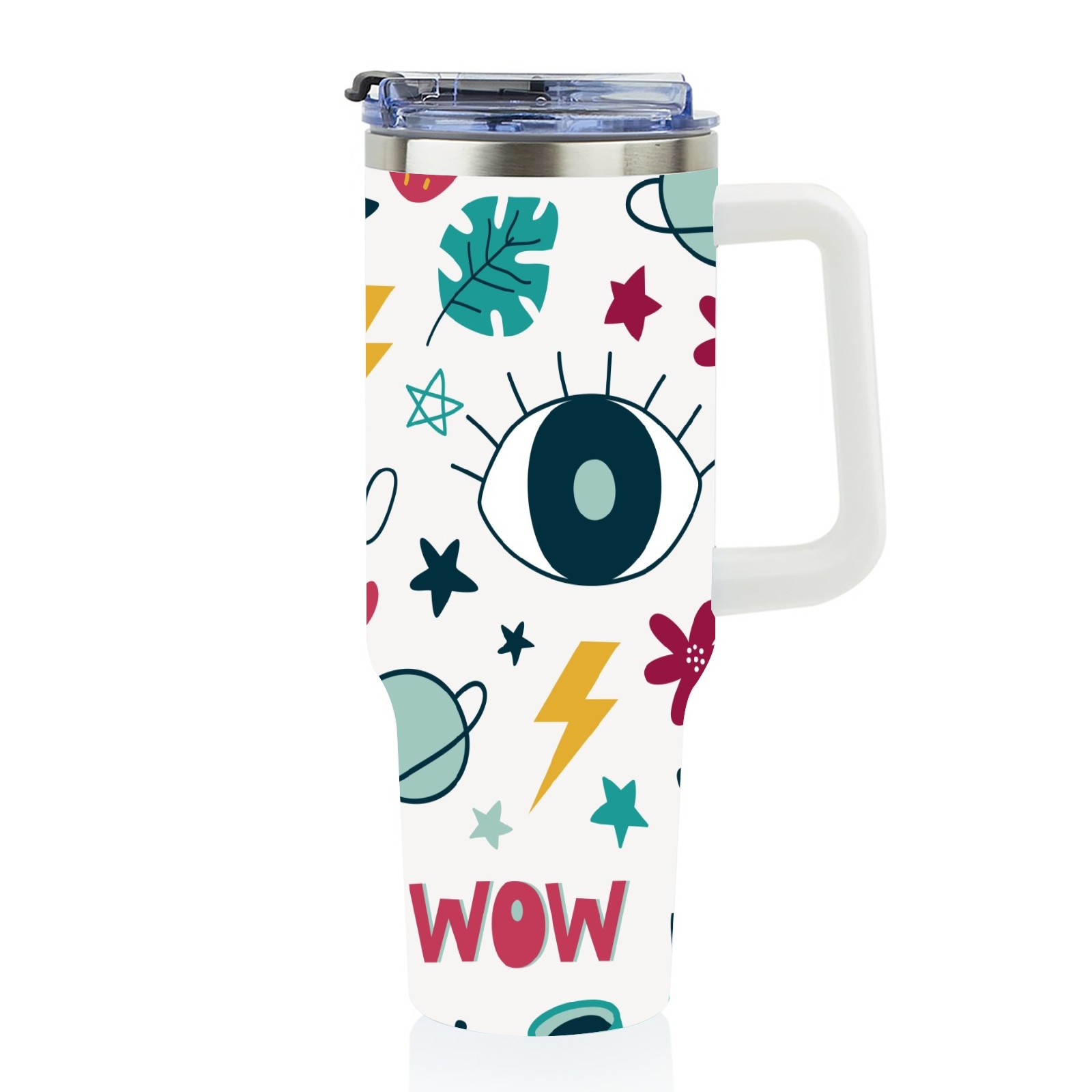 40oz Wow Eye thermos with lid and straw, leak-proof stainless steel, with handle, spill-proof bottle, convenient for travel(pink)