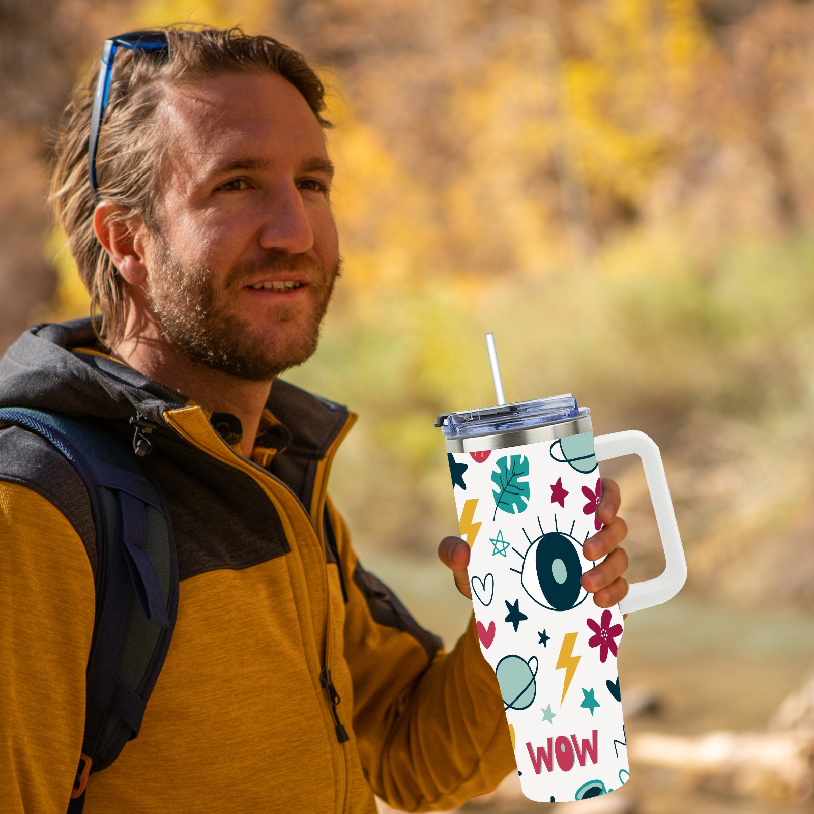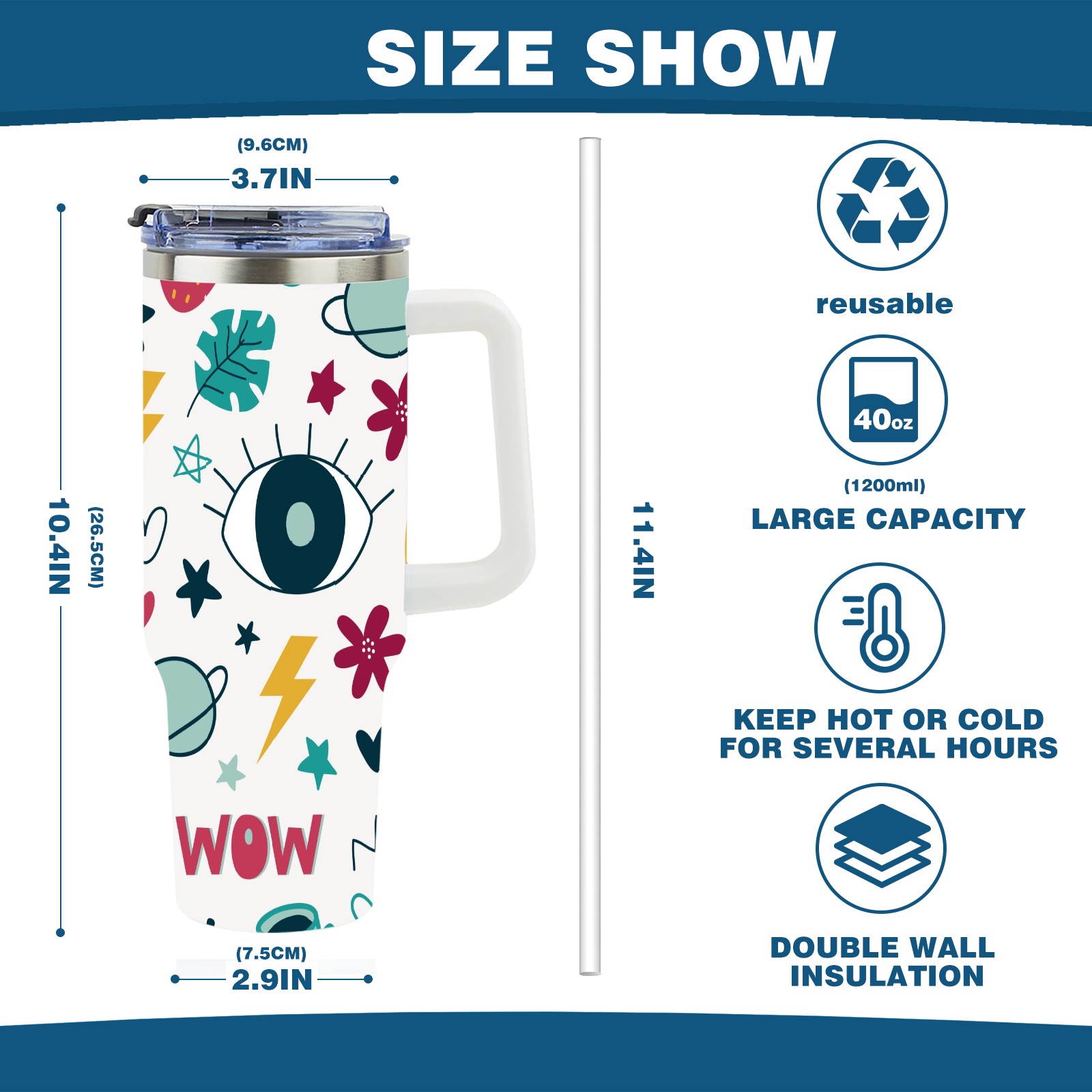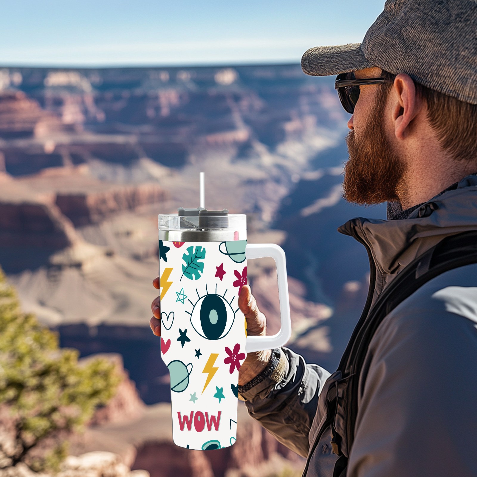 40oz Wow Eye thermos with lid and straw, leak-proof stainless steel, with handle, spill-proof bottle, convenient for travel(pink)