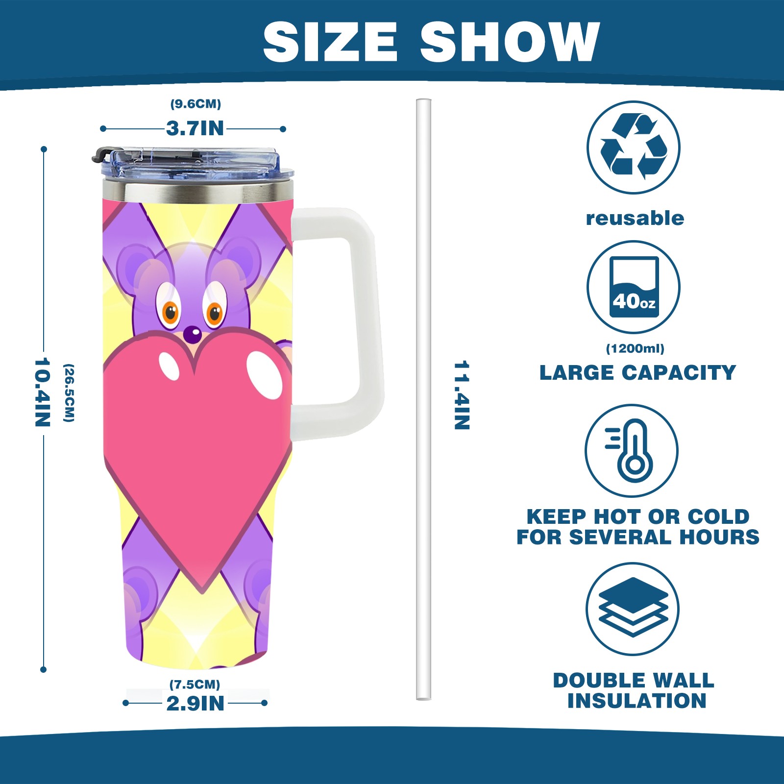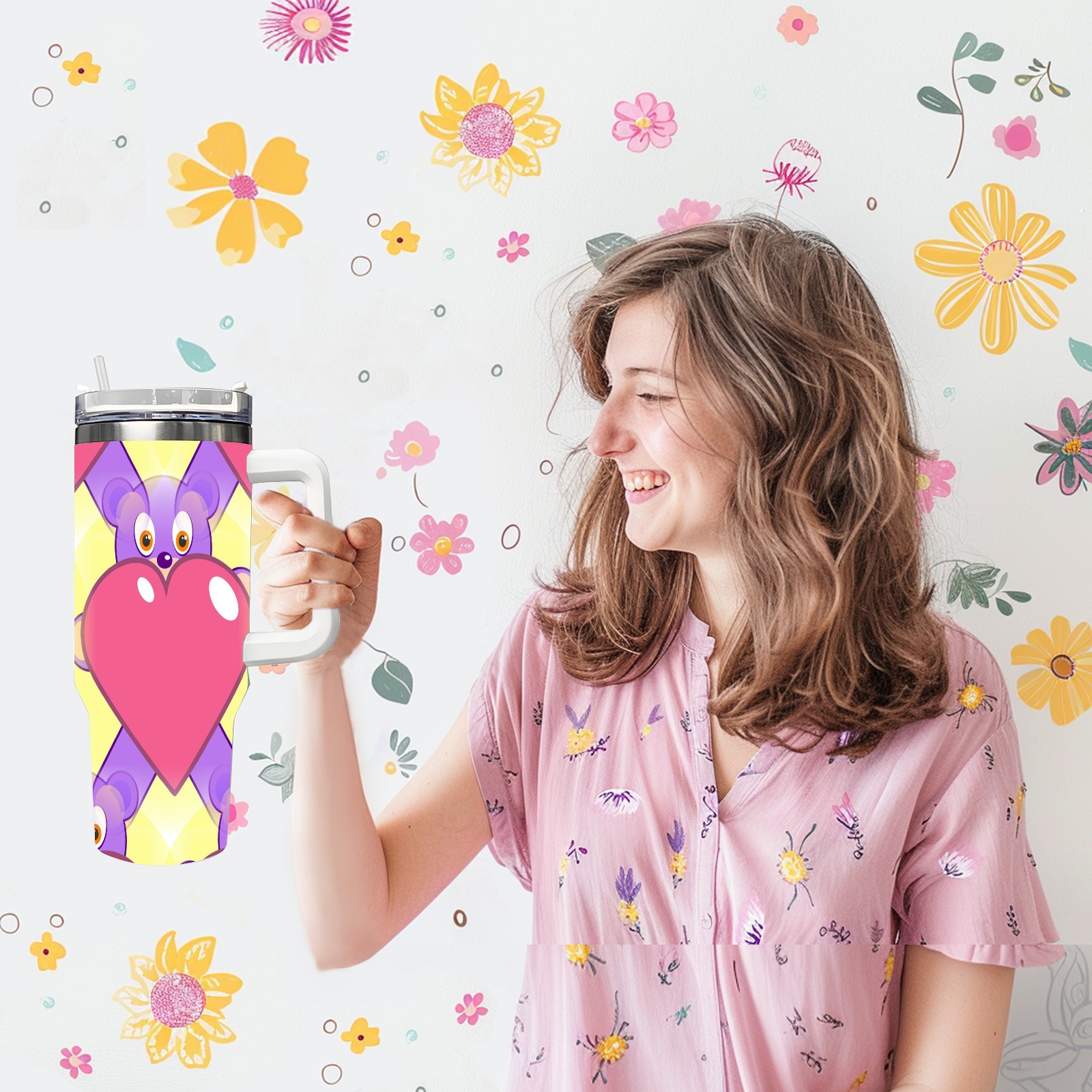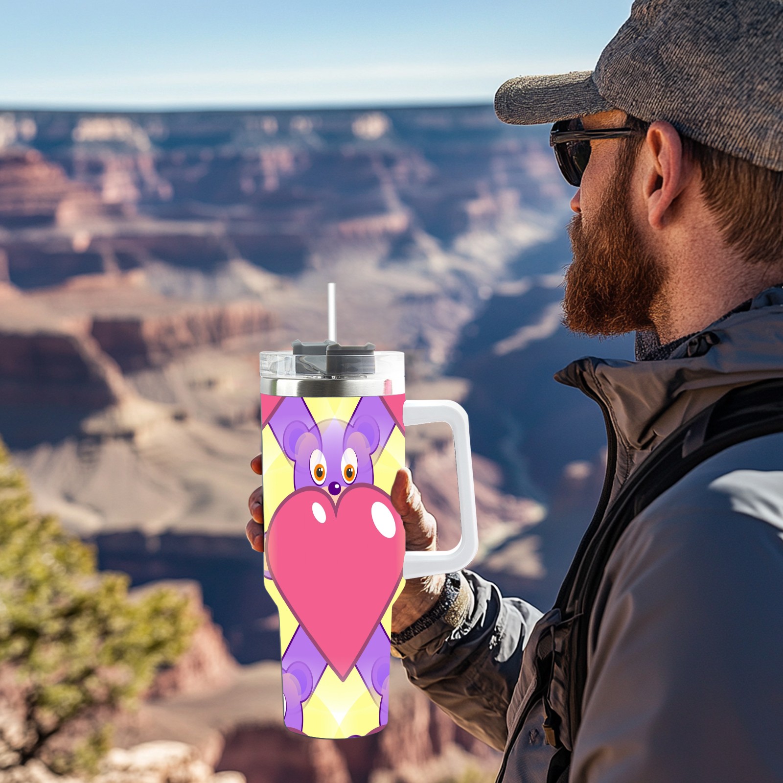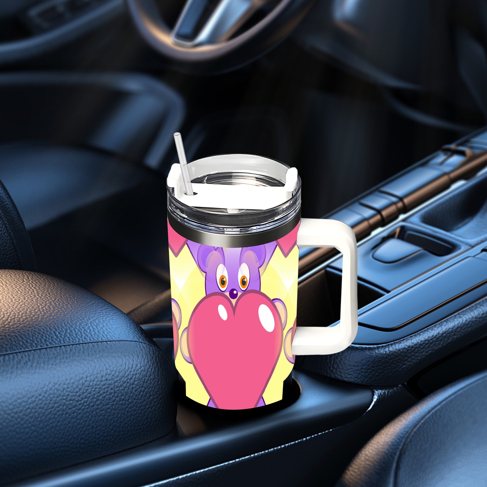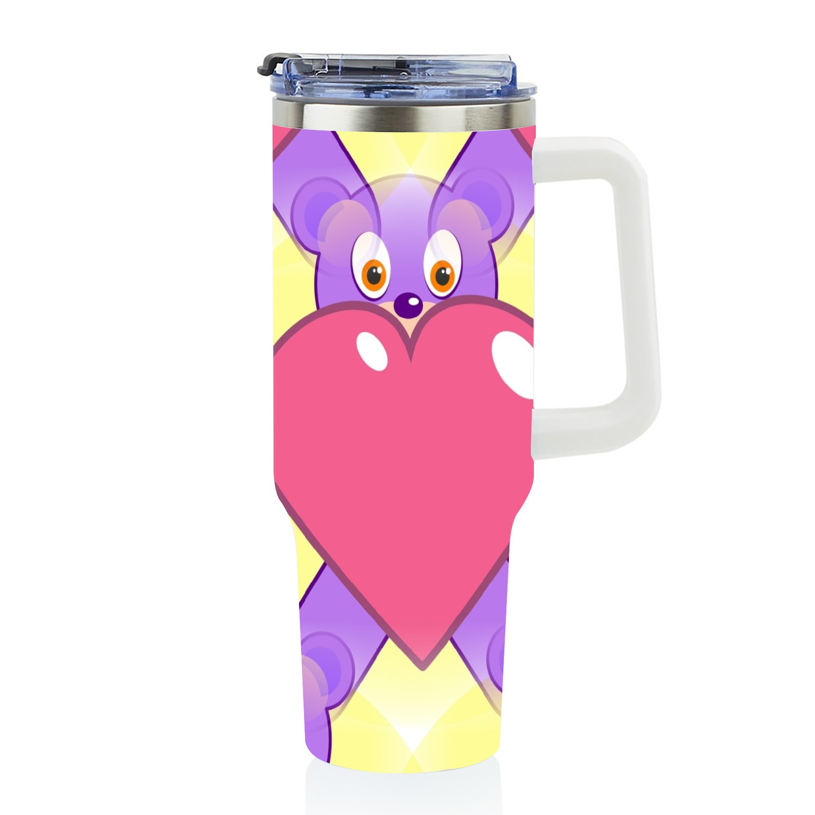 40oz Heart Bear thermos with lid and straw, leak-proof stainless steel, with handle, spill-proof bottle, convenient for travel(pink)