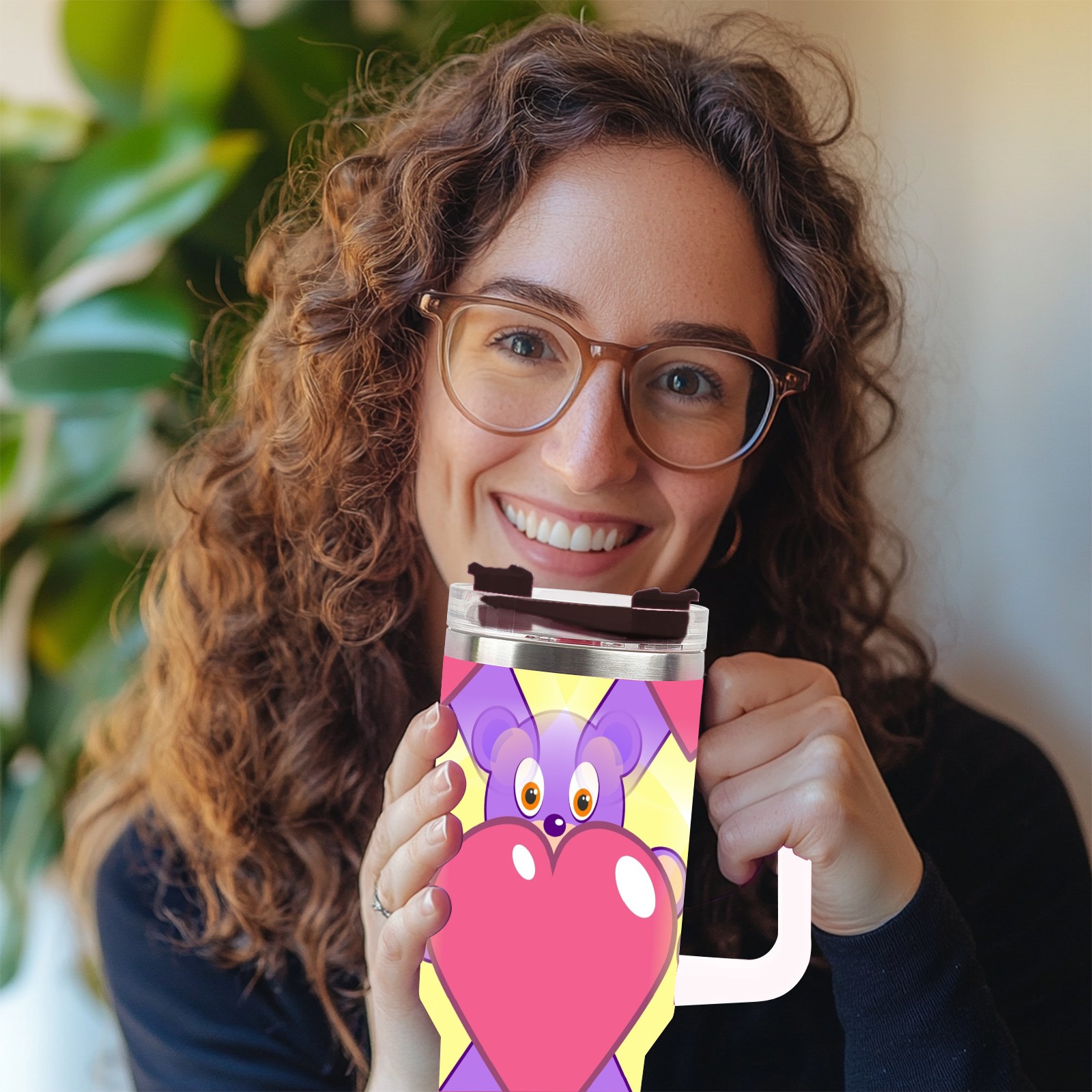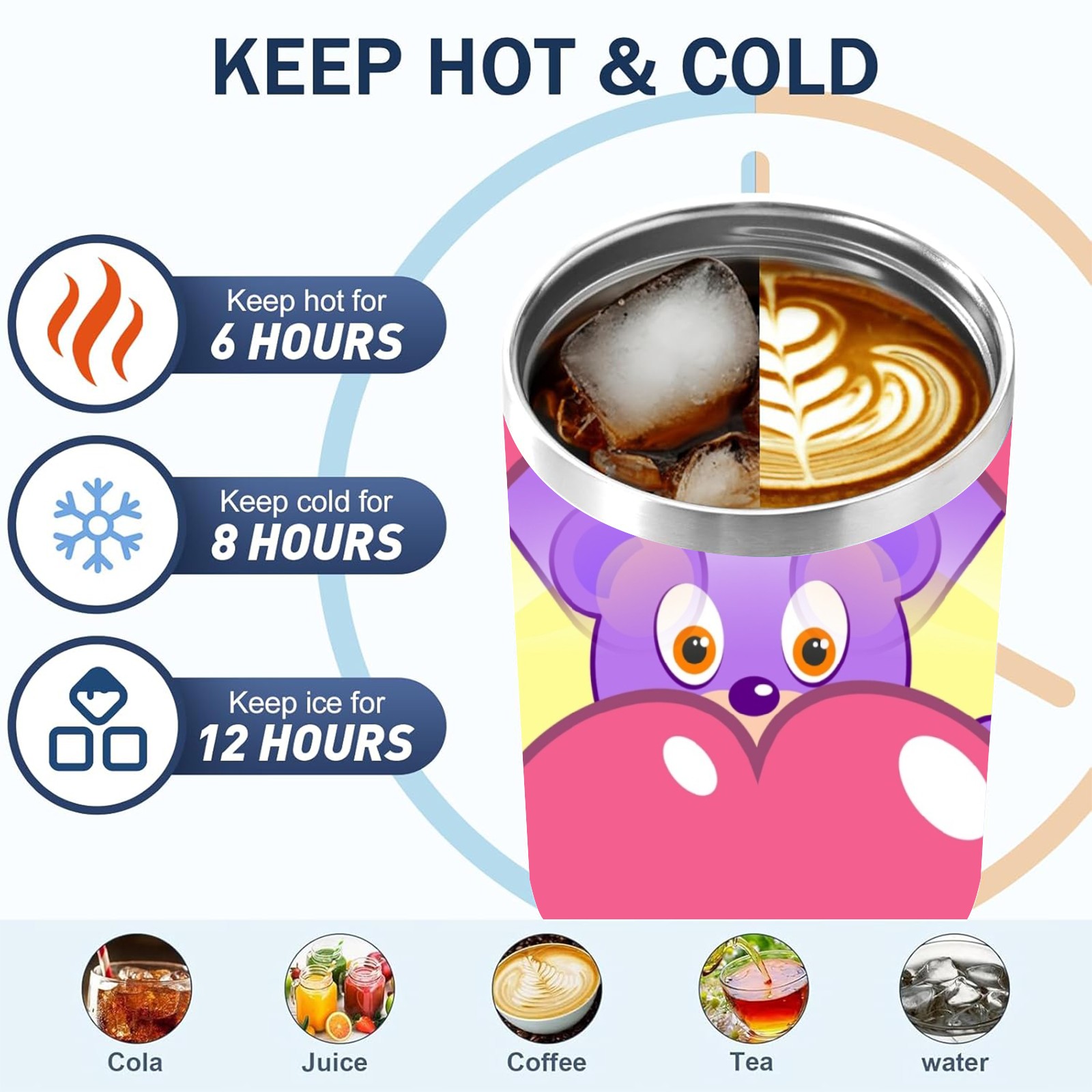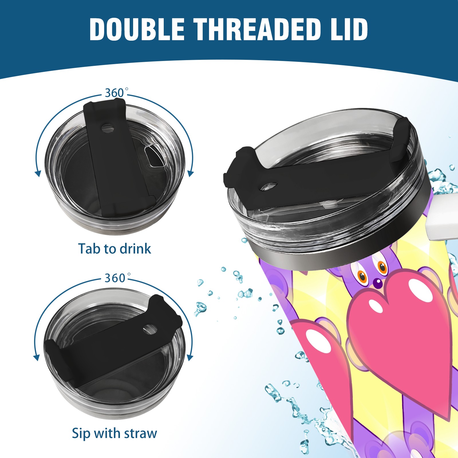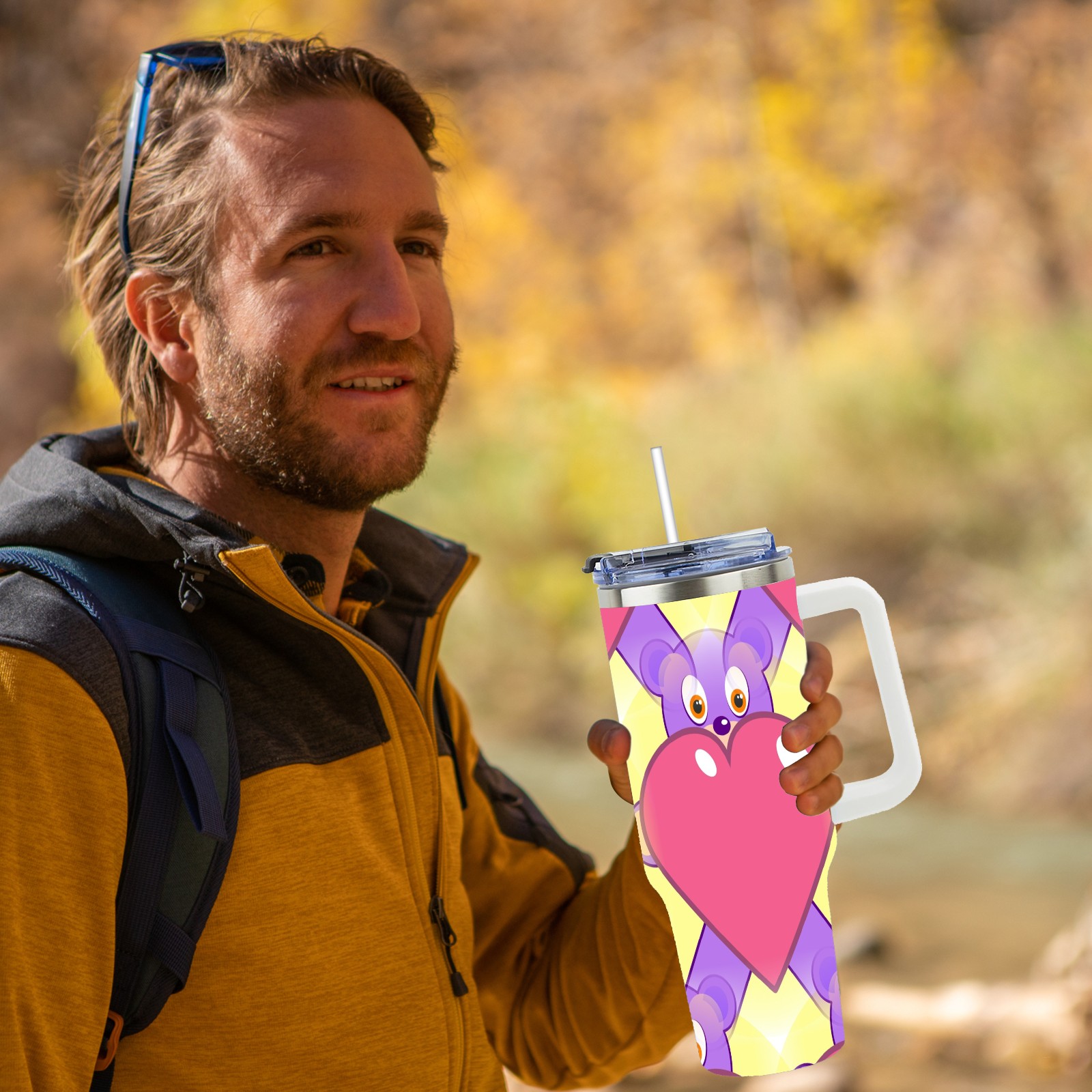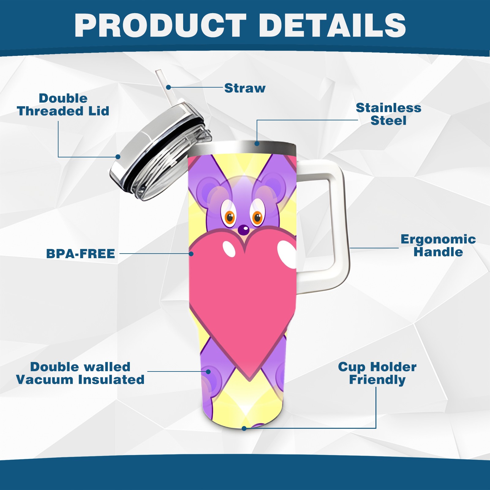 40oz Heart Bear thermos with lid and straw, leak-proof stainless steel, with handle, spill-proof bottle, convenient for travel(pink)