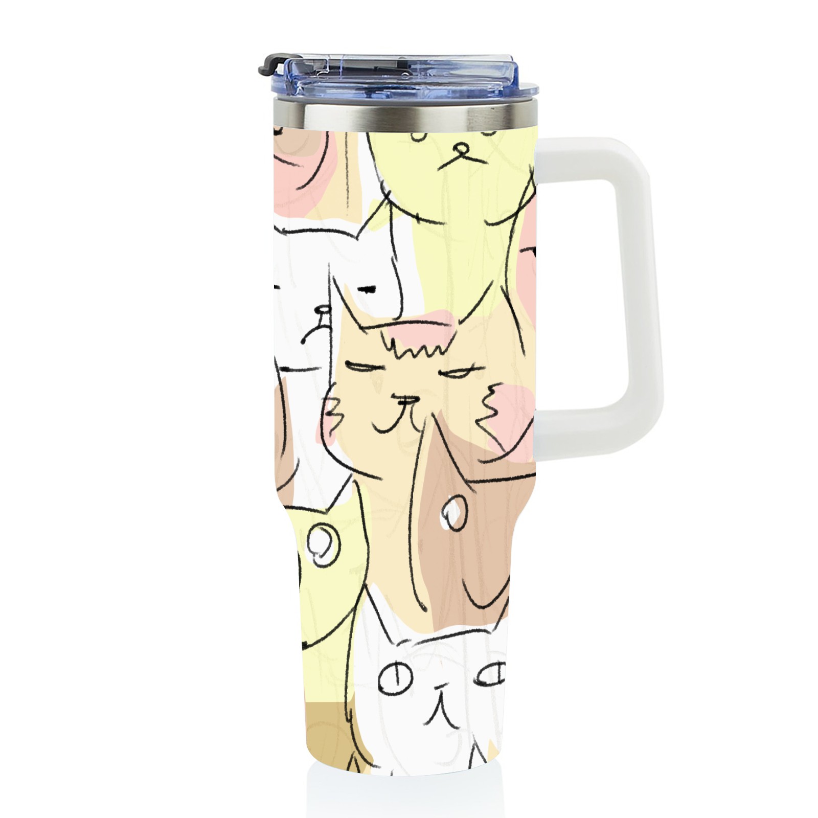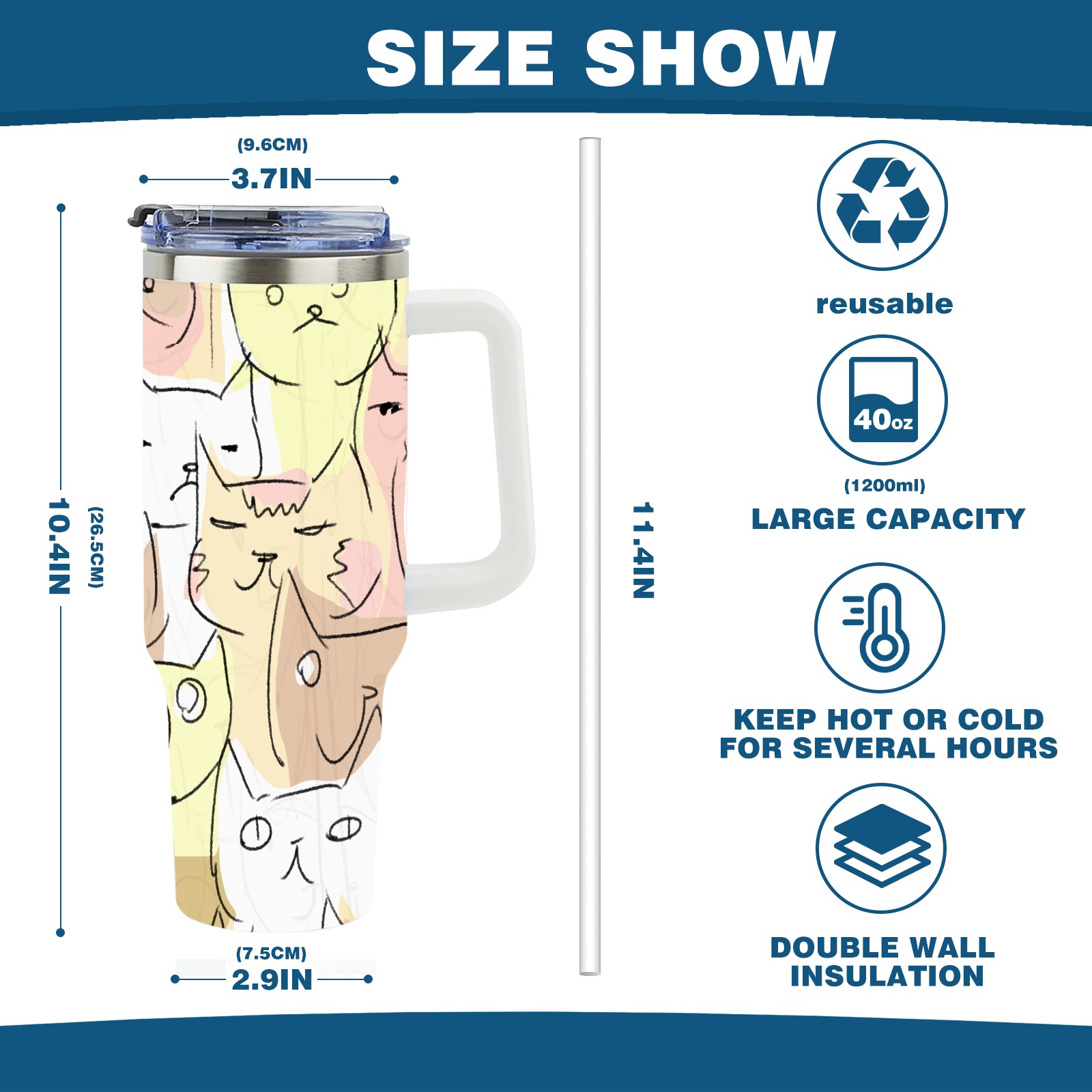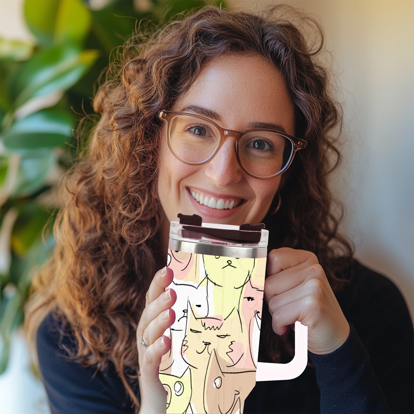 40oz Abstract Cat thermos with lid and straw, leak-proof stainless steel, with handle, spill-proof bottle, convenient for travel(pink)