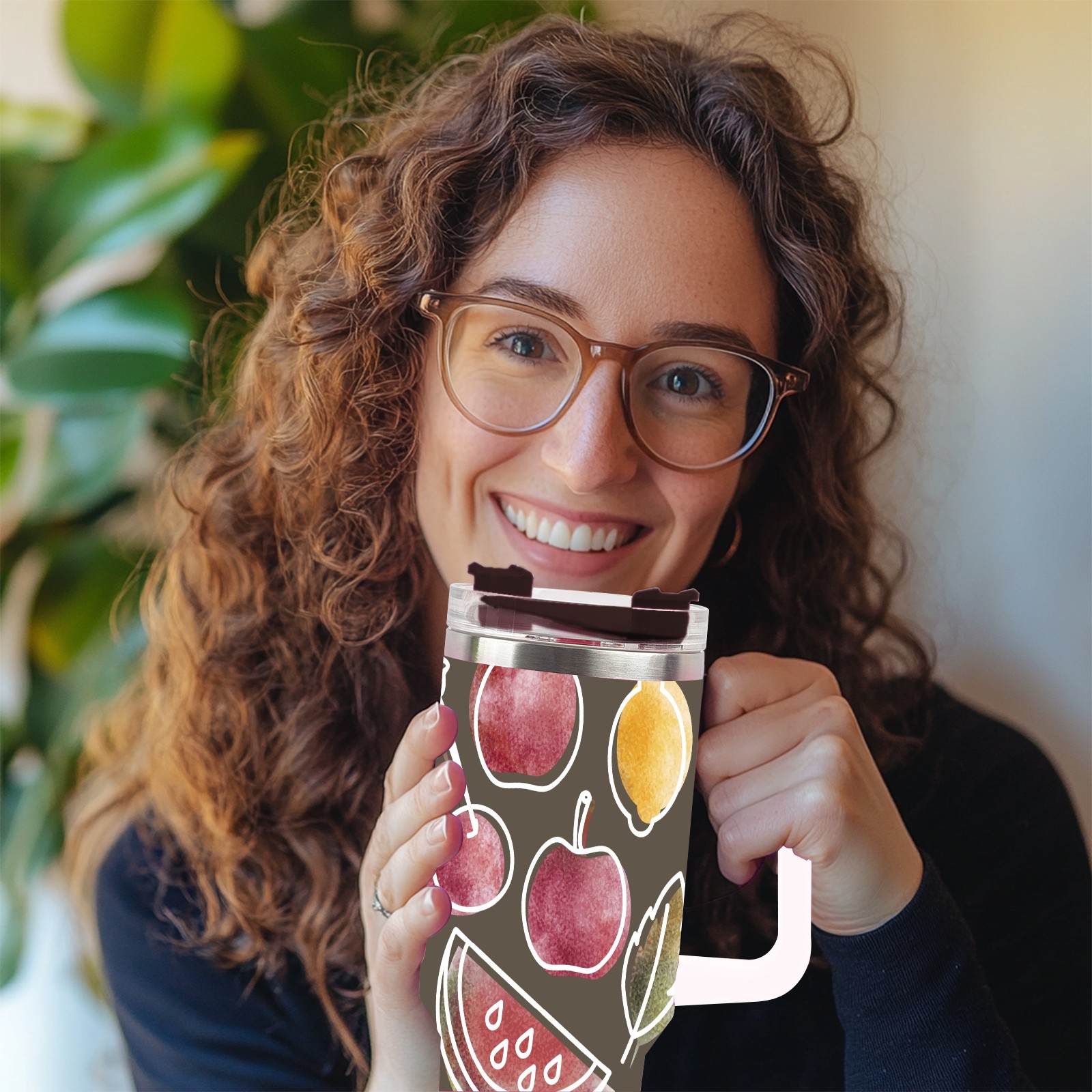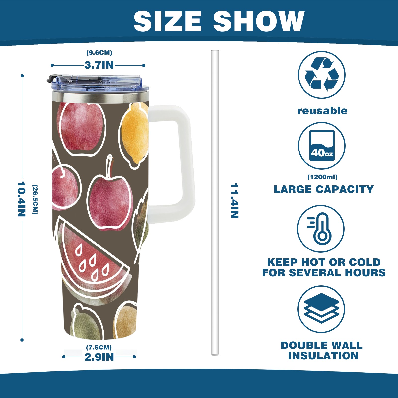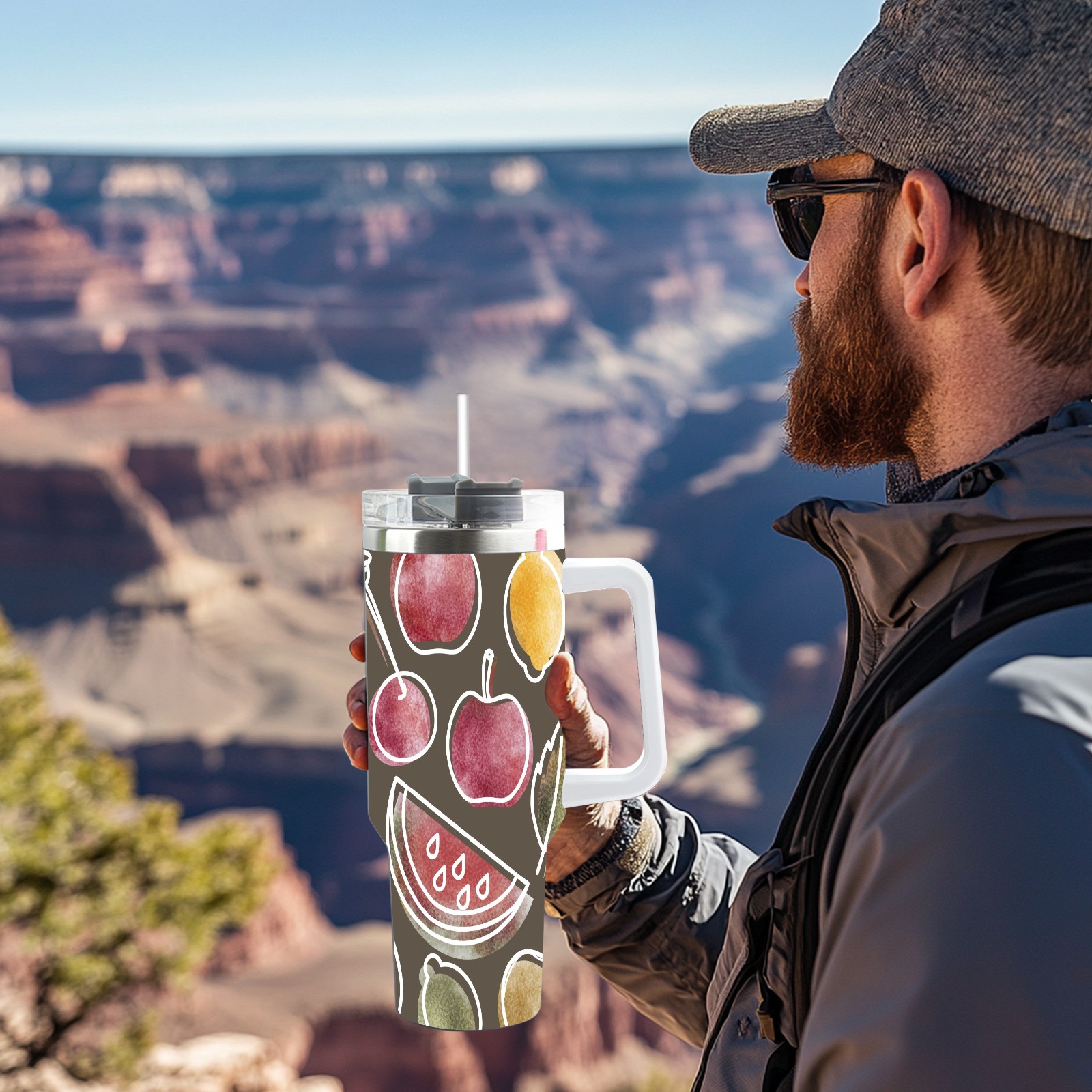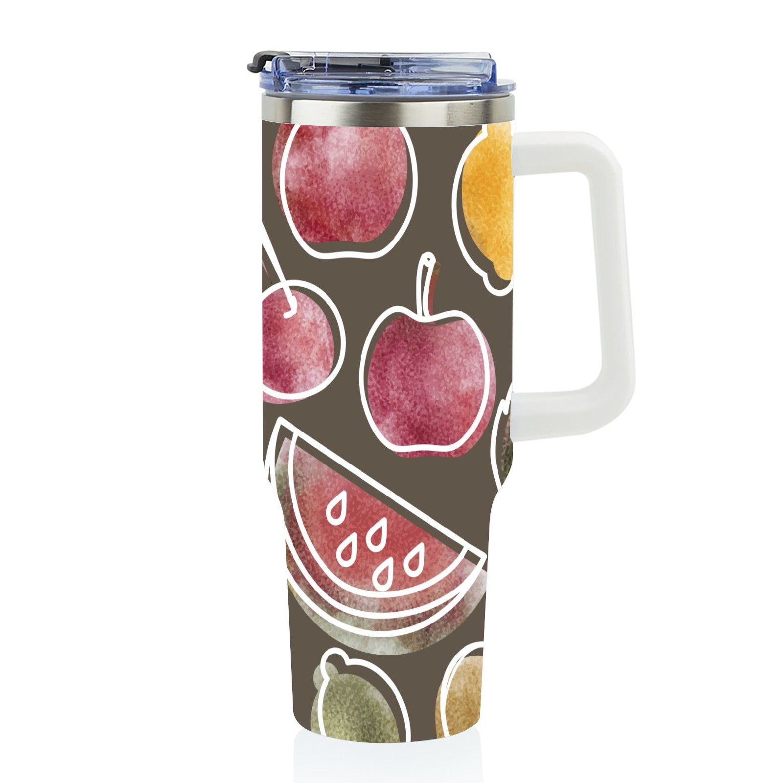 40oz Art Fruits thermos with lid and straw, leak-proof stainless steel, with handle, spill-proof bottle, convenient for travel(pink)