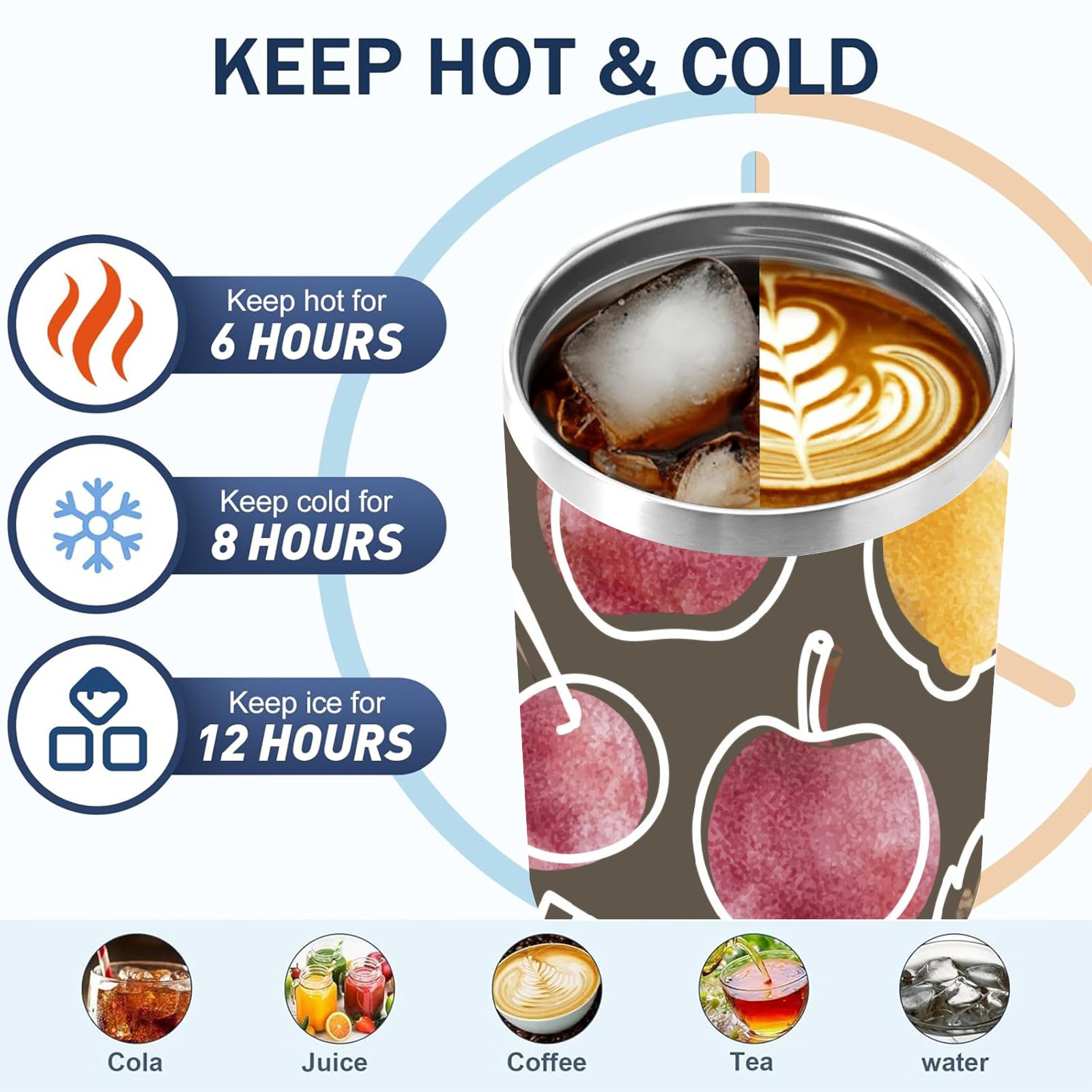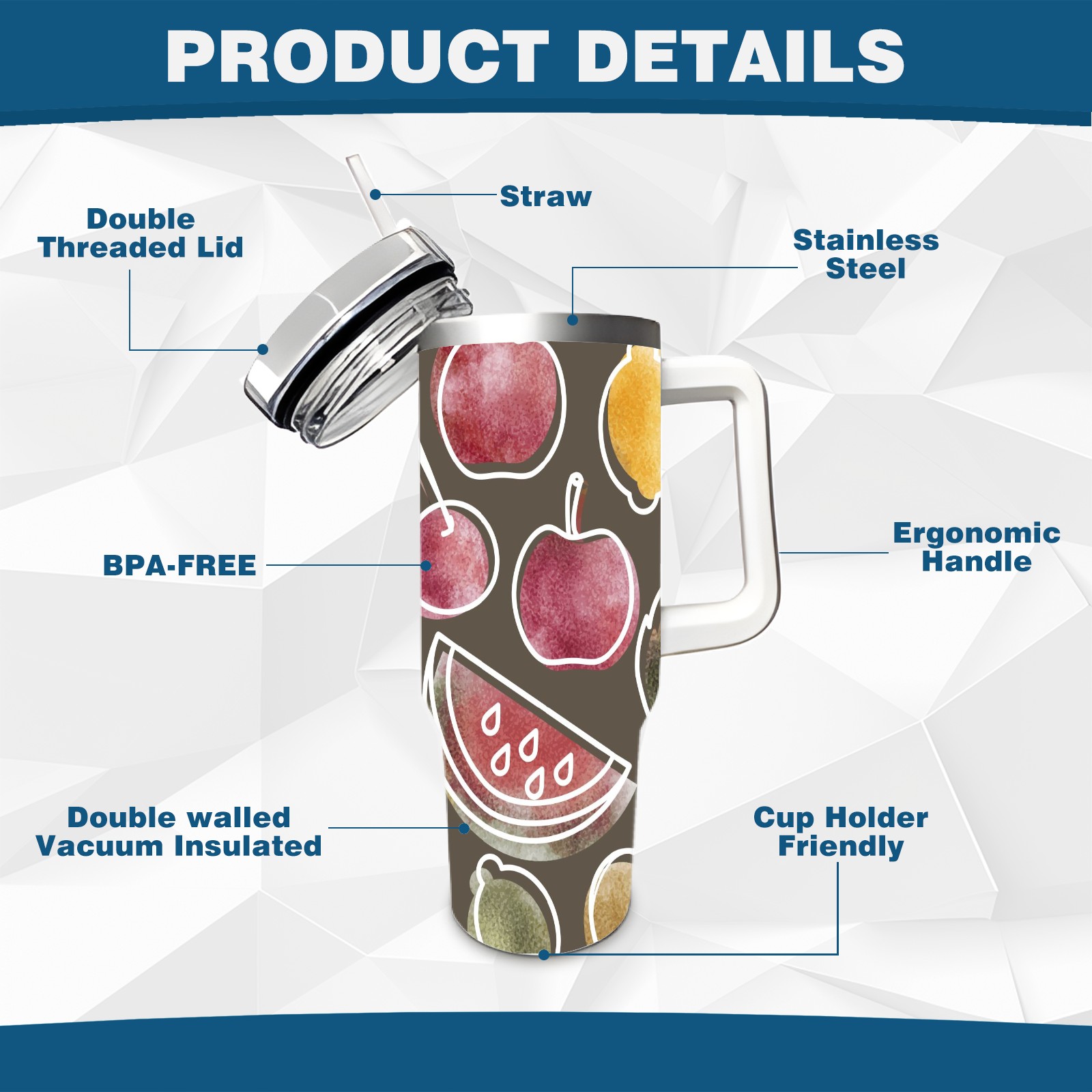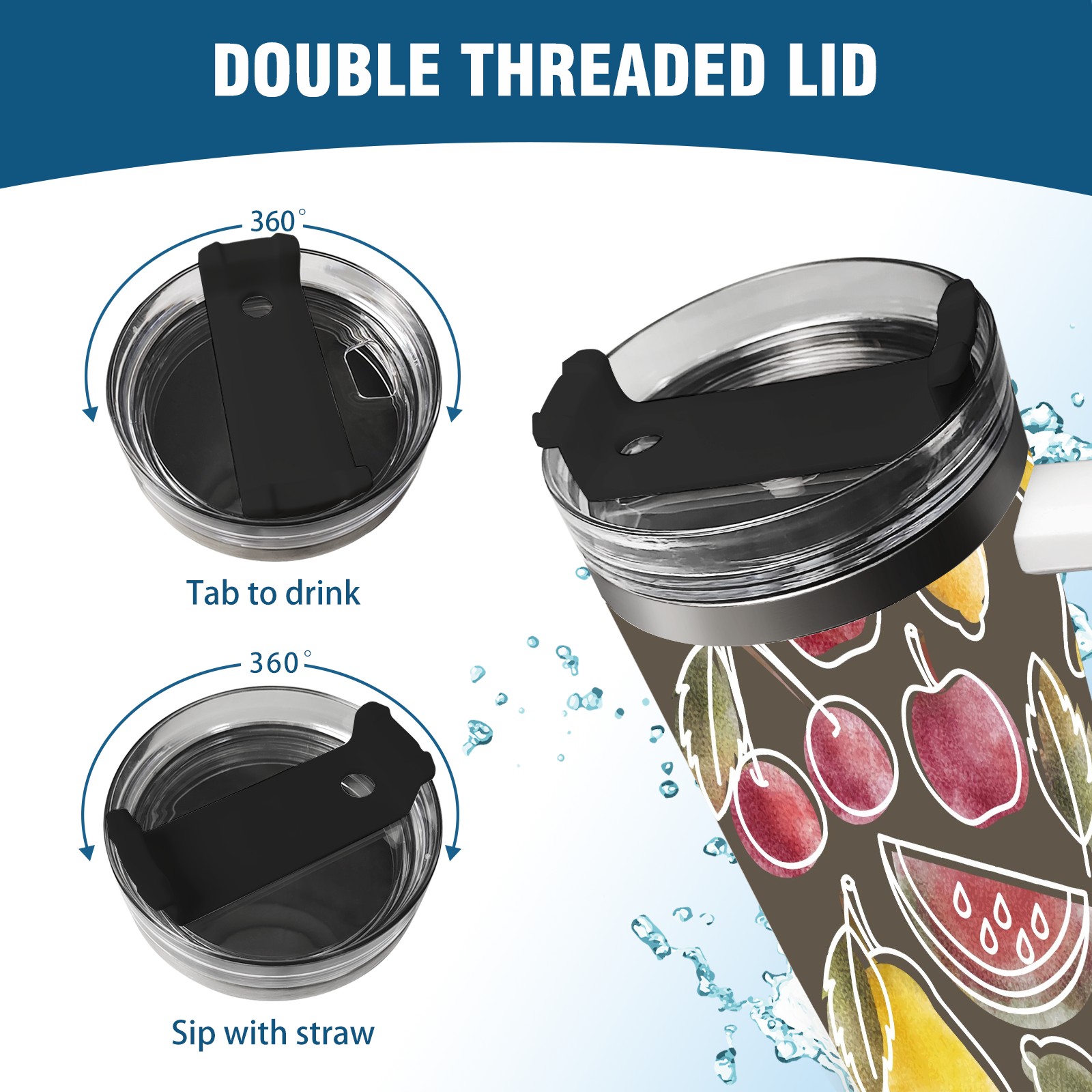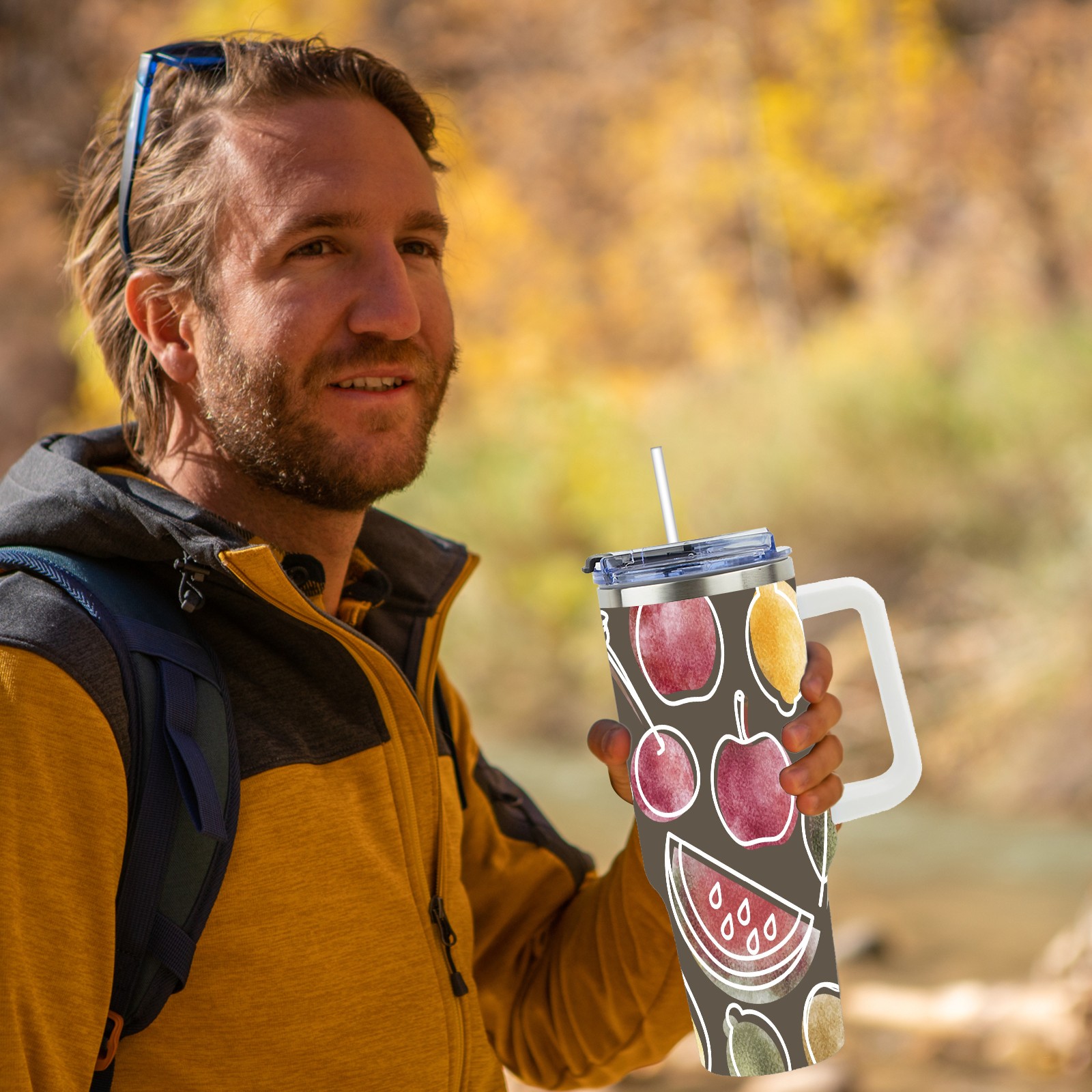 40oz Art Fruits thermos with lid and straw, leak-proof stainless steel, with handle, spill-proof bottle, convenient for travel(pink)
