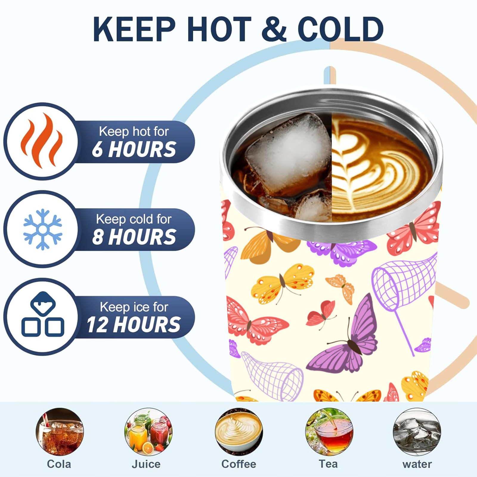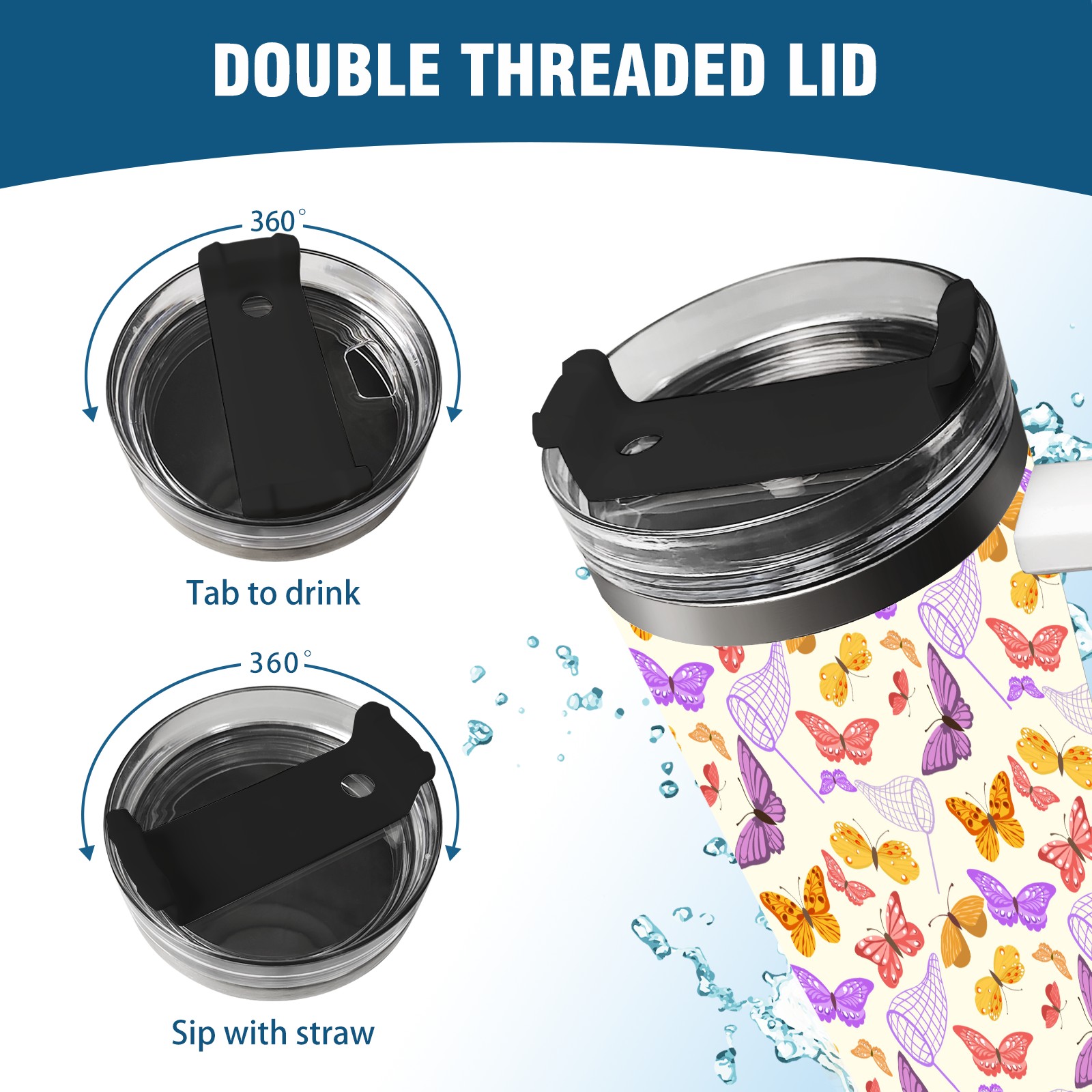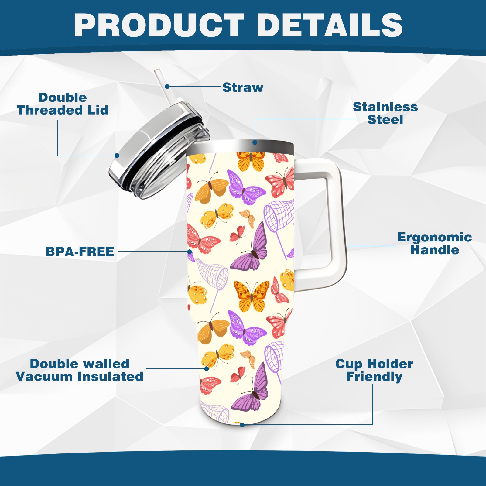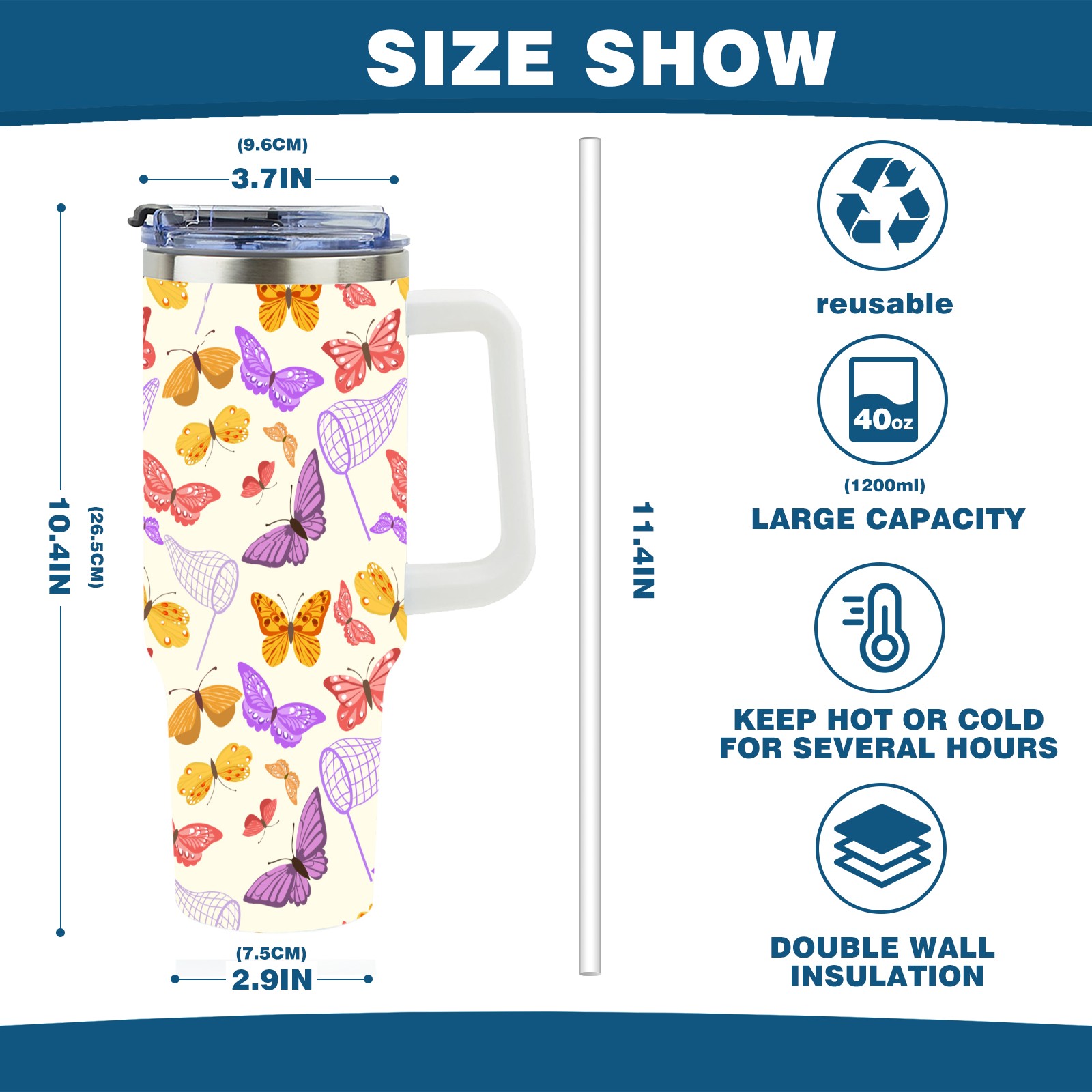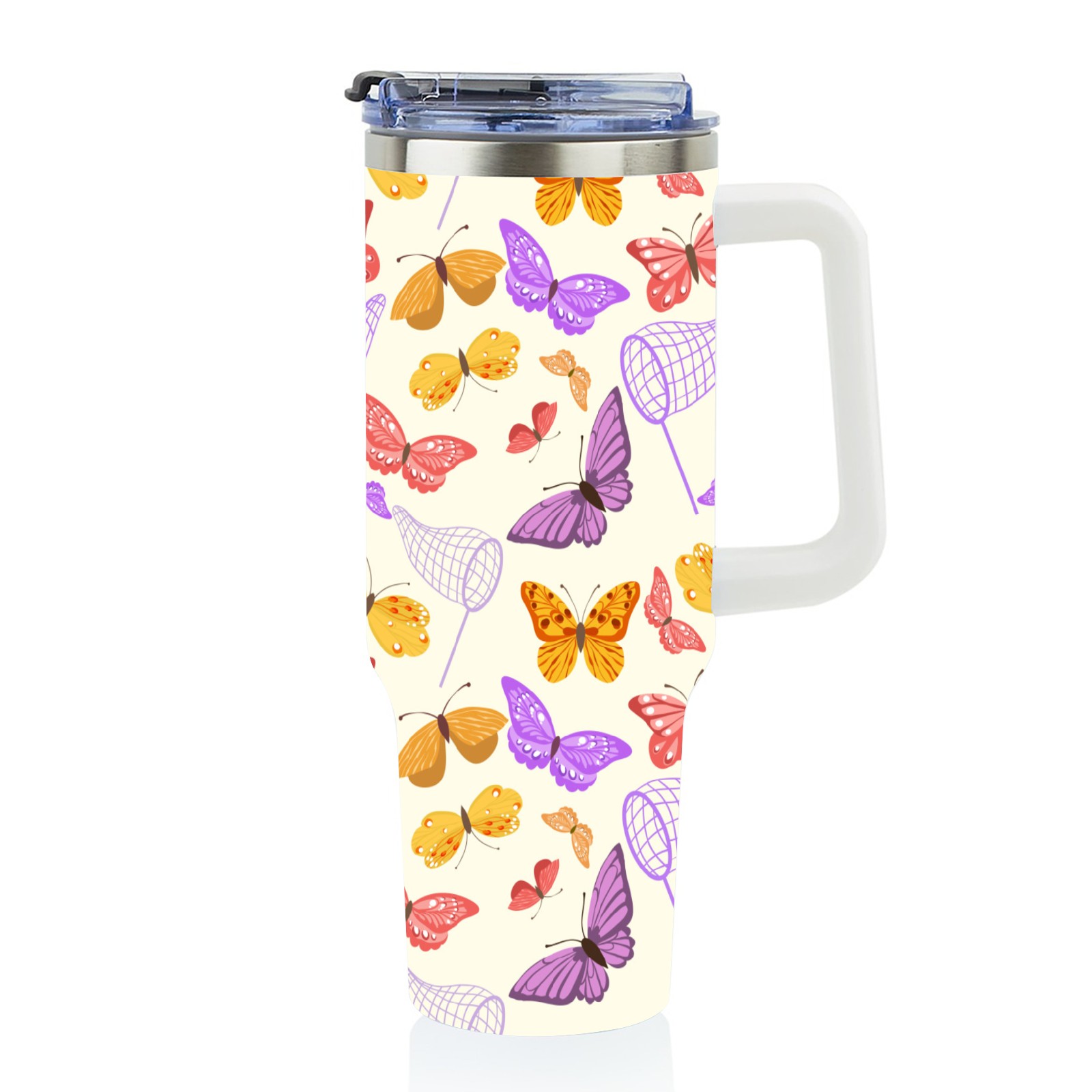 40oz Butterfly Pattern thermos with lid and straw, leak-proof stainless steel, with handle, spill-proof bottle, convenient for travel(pink)