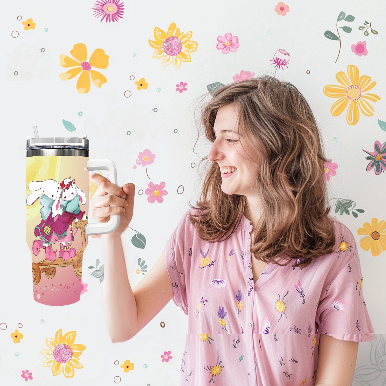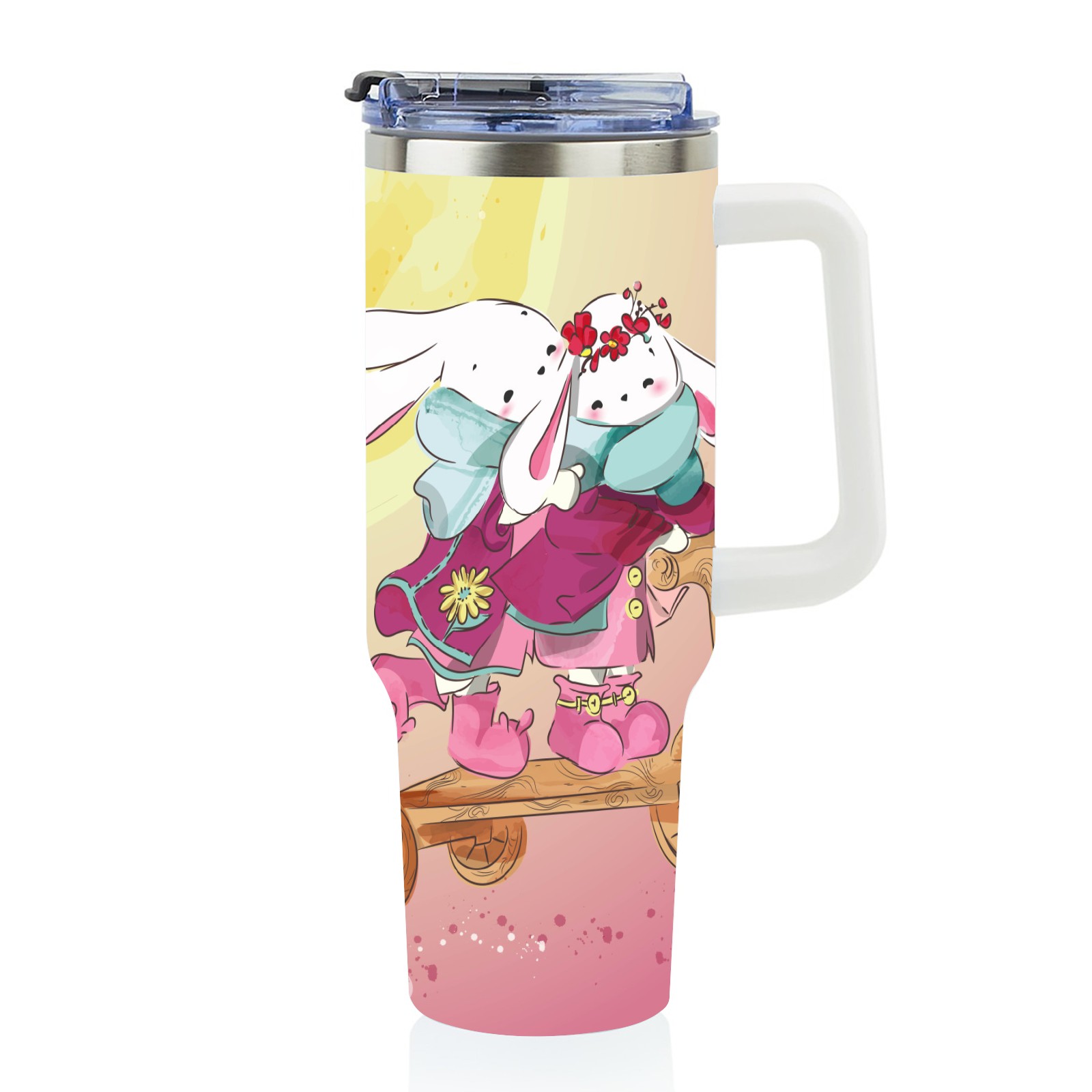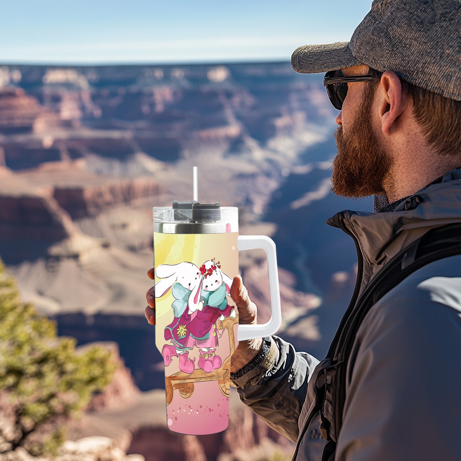 40oz Cute Animal thermos with lid and straw, leak-proof stainless steel, with handle, spill-proof bottle, convenient for travel(pink)