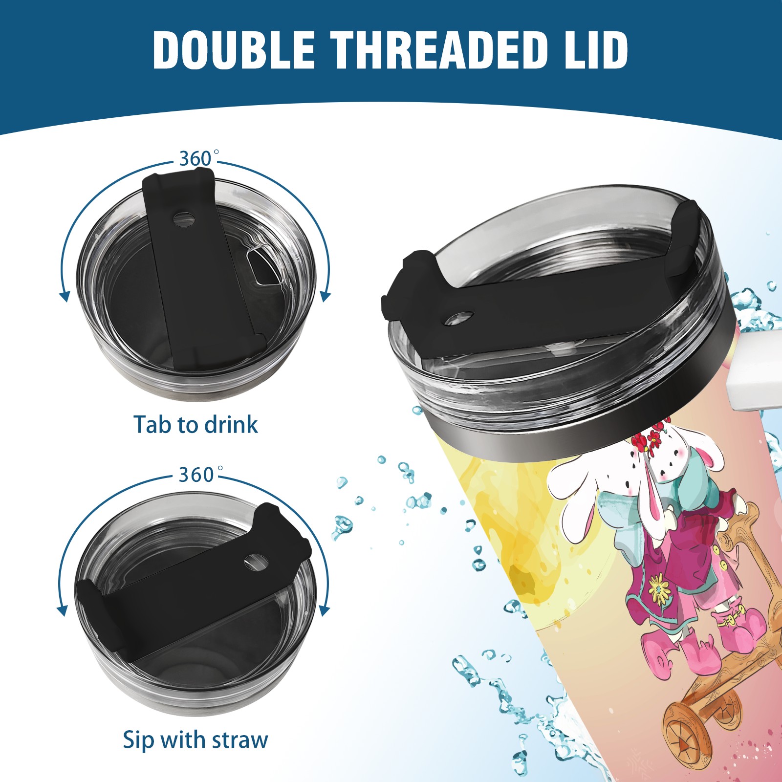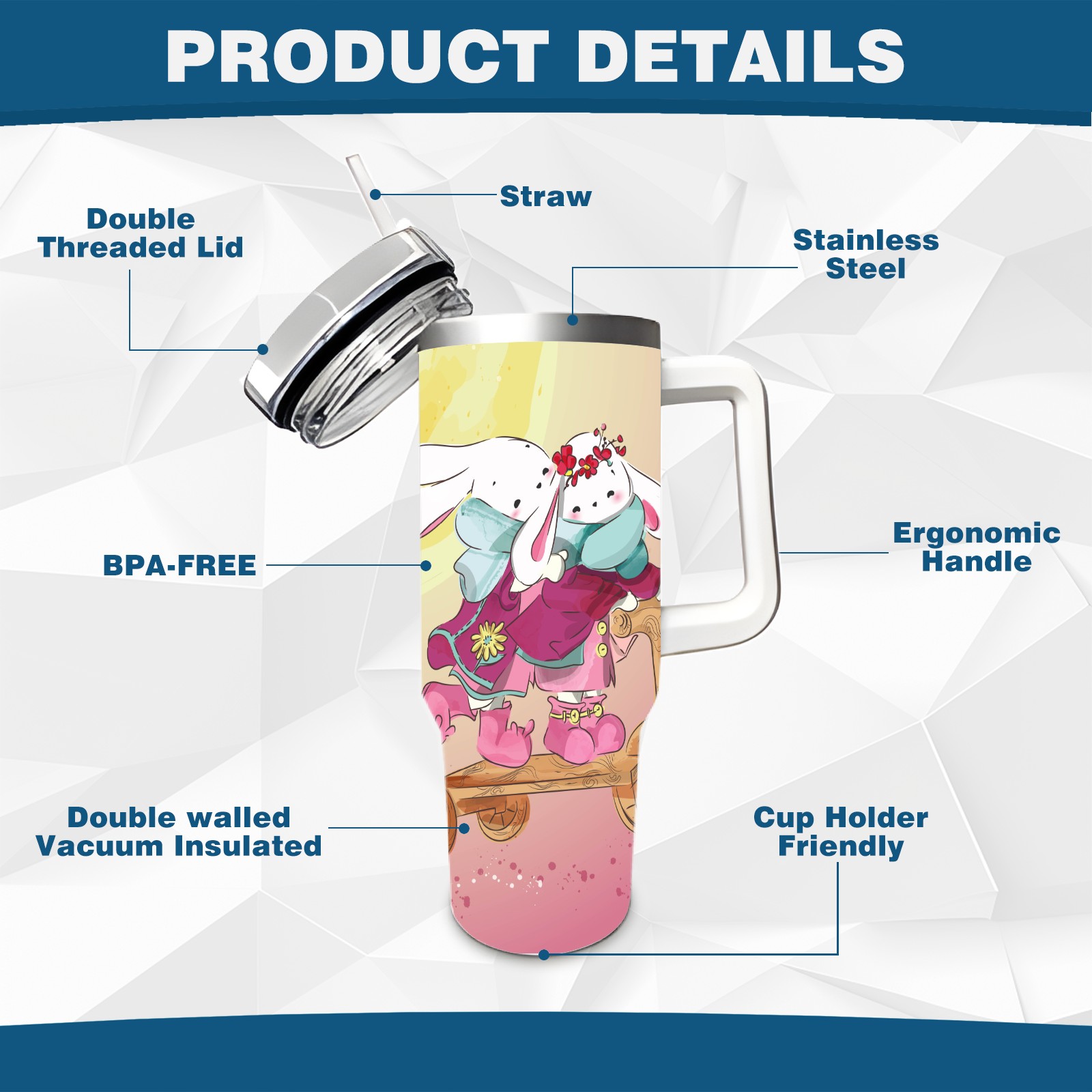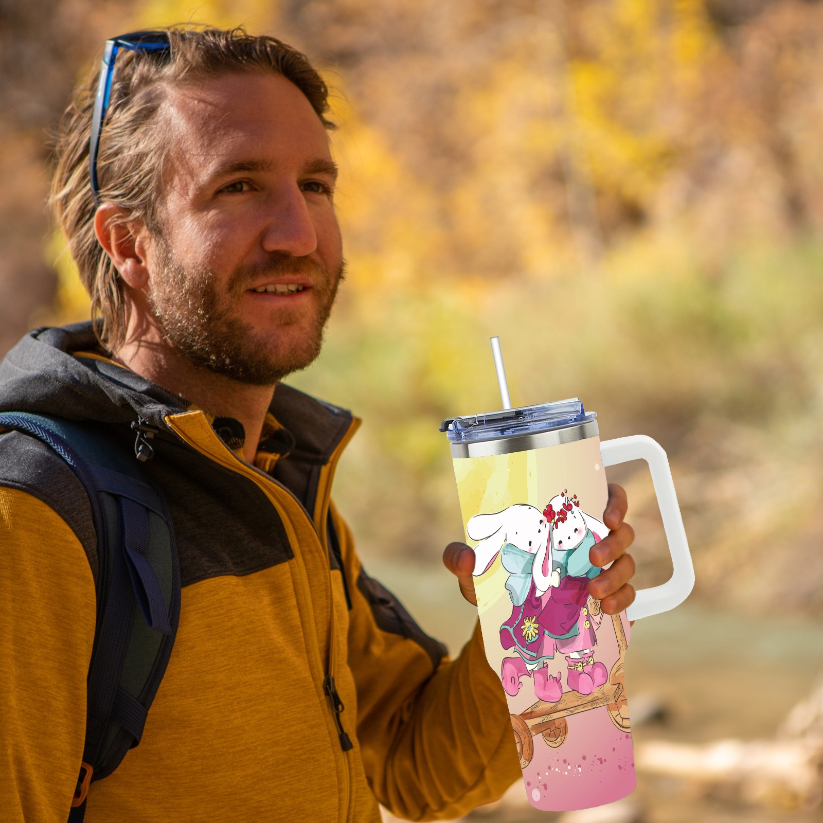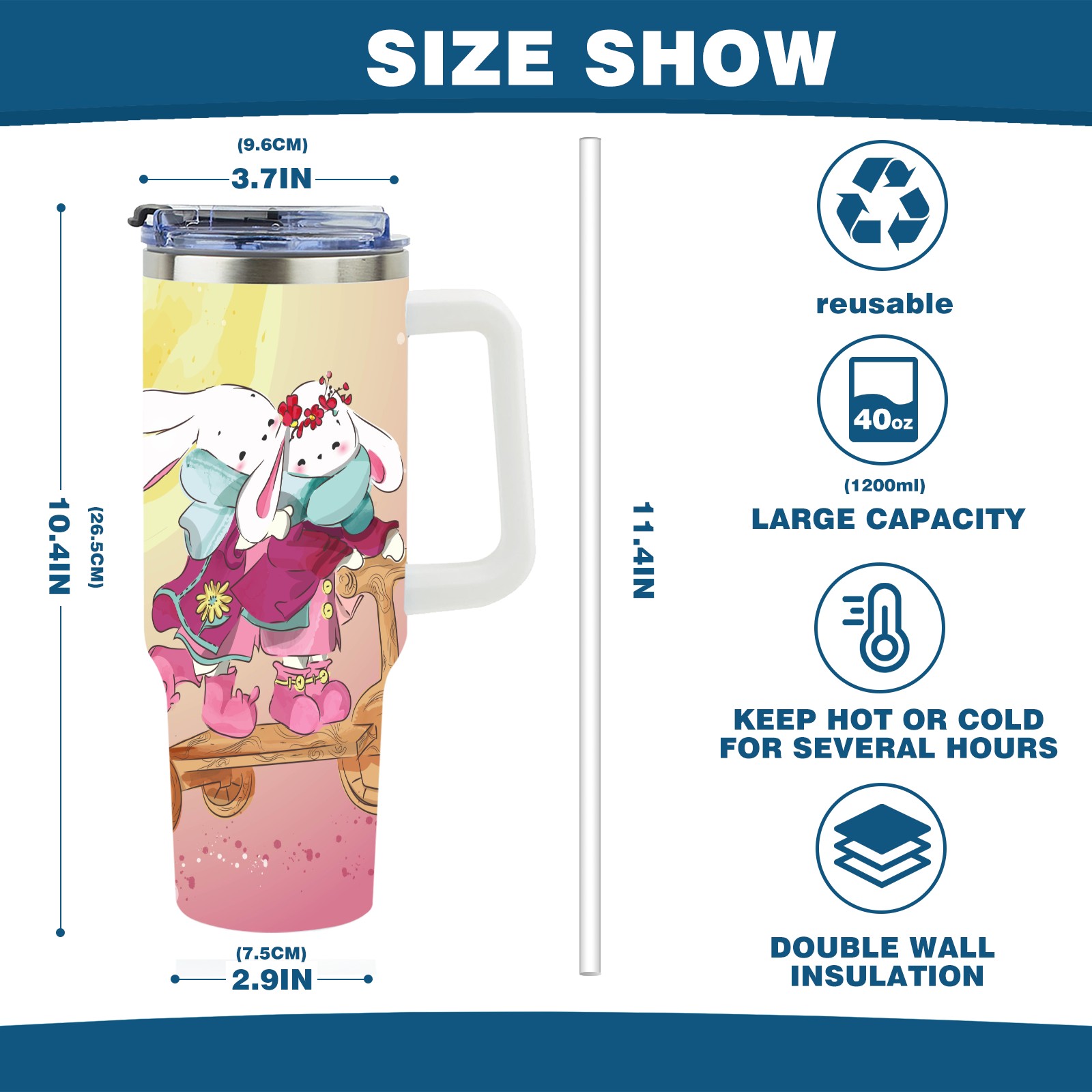 40oz Cute Animal thermos with lid and straw, leak-proof stainless steel, with handle, spill-proof bottle, convenient for travel(pink)