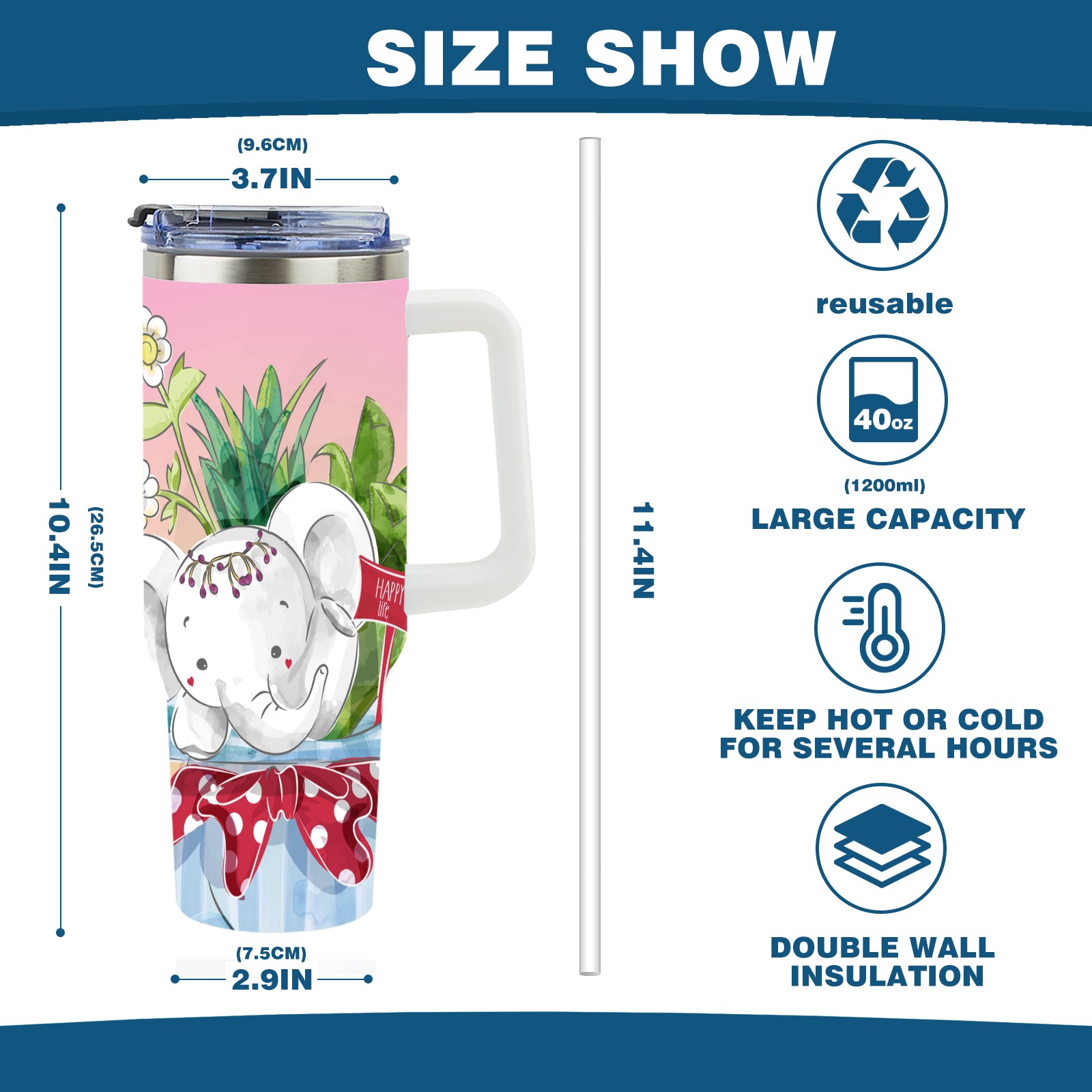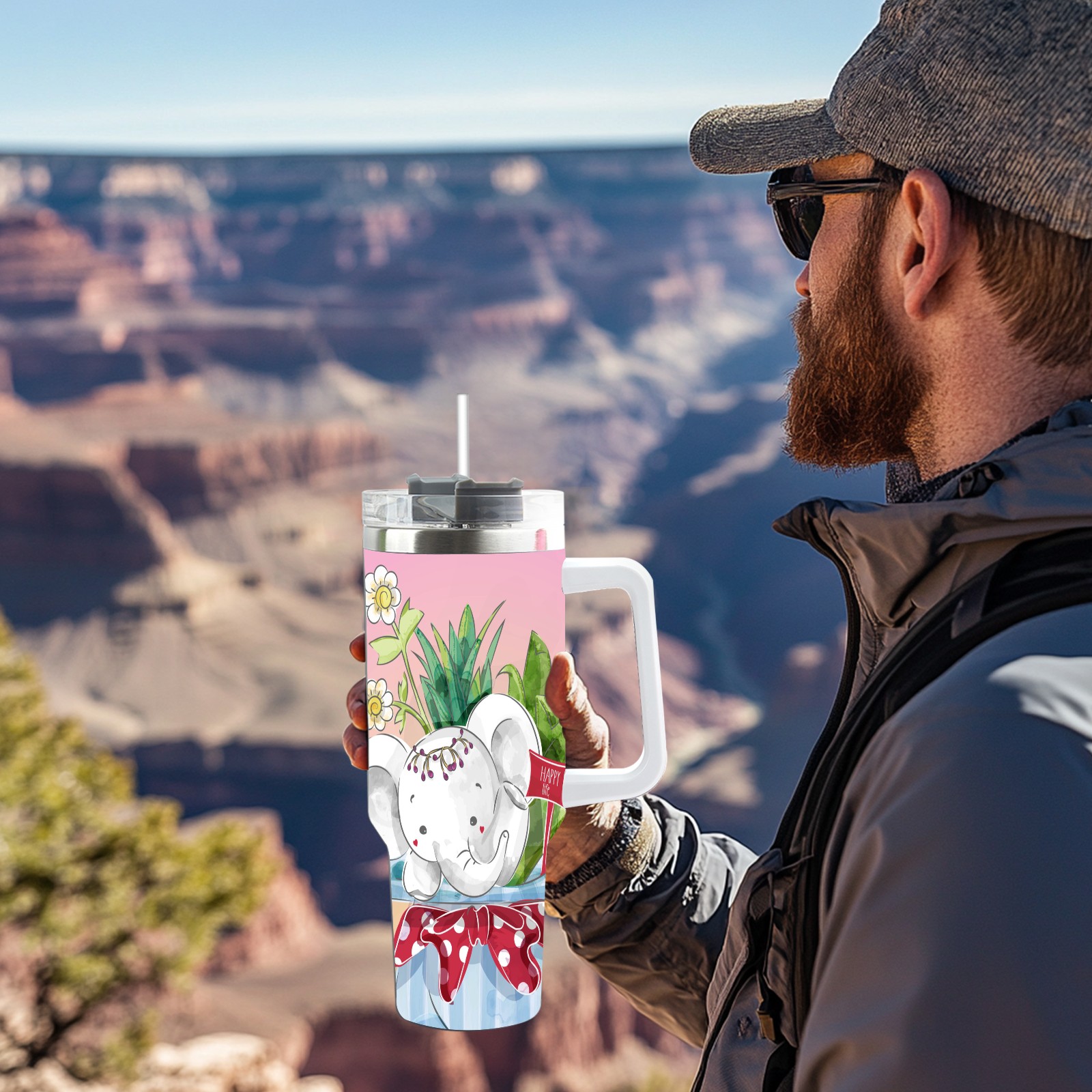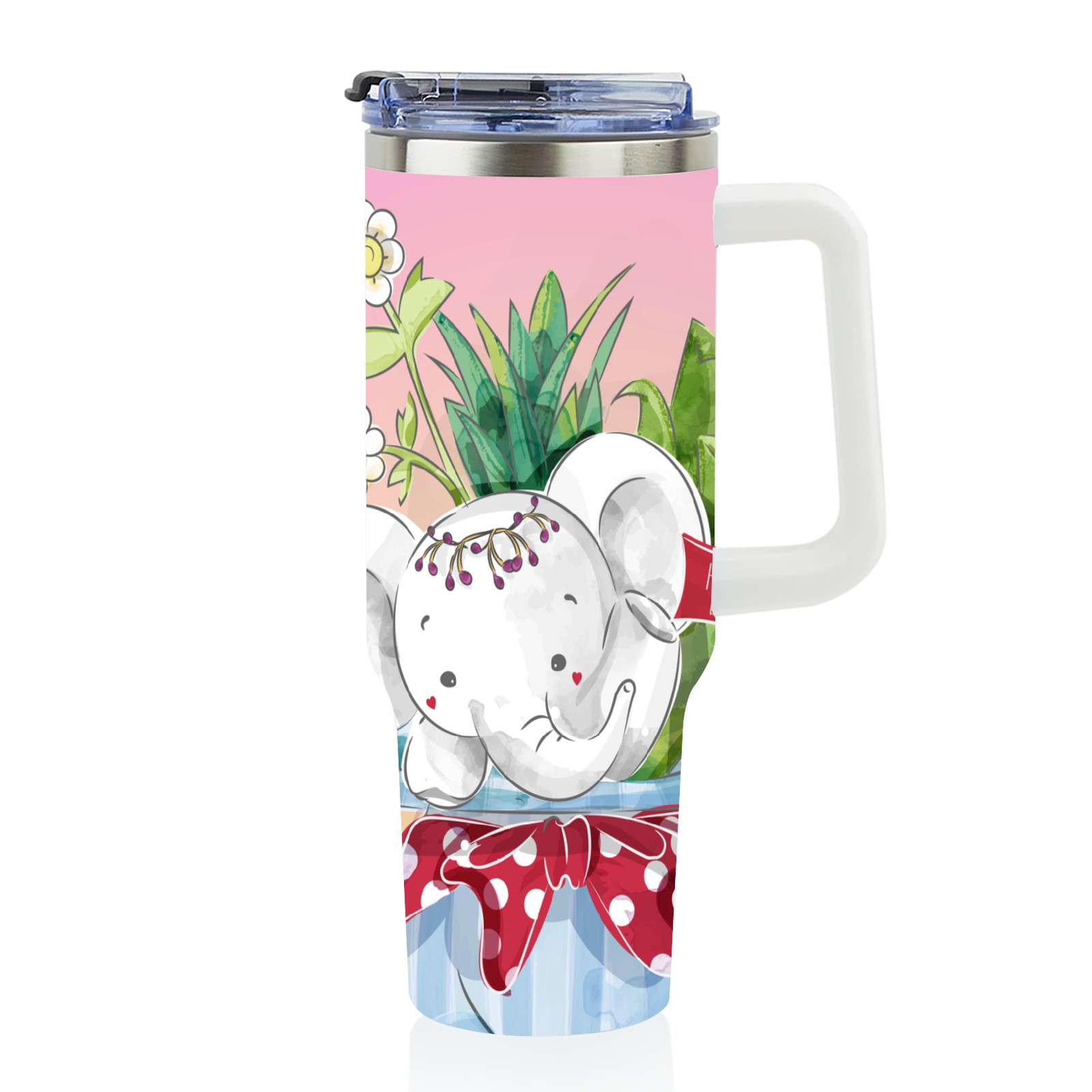 40oz Cute Elephant thermos with lid and straw, leak-proof stainless steel, with handle, spill-proof bottle, convenient for travel(pink)