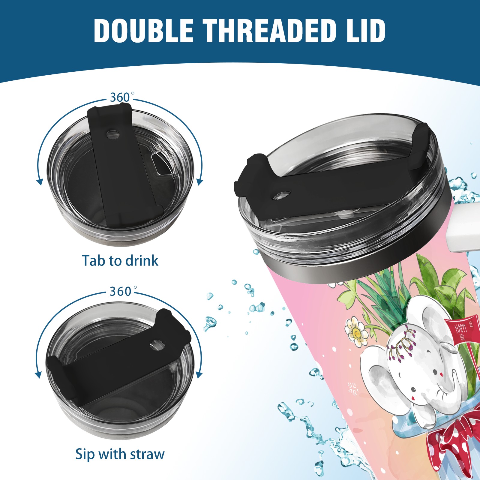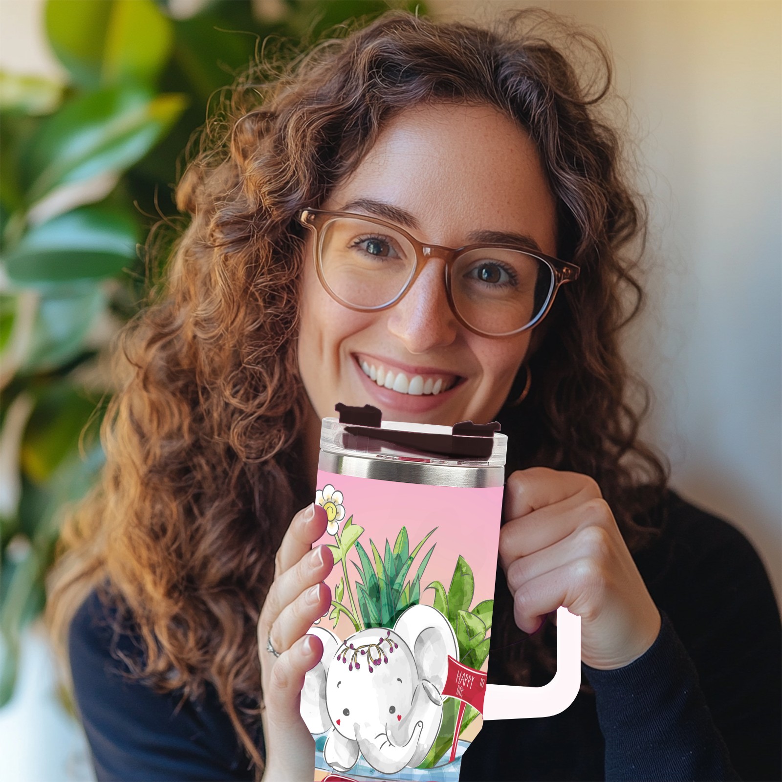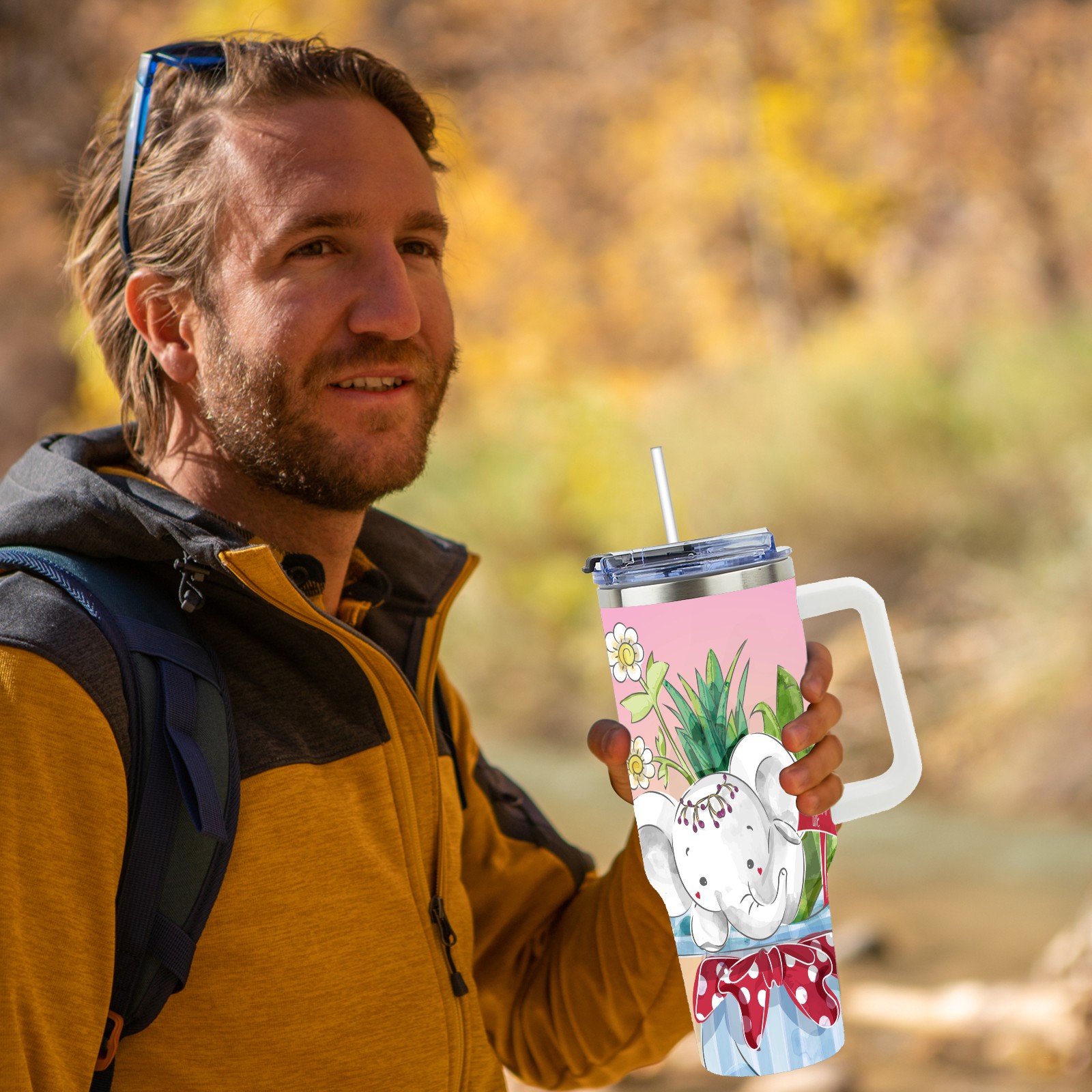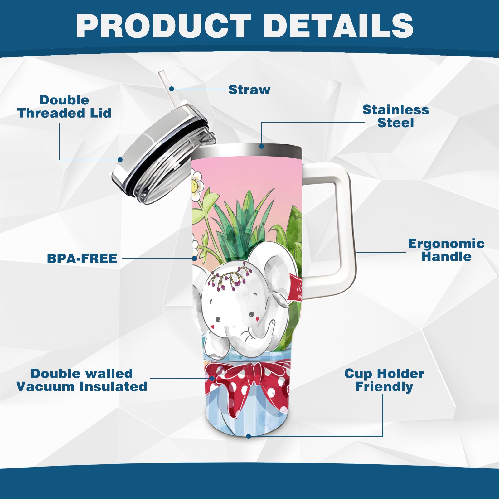 40oz Cute Elephant thermos with lid and straw, leak-proof stainless steel, with handle, spill-proof bottle, convenient for travel(pink)