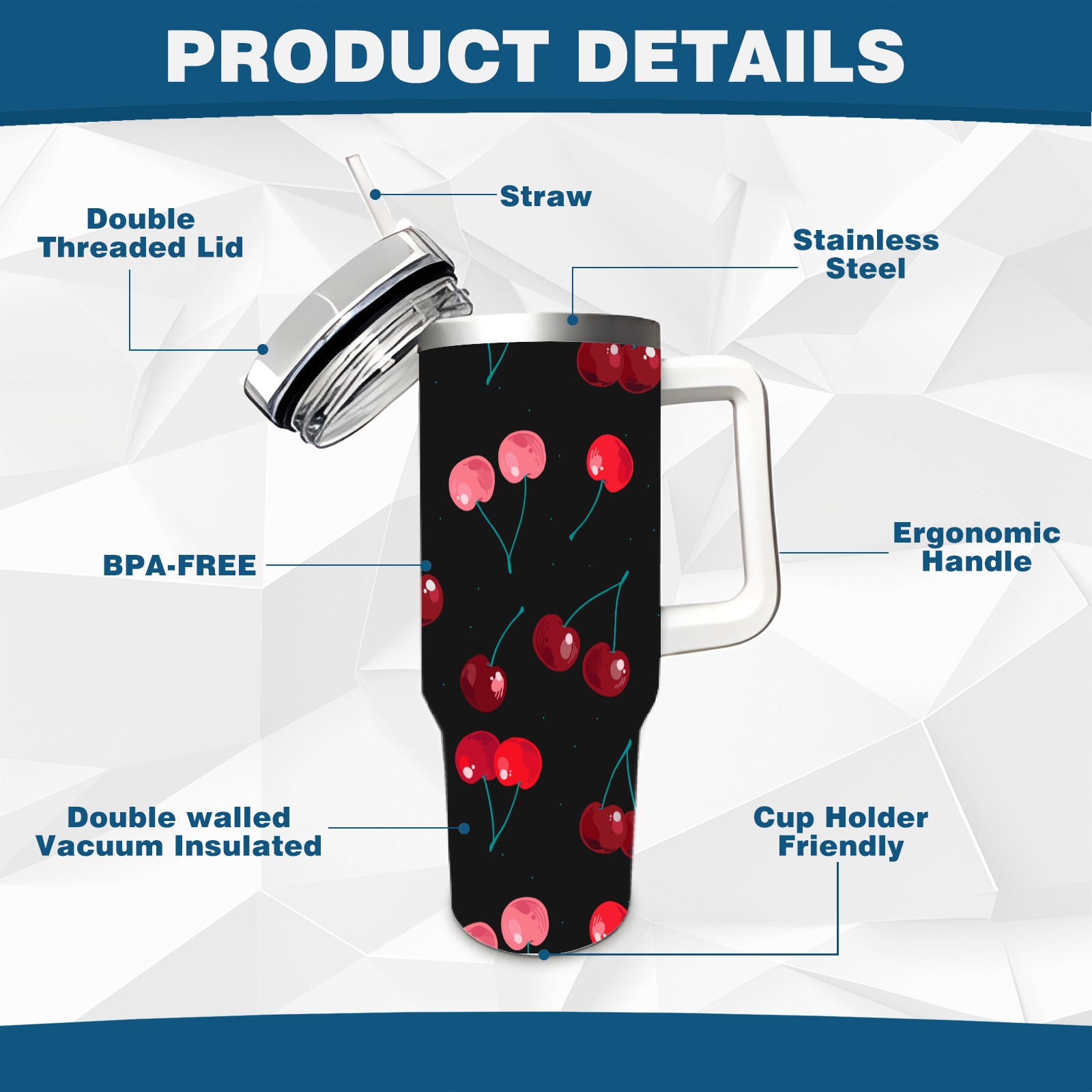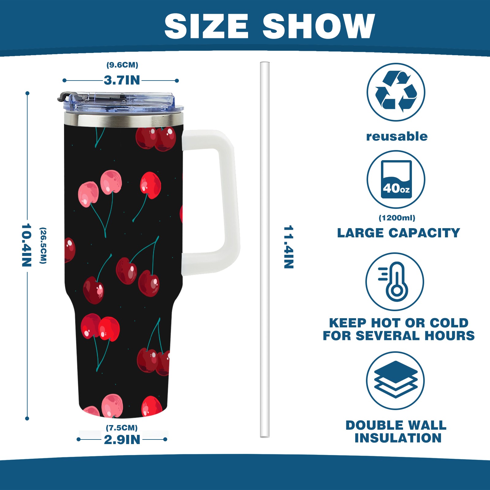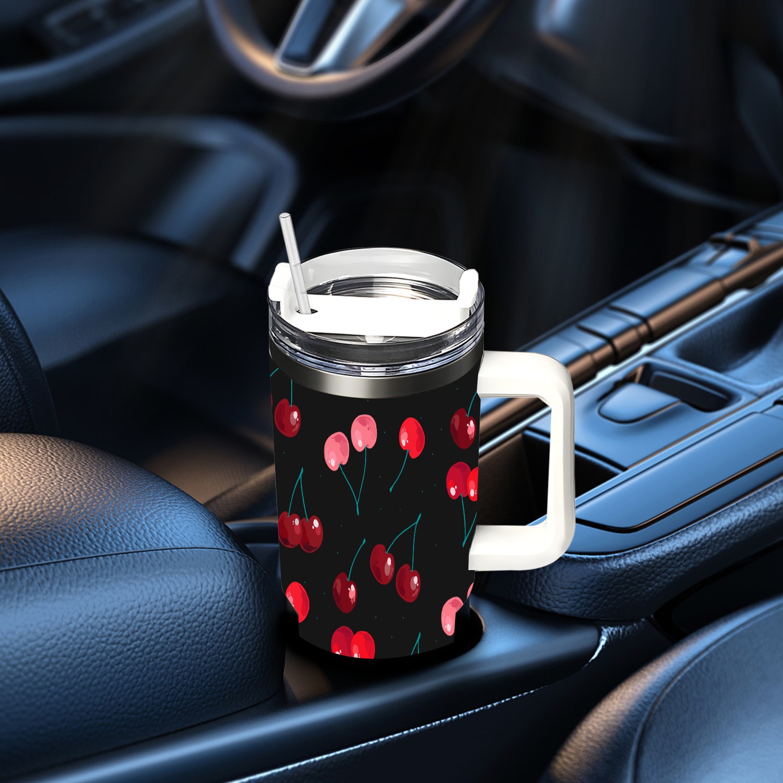 40oz Delicious Cherries thermos with lid and straw, leak-proof stainless steel, with handle, spill-proof bottle, convenient for travel(pink)