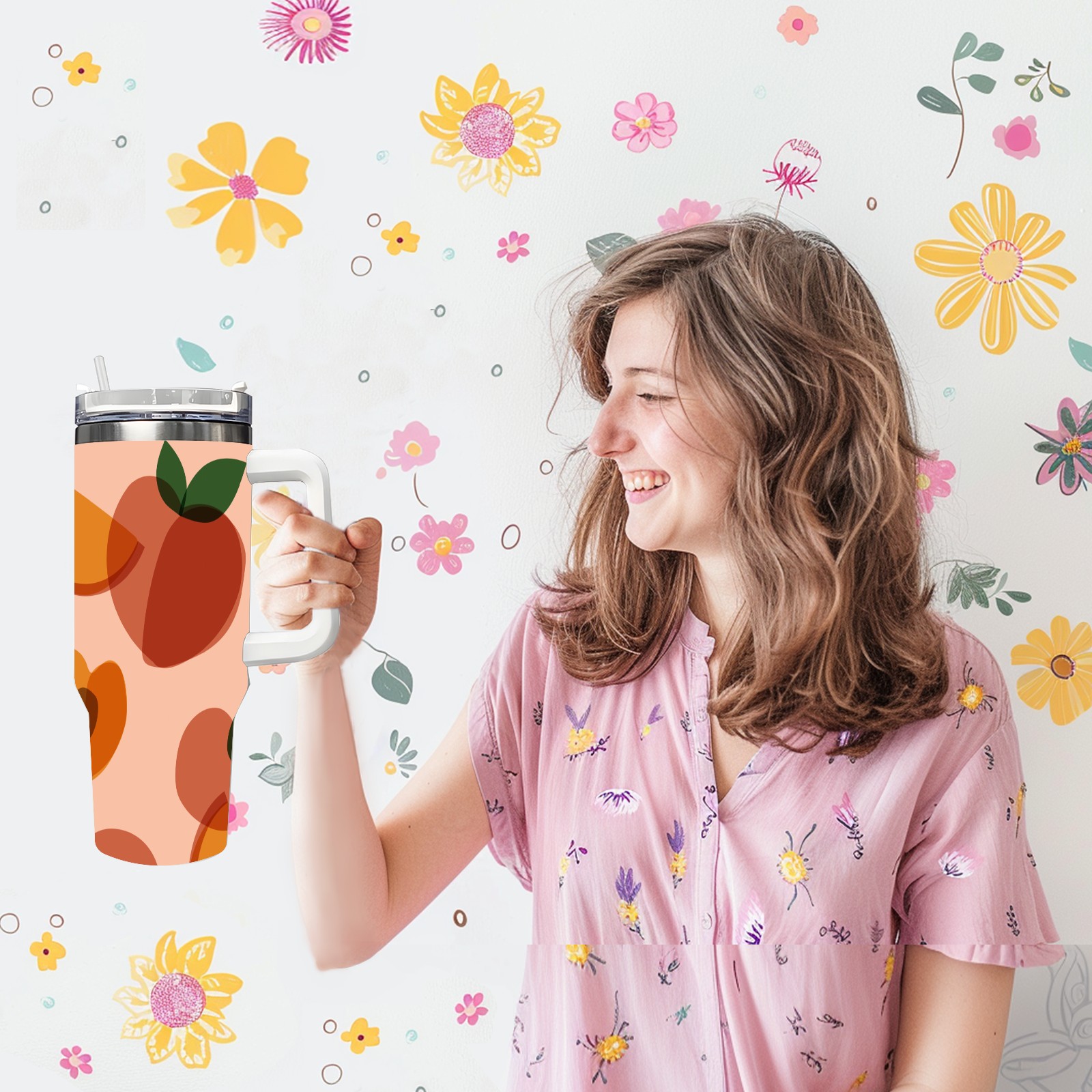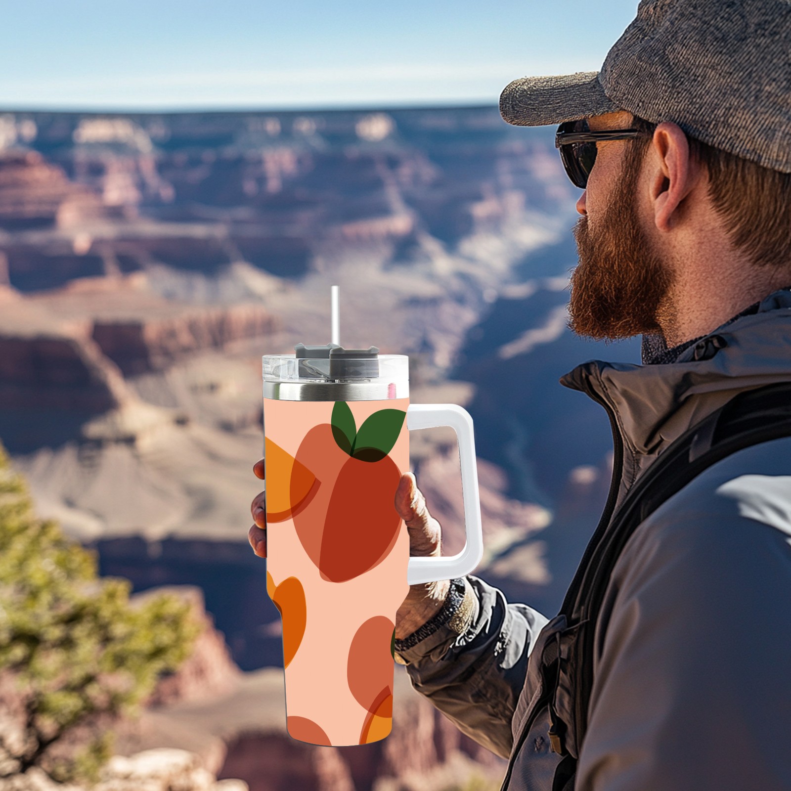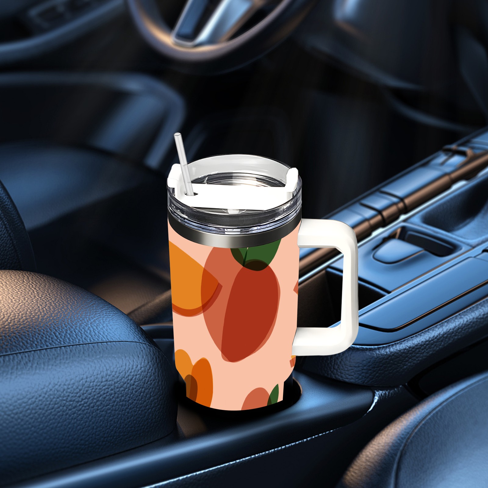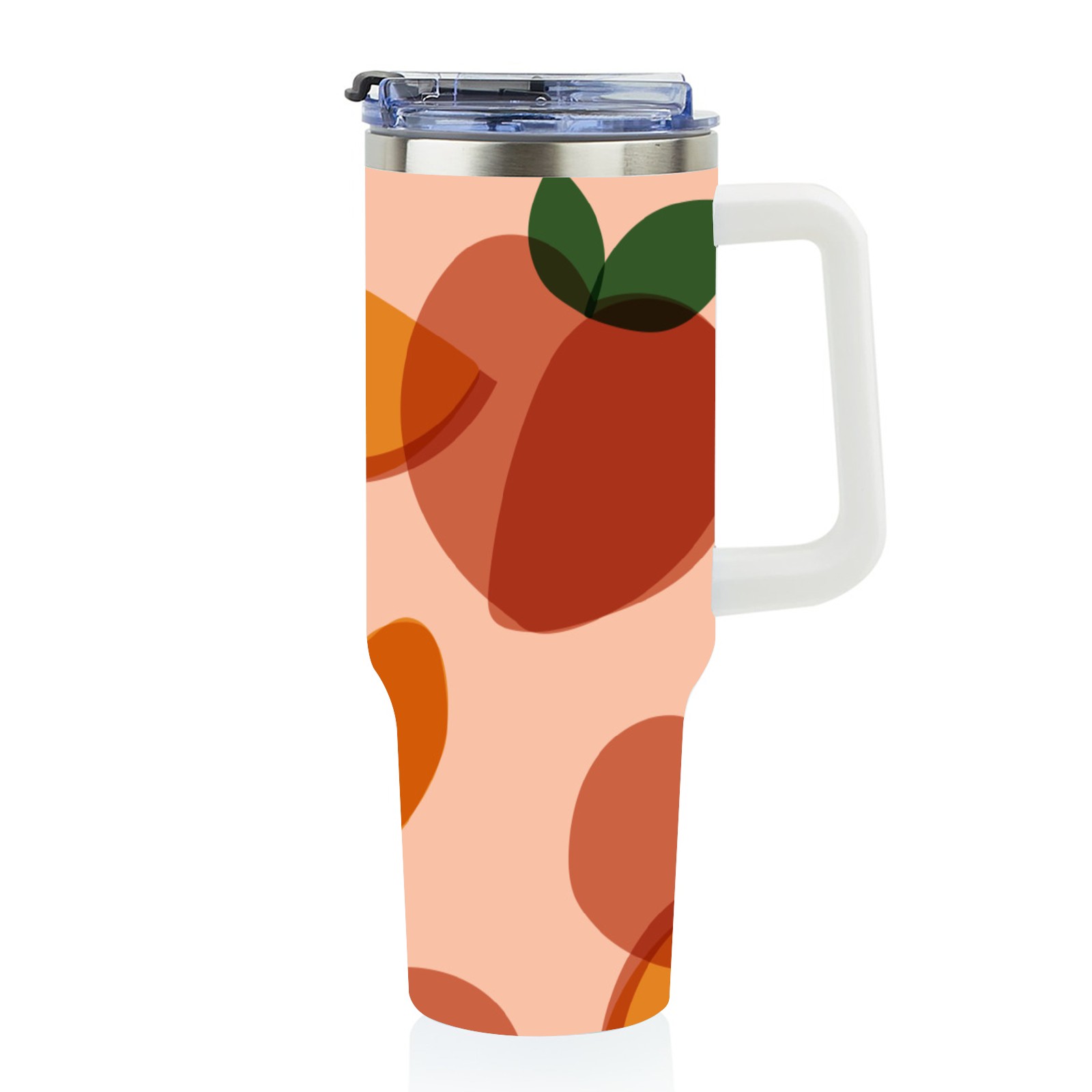 40oz Art Peach thermos with lid and straw, leak-proof stainless steel, with handle, spill-proof bottle, convenient for travel(pink)