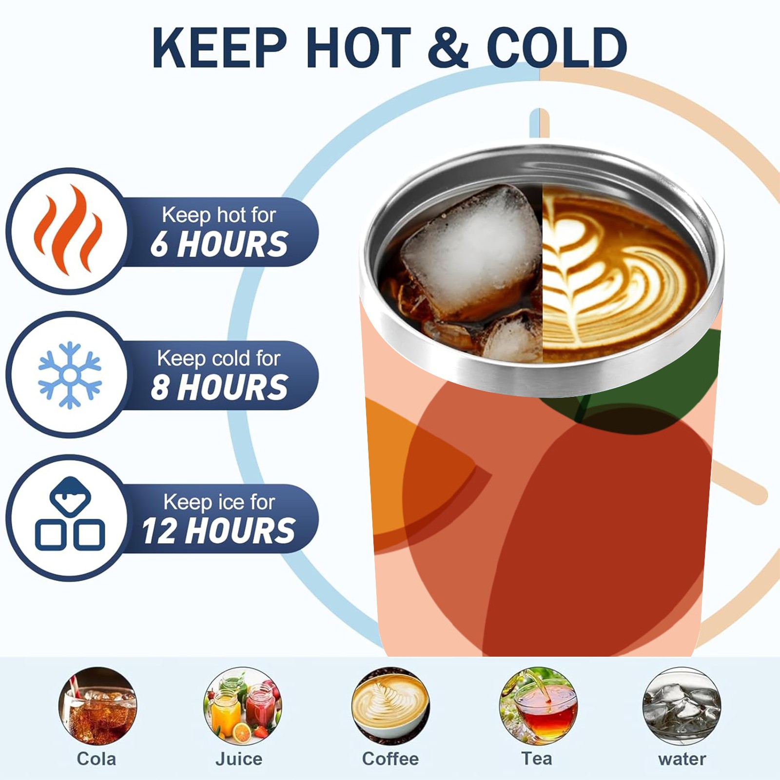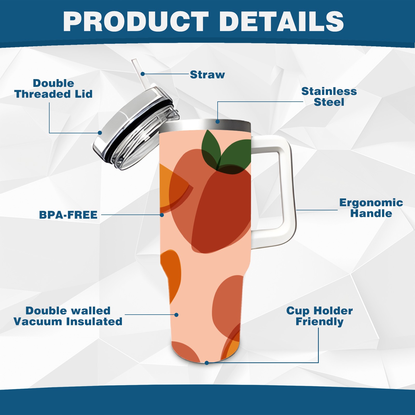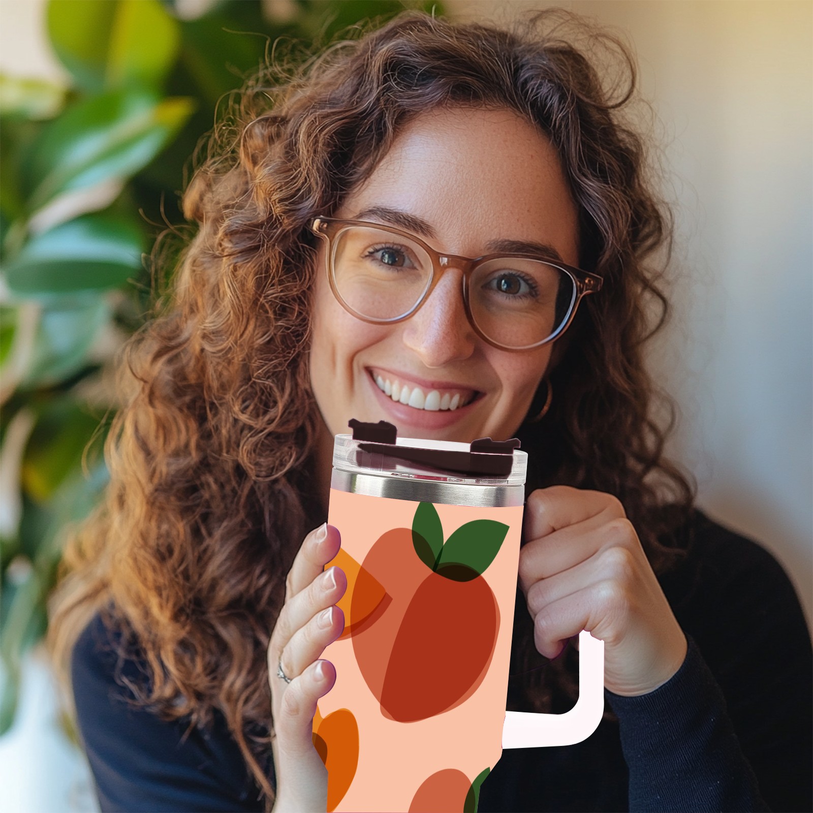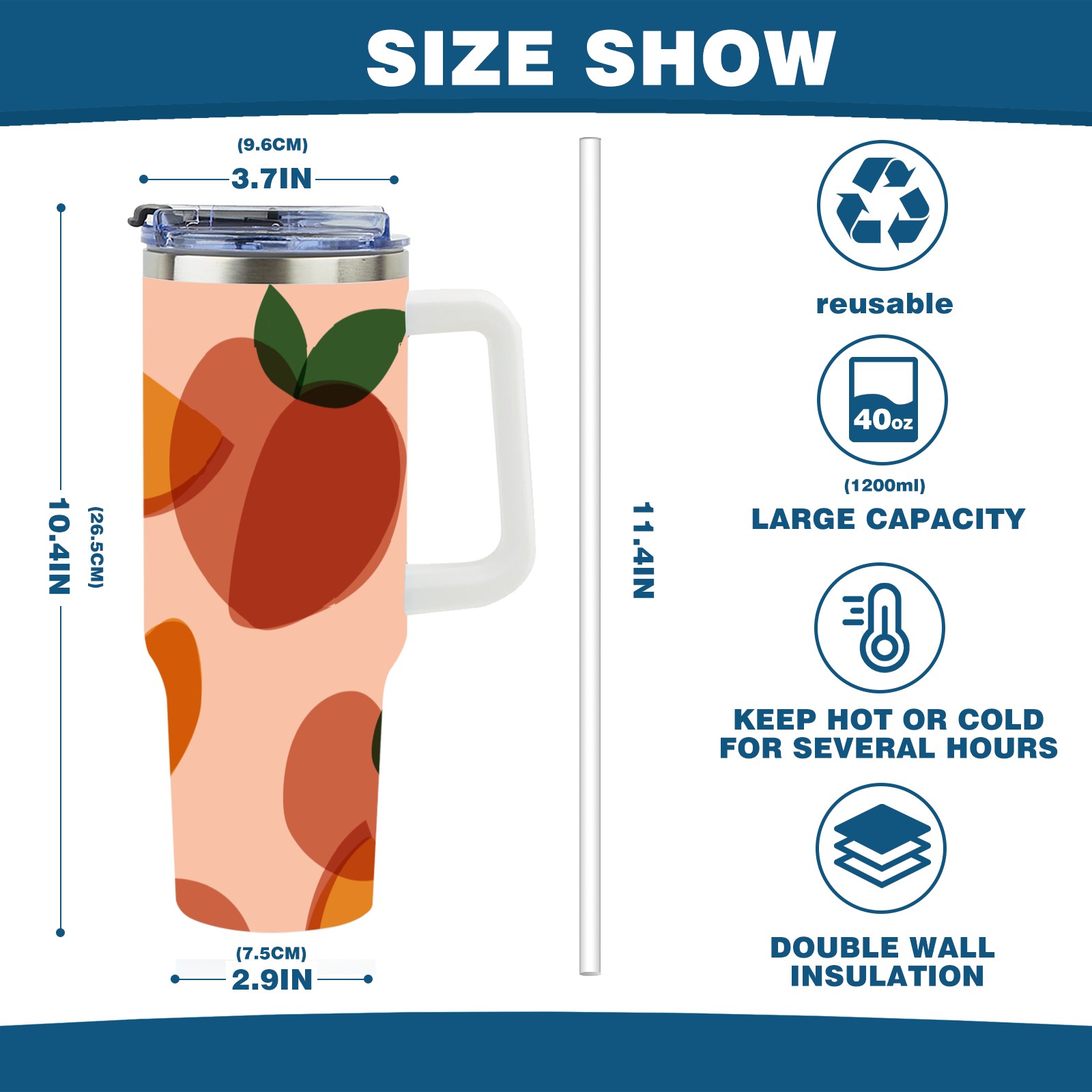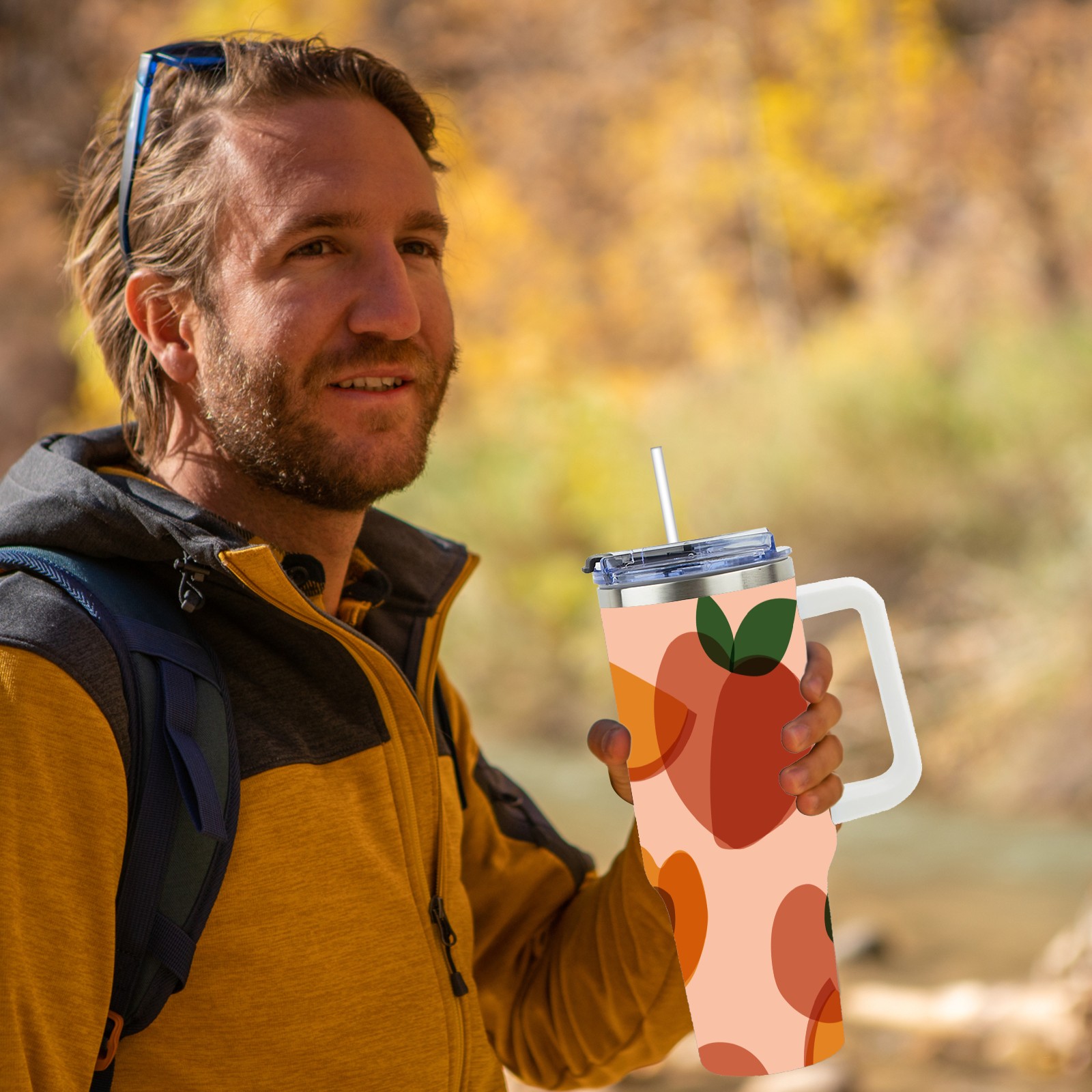 40oz Art Peach thermos with lid and straw, leak-proof stainless steel, with handle, spill-proof bottle, convenient for travel(pink)
