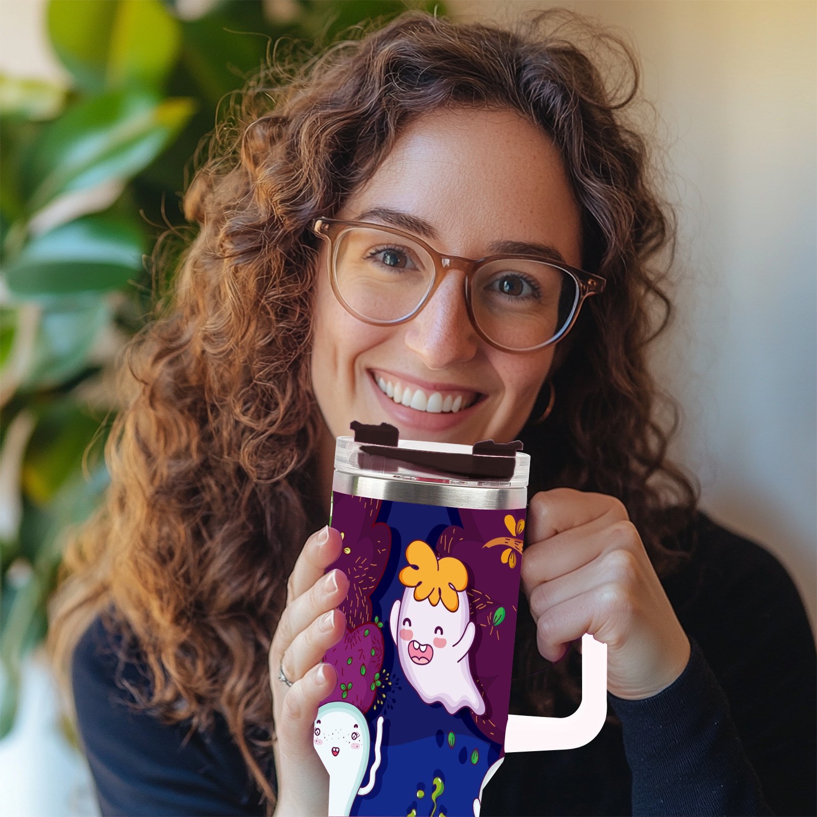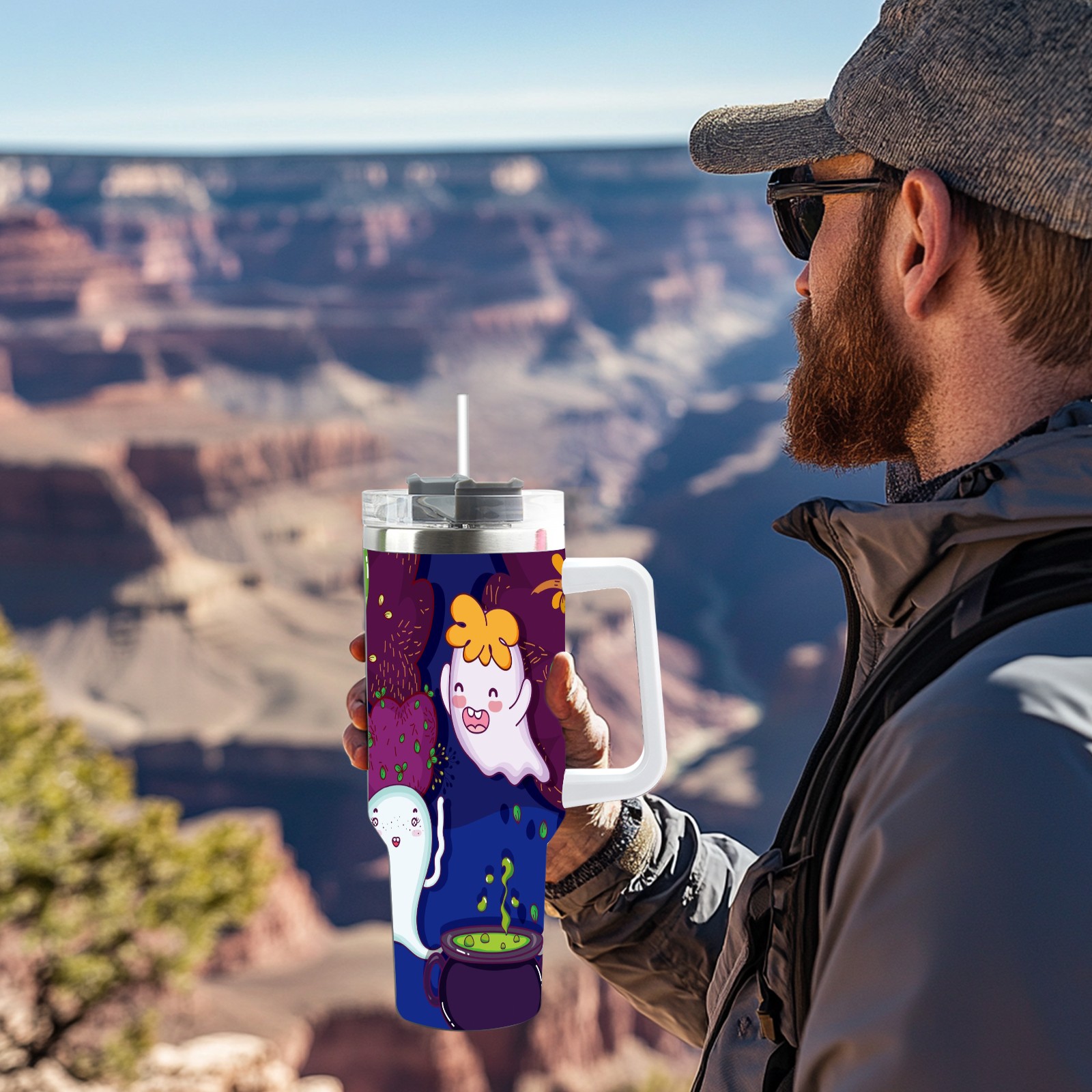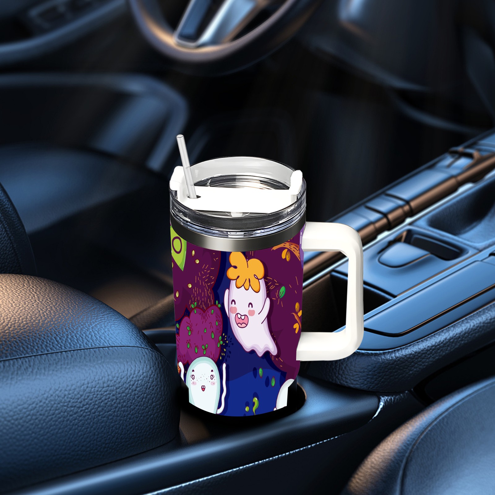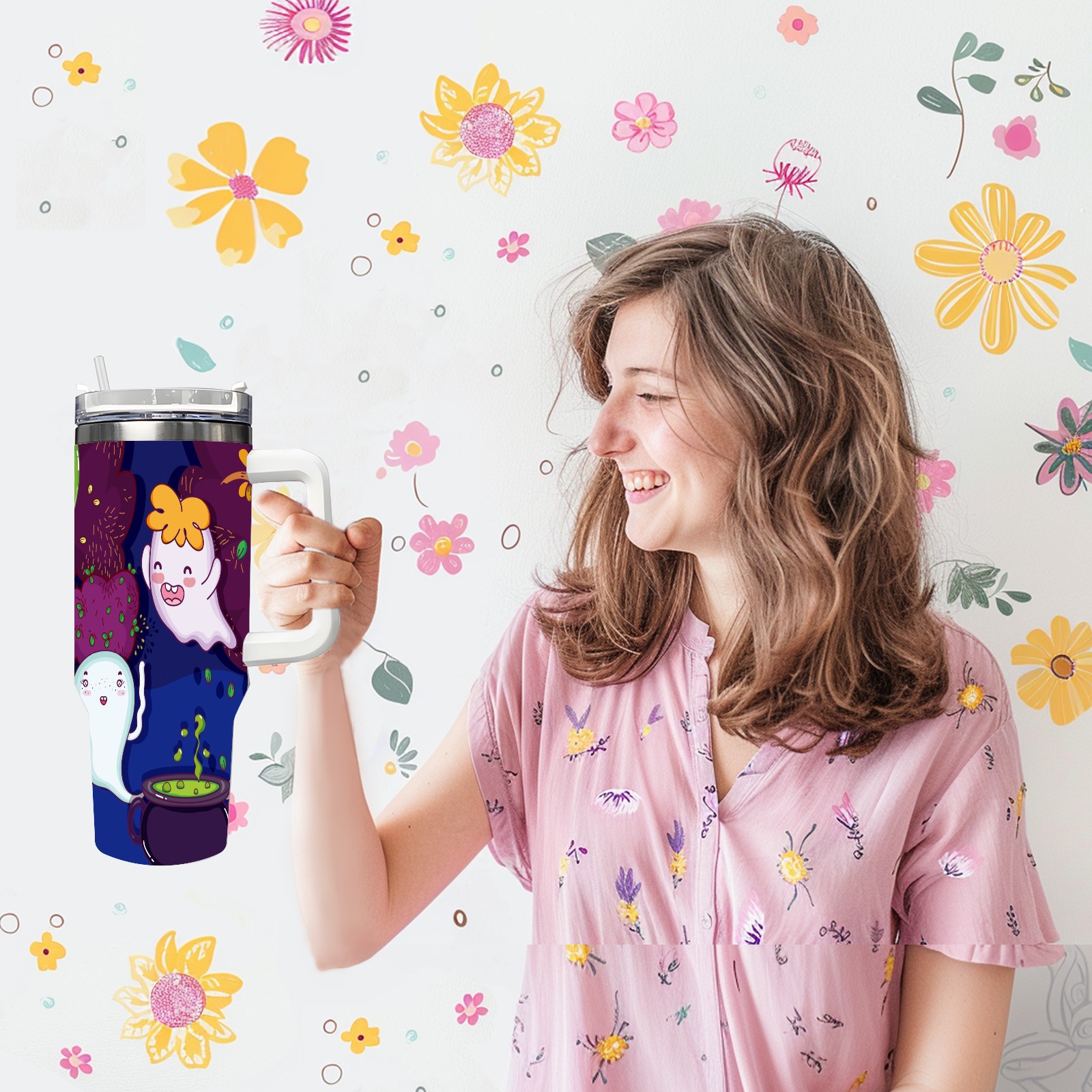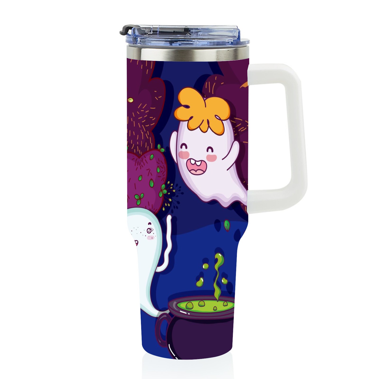 40oz Cute Ghost thermos with lid and straw, leak-proof stainless steel, with handle, spill-proof bottle, convenient for travel(pink)