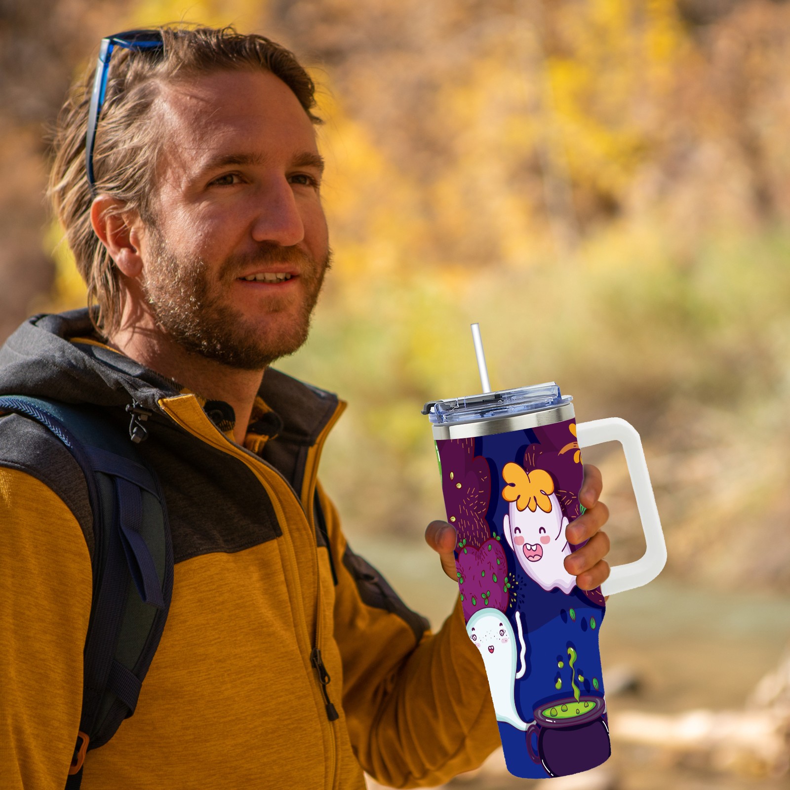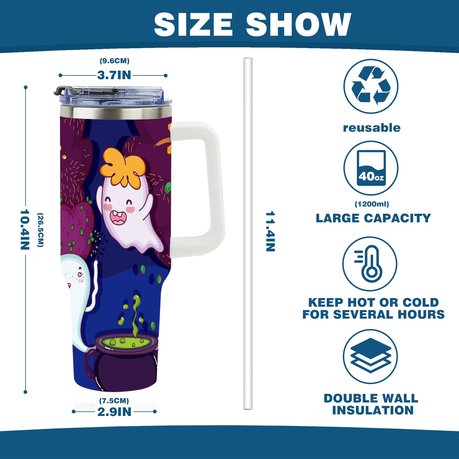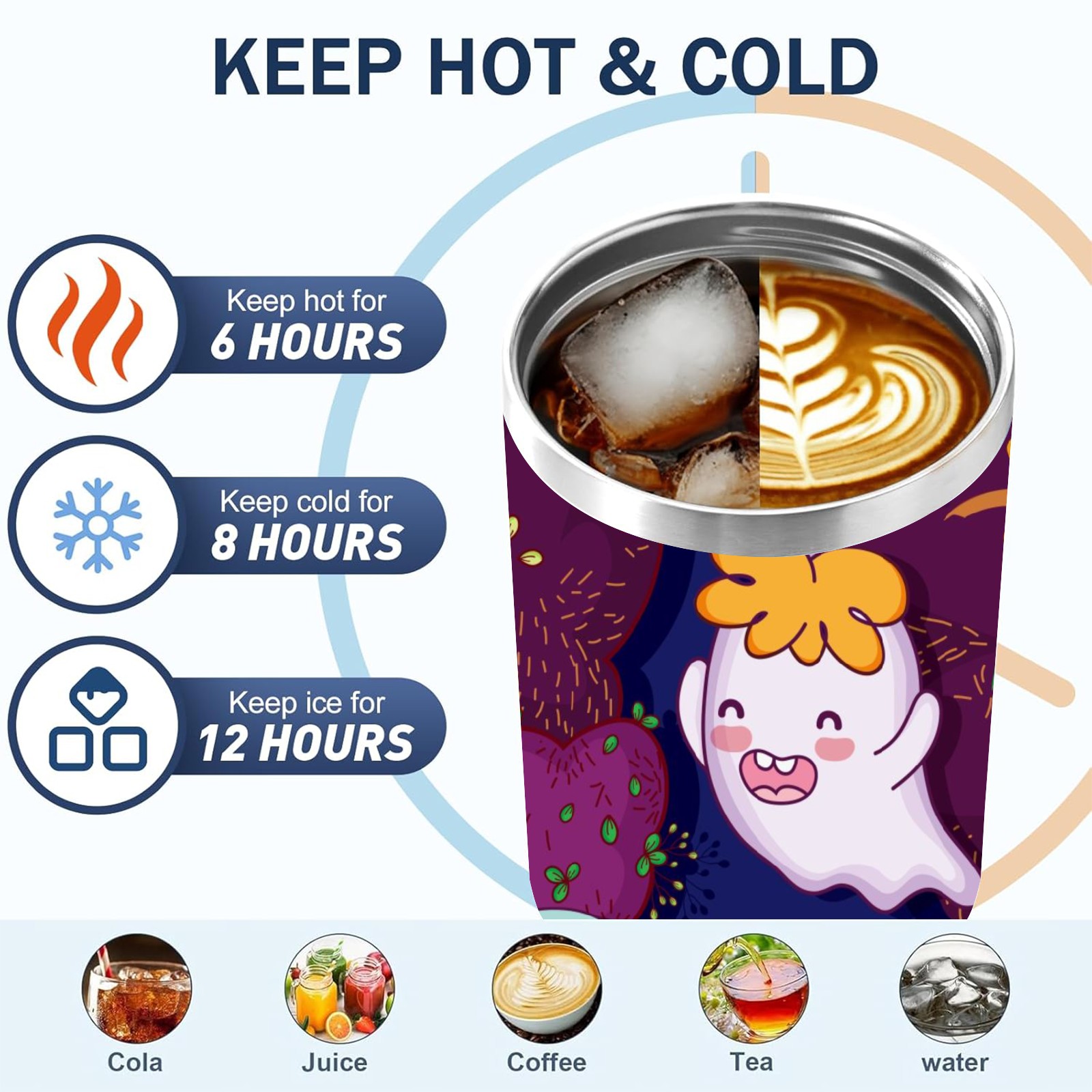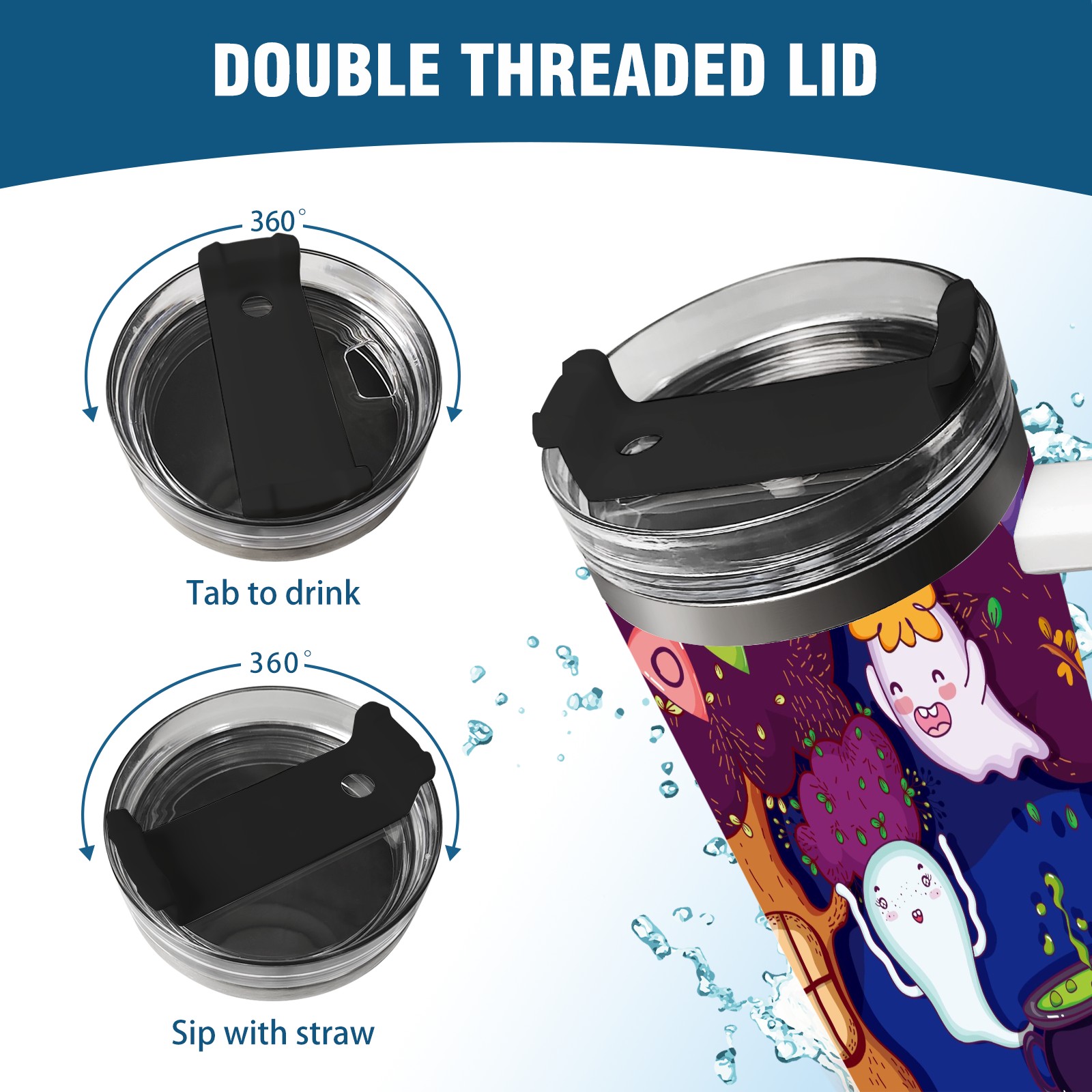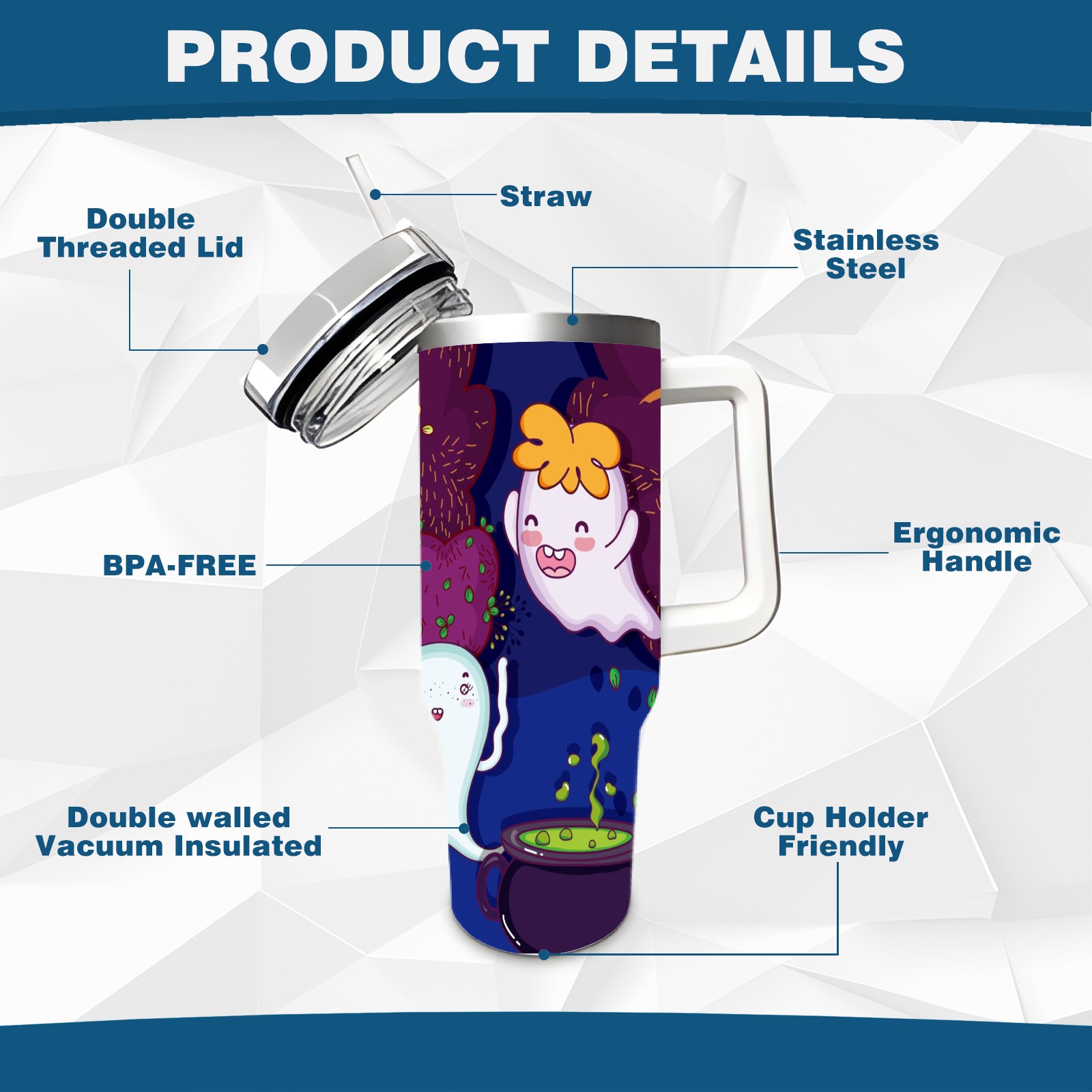 40oz Cute Ghost thermos with lid and straw, leak-proof stainless steel, with handle, spill-proof bottle, convenient for travel(pink)