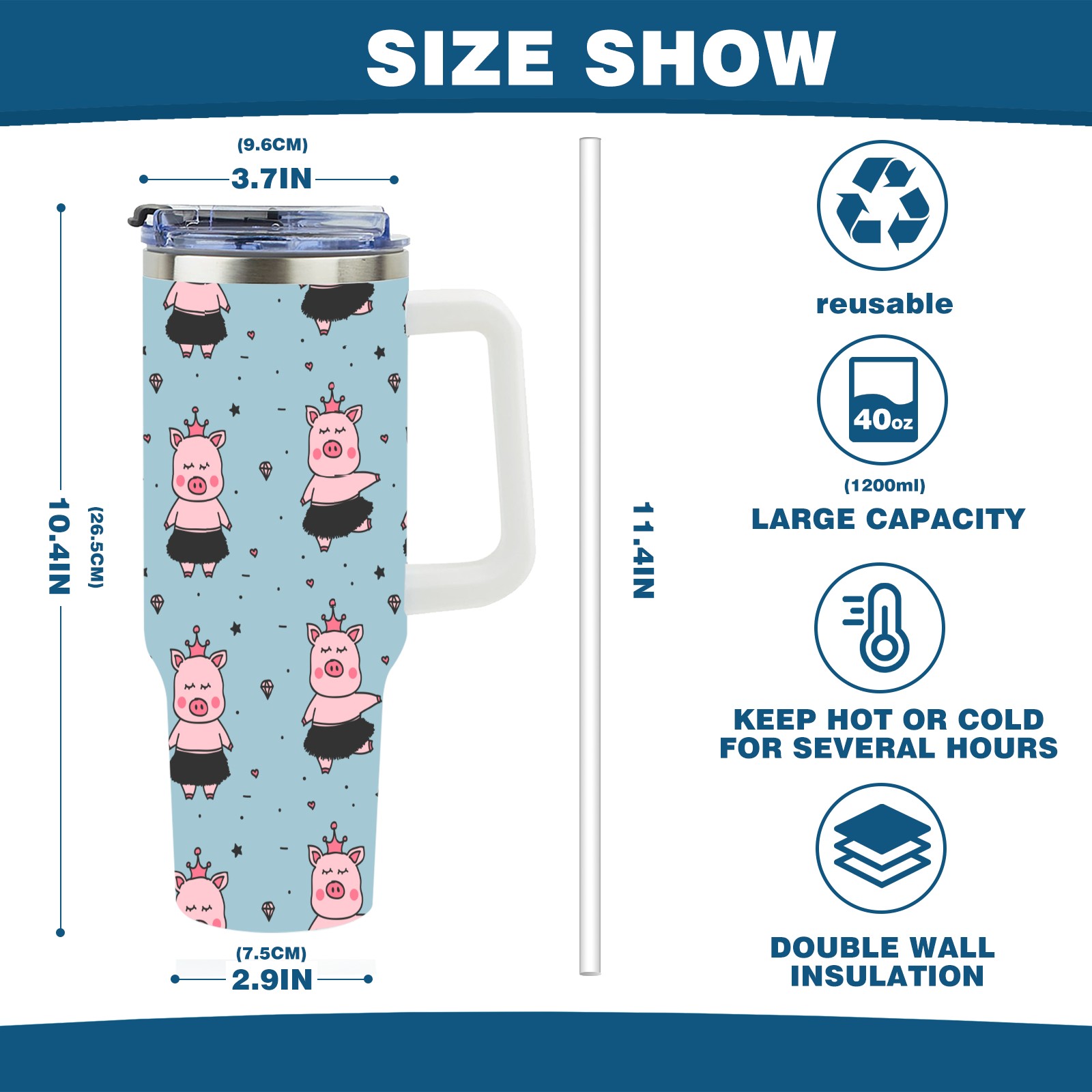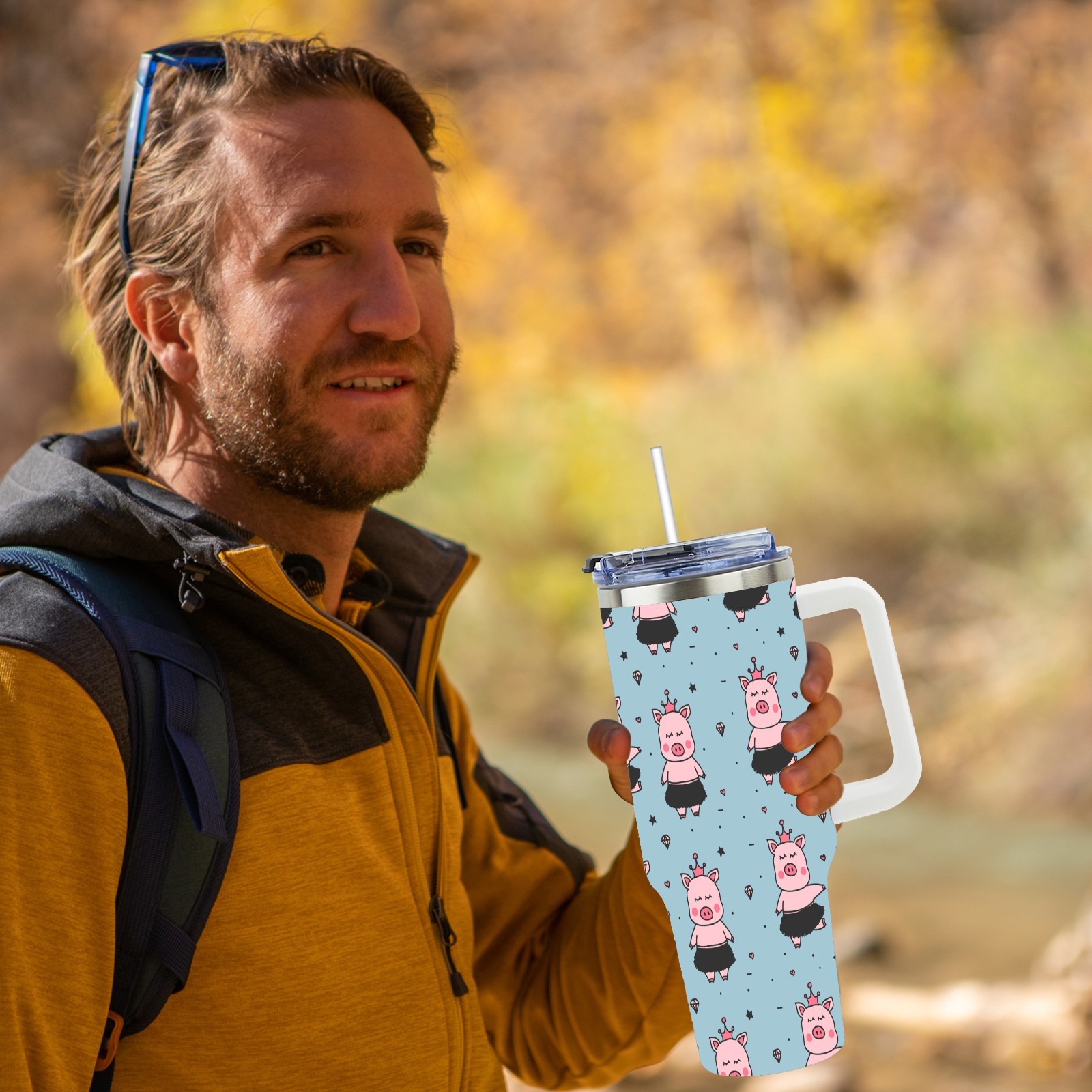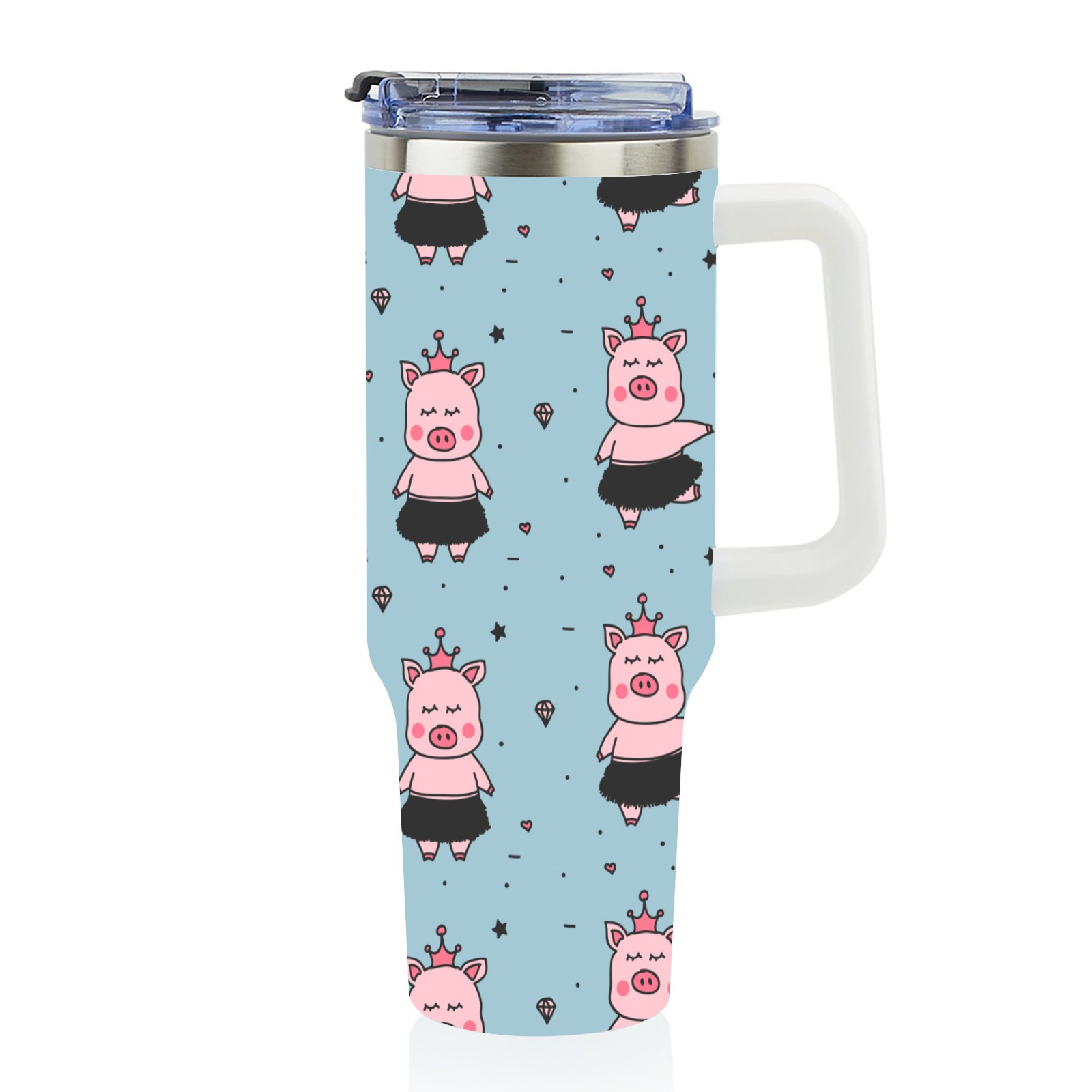 40oz Cartoon Pig thermos with lid and straw, leak-proof stainless steel, with handle, spill-proof bottle, convenient for travel(pink)
