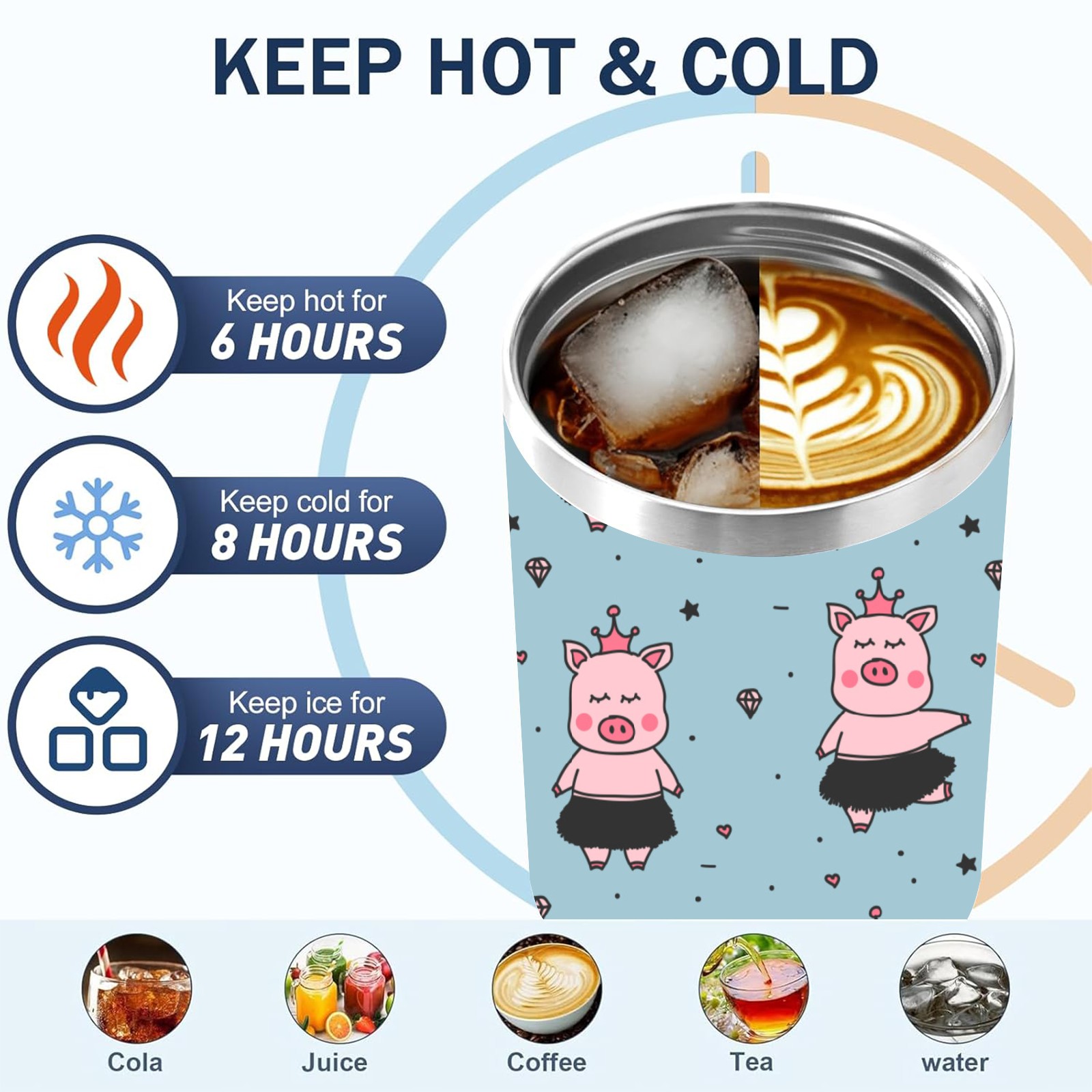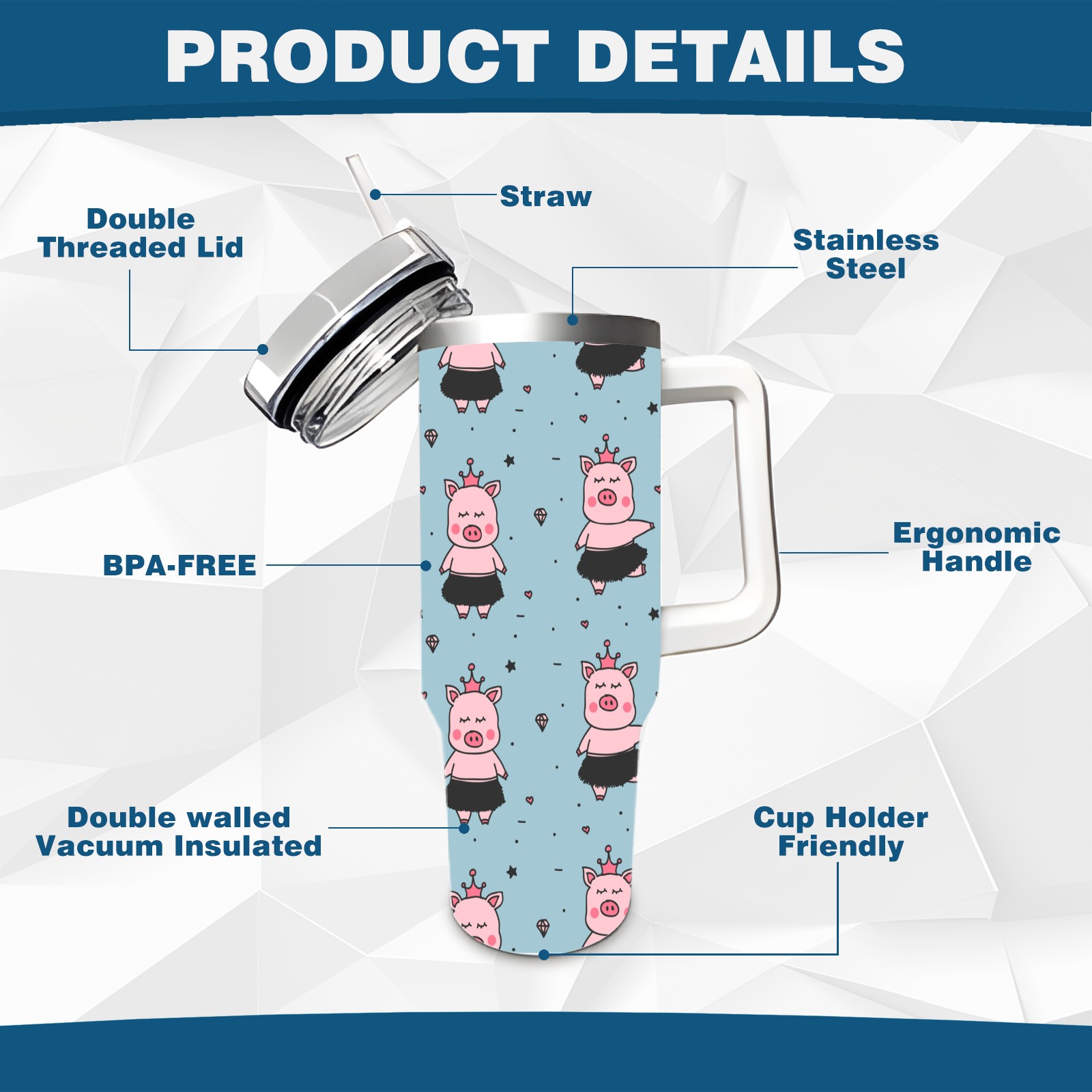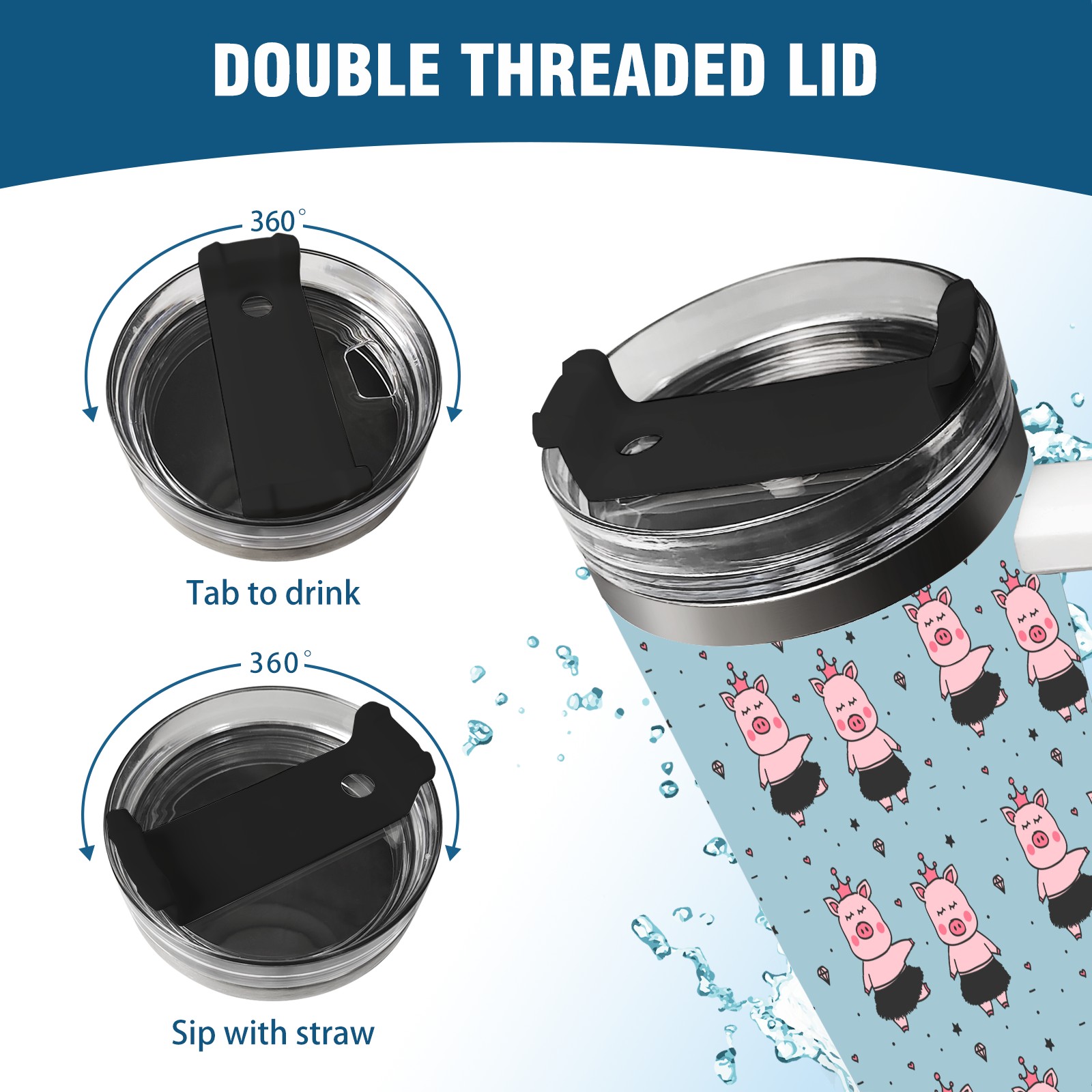 40oz Cartoon Pig thermos with lid and straw, leak-proof stainless steel, with handle, spill-proof bottle, convenient for travel(pink)
